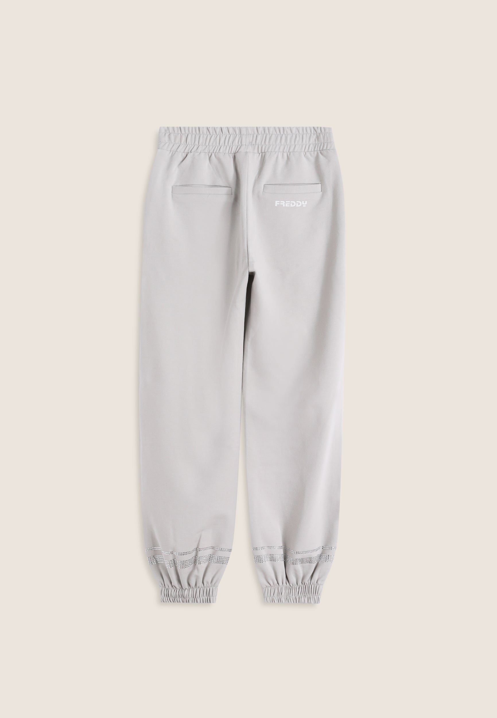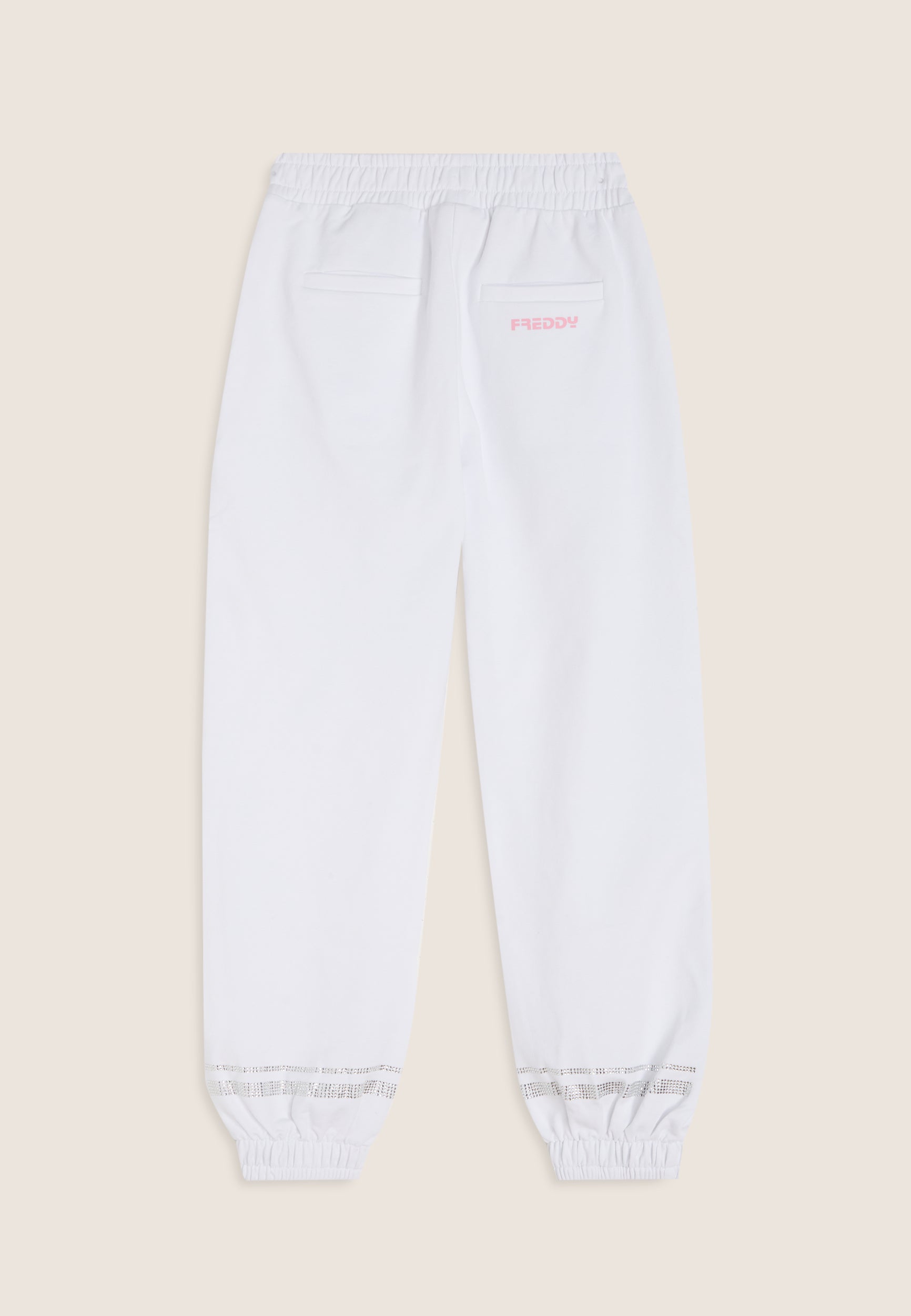 Comodi e ricchi di stile, questi pantaloni da bambina in cotone elasticizzato uniscono praticità e dettagli brillanti. La vestibilità comfort e la vita regular con elastico interno offrono una tenuta sicura e piacevole per il tempo libero. Il fondo gamba con elastico interno valorizza il taglio sportivo del capo. Completano il design le tasche anteriori e posteriori interne e le bande orizzontali a fondo gamba composte da strass, che aggiungono un tocco luminoso e femminile. Il logo FREDDY in contrasto colore è stampato sul fianco anteriore sinistro e sotto il taschino posteriore destro.