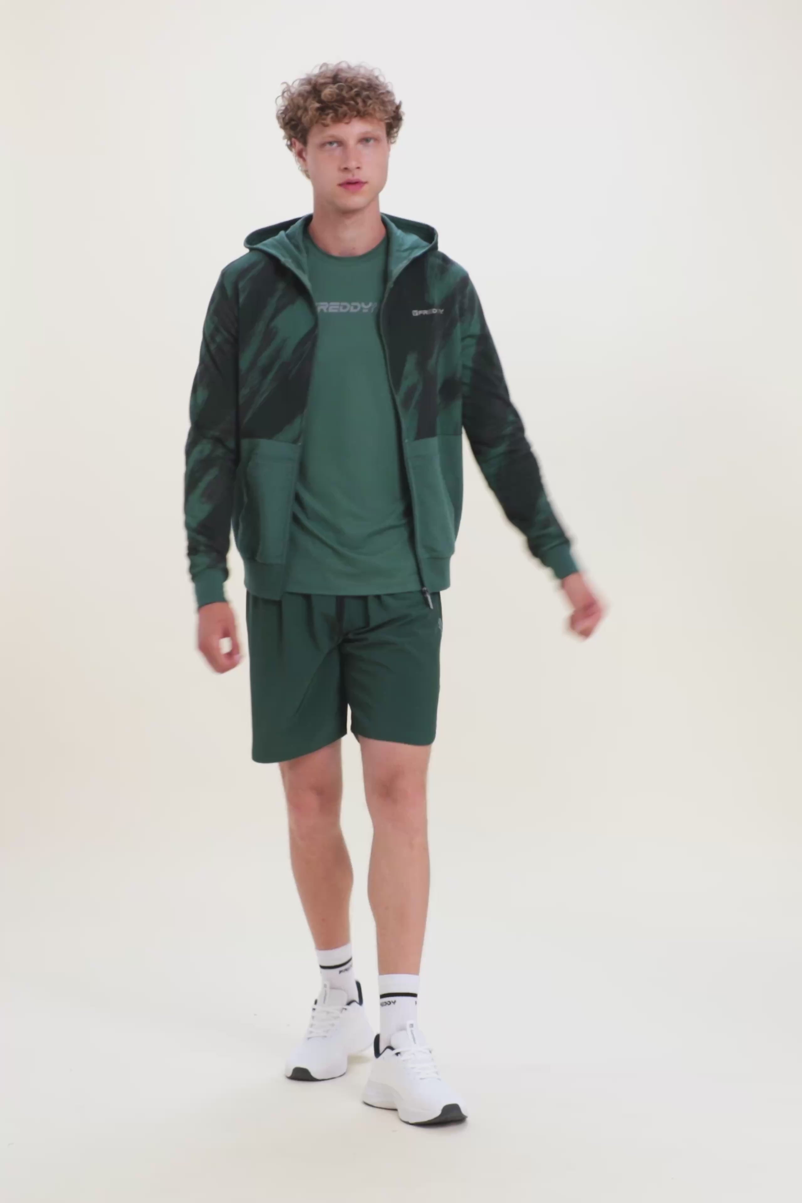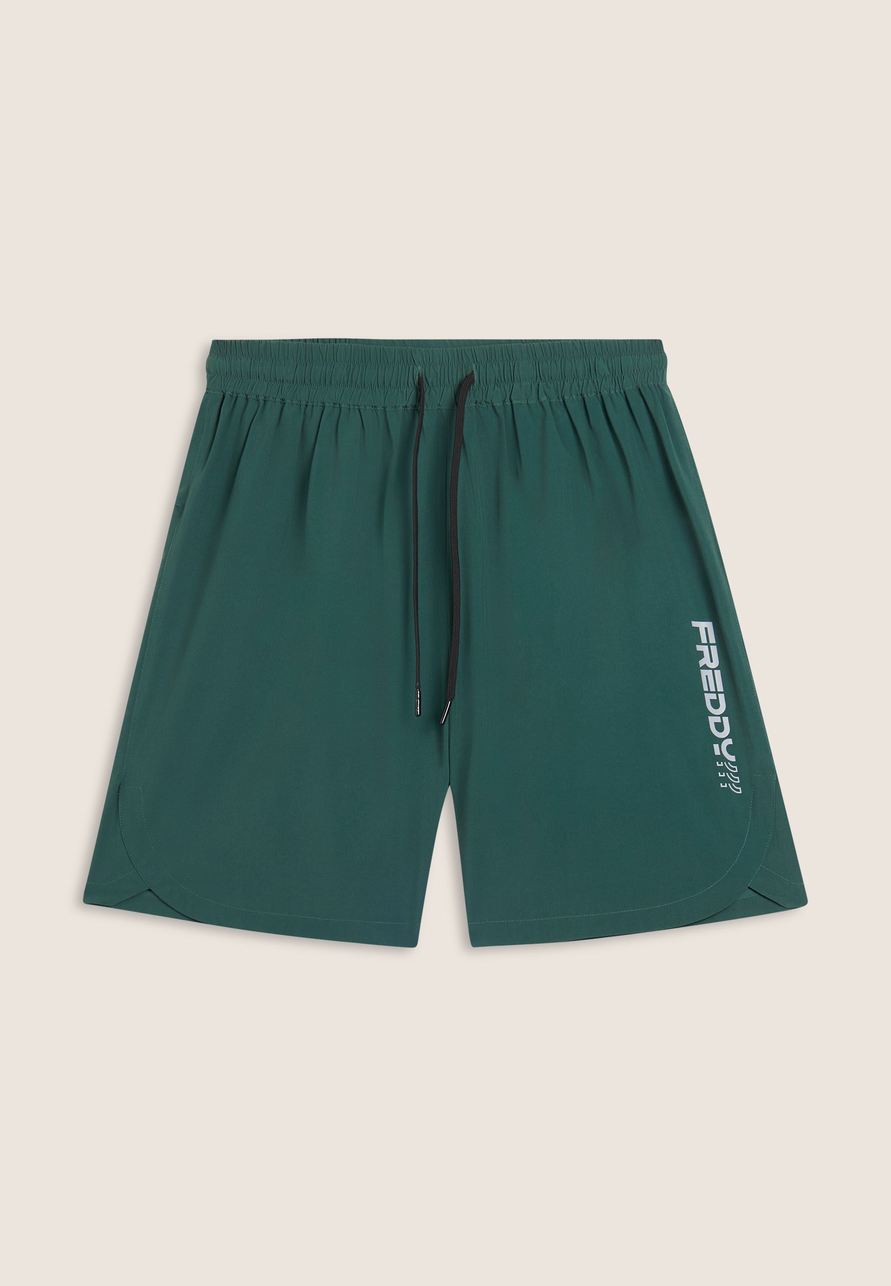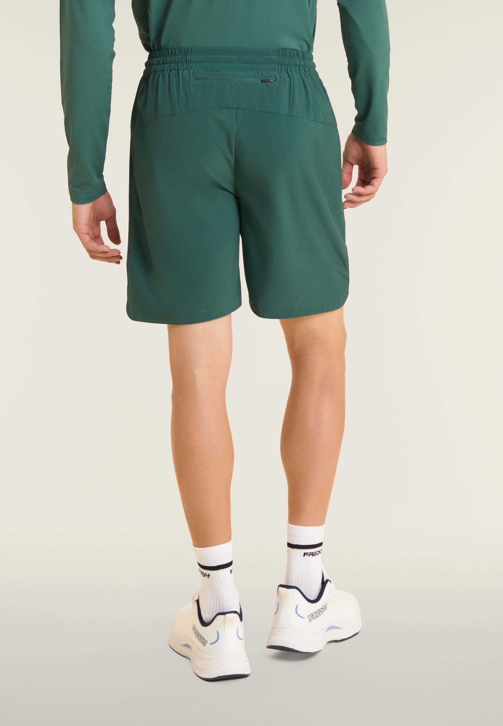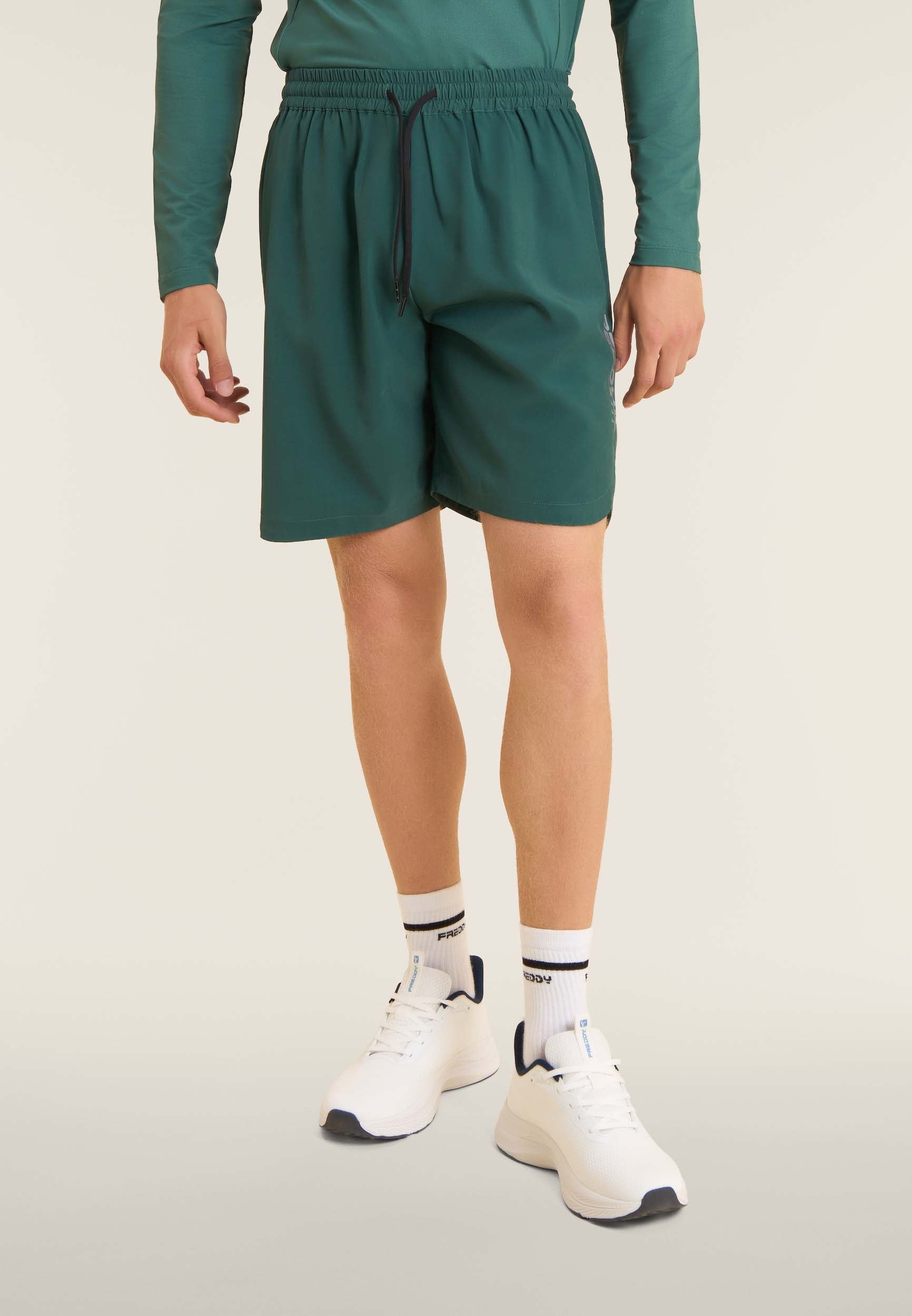 Pantalones cortos de corte ajustado para hombre y bajo recto con aberturas laterales. La cintura es elástica y ajustable mediante cordón. Dotados de bolsillos delanteros y un bolsillo trasero con cremallera. Las costuras están diseñadas para un ajuste óptimo. El tejido elástico de calada garantiza resistencia y transpirabilidad. El logotipo en el bajo completa los detalles de estilo.