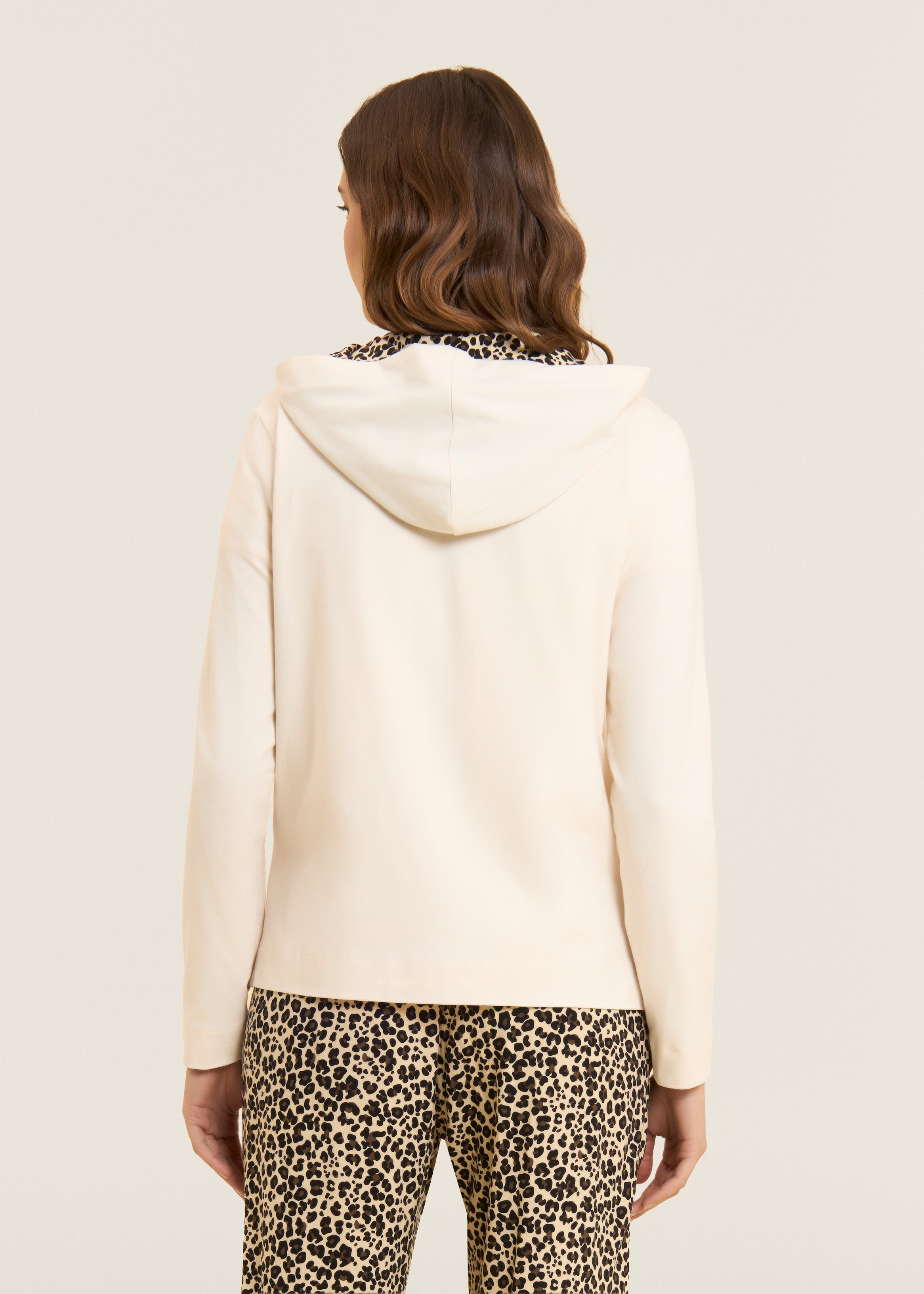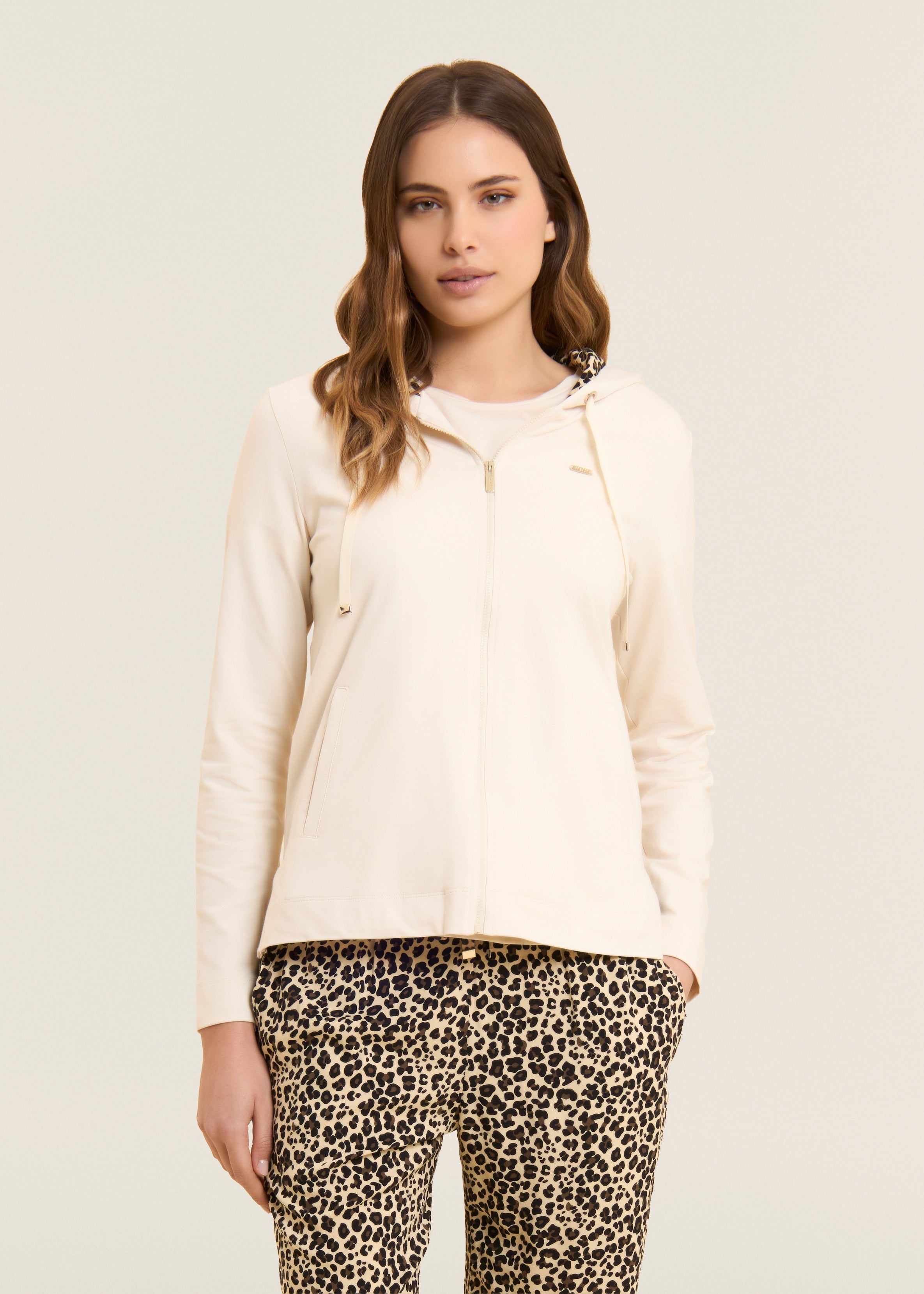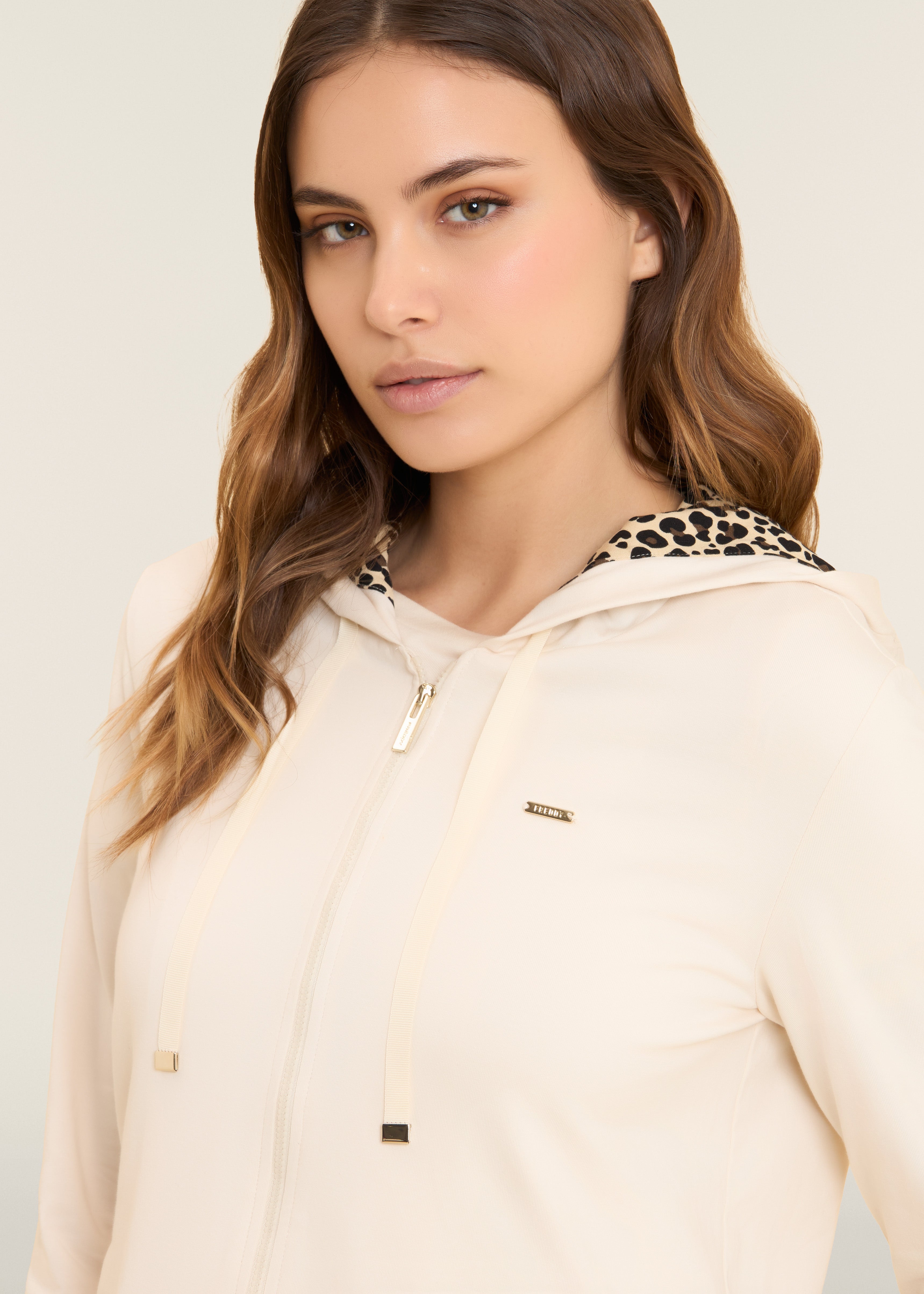 Sudadera con capucha y cremallera de corte regular y largo estándar, diseñada para combinar la comodidad cotidiana con detalles sofisticados. La capucha está dotada de cordón de ajuste y forrada de viscosa con un estampado animal print que le da un toque femenino y sofisticado. Los bolsillos internos aportan practicidad sin alterar el diseño depurado. Las mangas largas sin puños aportan una línea actual. El pequeño logotipo Freddy de tachuelas en el pecho y la placa dorada con el logotipo FREDDY en la abertura del bolsillo izquierdo completan el look. De tejido de punto elástico de algodón grueso.