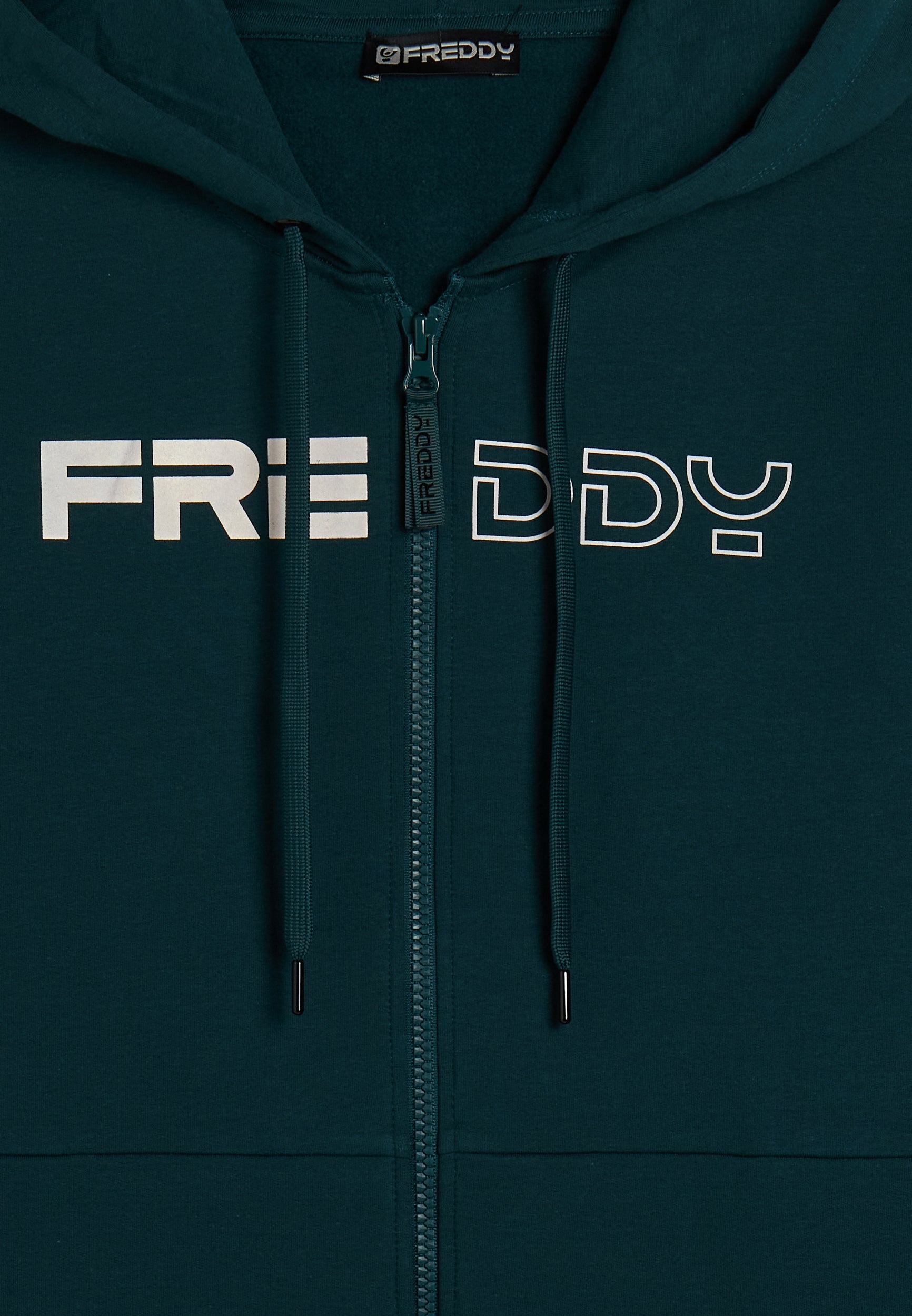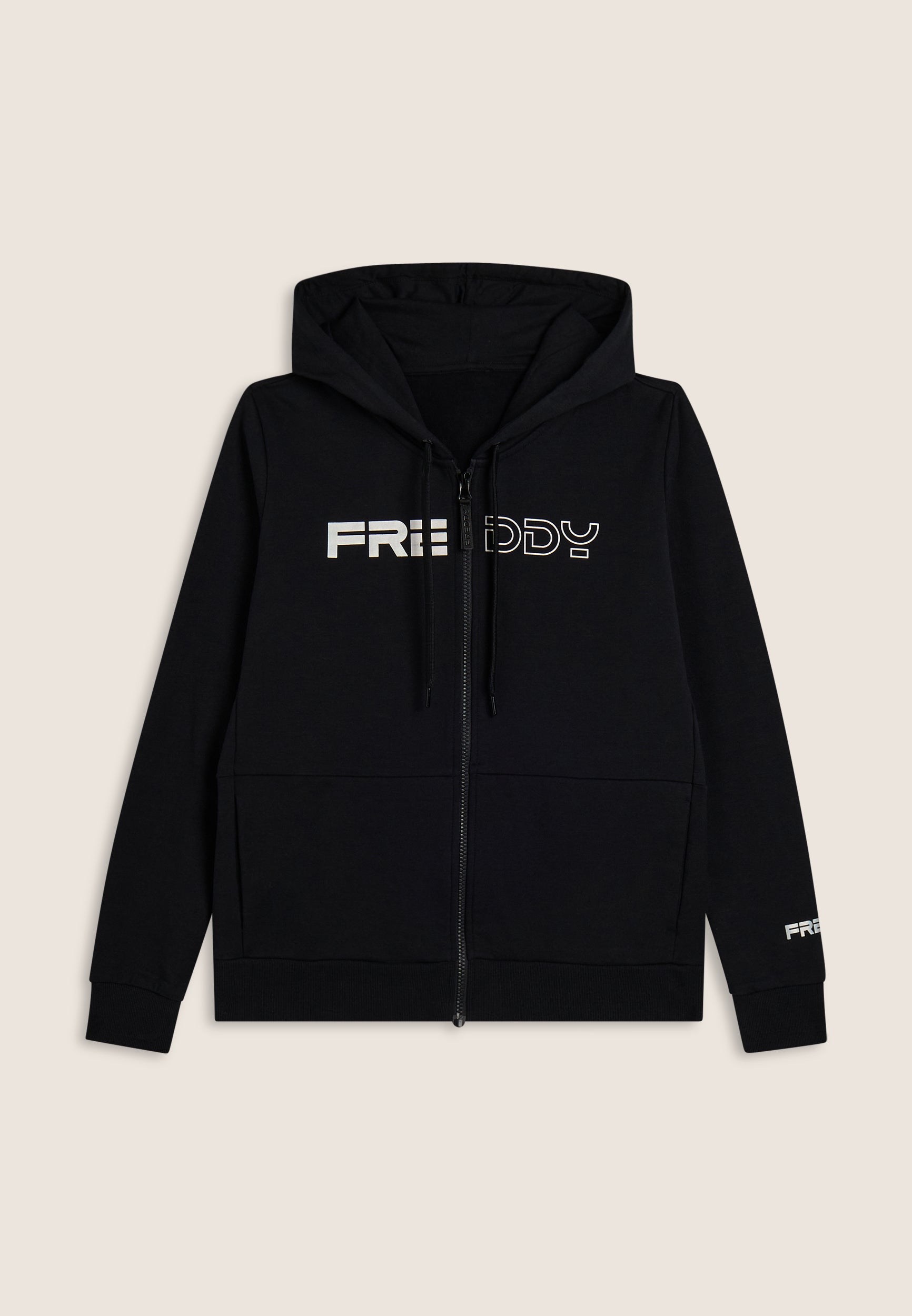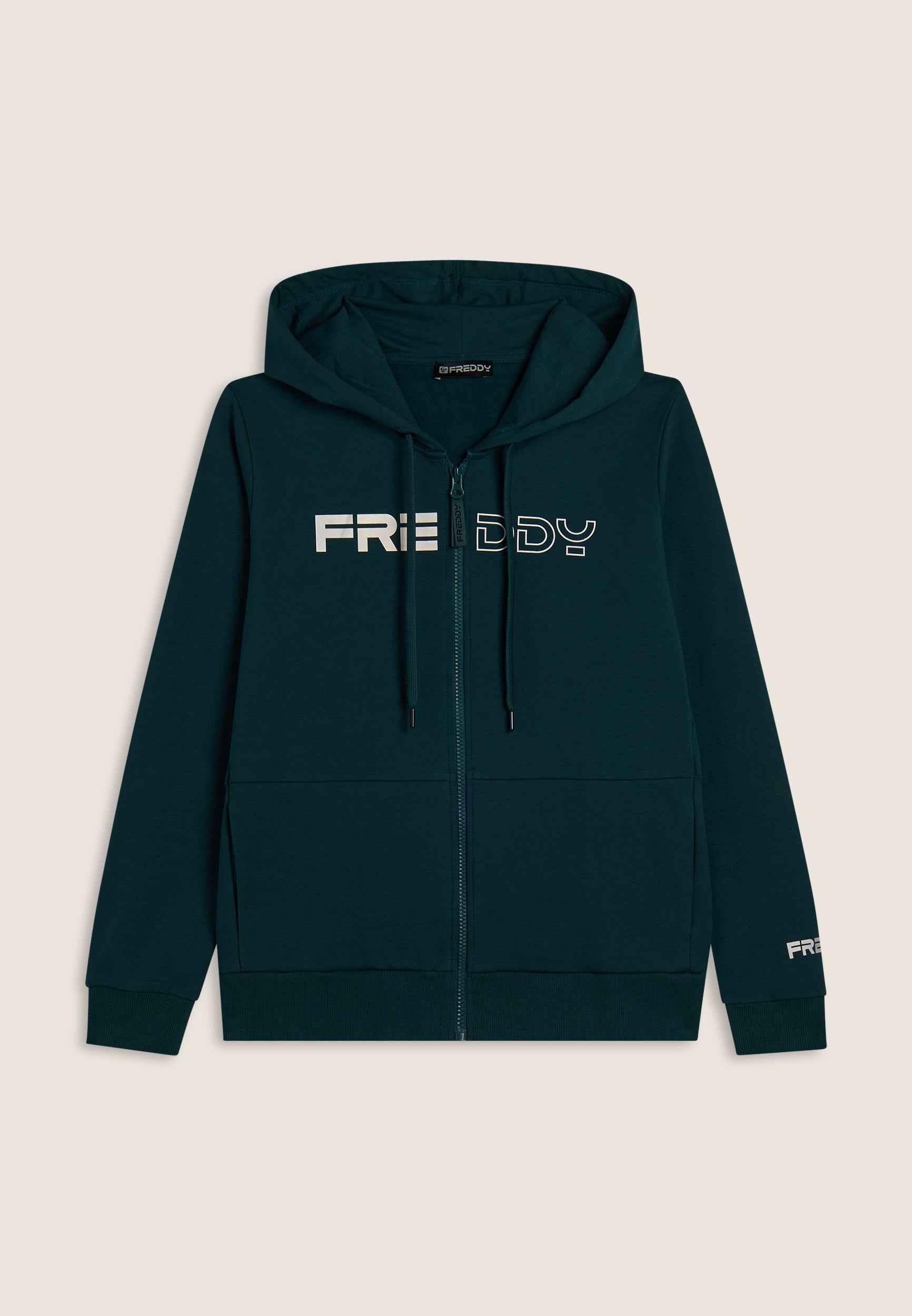 Sudadera deportiva de corte comfort fit con cierre de cremallera completa, capucha ajustable con cordón y forro en tejido de punto. El bajo y los puños son de canalé para un ajuste estable. El gran logotipo FREDDY en el pecho con efecto perlado le da un toque enérgico, mientras que los bolsillos internos ribeteados le confieren practicidad. Confeccionada en felpa perchada elástica.