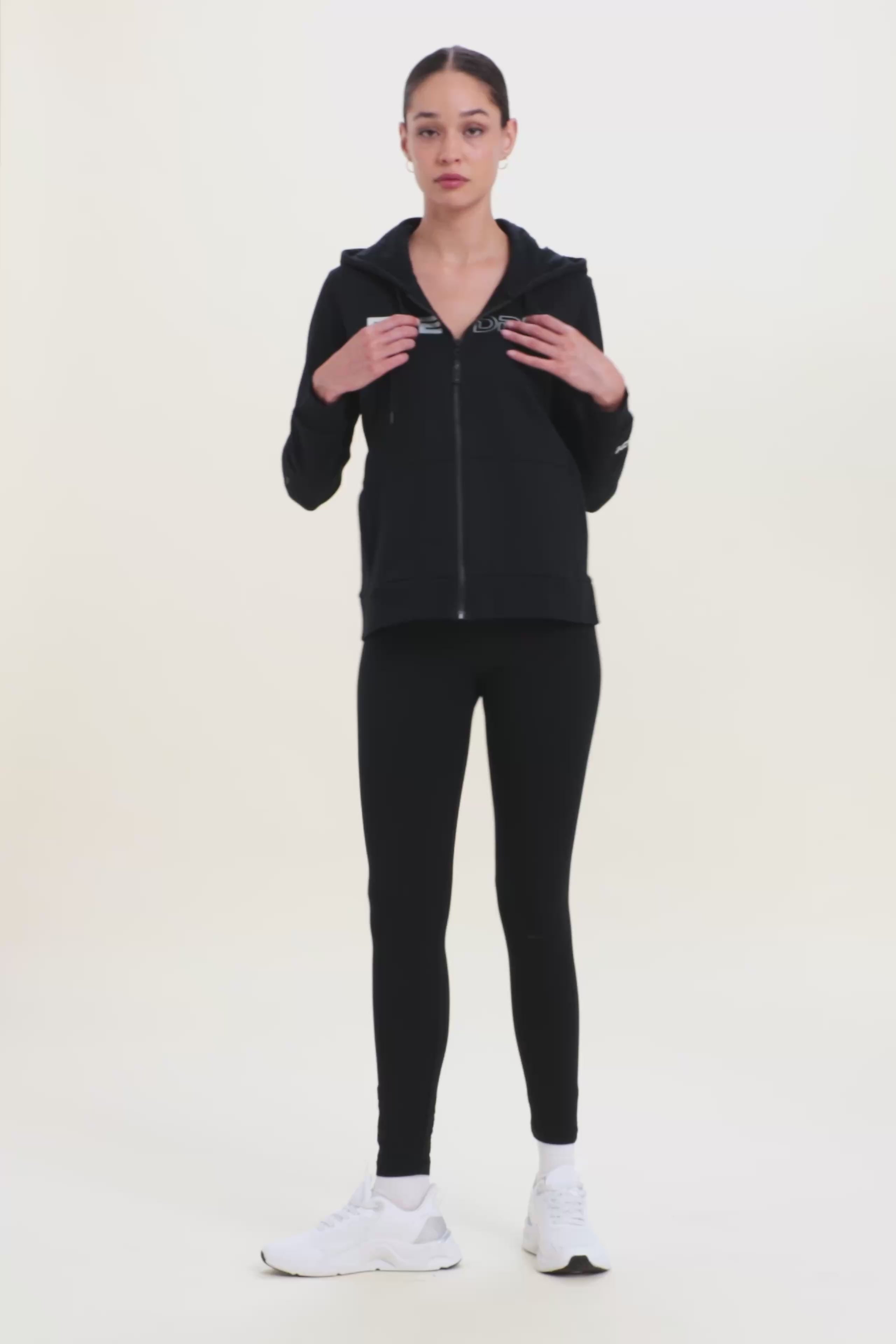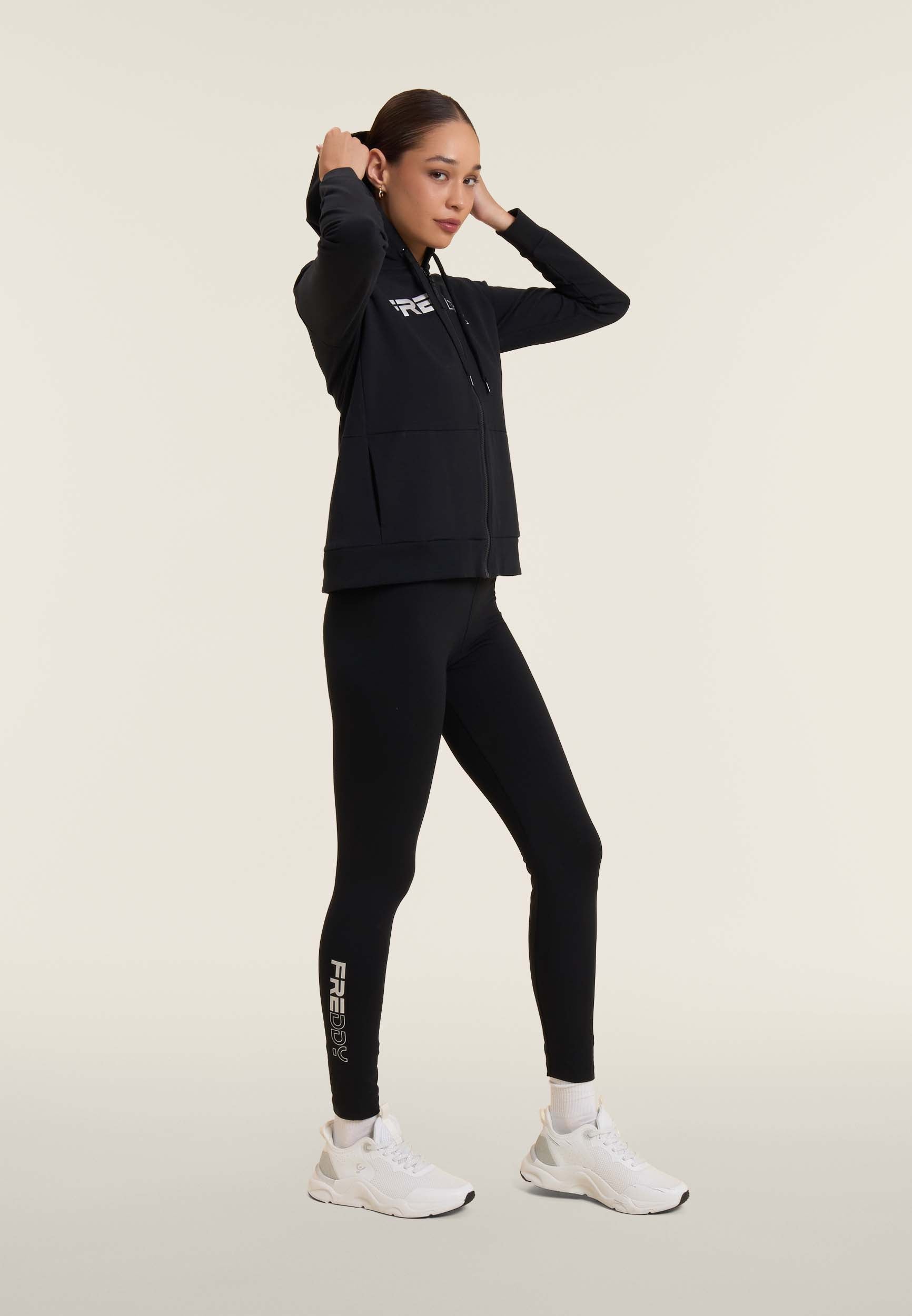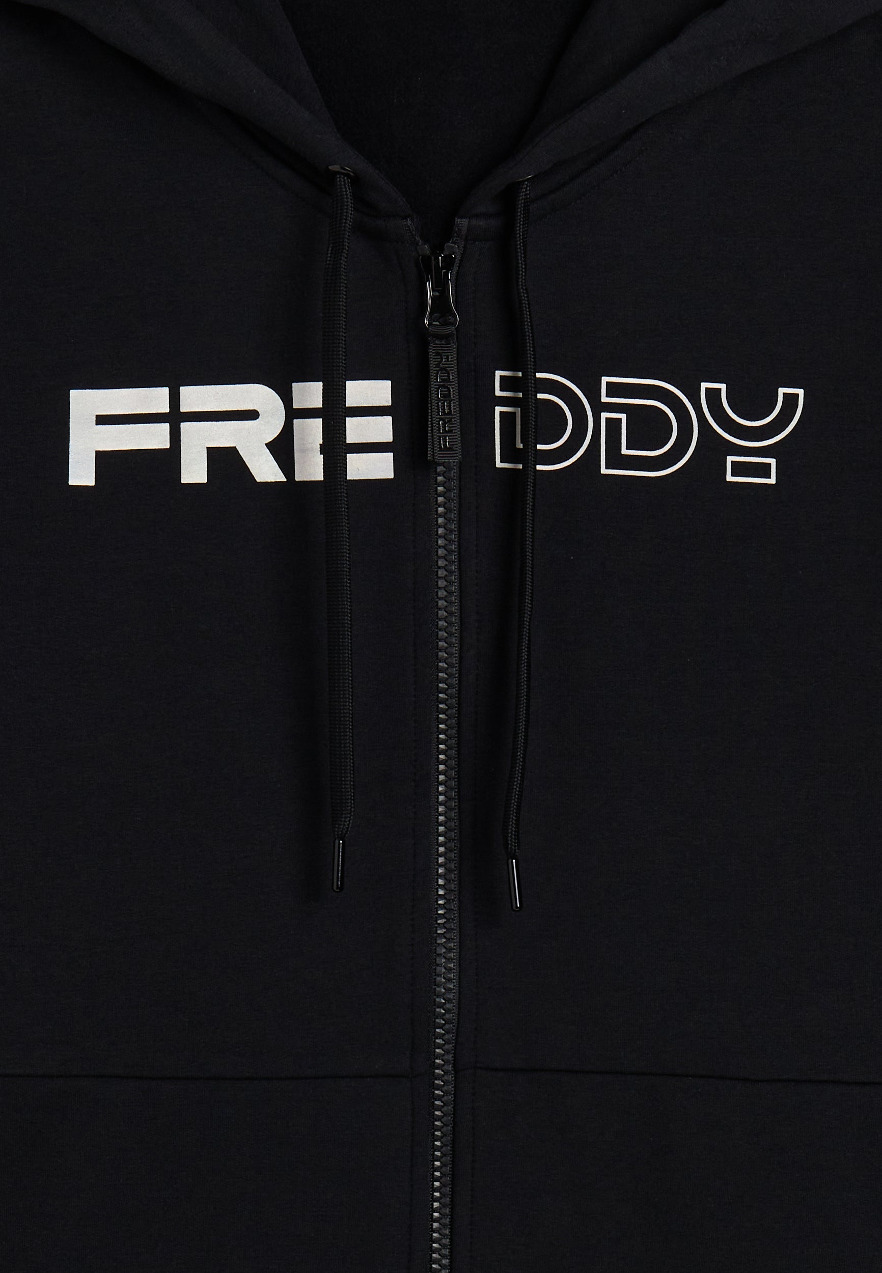 Sudadera deportiva de corte comfort fit con cierre de cremallera completa, capucha ajustable con cordón y forro en tejido de punto. El bajo y los puños son de canalé para un ajuste estable. El gran logotipo FREDDY en el pecho con efecto perlado le da un toque enérgico, mientras que los bolsillos internos ribeteados le confieren practicidad. Confeccionada en felpa perchada elástica.