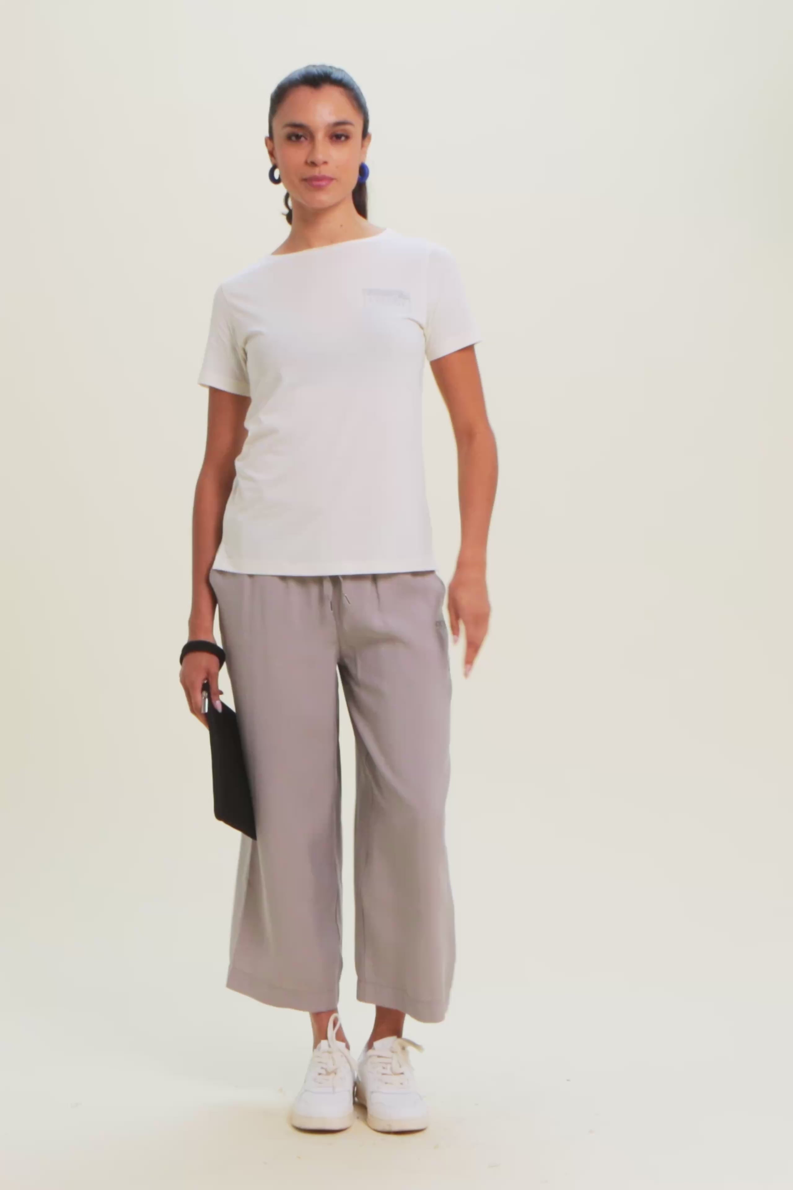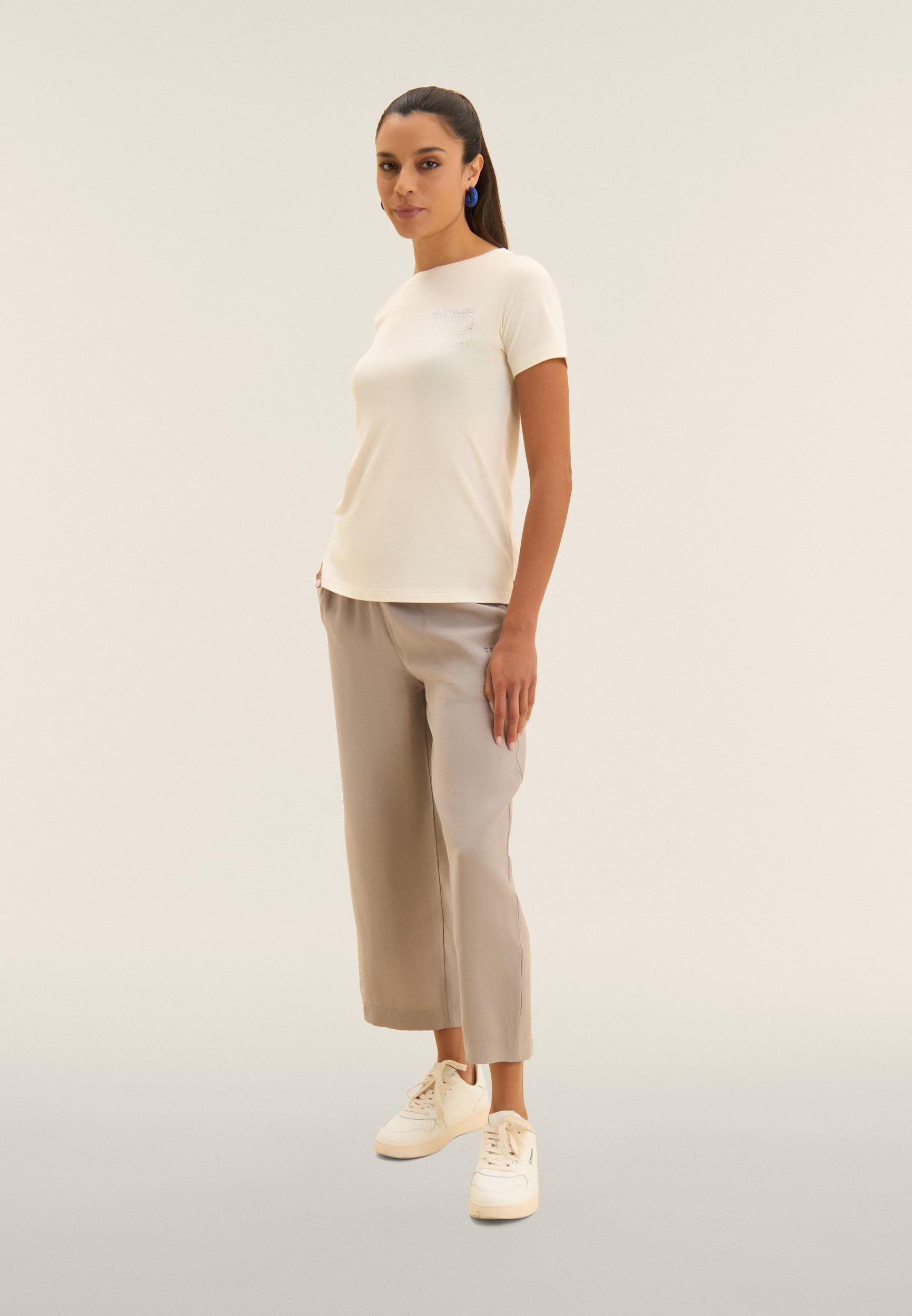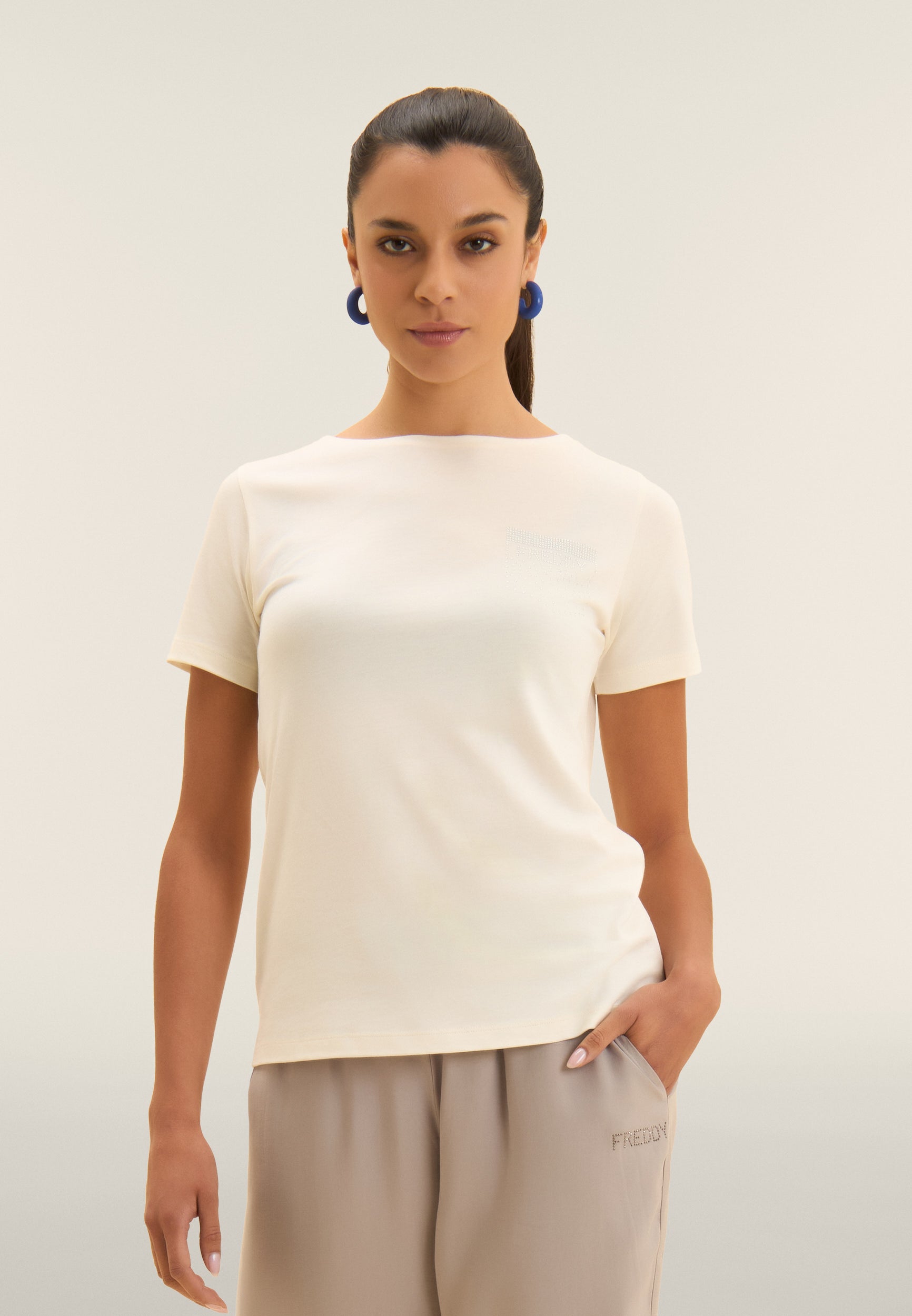 T-shirt a manica corta con vestibilità regular e fondo dritto, arricchita da piccoli spacchi laterali. Il collo girocollo e le maniche corte creano una silhouette semplice ma elegante. La decorazione strass, a forma di taschino sul cuore con il logo FREDDY, dona un tocco luminoso e raffinato. Realizzata in Jersey di Cotone e Modal, la t-shirt garantisce morbidezza, comfort e una sensazione di freschezza grazie alla sua texture liscia e leggera.