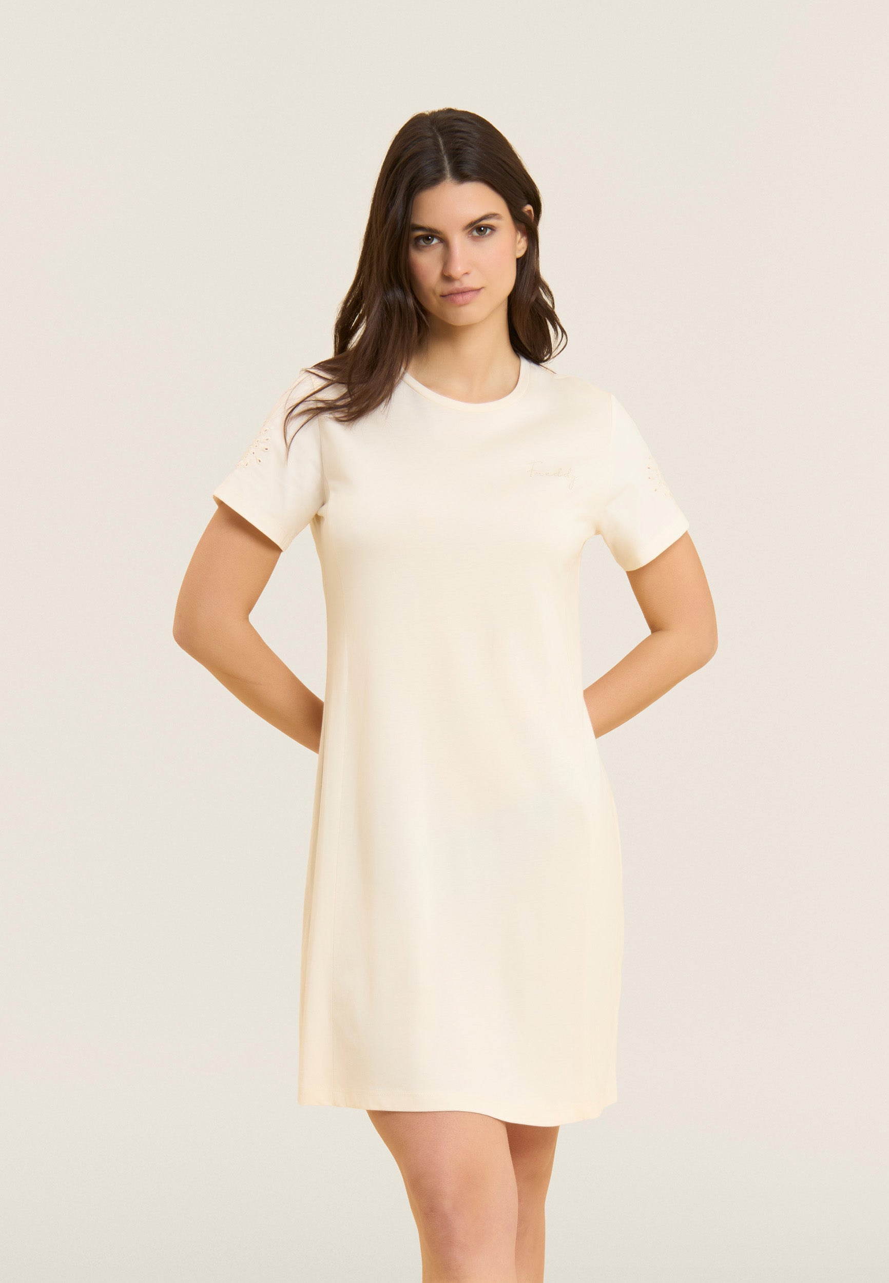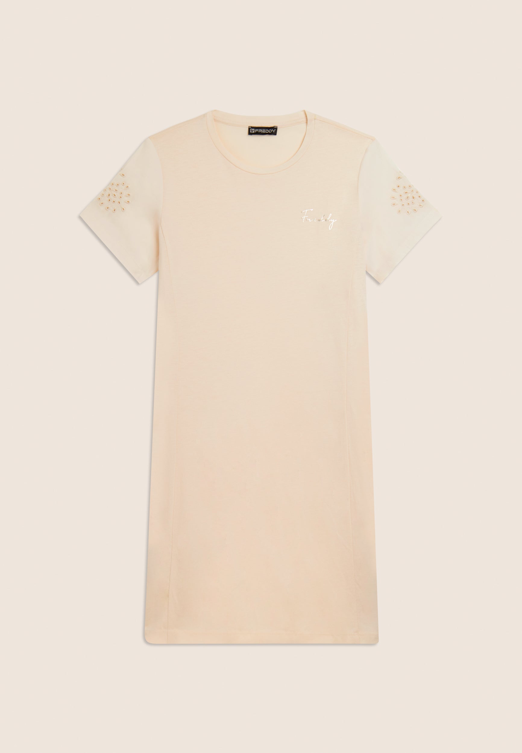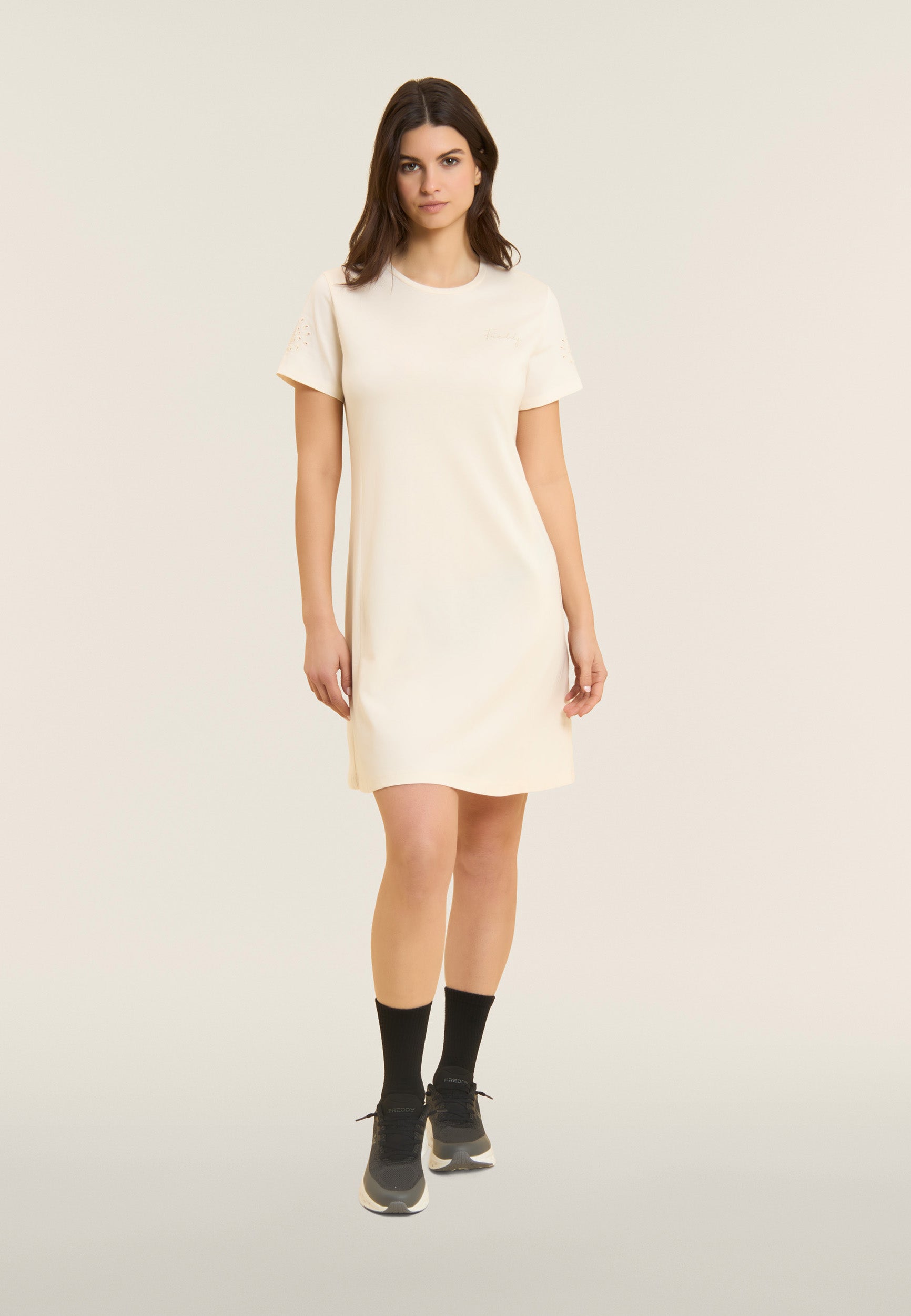 Un vestido de corte regular y largo por encima de la rodilla, con costuras a lo largo que realzan discretamente la figura. El bajo recto y el escote redondo se acompañan de mangas de popelina elástica con bordados suizos florales. Luce un pequeño logotipo de Freddy de tachuelas en el pecho, añadiendo un detalle exclusivo. Confeccionado en tejido de punto de algodón y modal, este vestido combina suavidad, transpirabilidad y comodidad para un look femenino y sofisticado.
