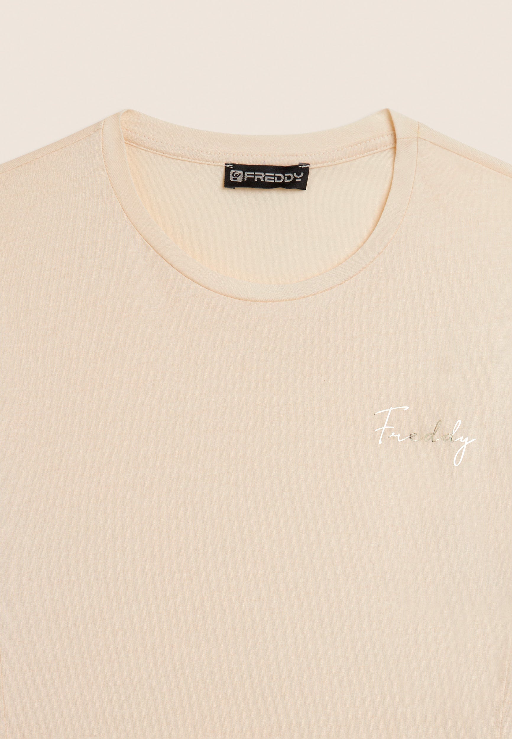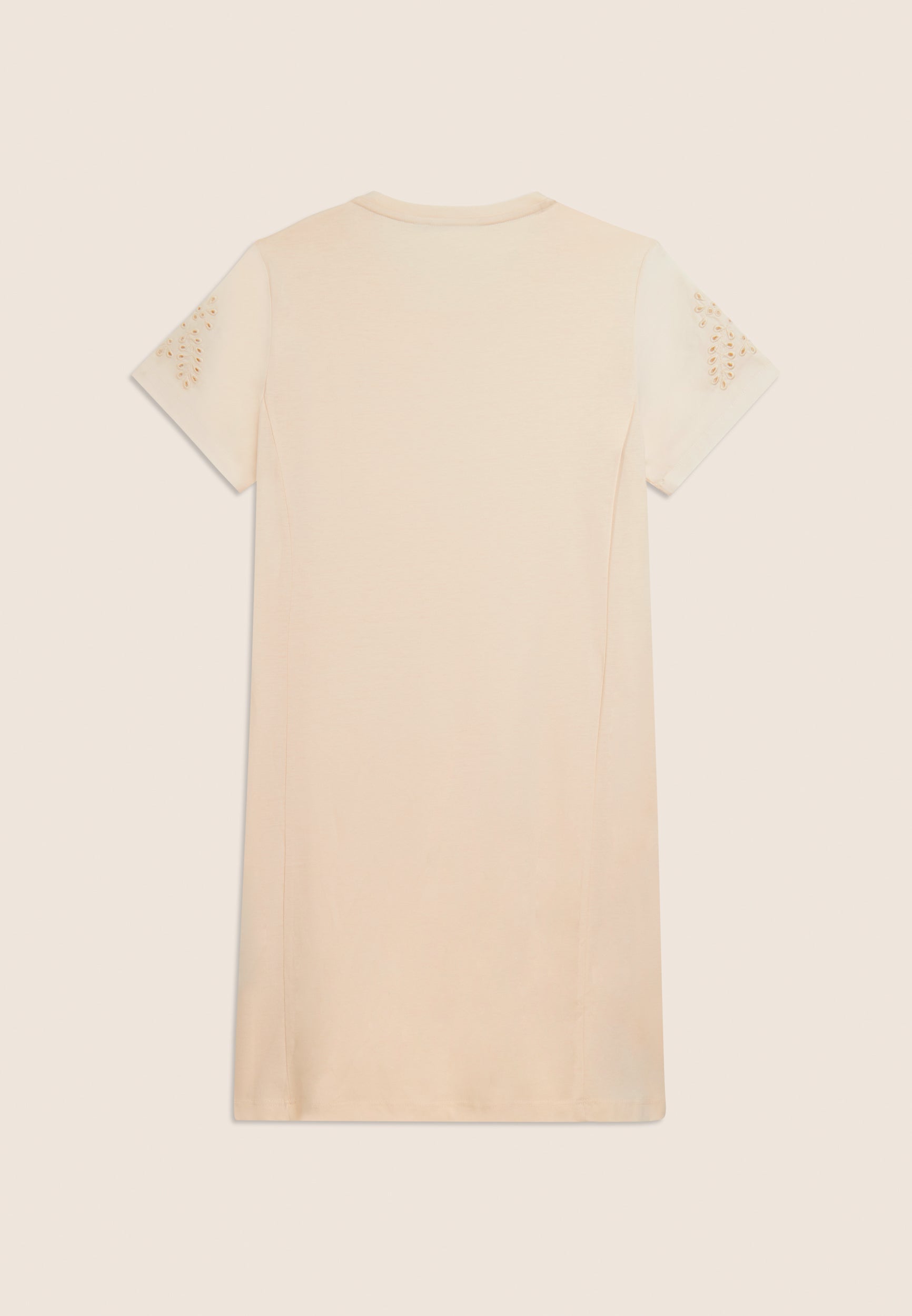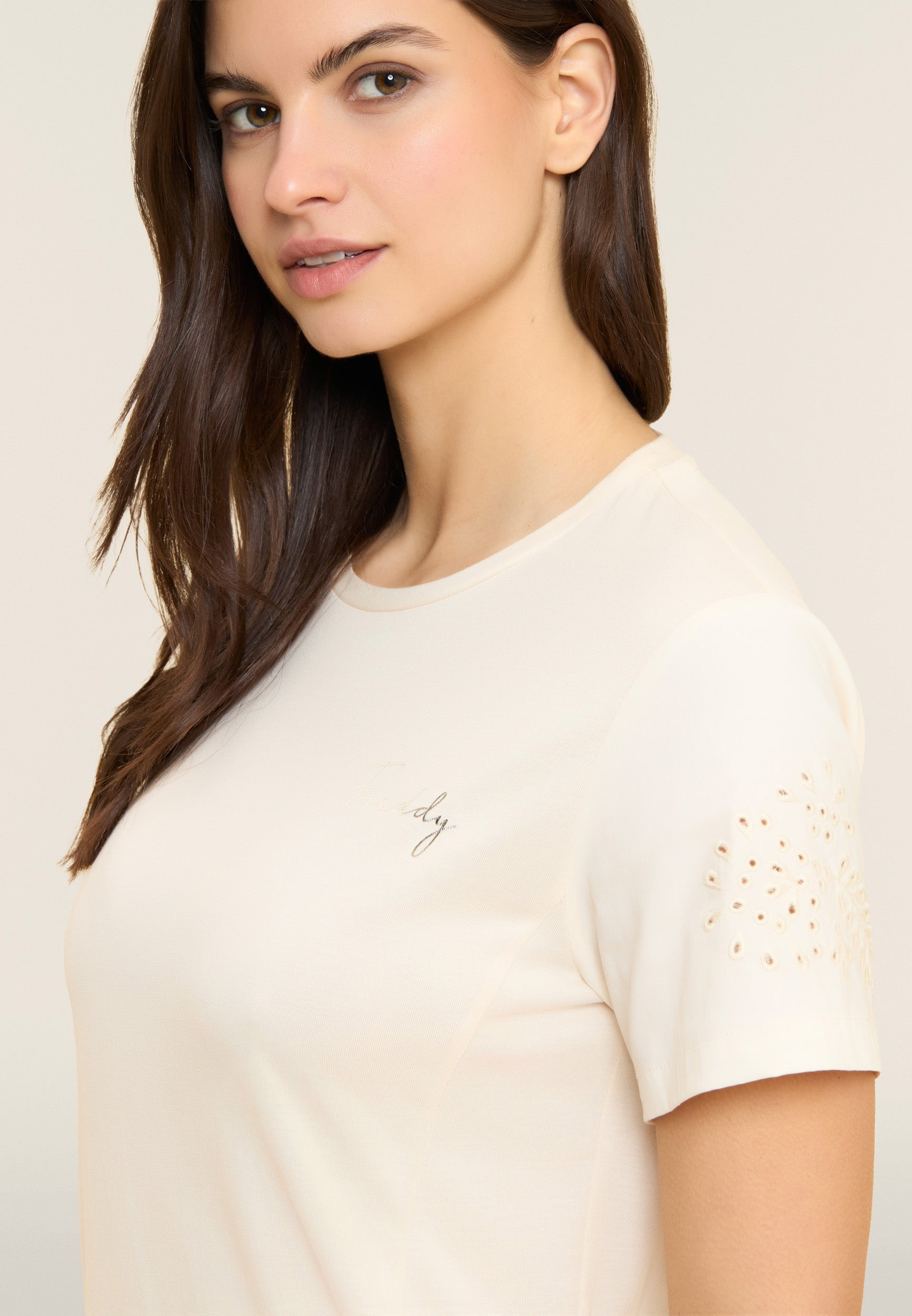 Un vestido de corte regular y largo por encima de la rodilla, con costuras a lo largo que realzan discretamente la figura. El bajo recto y el escote redondo se acompañan de mangas de popelina elástica con bordados suizos florales. Luce un pequeño logotipo de Freddy de tachuelas en el pecho, añadiendo un detalle exclusivo. Confeccionado en tejido de punto de algodón y modal, este vestido combina suavidad, transpirabilidad y comodidad para un look femenino y sofisticado.