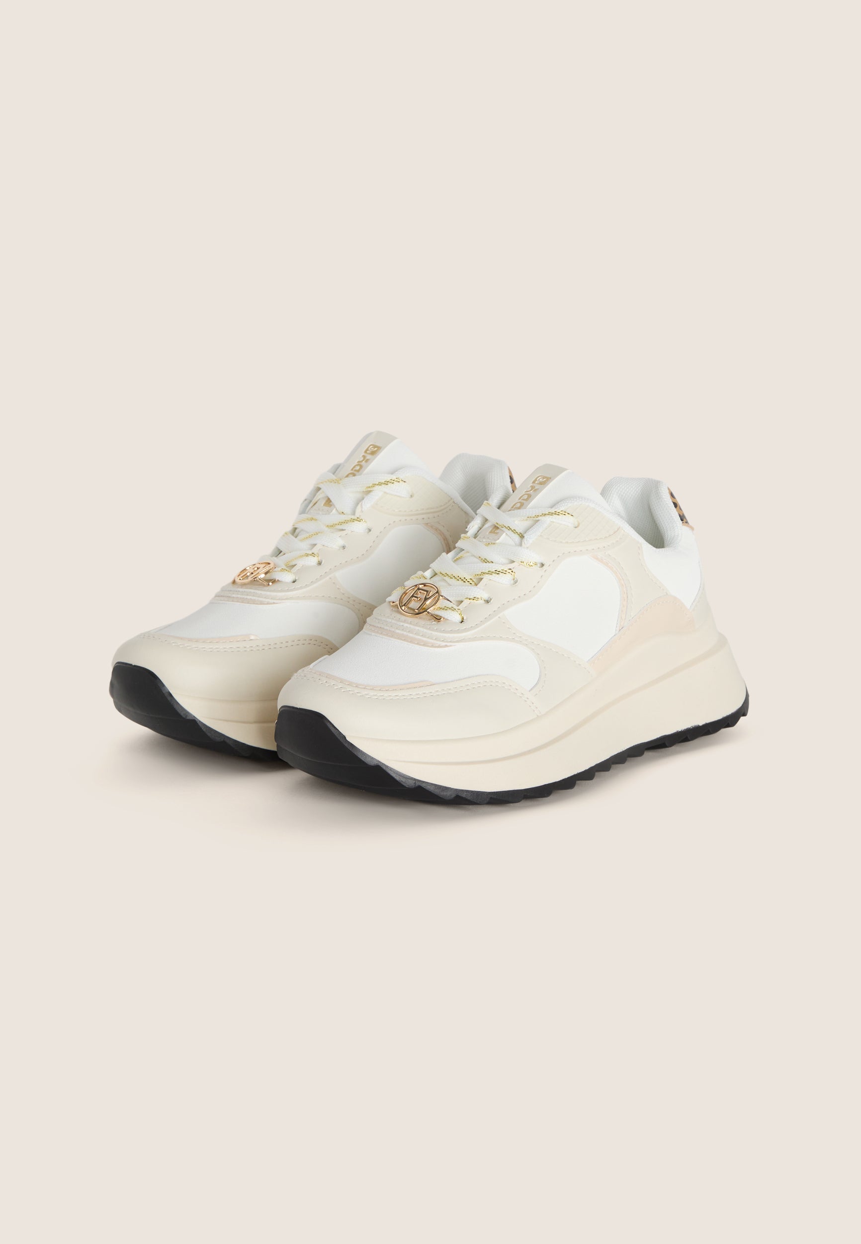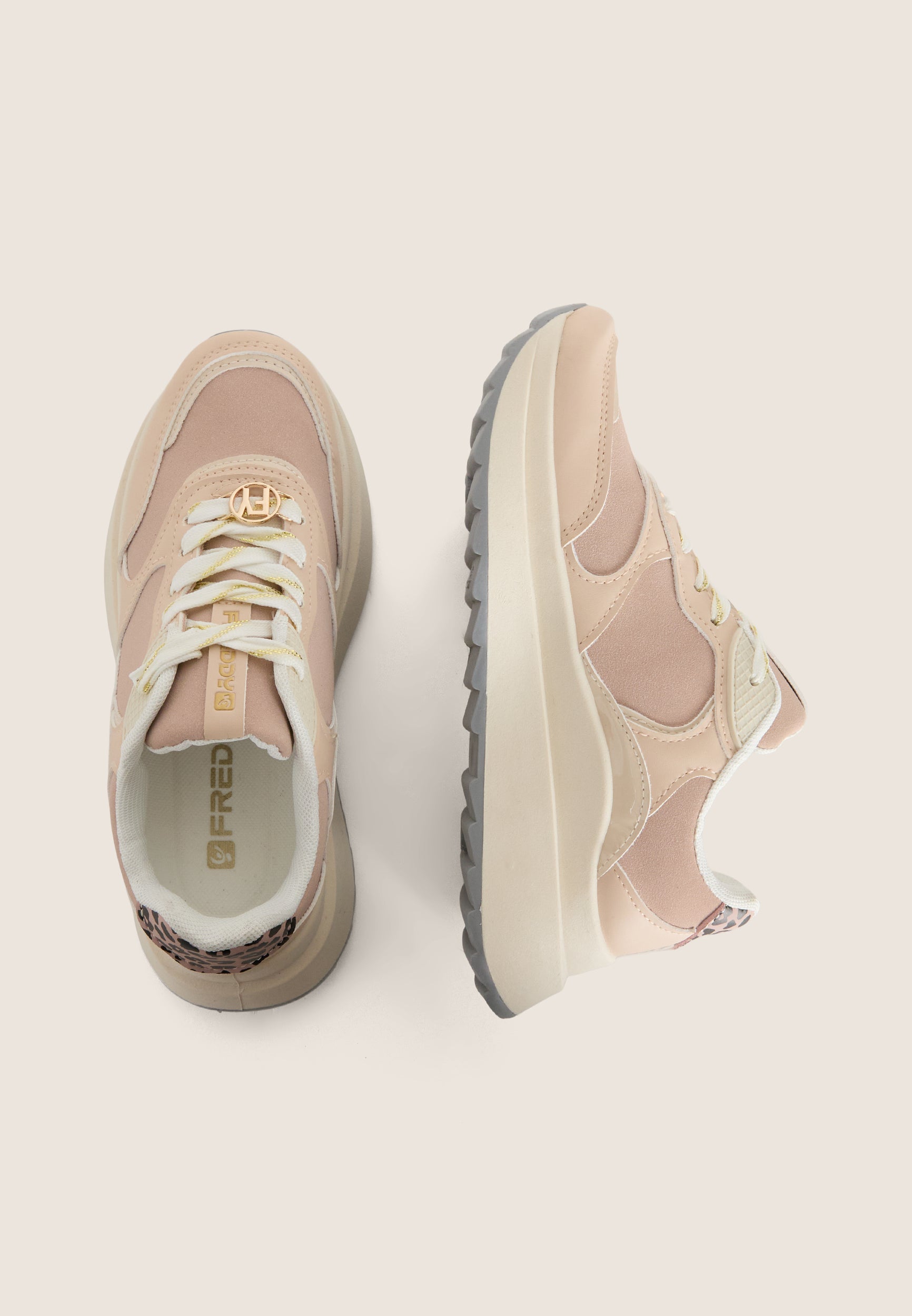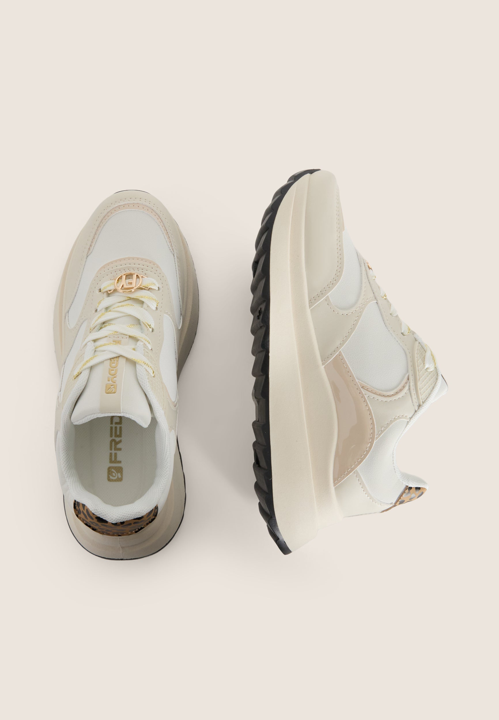 Estas zapatillas deportivas de imitación cuero, realzadas con detalles de charol y una inserción animal print en el talón, combinan elegancia y carácter. Los cordones de tela y el logotipo metálico de FY como accesorio en los cordones añaden un toque distintivo. La plantilla «Massage» extraíble garantiza comodidad durante todo el día, mientras que la suela de goma antideslizante asegura una pisada estable y segura. Un diseño moderno y versátil, perfecto para cada momento del día.