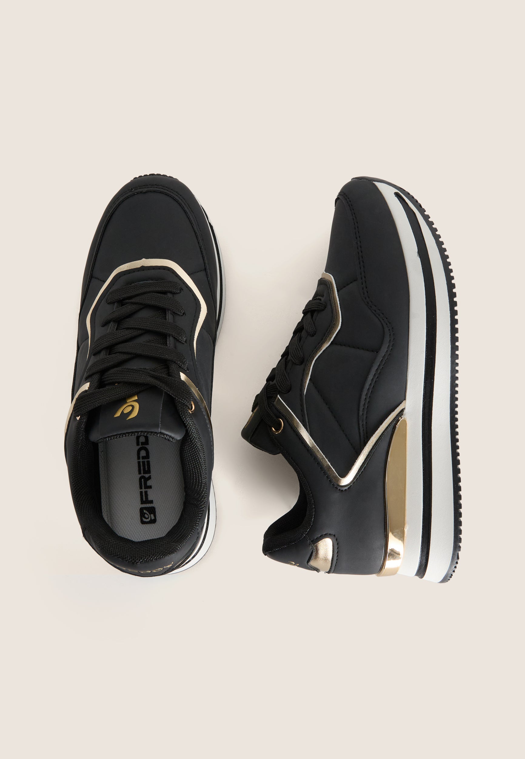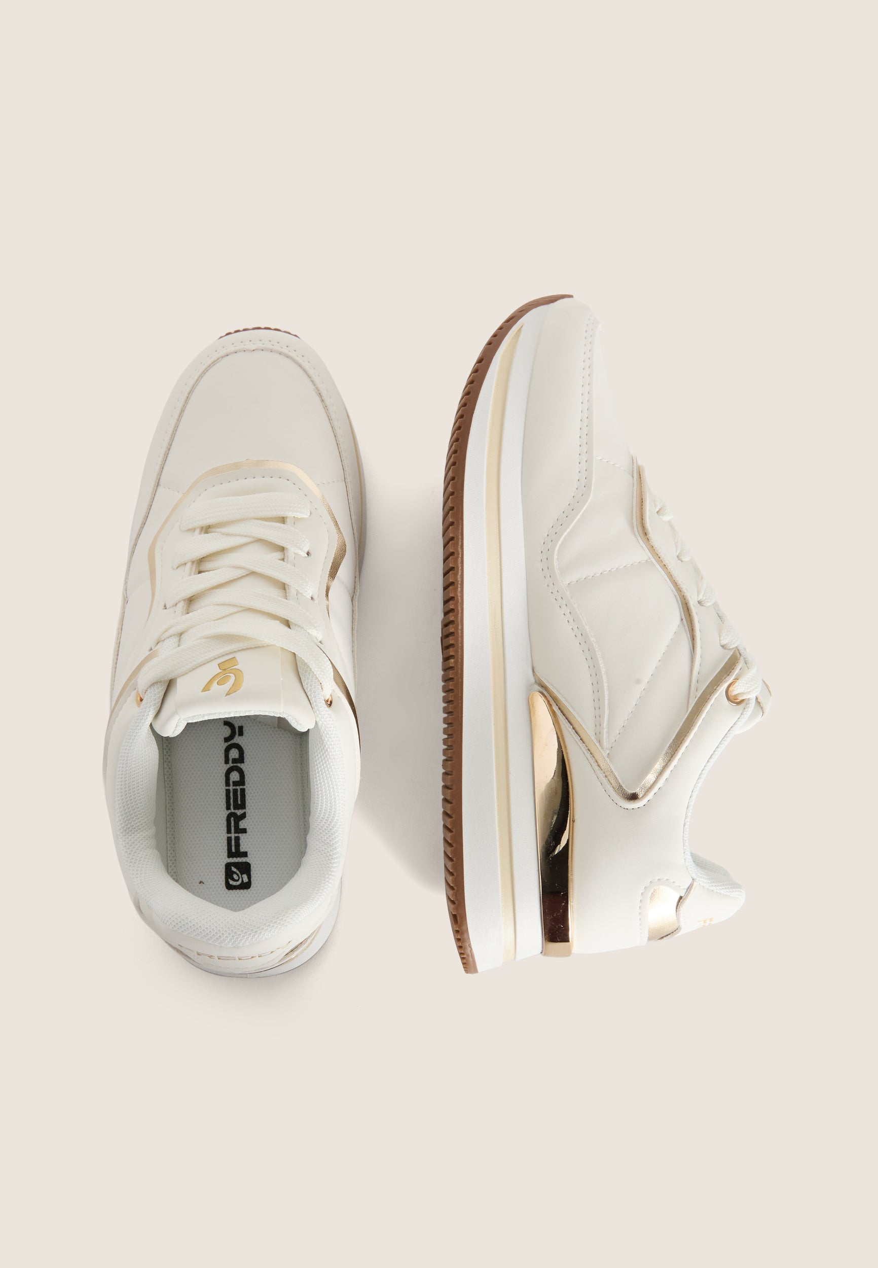 Estas zapatillas deportivas combinan estilo y comodidad para cualquier momento del día. Con pala de imitación cuero y detalles metálicos, estas zapatillas están adornadas con cordones de tela y ojales metálicos para crear un look actual. La plantilla extraíble de espuma con memoria asegura un confort óptimo, mientras que la suela de goma antideslizante garantiza una estabilidad perfecta. El logotipo metálico de Freddy en el talón y la lengüeta añade un toque distintivo. Perfectas para completar tu conjunto diario con un toque de elegancia.