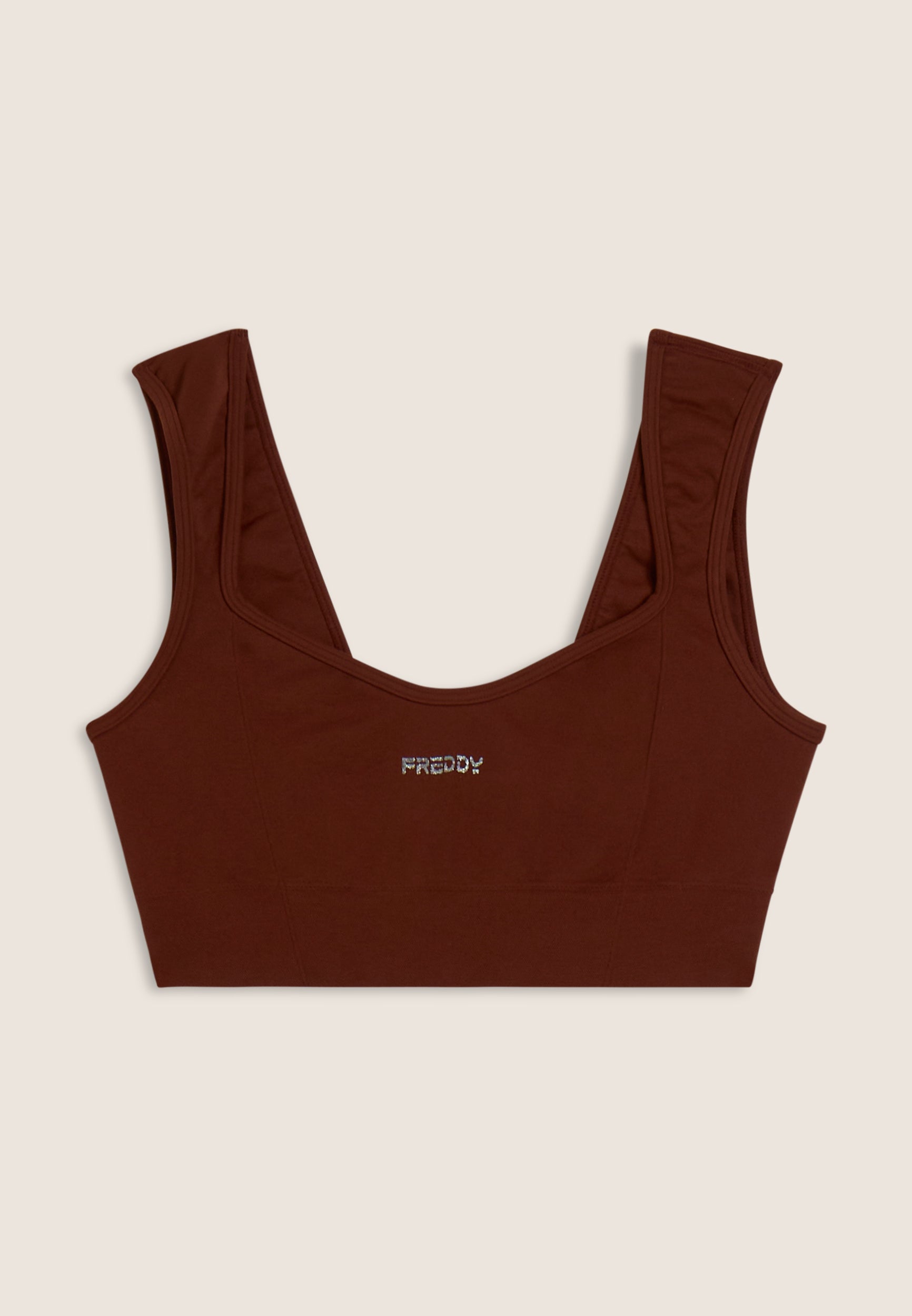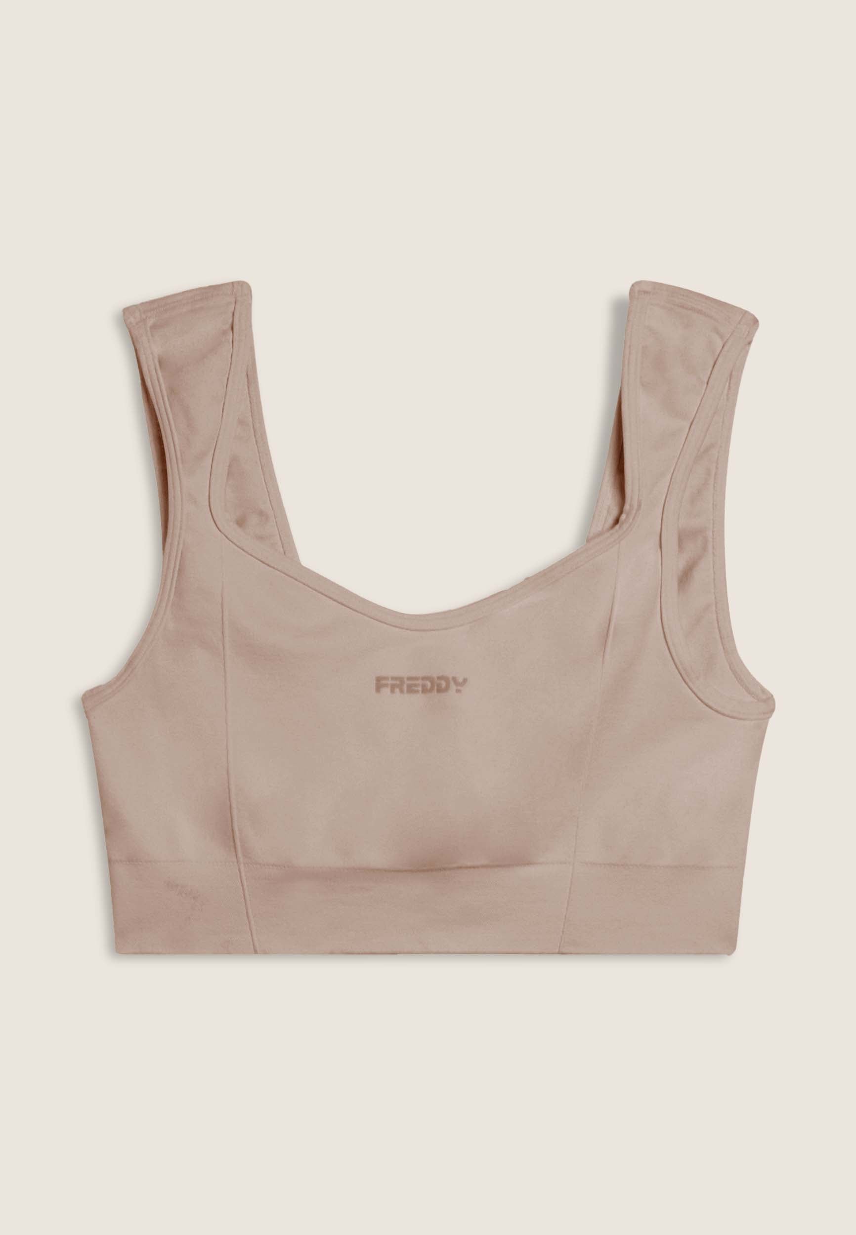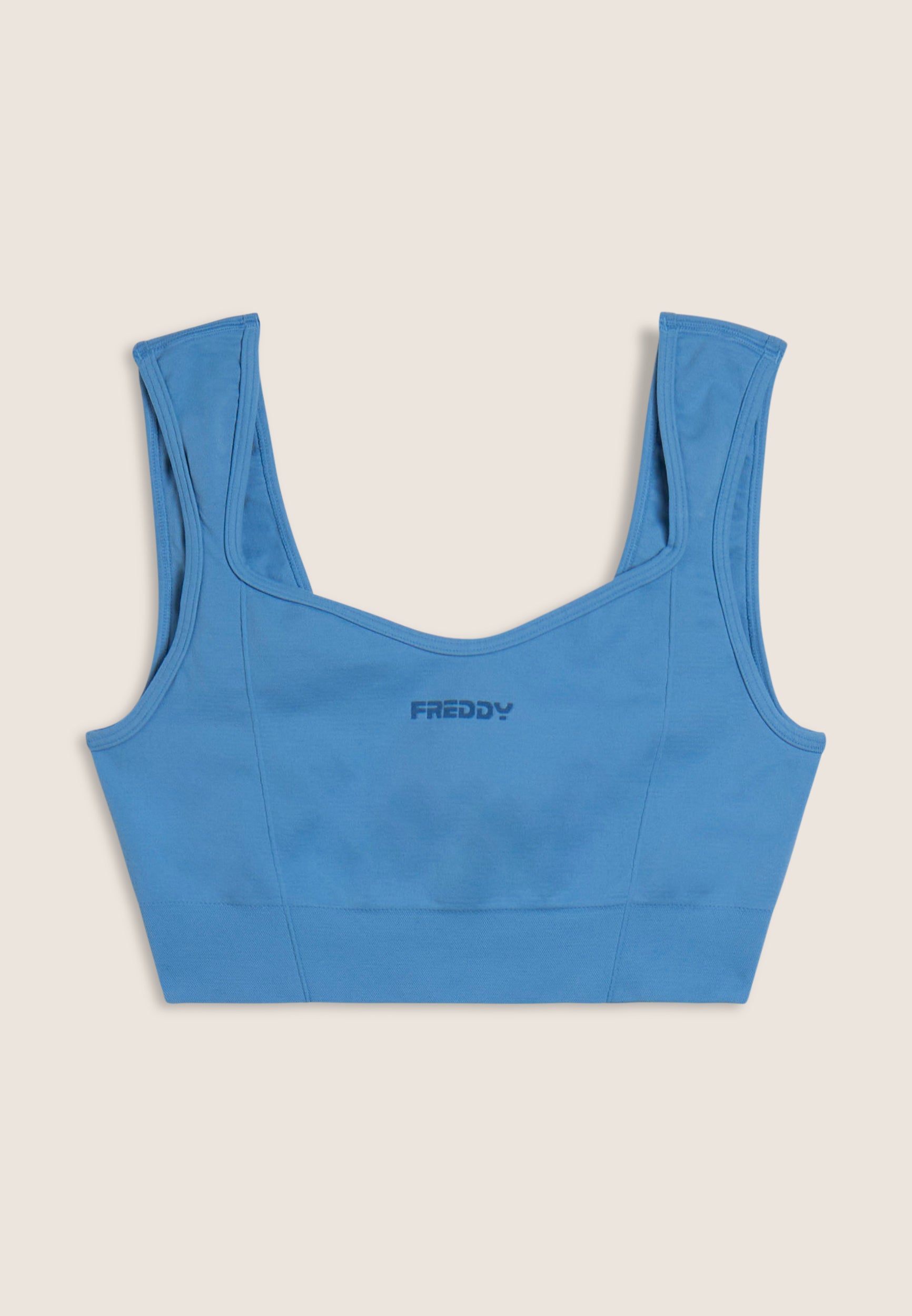 Avec un design féminin et confortable, cette brassière de sport au soutien léger est parfaite pour le yoga et les activités de faible intensité. Col en cœur sur le devant et carré sur le dos avec des bretelles classiques. Le tissu technique en jersey de nylon est doux, respirant et léger, avec un petit logo FREDDY sur le devant en couleur contrastée.