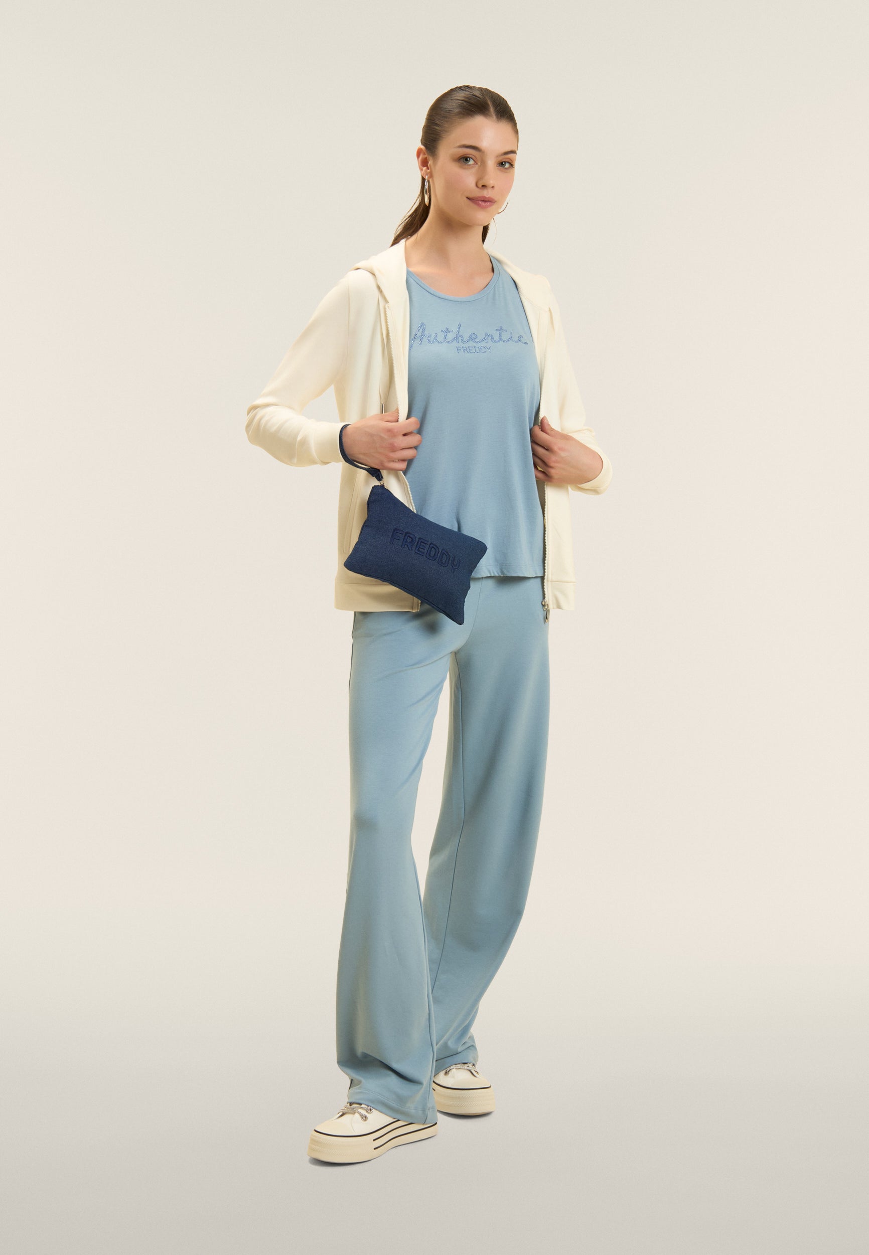 Canotta con vestibilità e lunghezza regular, dal fondo leggermente svasato con piccoli spacchi laterali. Scollo girocollo e spalline larghe completano il design semplice e femminile. La scritta "Authentic" e il logo FREDDY, entrambi realizzati con strass in tono colore, decorano il fronte, aggiungendo luminosità. Il tessuto Jersey in Cotone e Modal assicura morbidezza, comfort e una piacevole sensazione di freschezza grazie alla sua texture liscia e leggera.