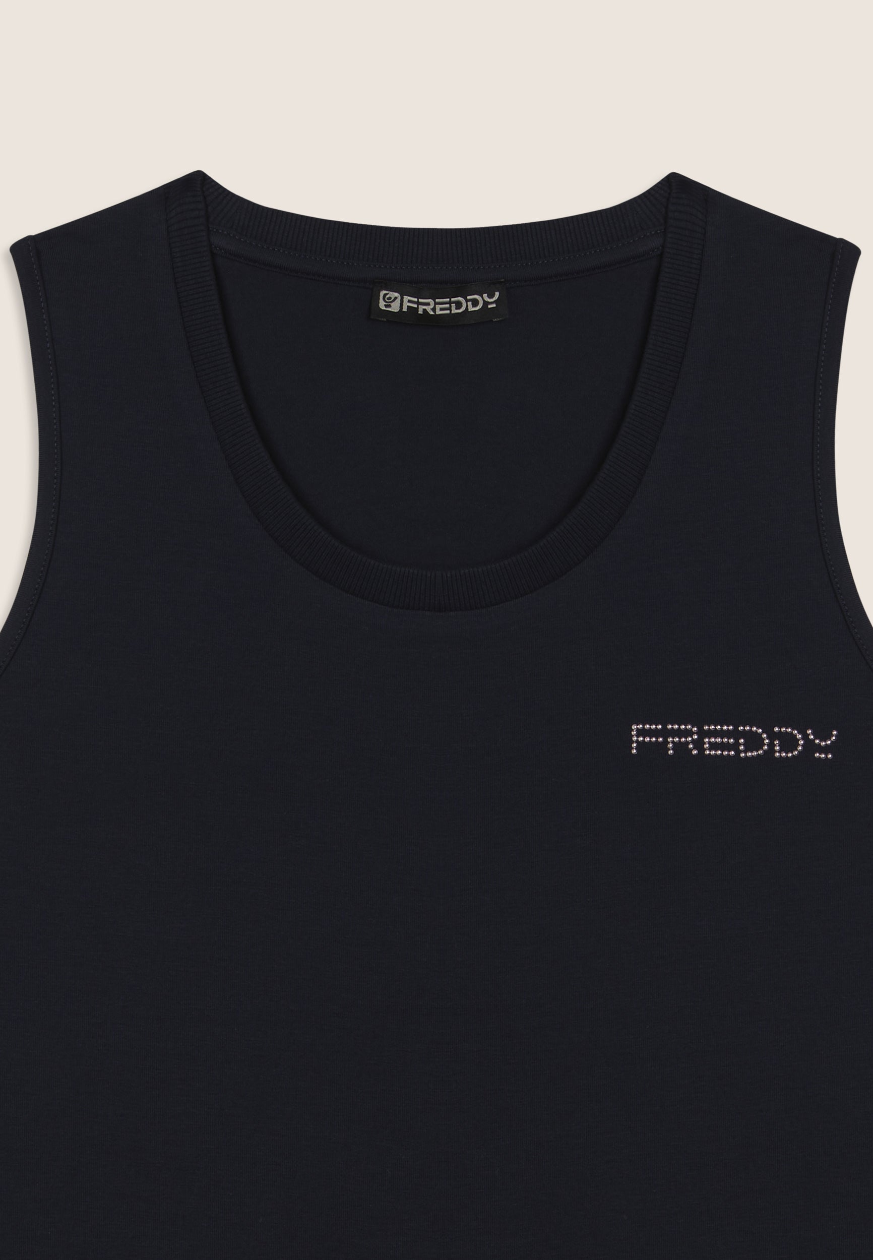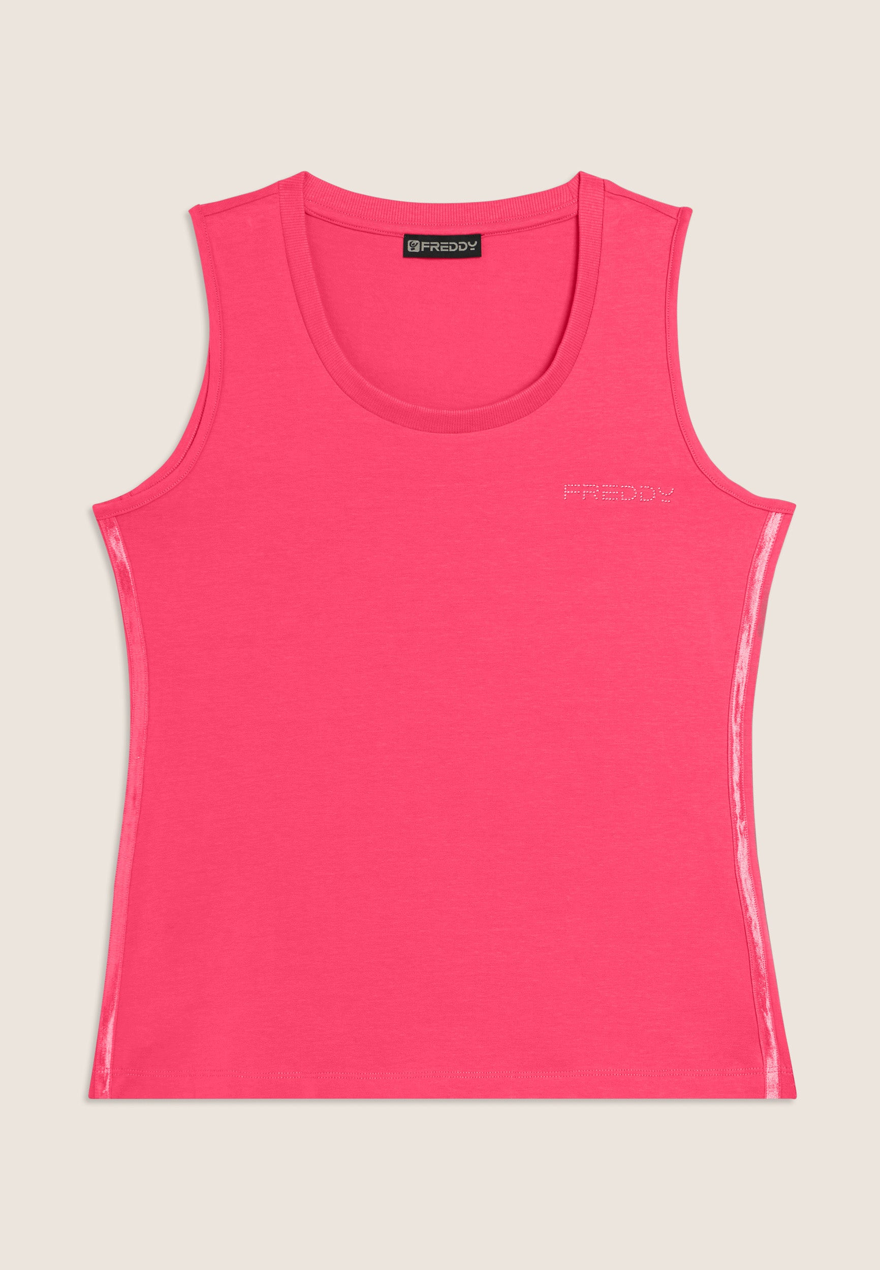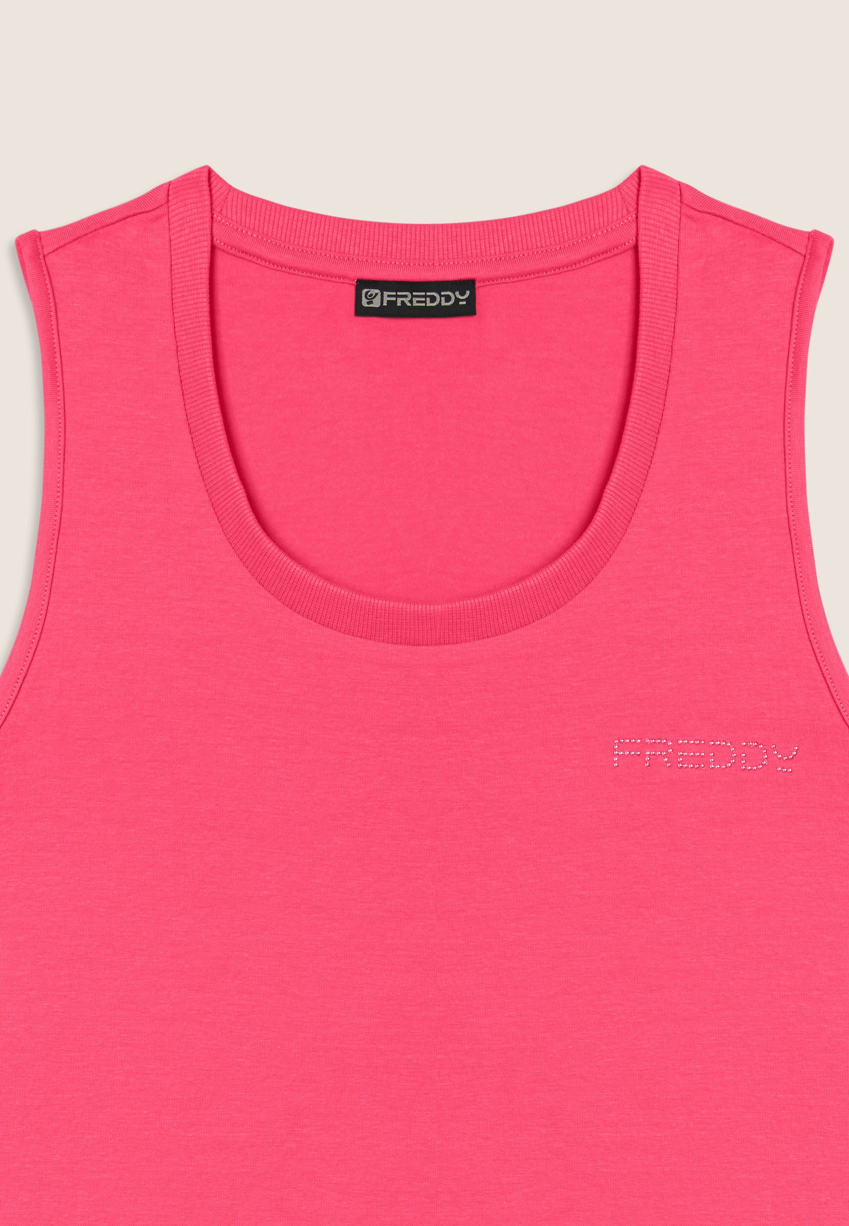 Canotta dal design essenziale e comodo, con scollo tondo e spalline ampie. La vestibilità regular e il fondo dritto assicurano un fit confortevole. Il logo FREDDY in perline rosa chiaro sul cuore e gli inserti elastici laterali lucidi decorano con eleganza. Perfetta per attività leggere, è realizzata in jersey leggero stretch di cotone.