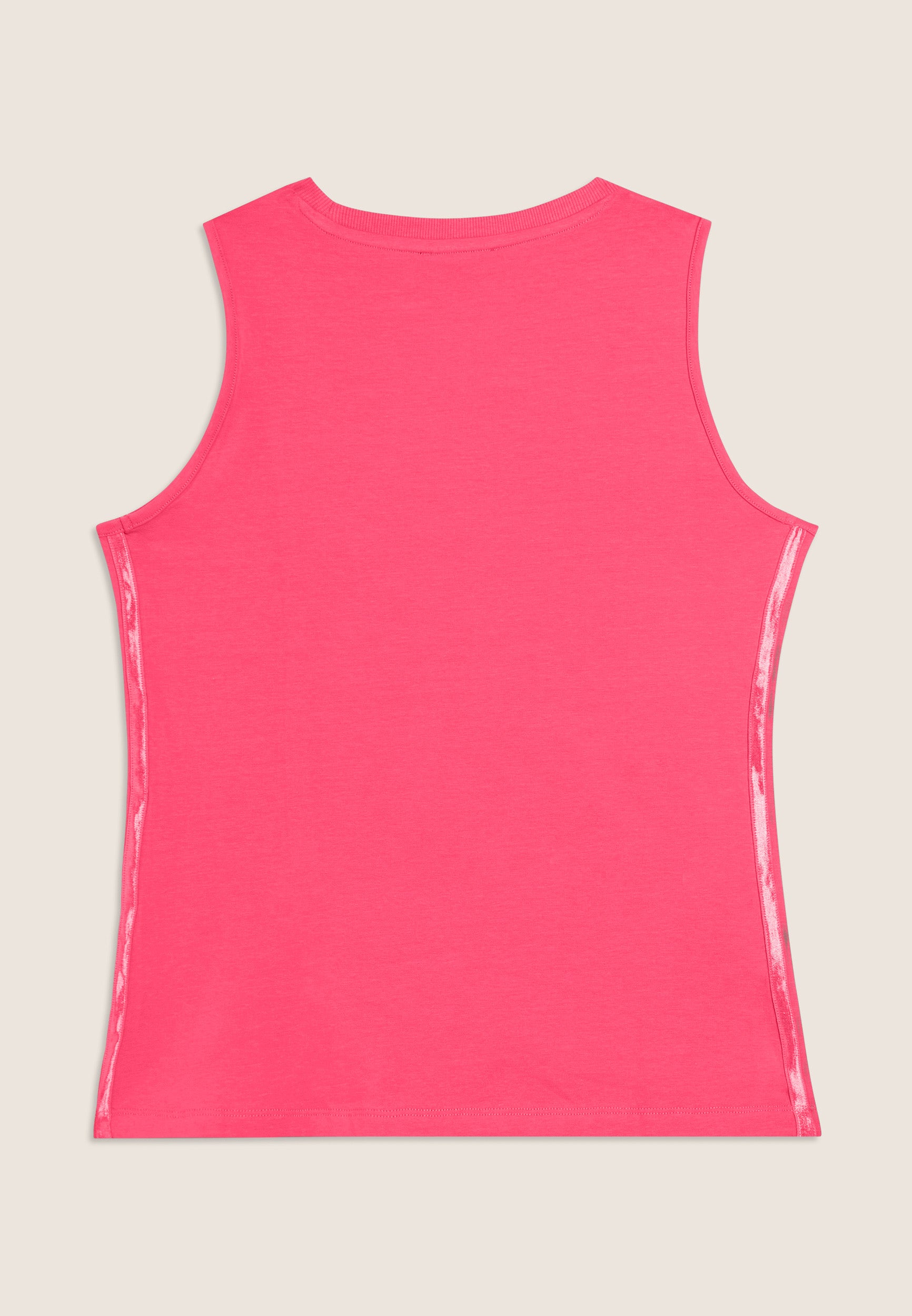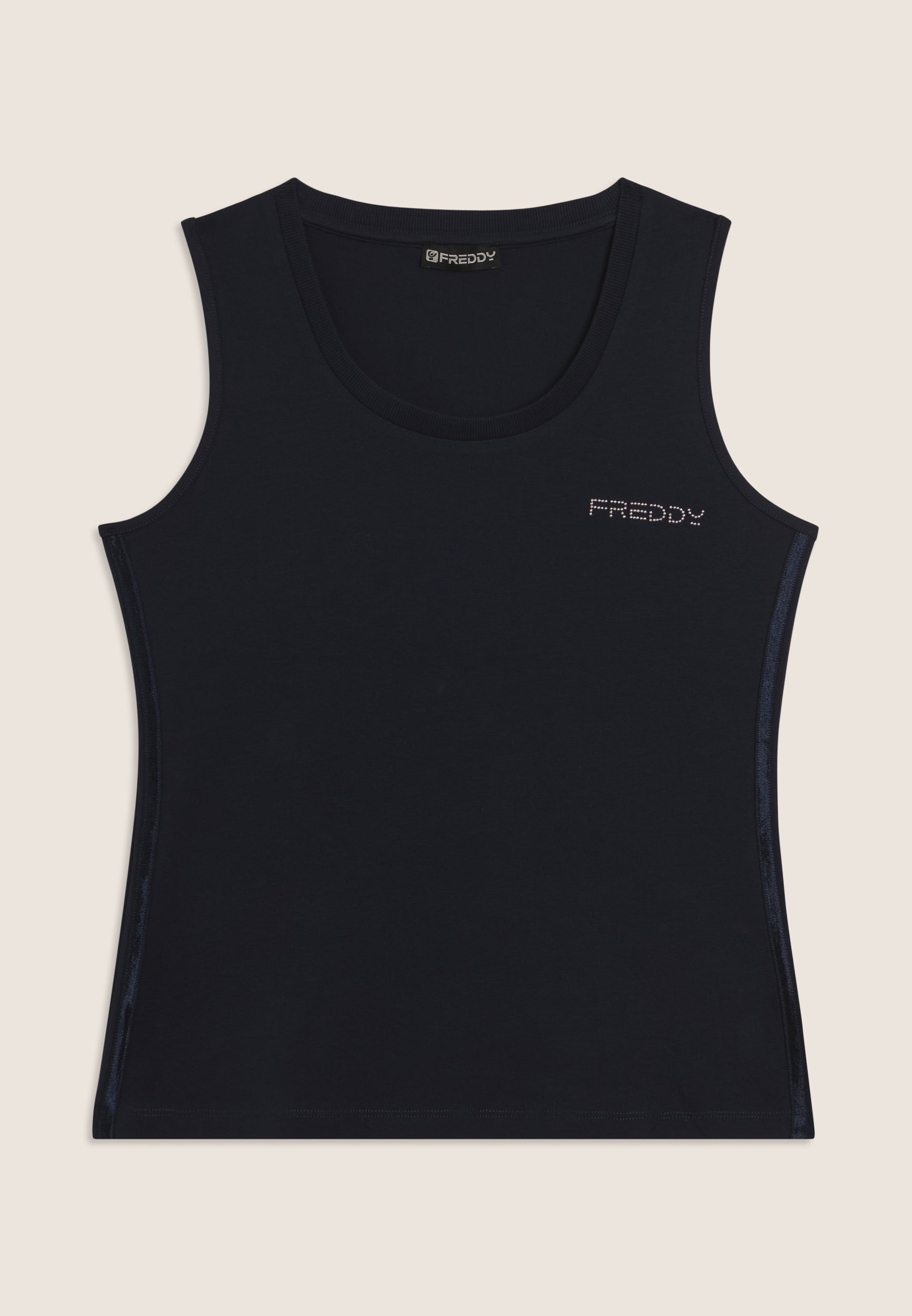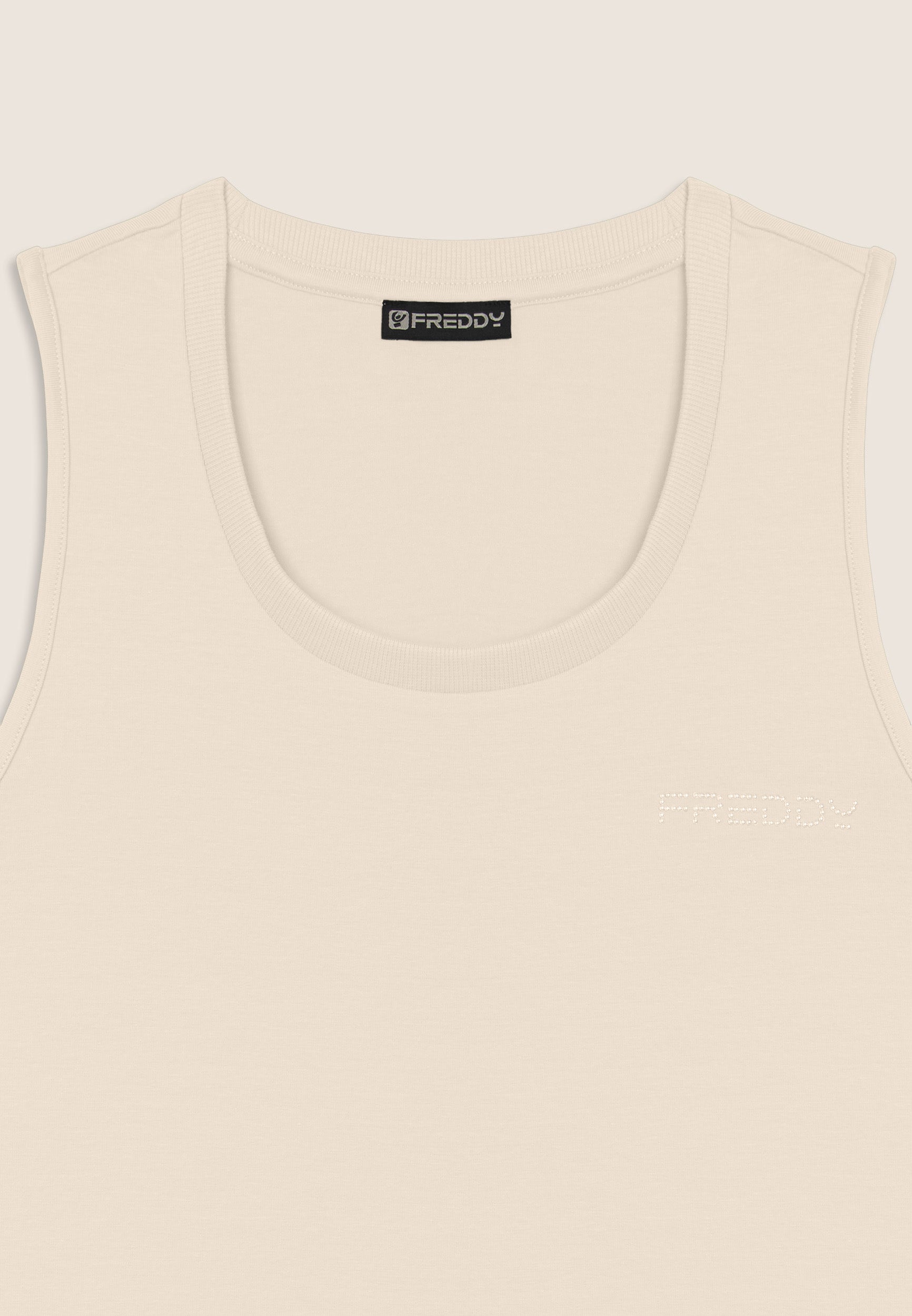 Canotta dal design essenziale e comodo, con scollo tondo e spalline ampie. La vestibilità regular e il fondo dritto assicurano un fit confortevole. Il logo FREDDY in perline rosa chiaro sul cuore e gli inserti elastici laterali lucidi decorano con eleganza. Perfetta per attività leggere, è realizzata in jersey leggero stretch di cotone.
