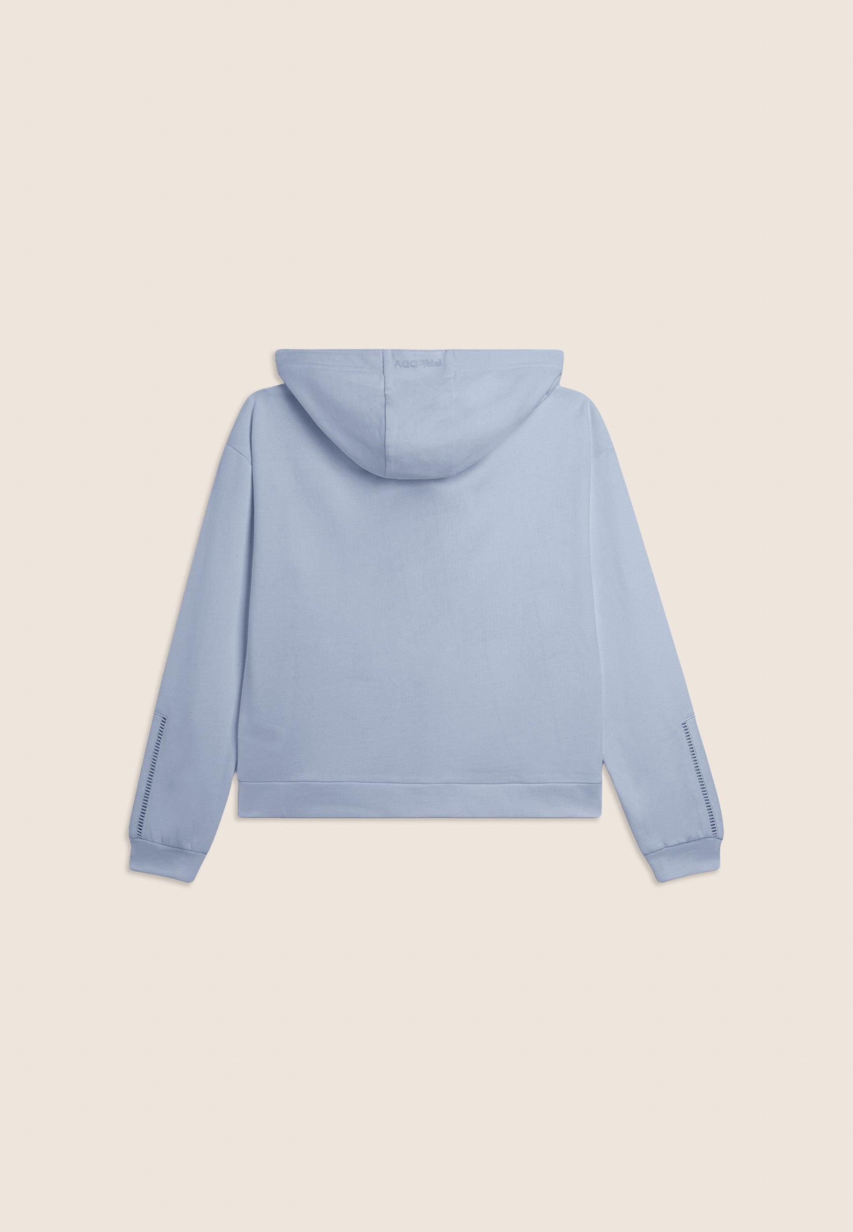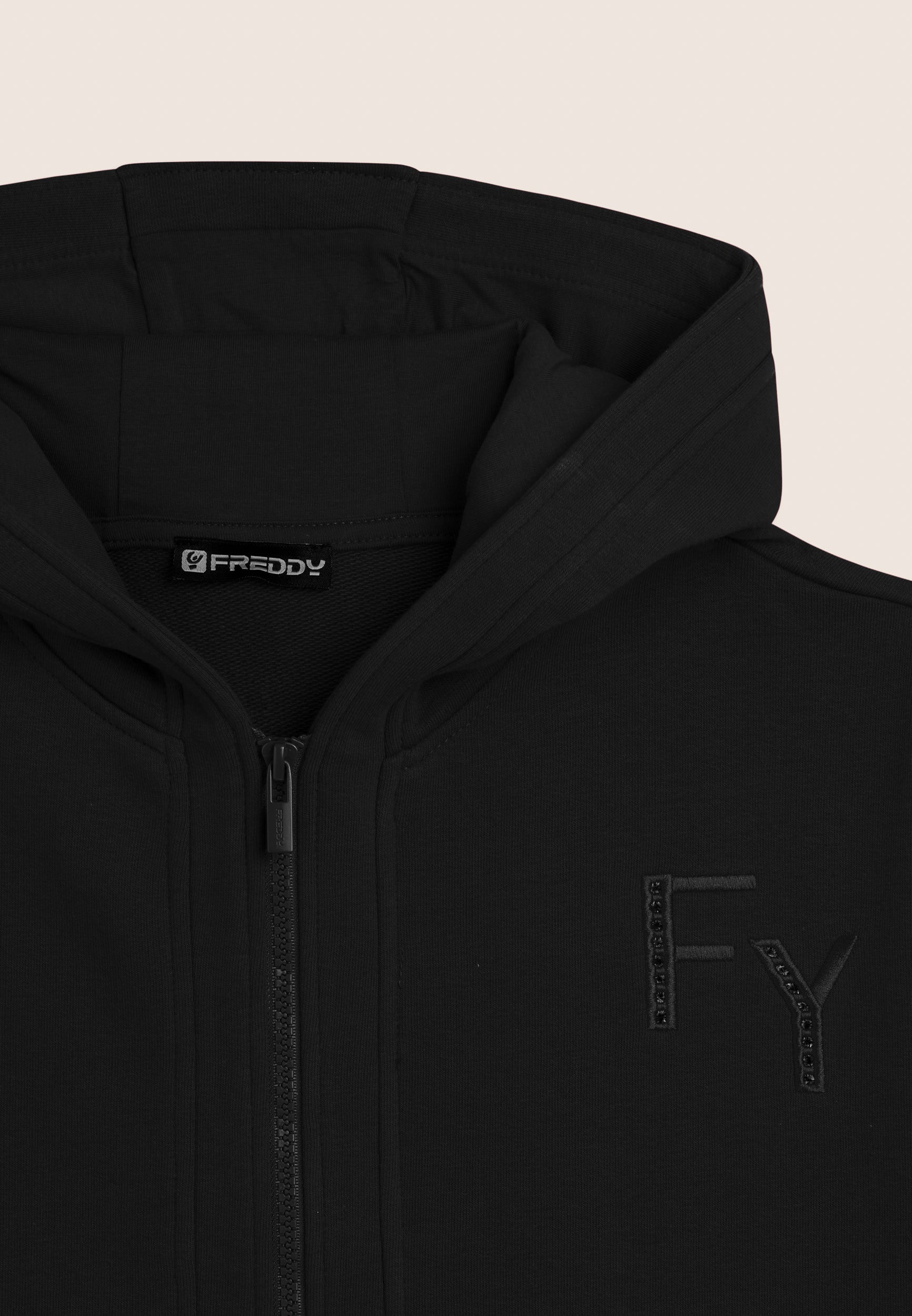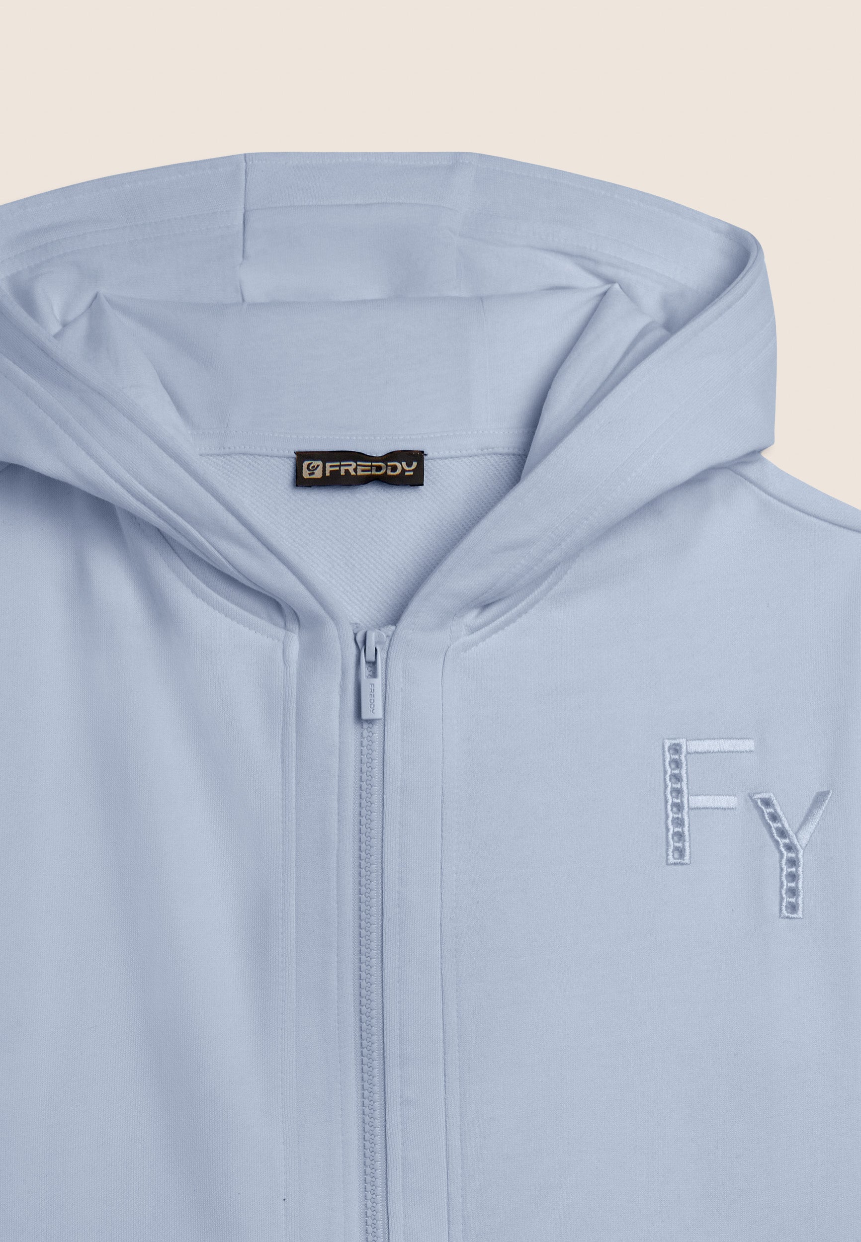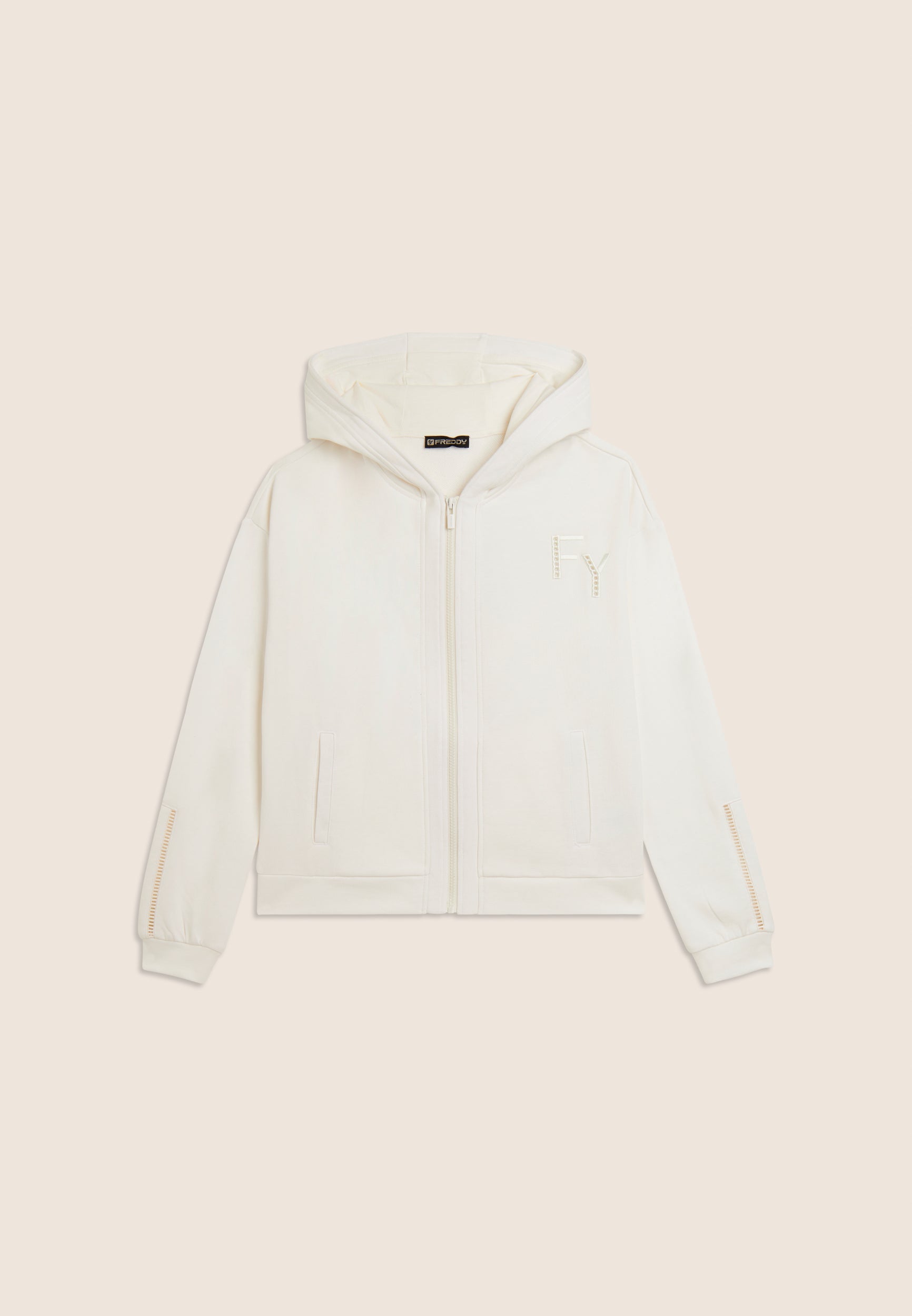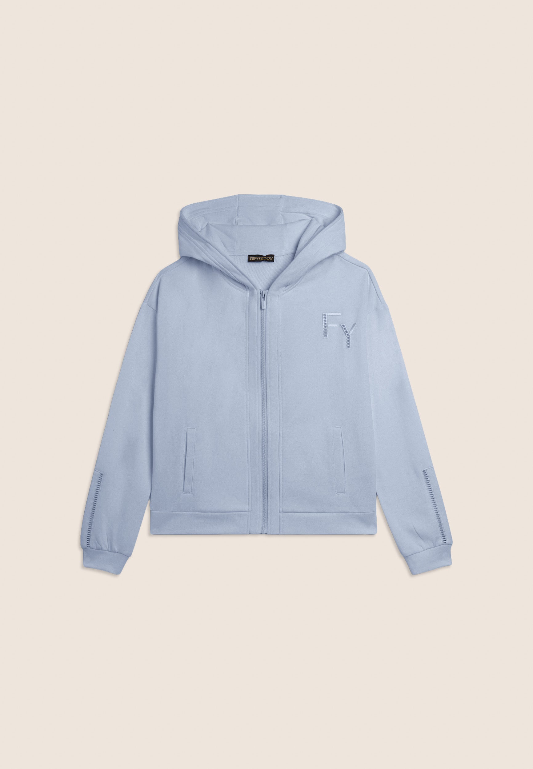 Felpa con cappuccio e chiusura full-zip, caratterizzata da un'accurata vestibilità regular e una lunghezza che arriva appena sopra i fianchi. Il cappuccio foderato in jersey e le maniche lunghe con polsini completano un design comodo e funzionale. Dettagli ricamati, come il logo FY sul cuore e un ricamo traforato lungo il fondo manica, aggiungono eleganza al capo. Le cuciture decorative lungo la zip e le spalle accentuano lo stile sportivo-chic. Realizzata in French Terry, un tessuto morbido e traspirante che unisce il comfort del cotone alla resistenza del poliestere.