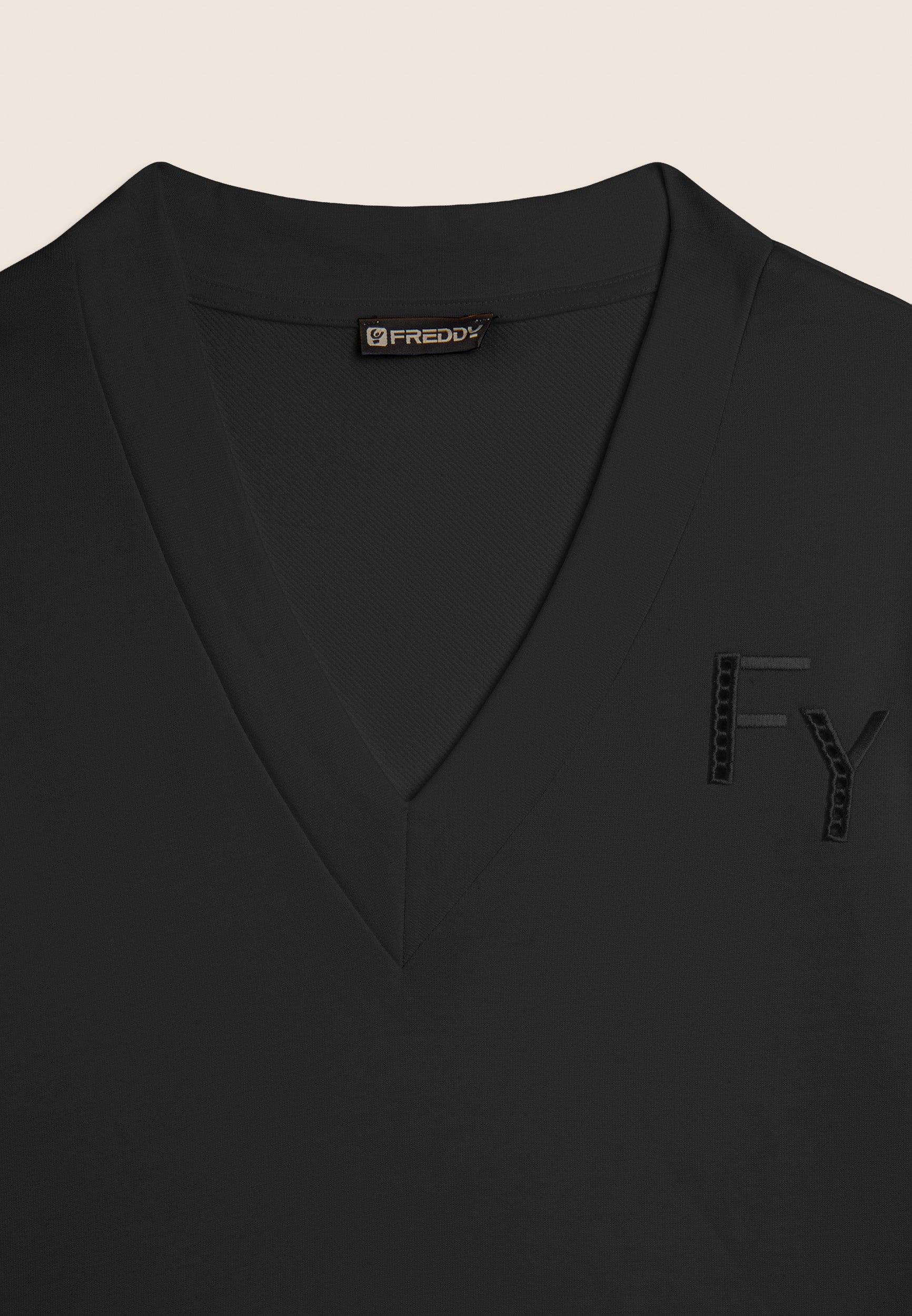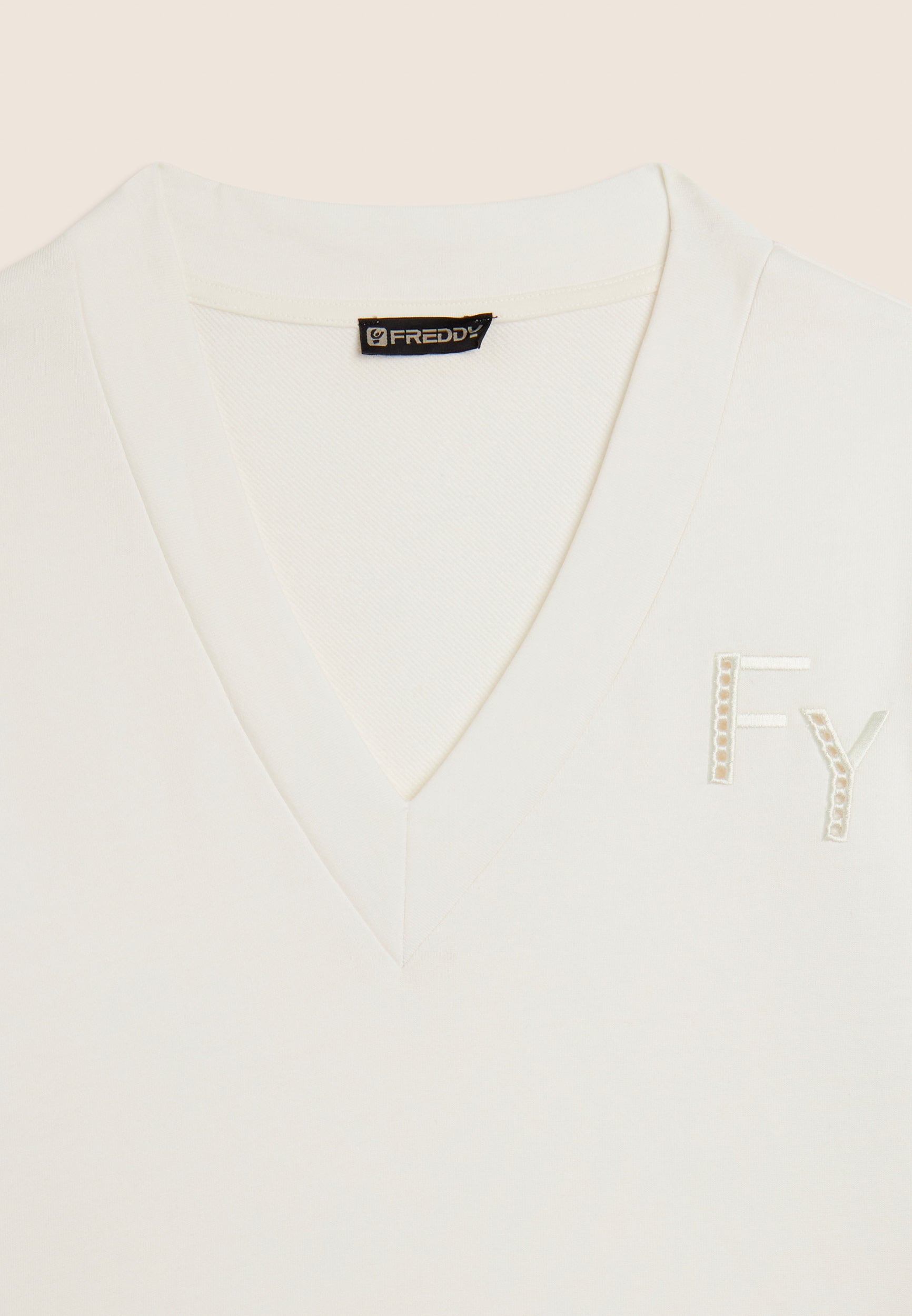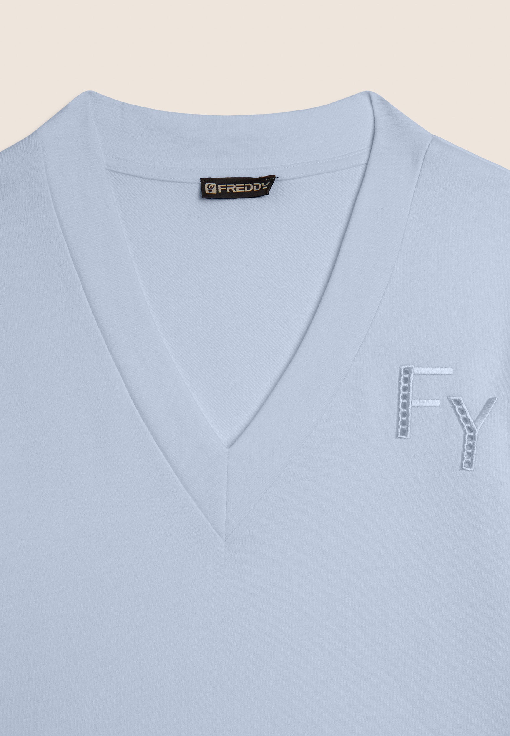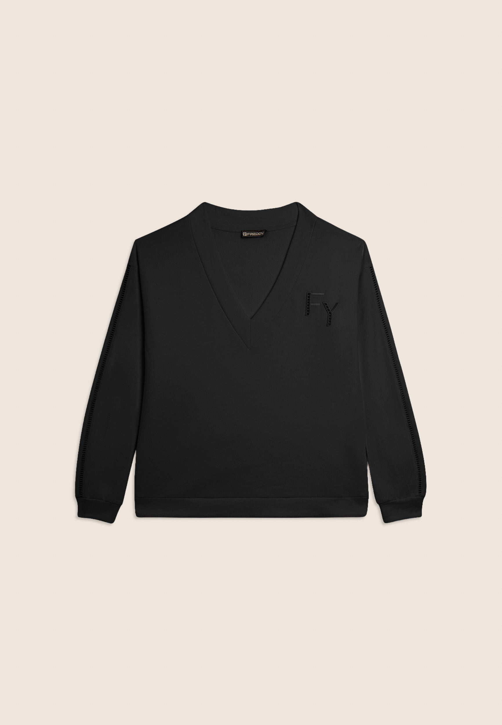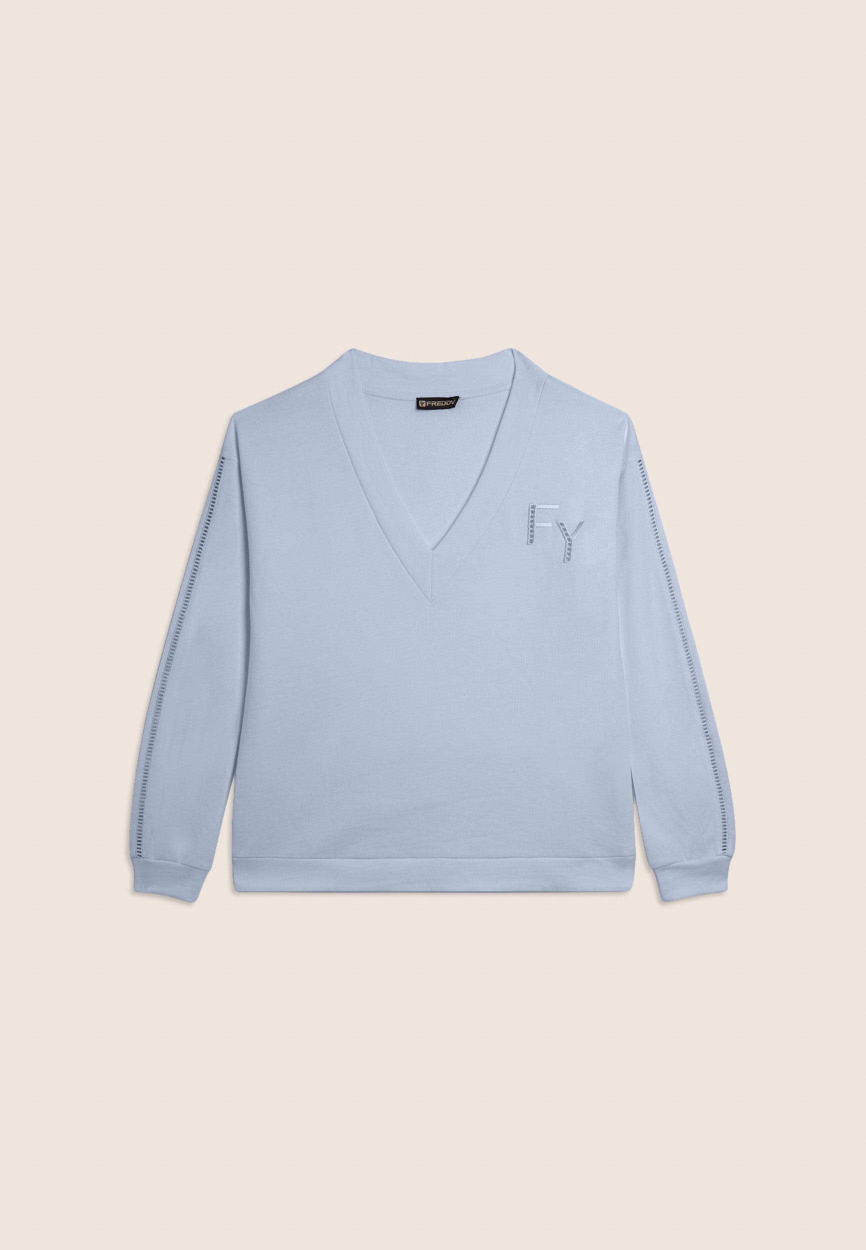 Felpa dalla vestibilità comfort, con una lunghezza regular e un fondo con fascia più lungo sul retro. Scollo a V e maniche con spalla scesa e polsini creano un look casual ma raffinato. Un elegante ricamo traforato compone il logo FY sul cuore e percorre le maniche sulle lunghezze. Un piccolo logo Freddy è stampato sotto lo scollo posteriore. Realizzata in French Terry, un tessuto che unisce il comfort del cotone alla resistenza del poliestere.