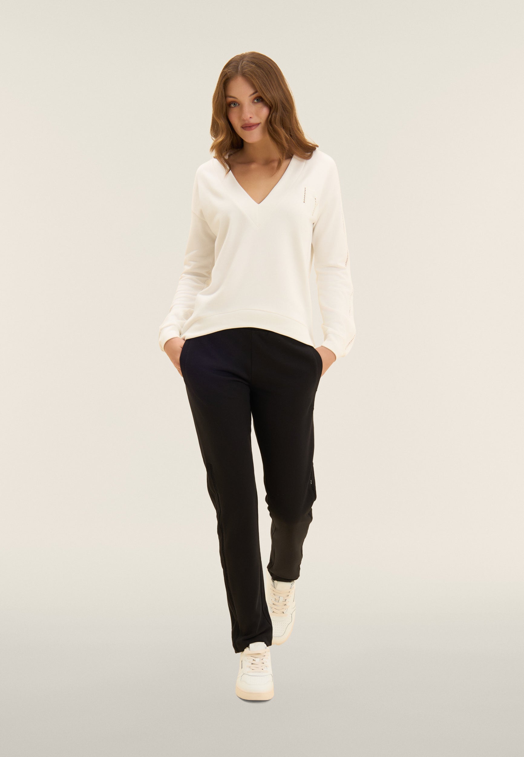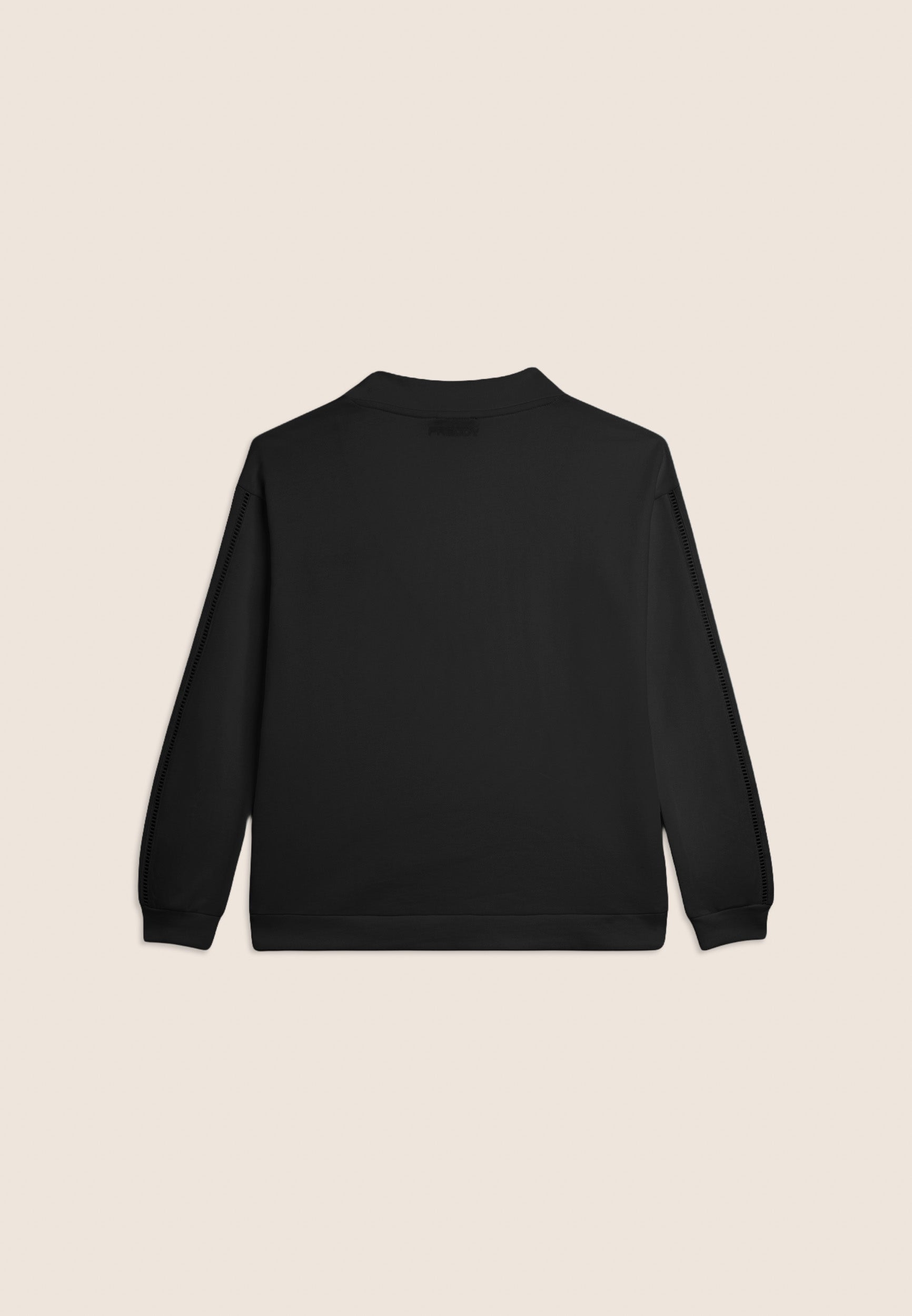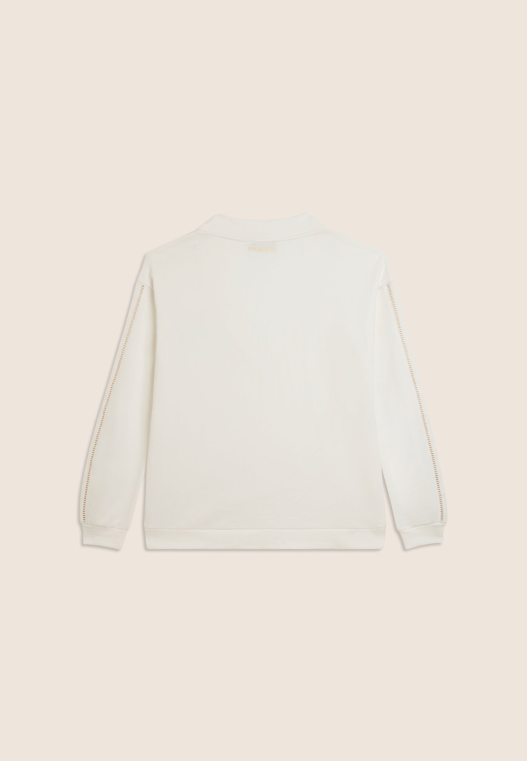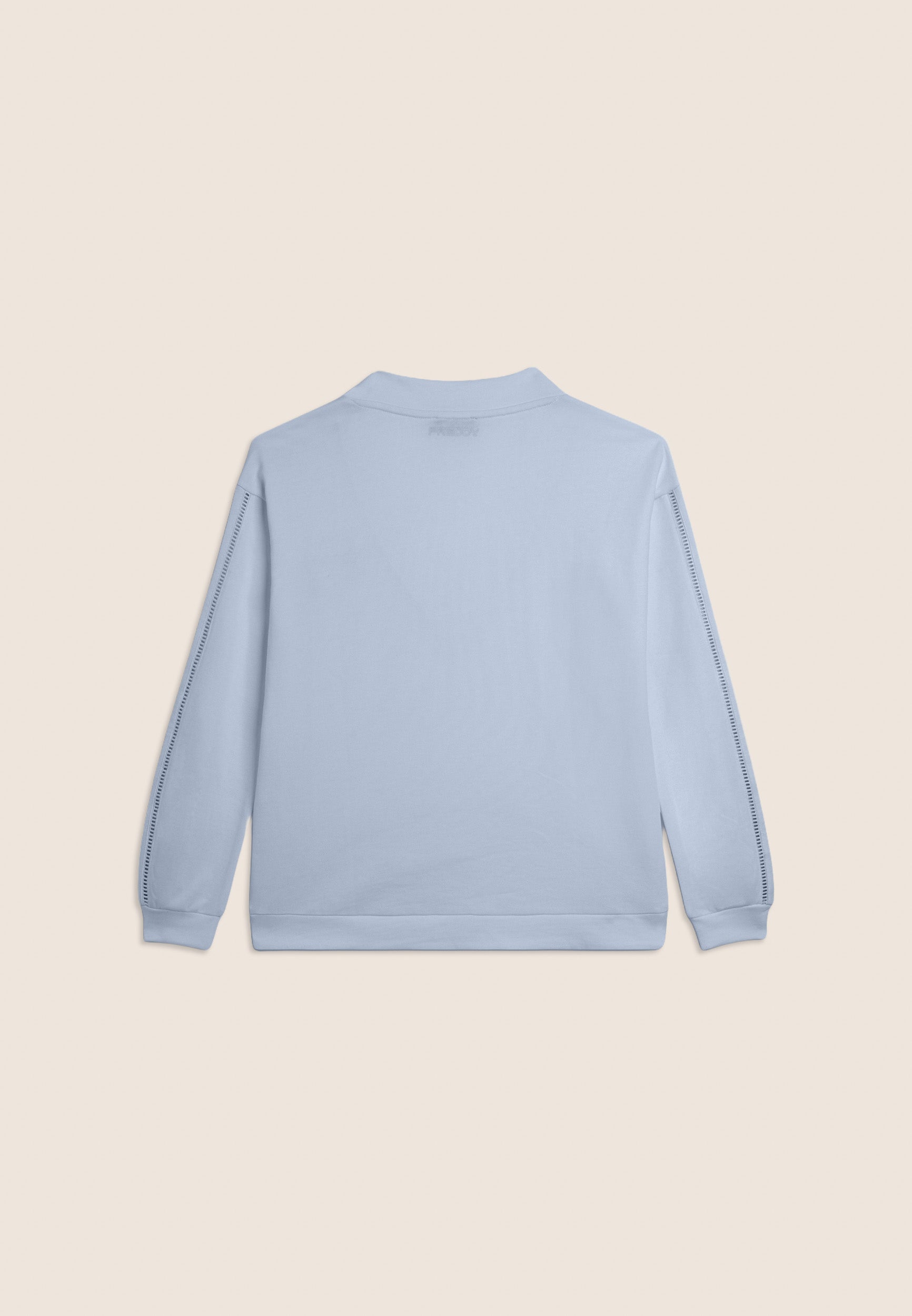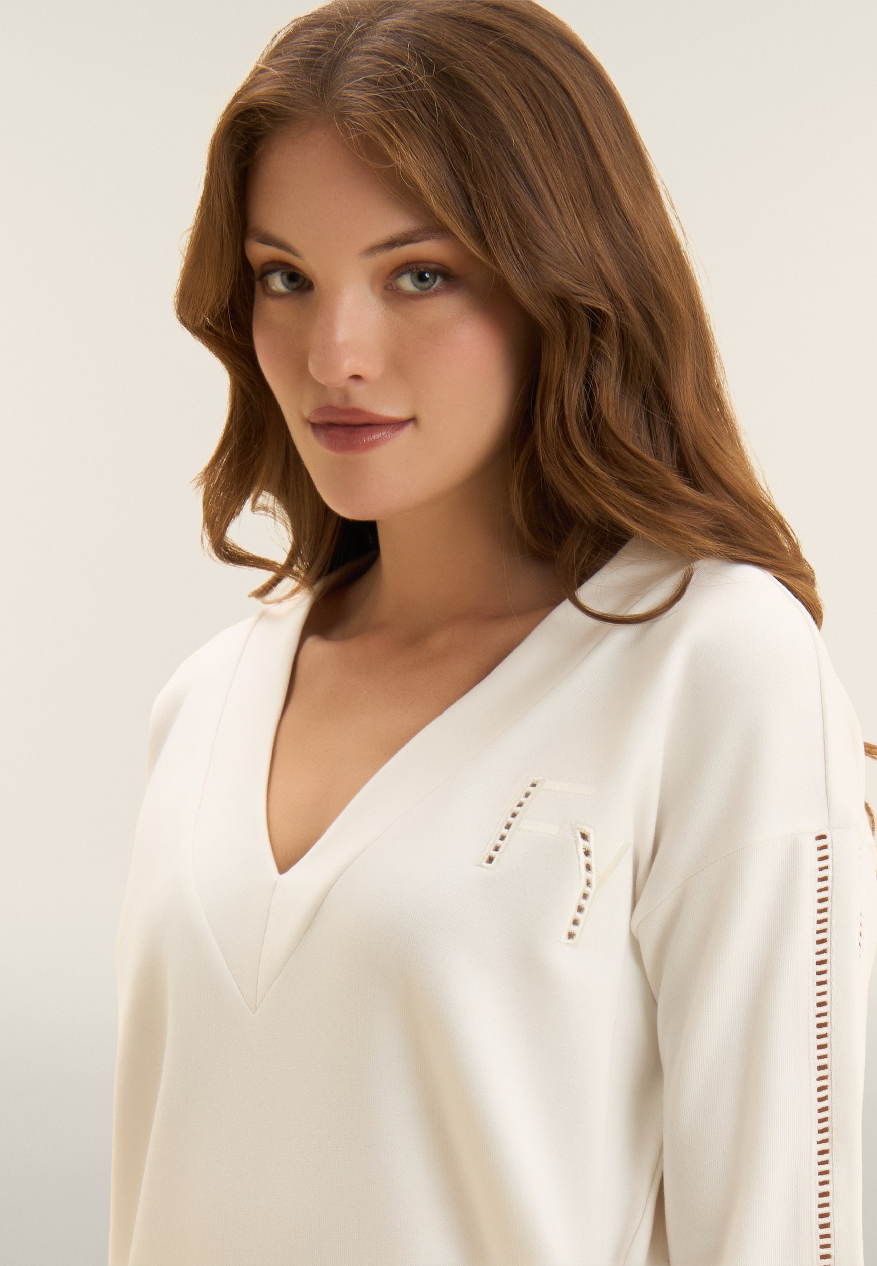 Felpa dalla vestibilità comfort, con una lunghezza regular e un fondo con fascia più lungo sul retro. Scollo a V e maniche con spalla scesa e polsini creano un look casual ma raffinato. Un elegante ricamo traforato compone il logo FY sul cuore e percorre le maniche sulle lunghezze. Un piccolo logo Freddy è stampato sotto lo scollo posteriore. Realizzata in French Terry, un tessuto che unisce il comfort del cotone alla resistenza del poliestere.