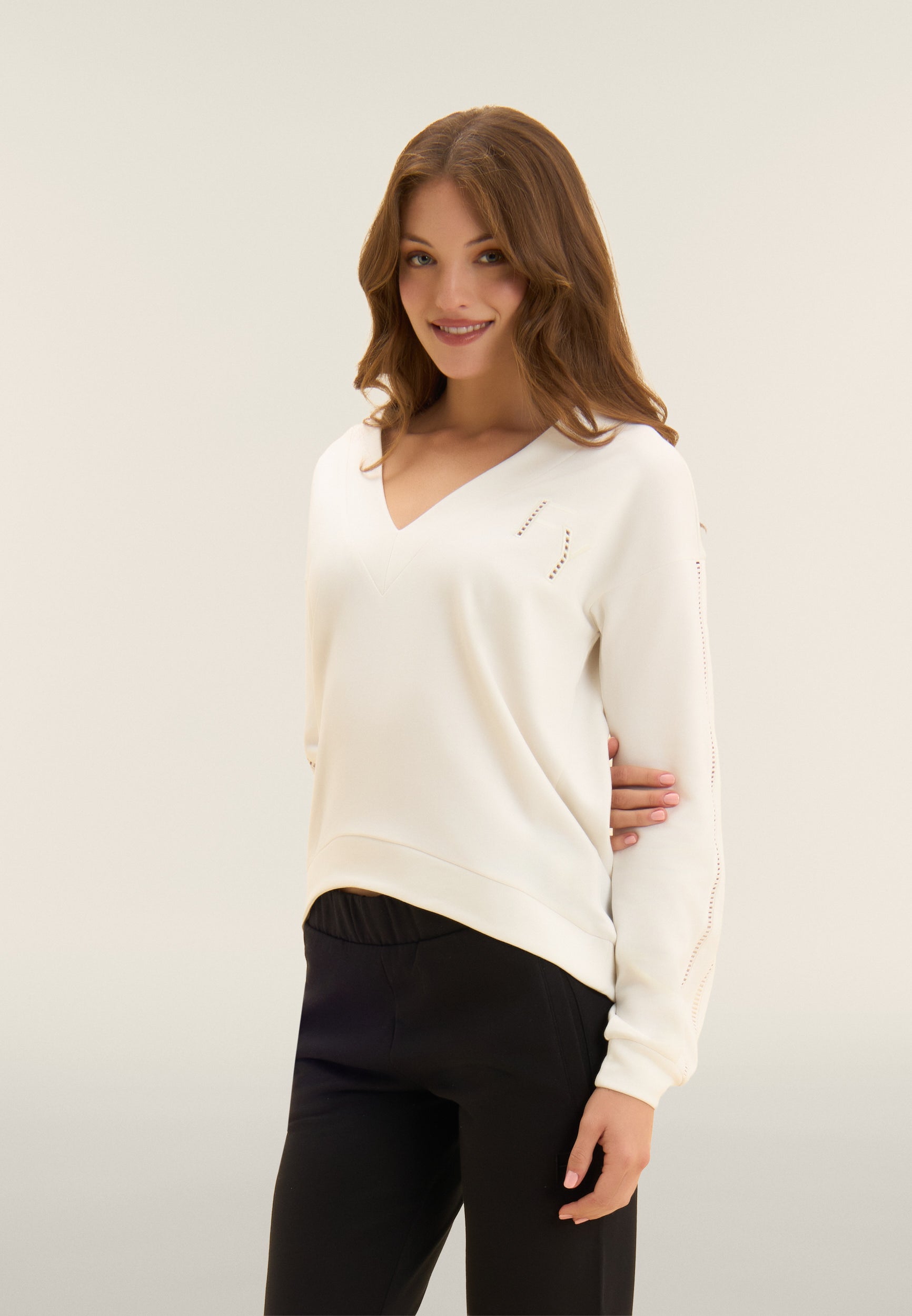 Felpa Scollo a V con Spalla Scesa e Dettagli Ricamati