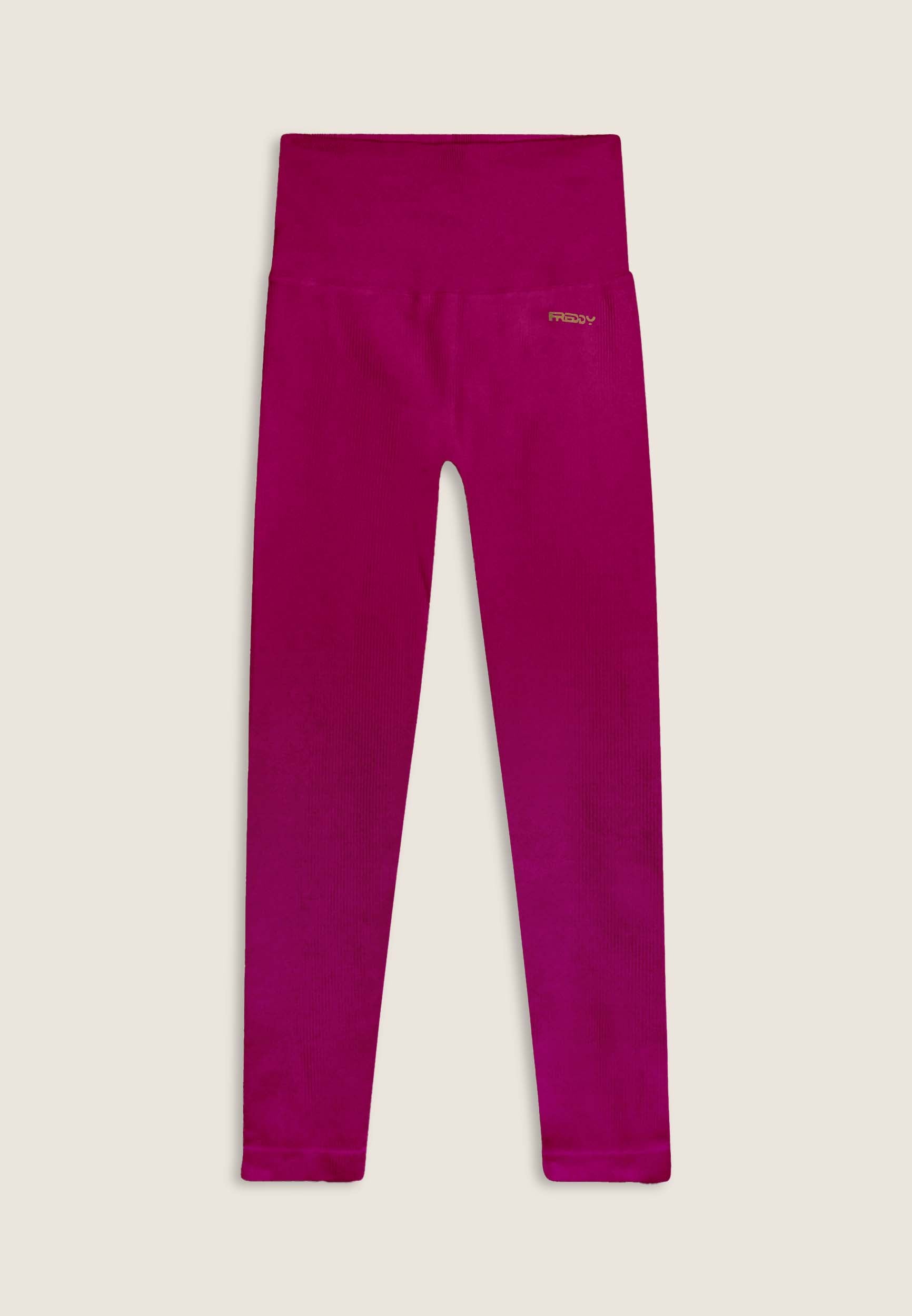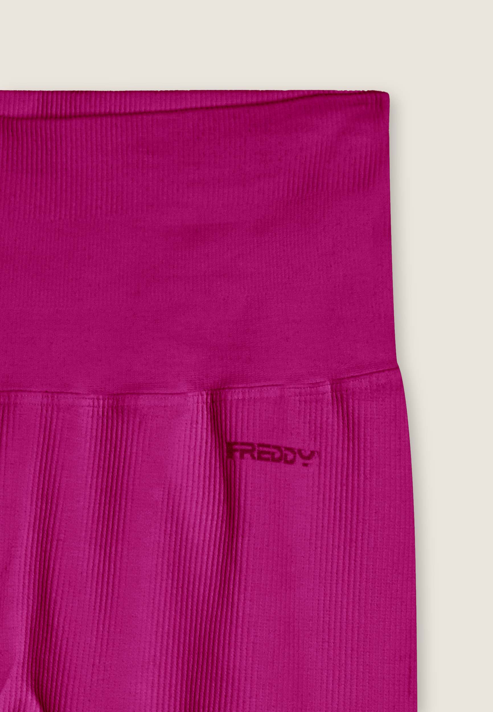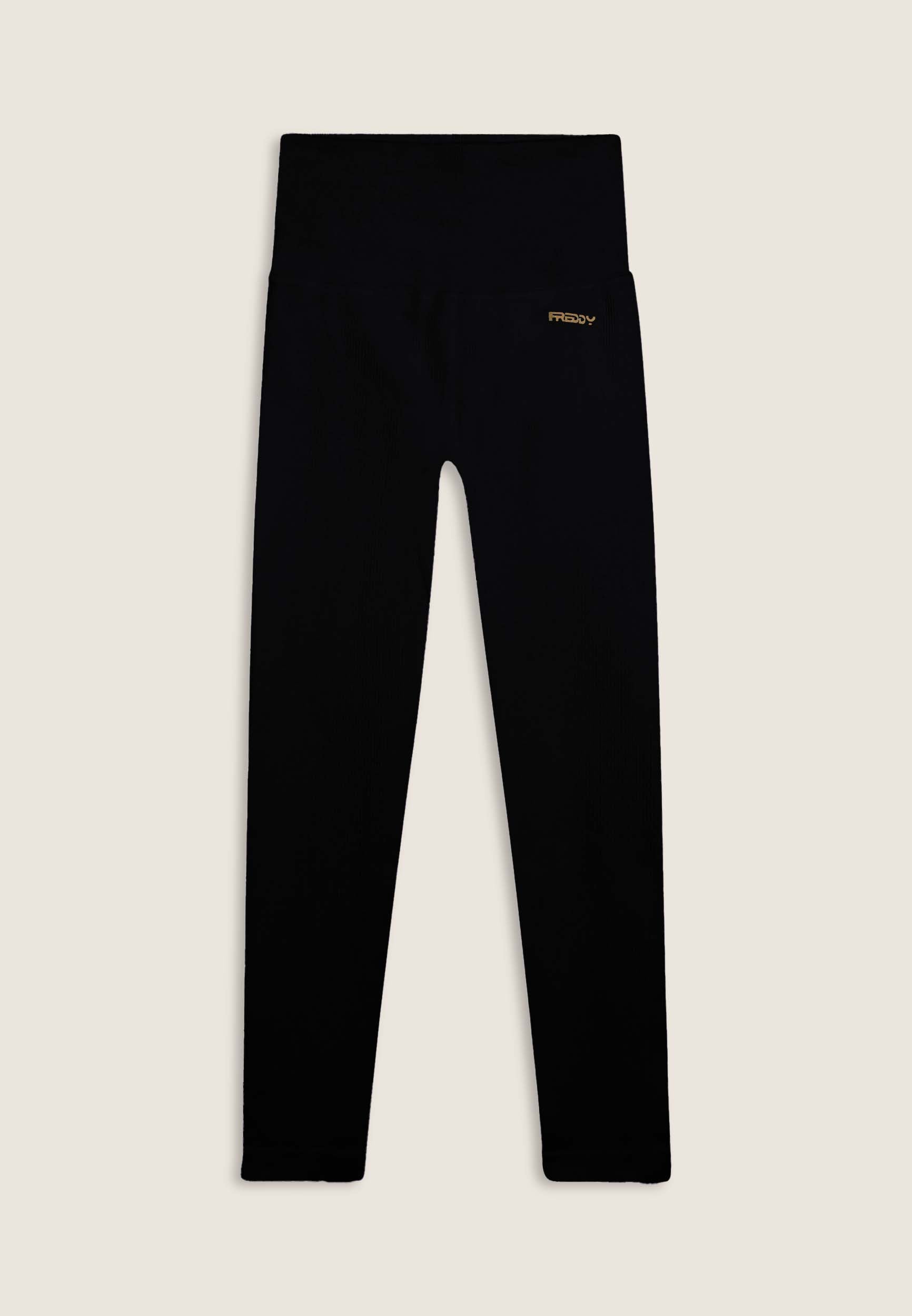 Leggings de sport longueur 7/8 et jambe skinny, en tissu côtelé sans coutures, pour un confort absolu. La taille très haute garantit un maintien stable pendant l’entraînement, tandis que les coutures en forme de cœur sur les fesses rehaussent la forme de manière naturelle. Enrichis du logo FREDDY sur le devant et le petit logo du bonhomme à l’arrière.