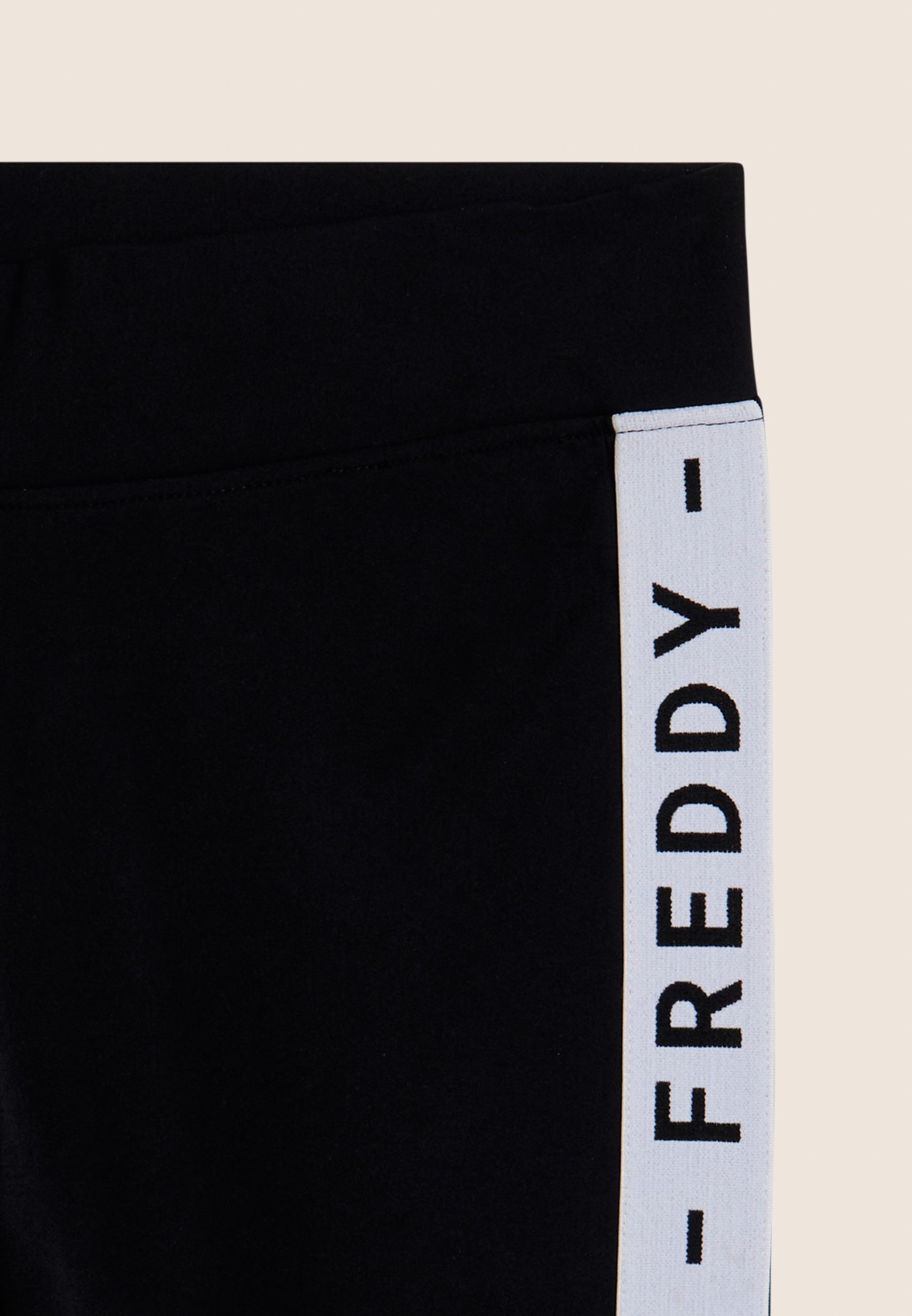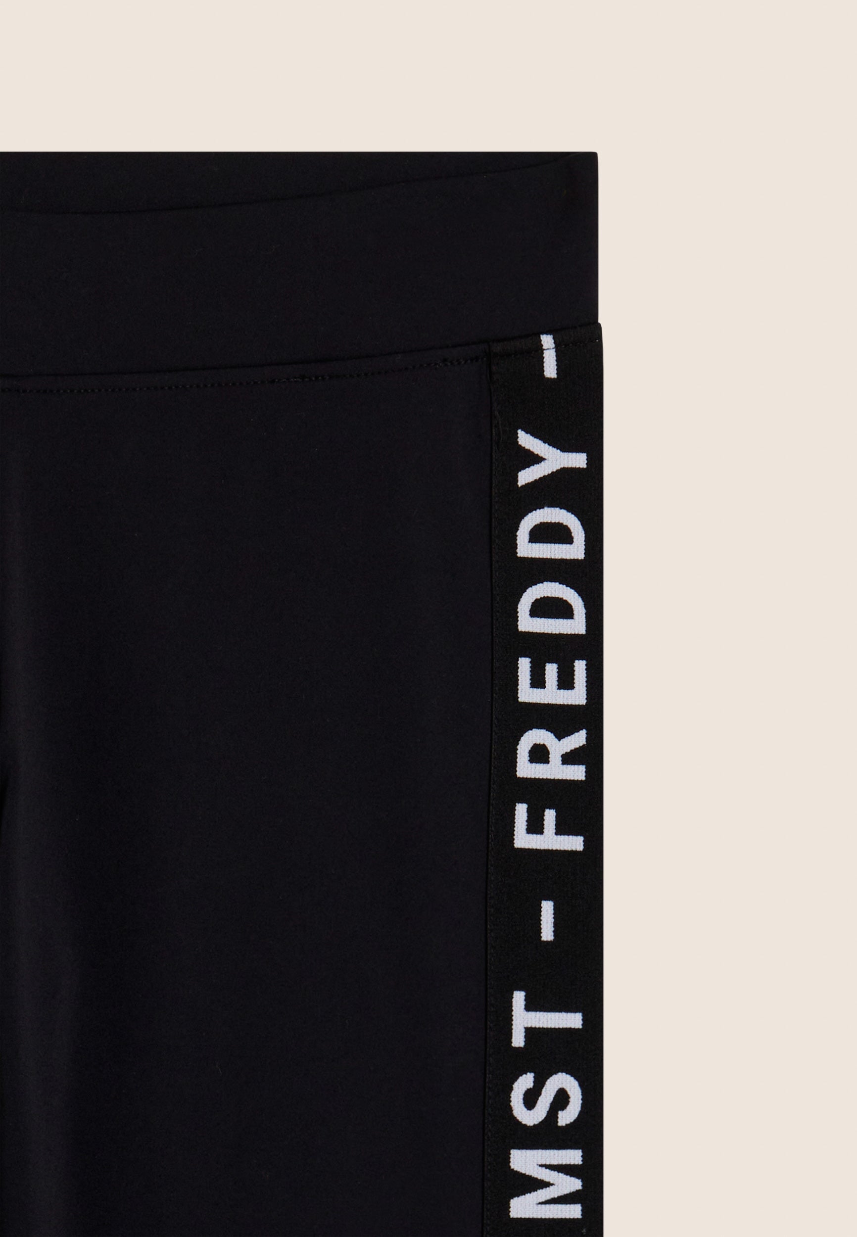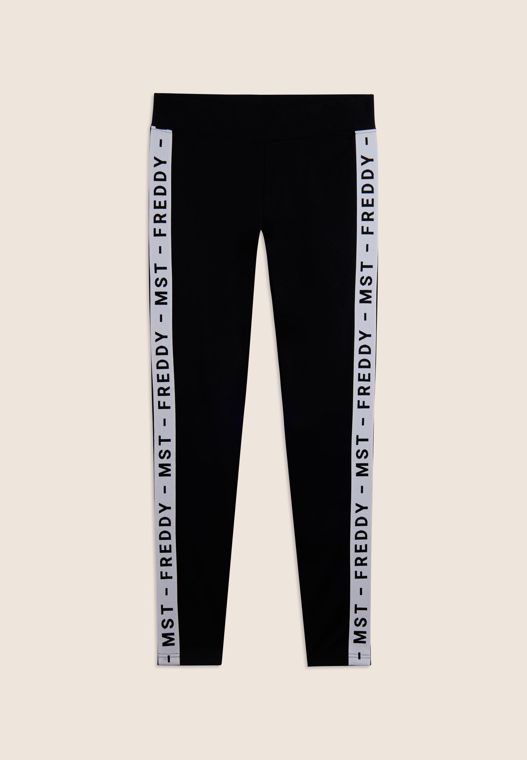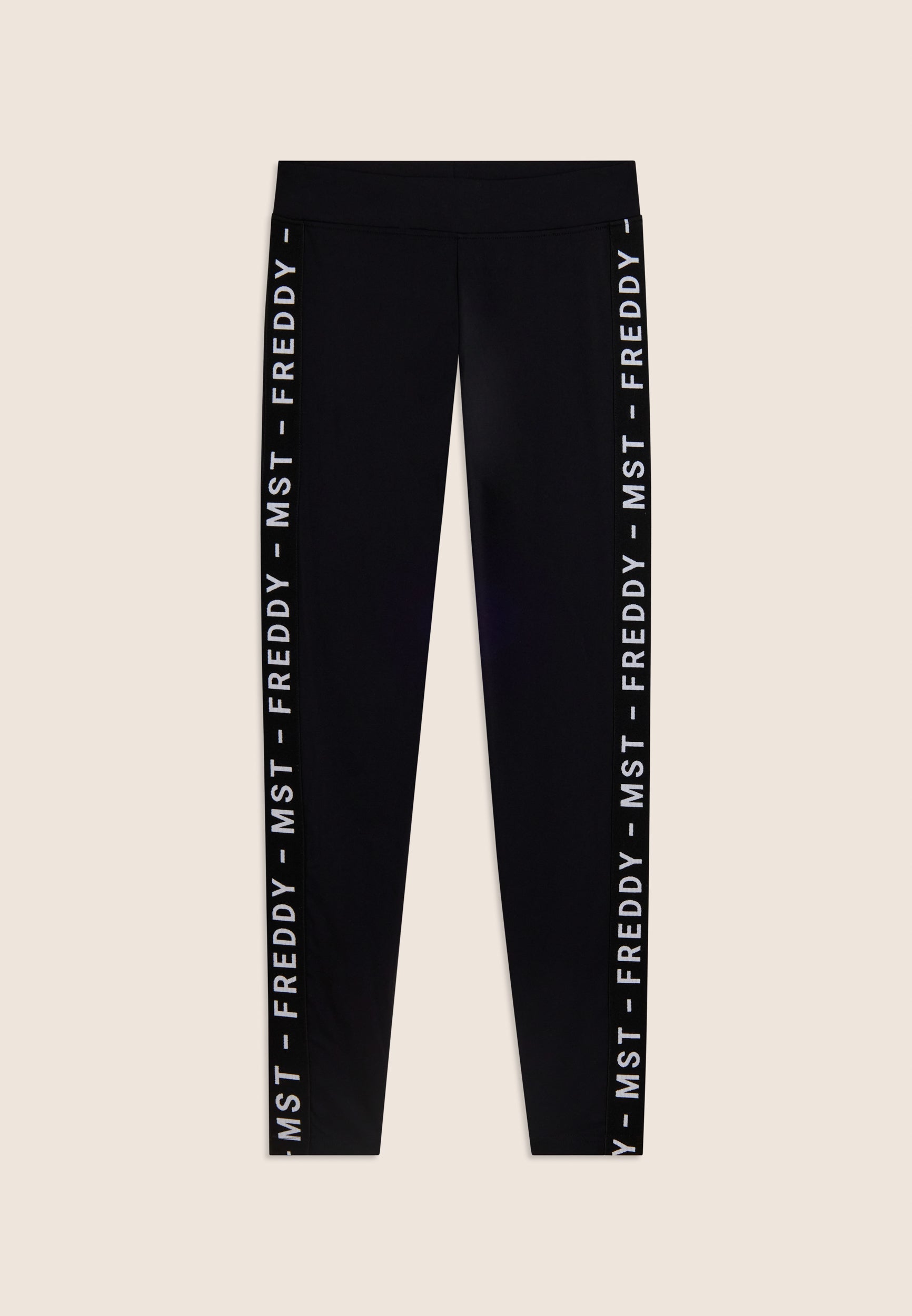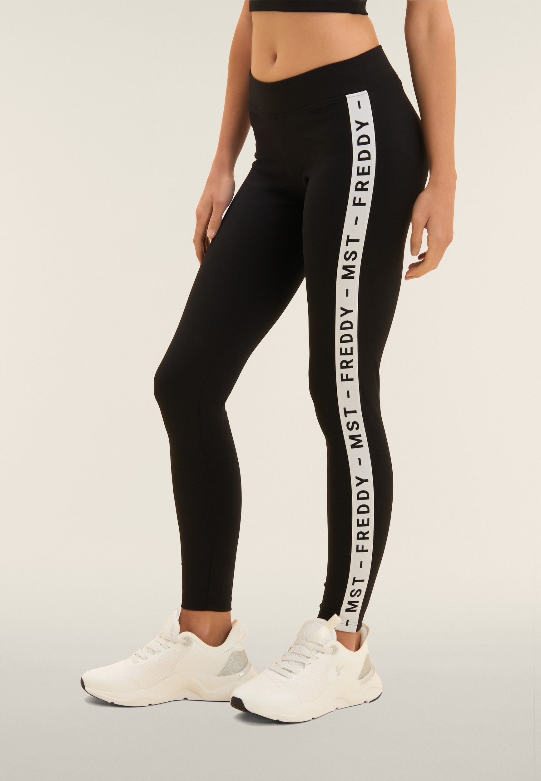 Leggings aderenti dalla lunghezza regular, realizzati in nylon heavy jersey stretch, un tessuto resistente, morbido e elasticizzato che offre comfort e libertà di movimento. La vita regular assicura un fit stabile, mentre le bande laterali in contrasto colore con la scritta FREDDY MST ripetuta lungo le lunghezze aggiungono un dettaglio distintivo e dinamico. Perfetti per attività sportive o per un look casual-chic, questi leggings si adattano con eleganza a ogni movimento.