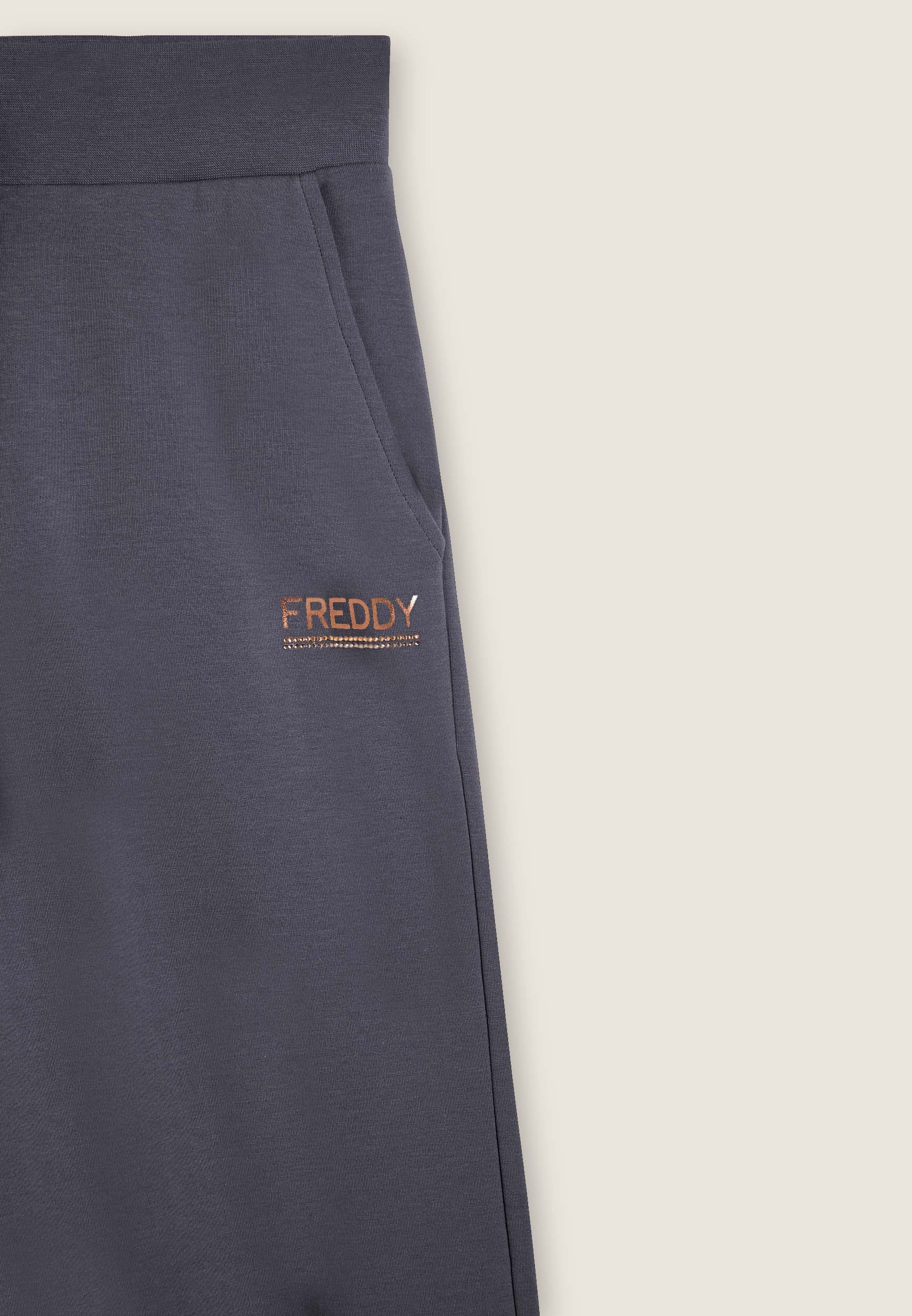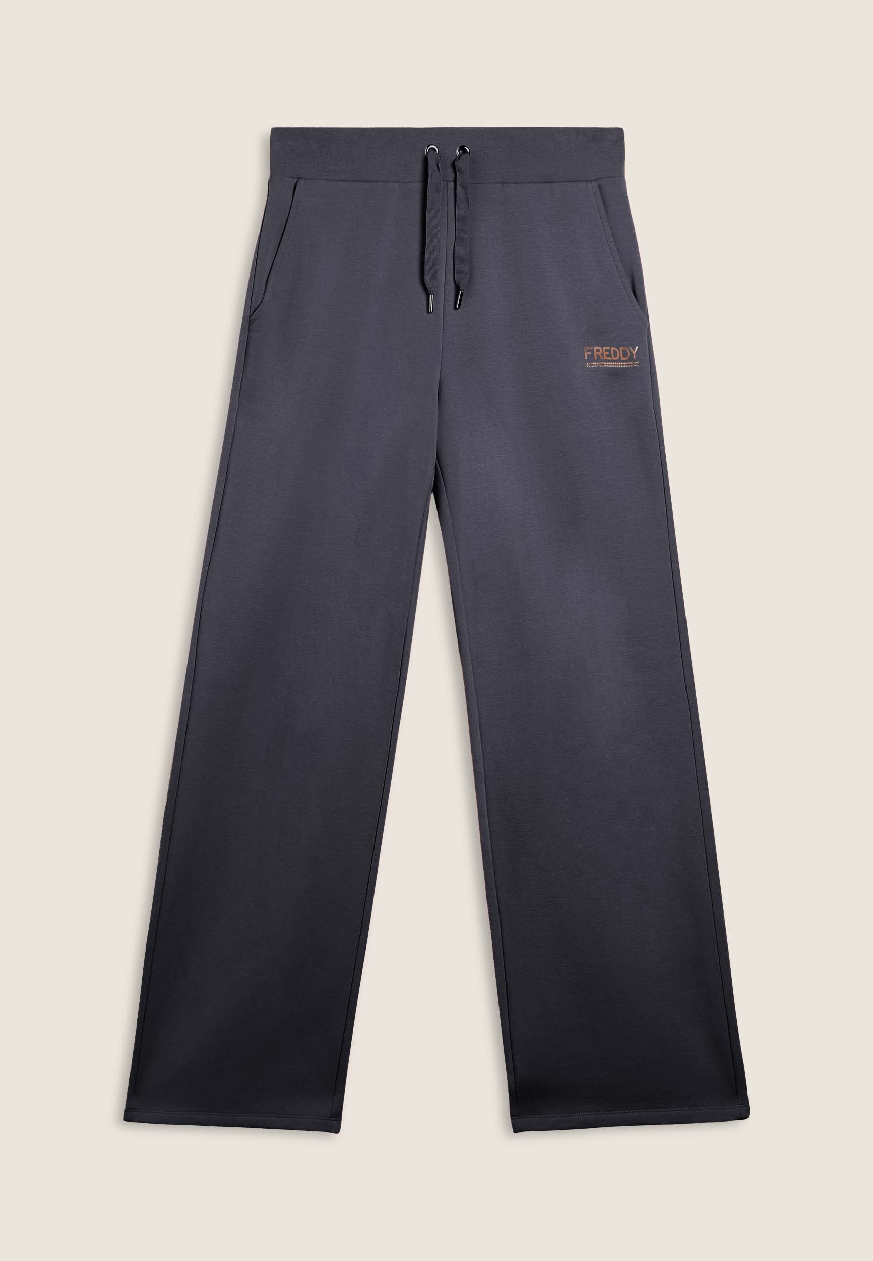 Ce pantalon à jambes larges pour femmes est fabriqué en molleton modal brossé et élastique, une combinaison parfaite de douceur, de chaleur et de flexibilité. Il a des jambes larges, une taille classique côtelée avec cordon et des poches passepoilées. Le logo Freddy, positionné sur l’ouverture de la poche gauche, est décoré de paillettes bicolores.
