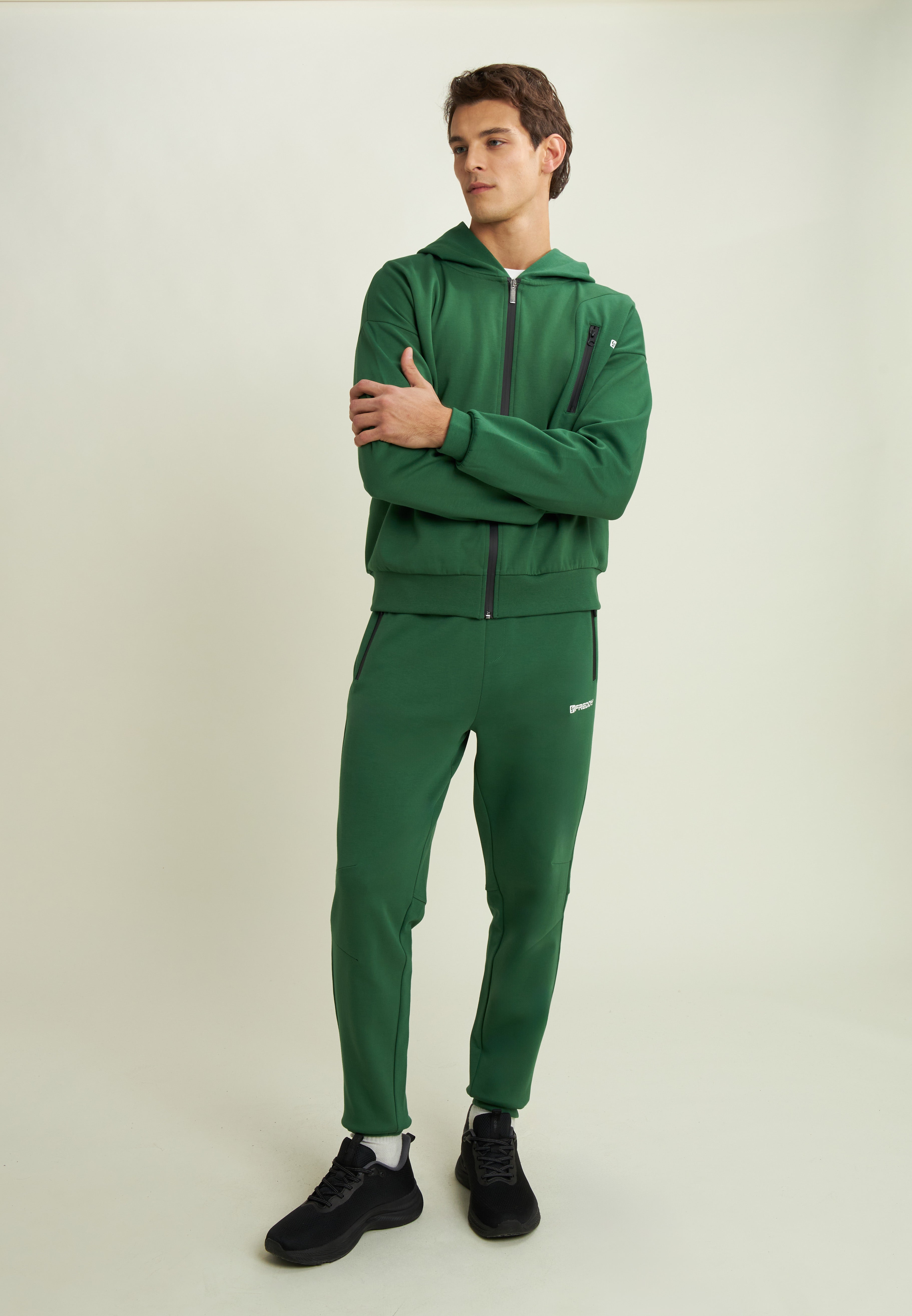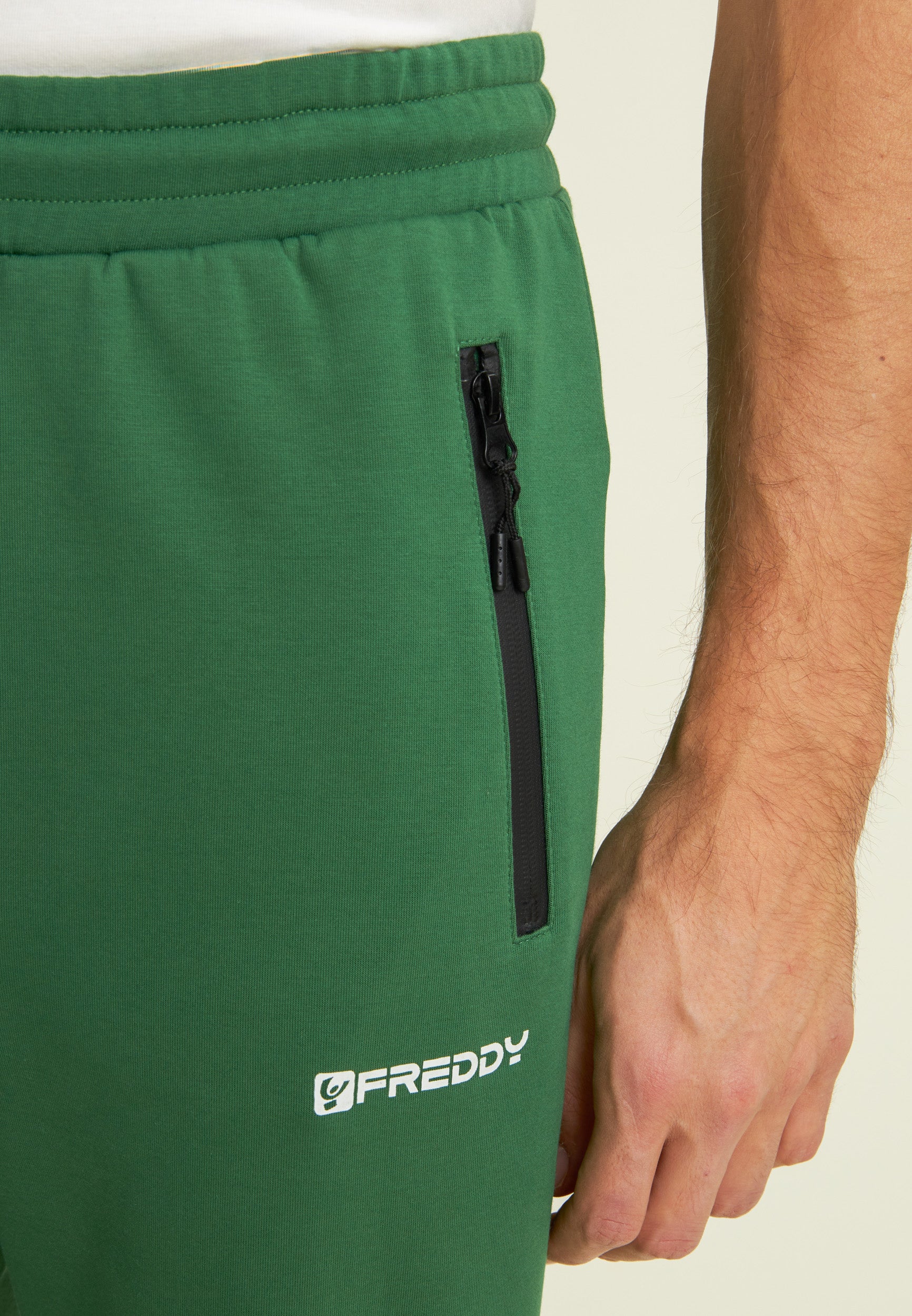 Pantalon de sport pour hommes coupe carotte, longueur classique et bords côtelés aux chevilles. La taille est élastique avec un cordon intérieur, pour un ajustement personnalisé. Les poches passepoilées sont zippées, pour une sécurité maximale. Le tissu interlock élastique garantit confort et une longue durée. Idéal pour les loisirs avec une touche de modernité.