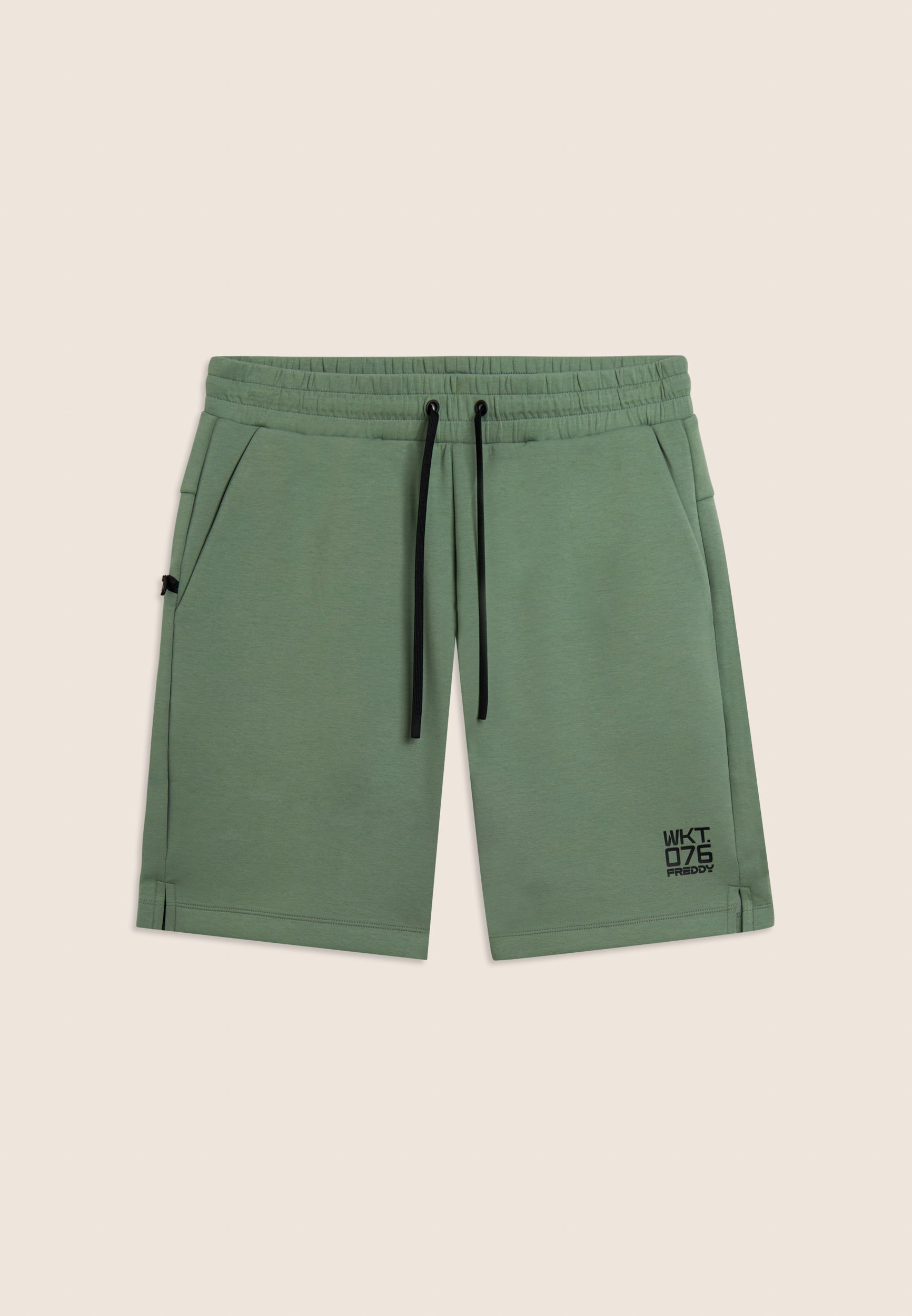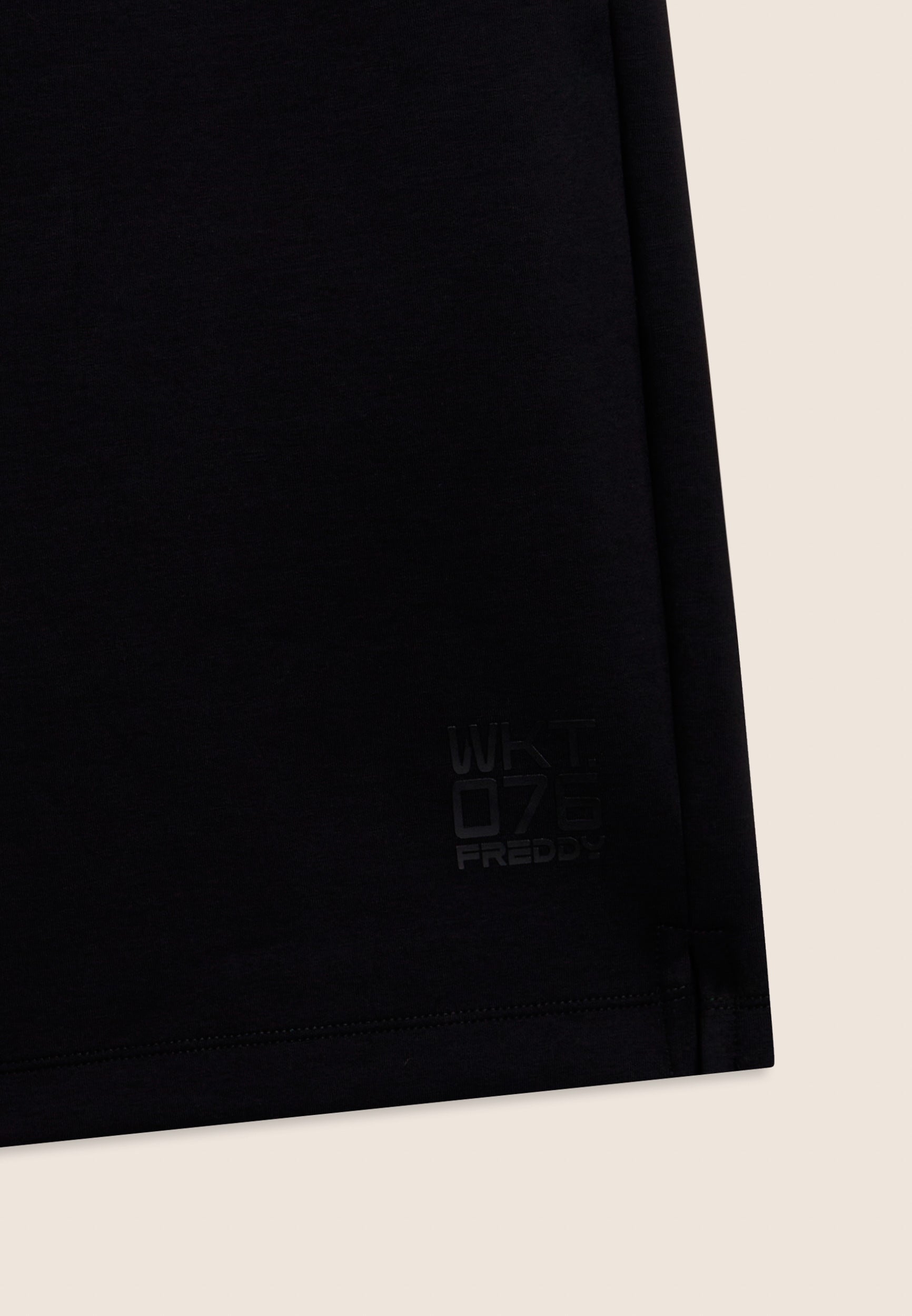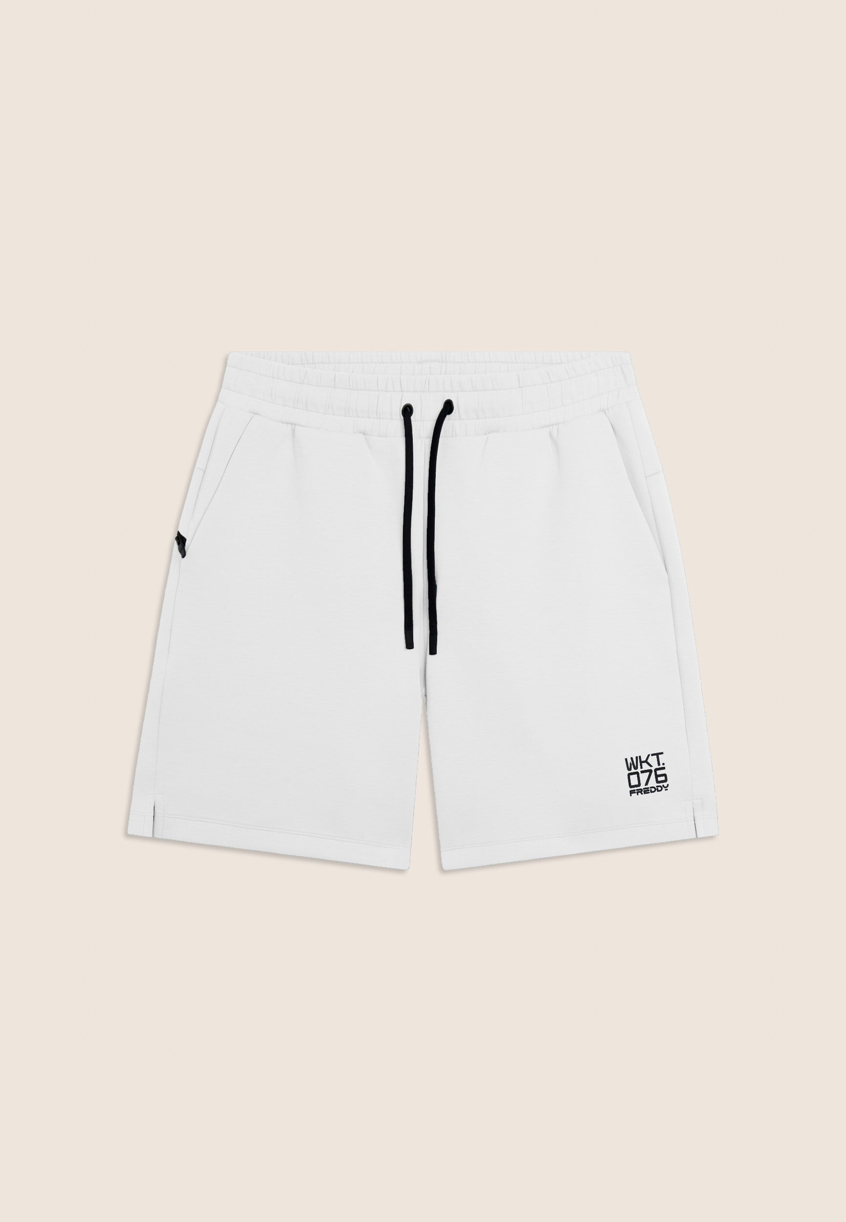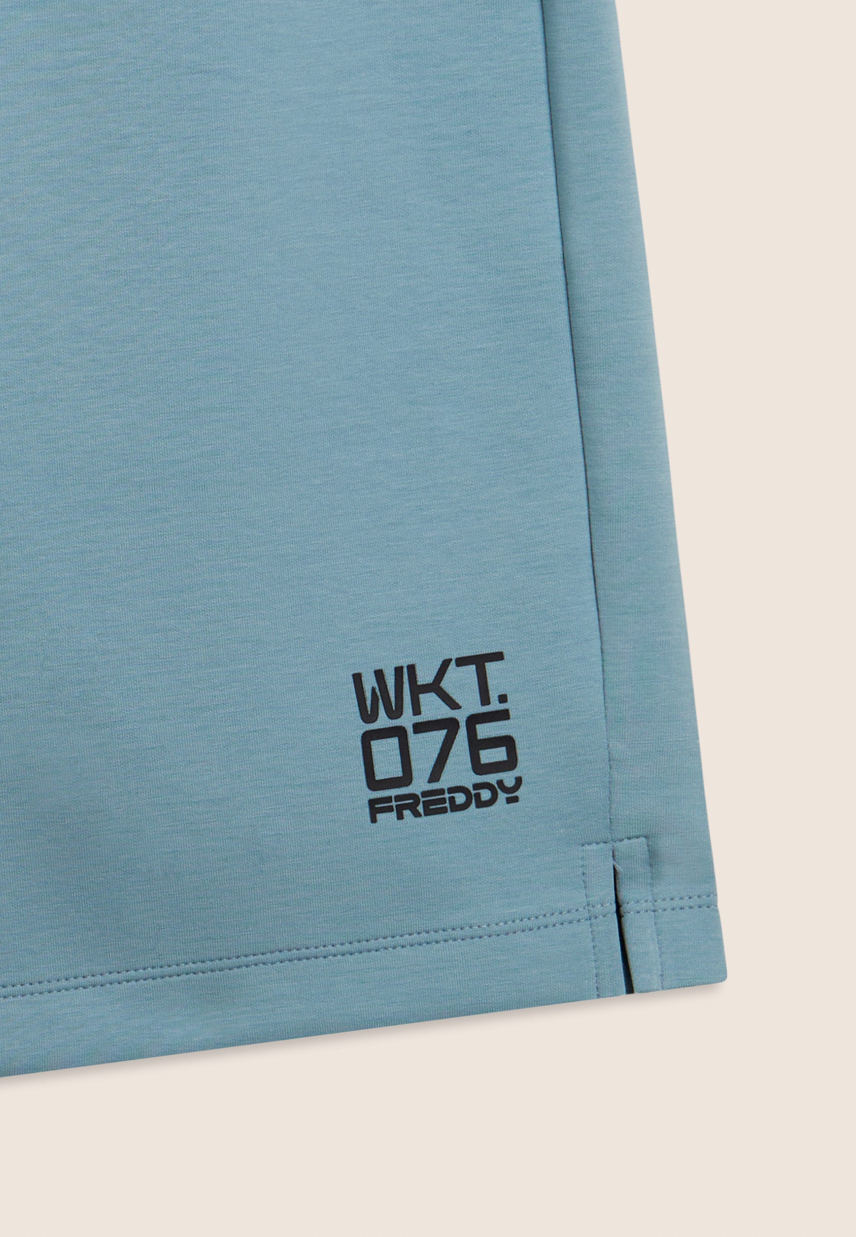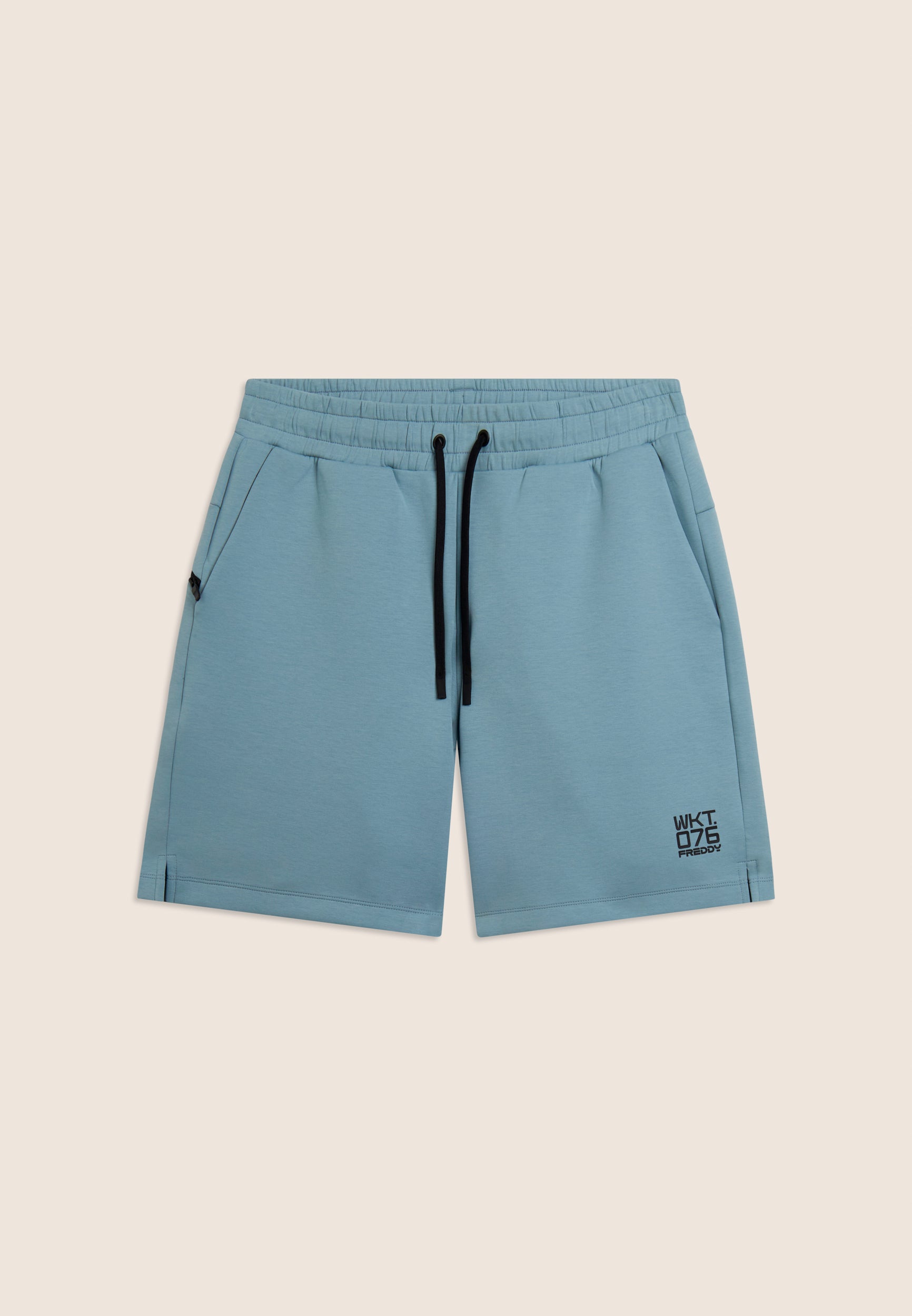 Bermuda en tissu interlock technique léger, idéal pour les entraînements d’été. Coupe confortable et longueur au-dessus du genou. Taille classique avec une élastique interne et cordon de serrage, jambe droite avec fentes latérales au bas pour plus de liberté. Poches intérieures à l’avant et poche arrière droite très pratique avec une fermeture éclair en diagonale. Sur le bas de la jambe gauche est apposé l’imprimé mat « WKT.076 » avec le logo Freddy. Le tissu garantit le confort, la durabilité et la liberté de mouvement.