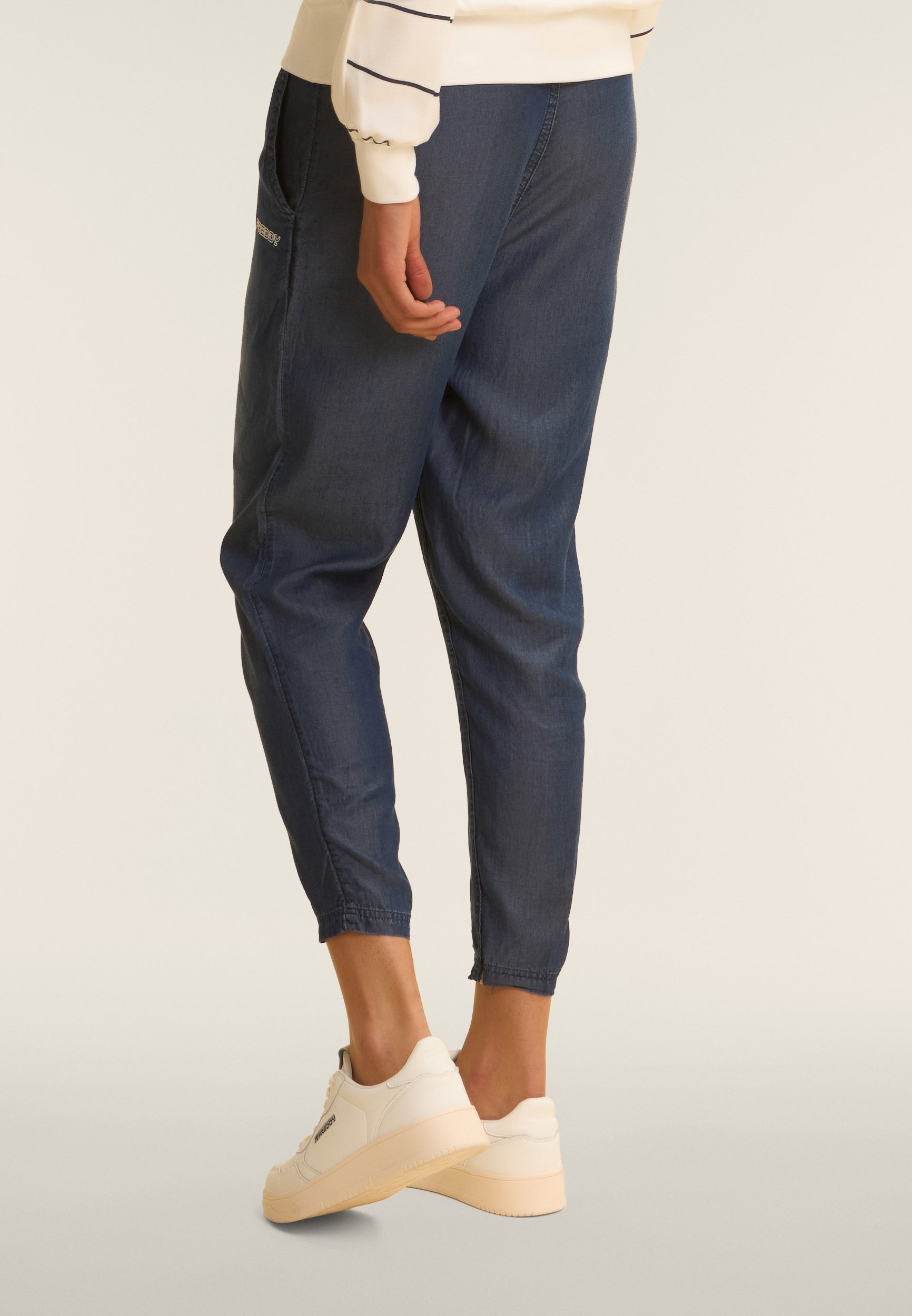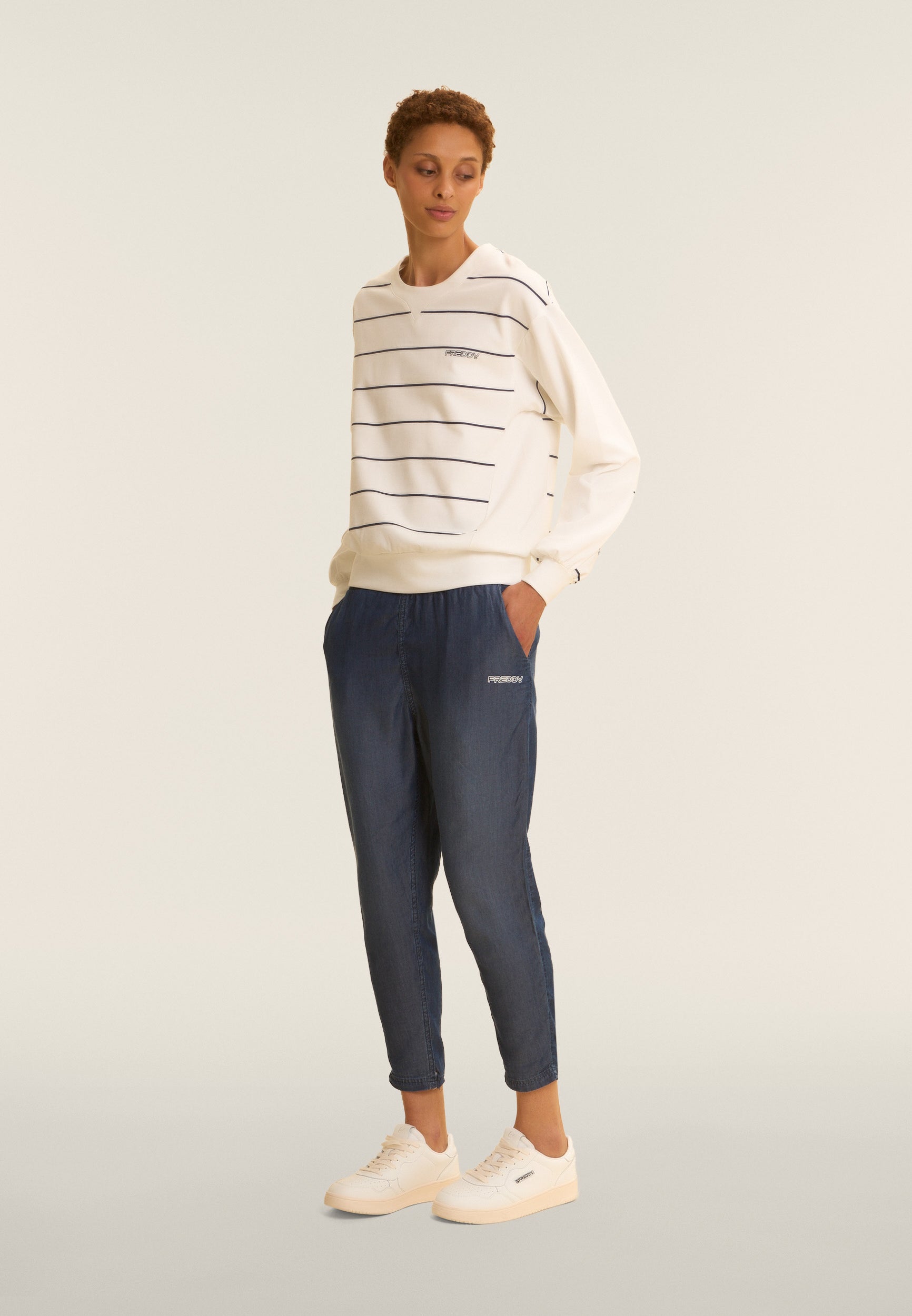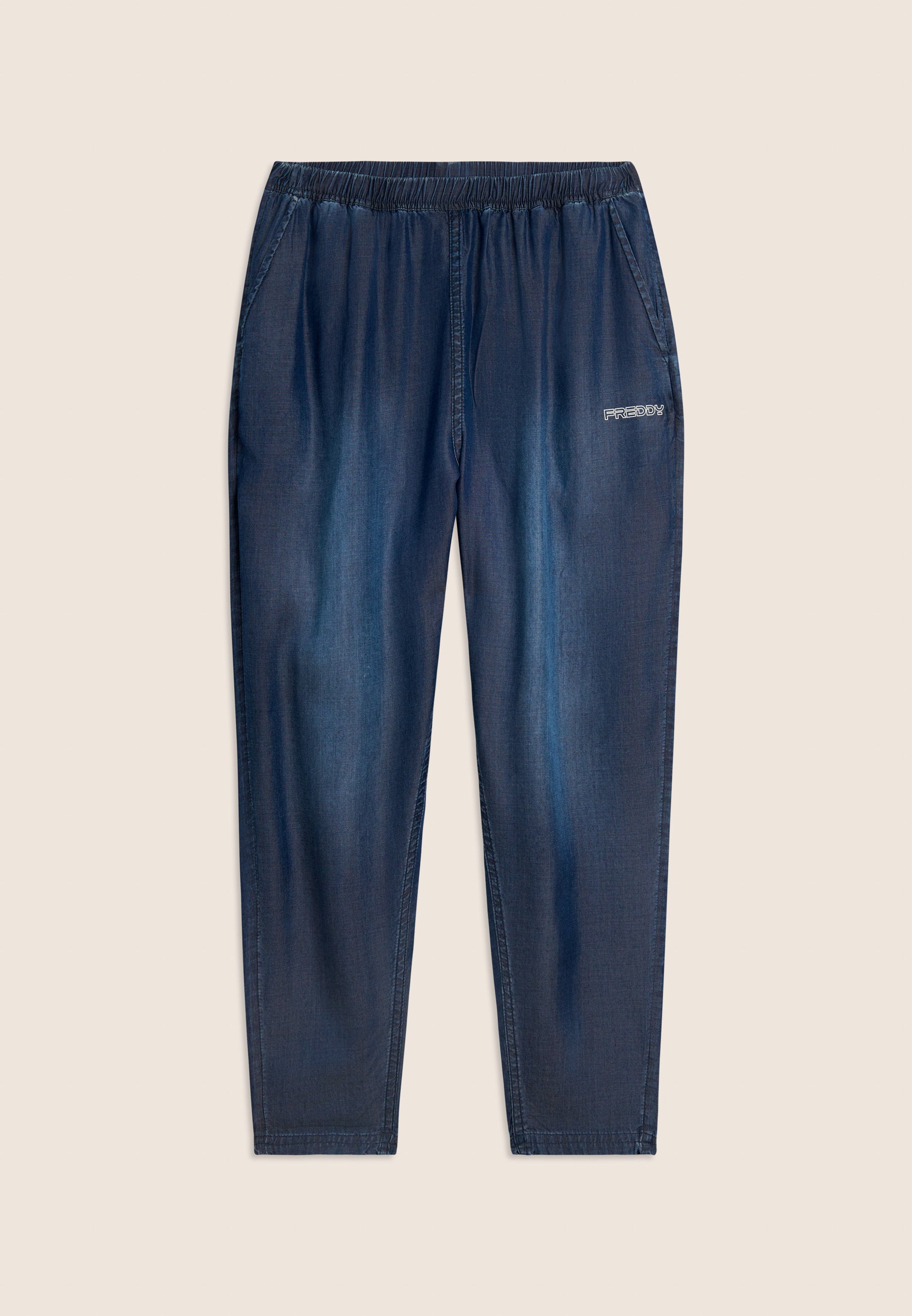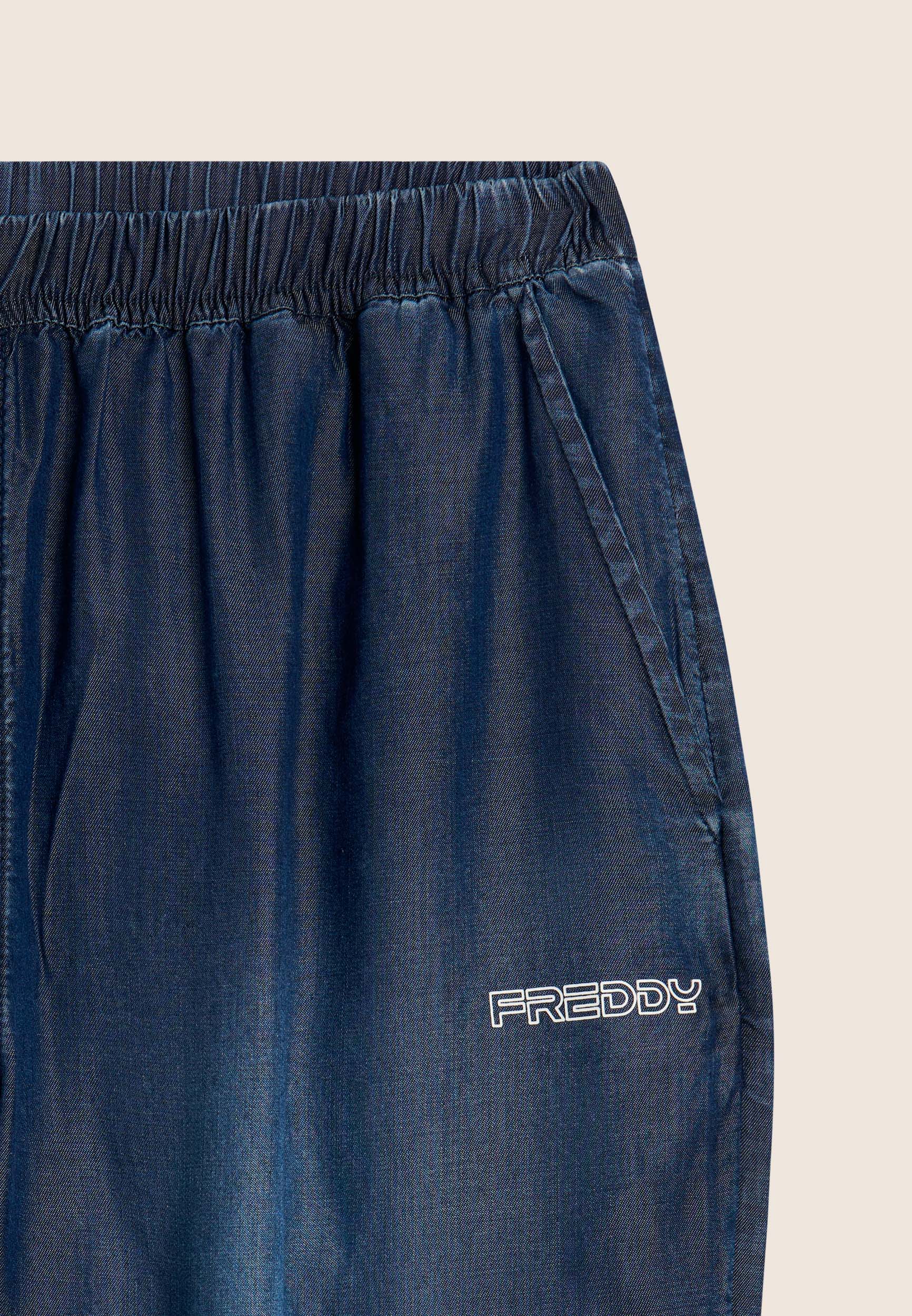 Pantalon de sport à coupe classique et courte, taille haute avec élastique intérieur et cordon de serrage de couleur contrastée. Le logo FREDDY imprimé sur la hanche gauche et les poches italiennes passepoilées ajoutent un côté pratique et une touche de classe. Fabriqué en tissu chambray, un tissu léger et durable, ce pantalon offre confort et fraîcheur pour un look d’été avec un attrait des années 90.