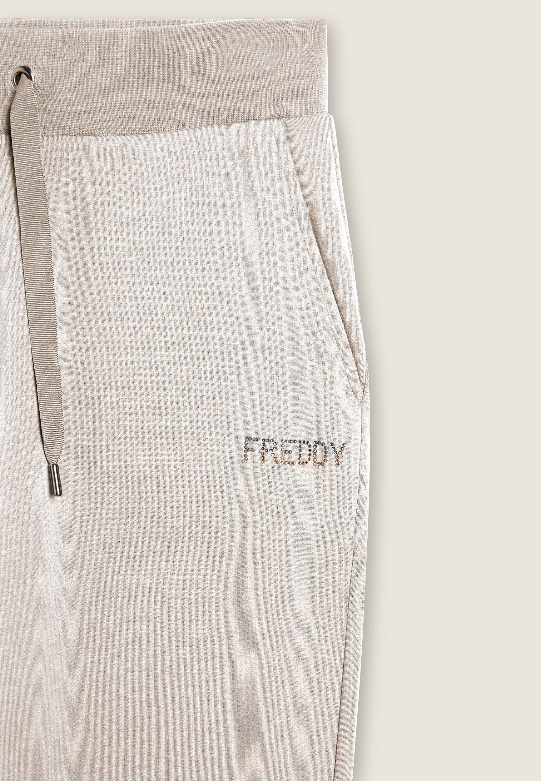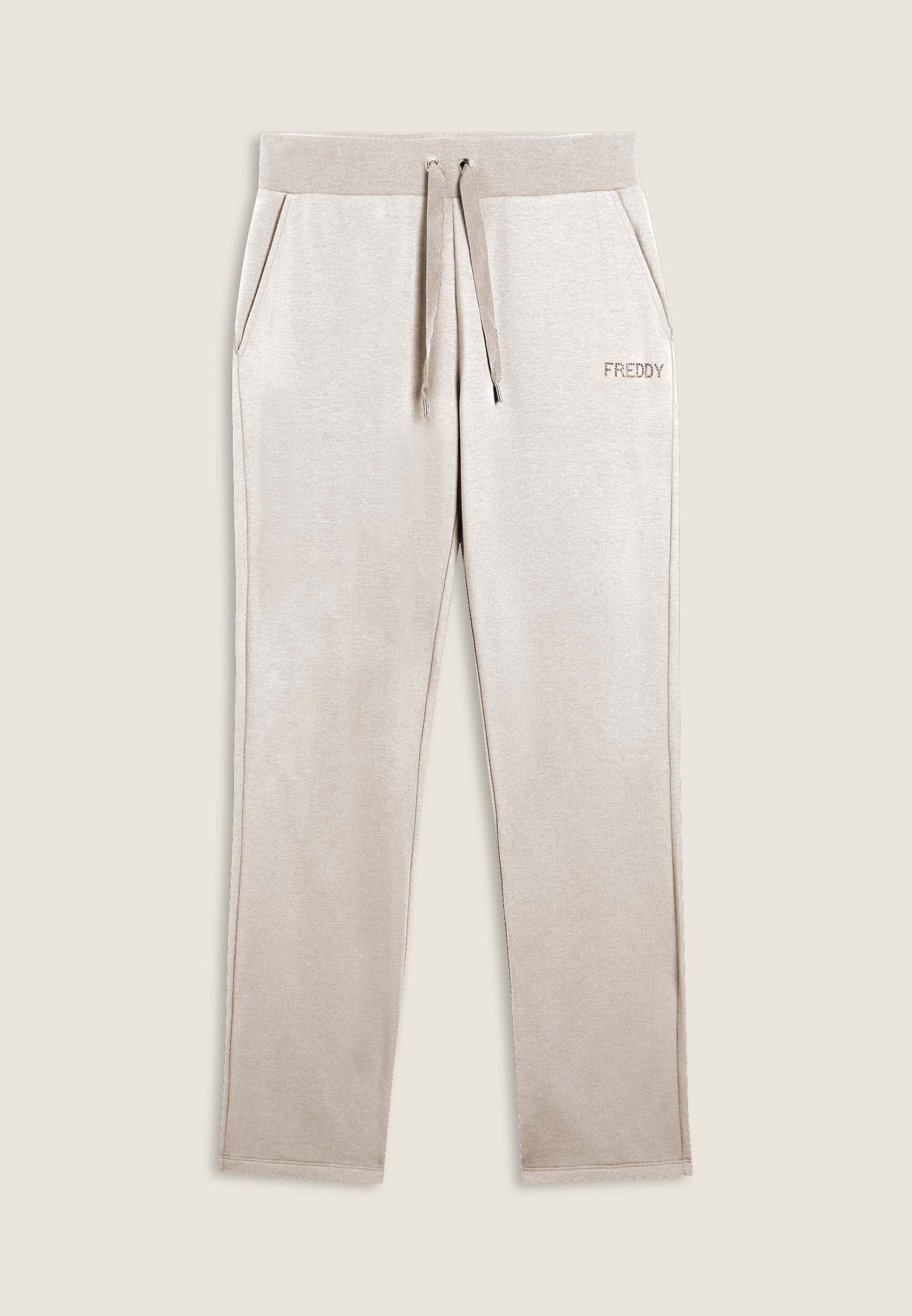 Fabriqué en molleton modal brossé élastique, ce pantalon de sport pour femmes offre une sensation de confort et d’ultra-douceur, idéale pour l’activité et la détente. Coupe classique, bord droit et taille côtelée avec cordon. Des poches passepoilées et un logo Freddy bicolore en paillettes complètent le look.