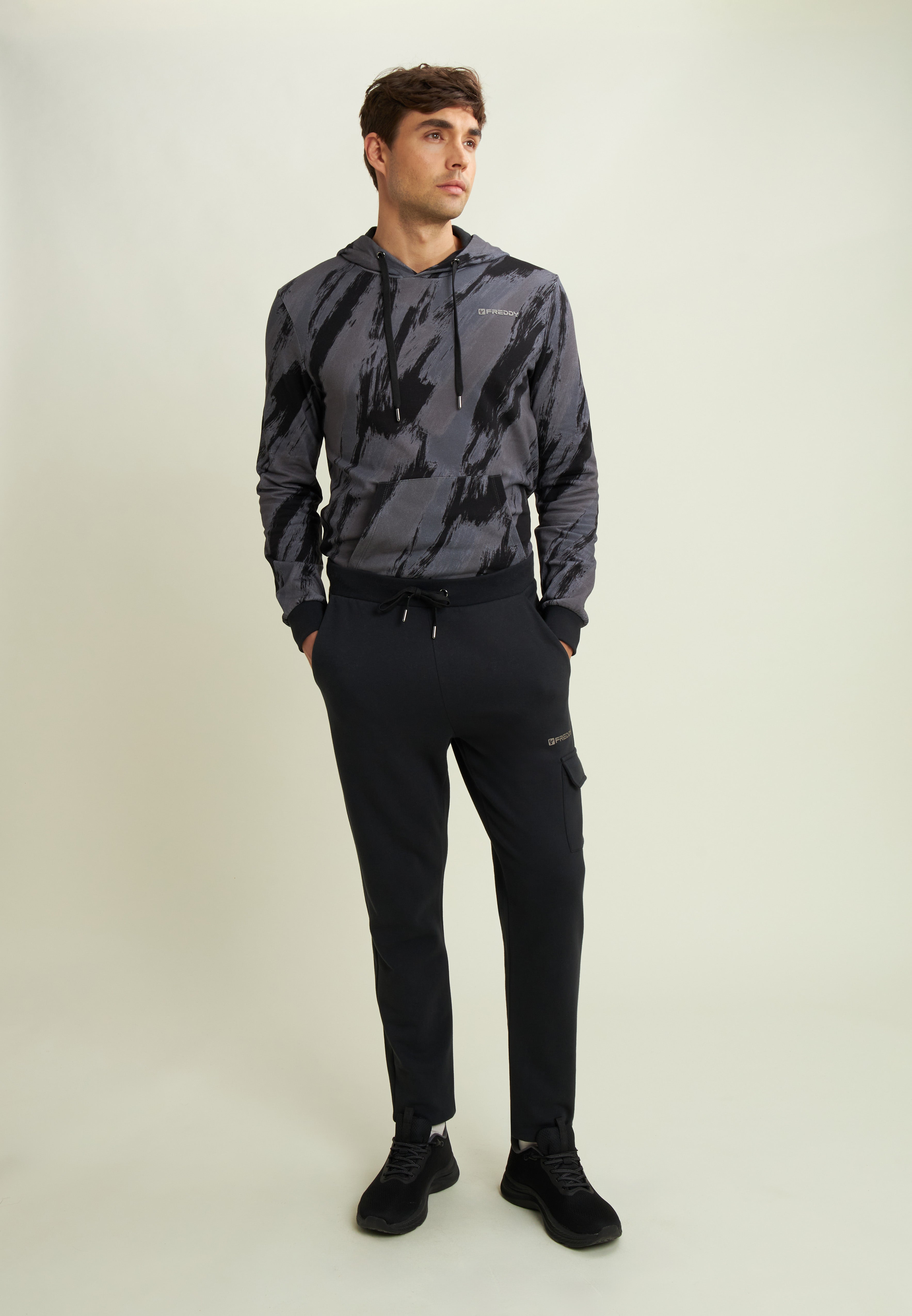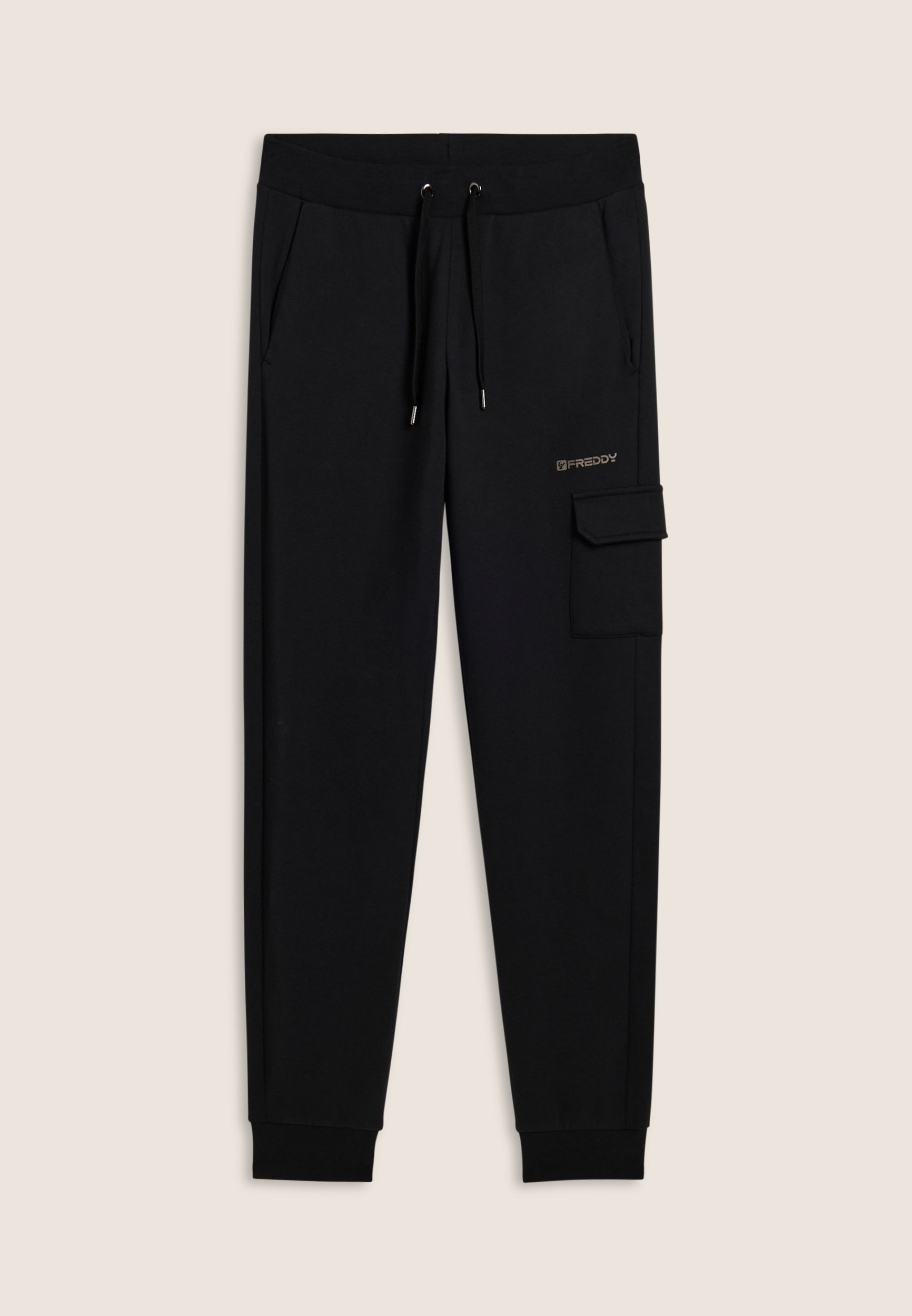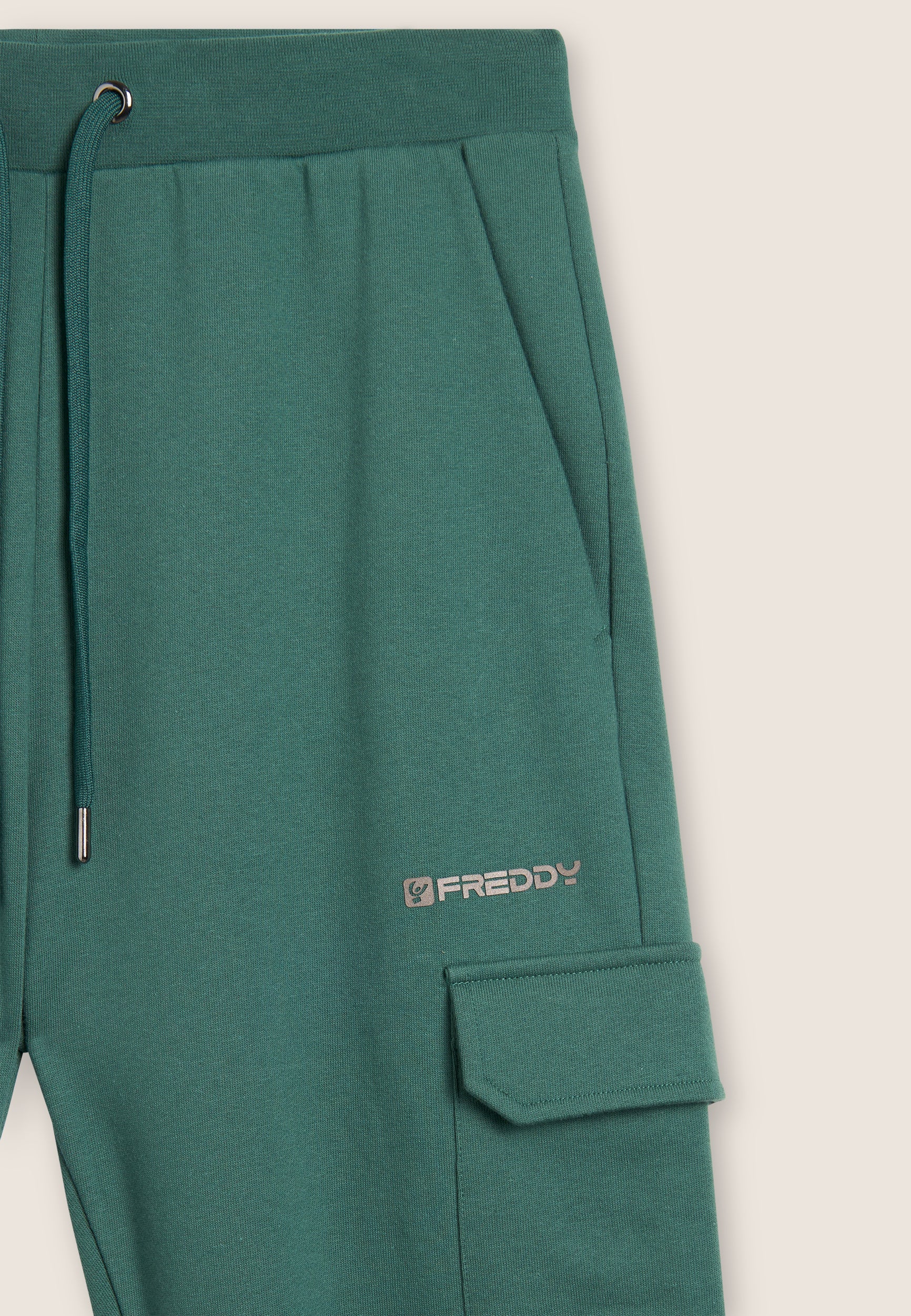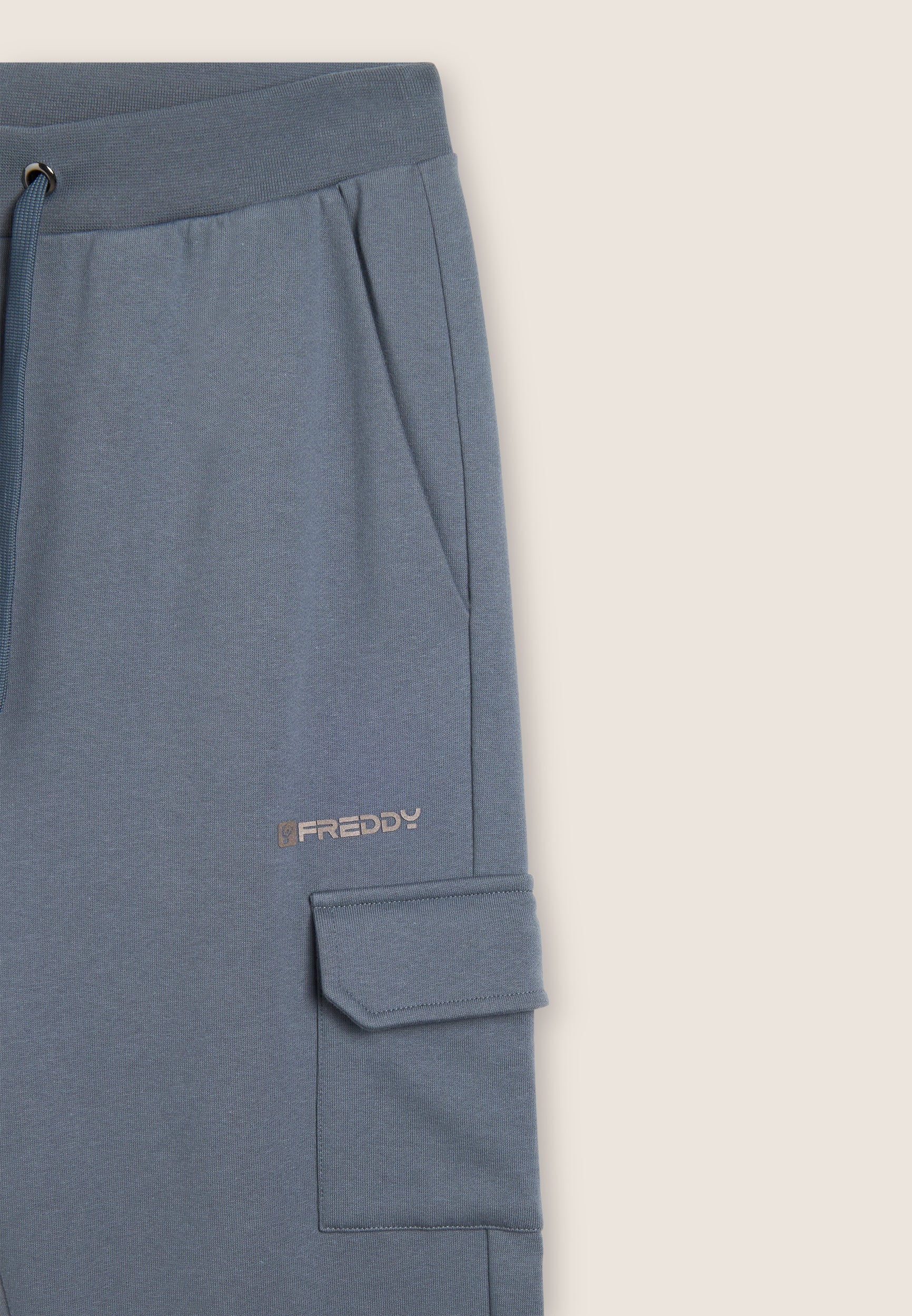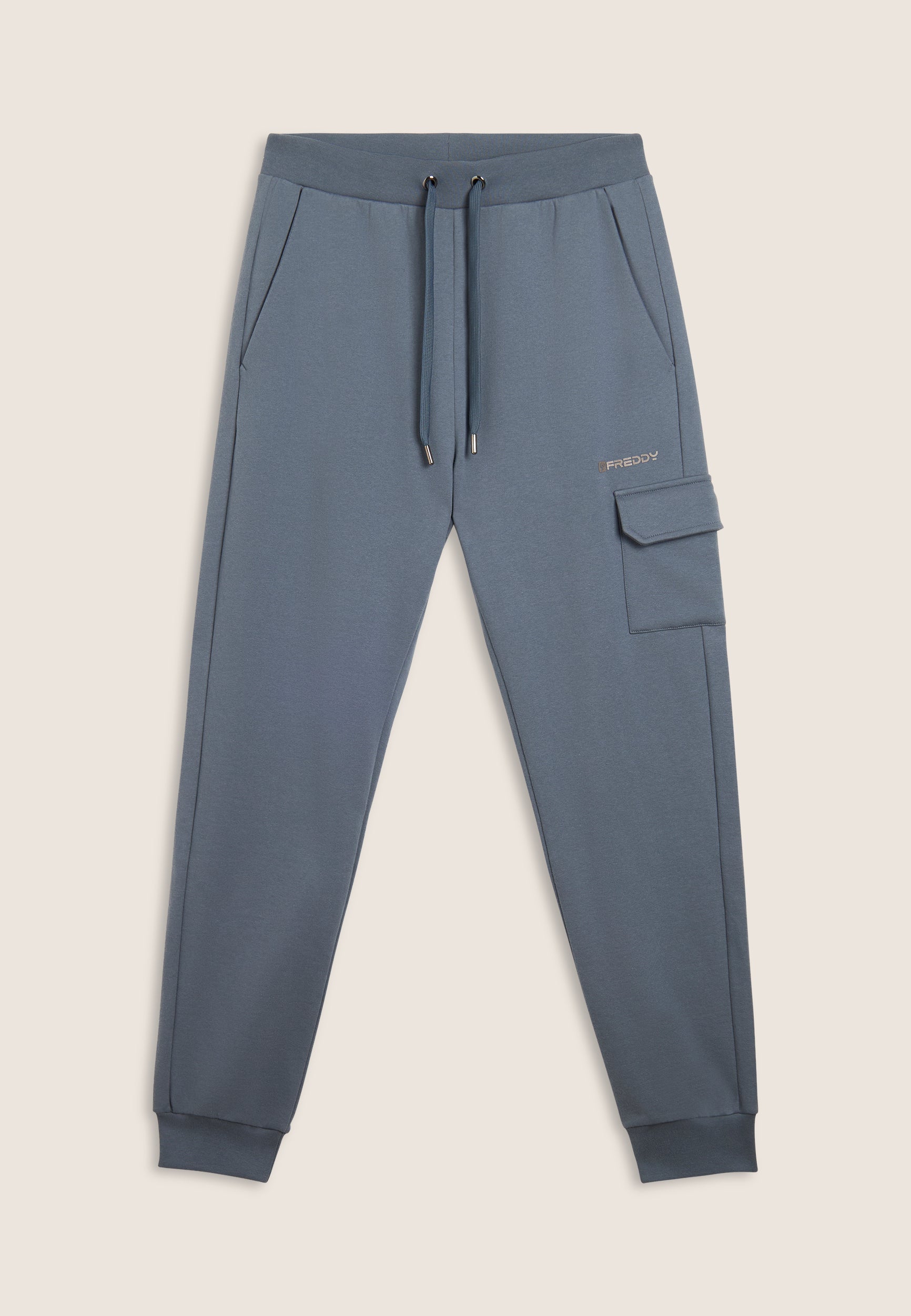 Pantalon de jogging pour hommes en molleton brossé 100 % coton ; il se caractérise par une coupe classique et des bandes côtelées aux chevilles. Taille élastique avec cordon. Il se caractérise par des poches passepoilées et une poche cousue sur la cuisse droite, pour une touche pratique. Petit logo FREDDY sur le côté gauche.