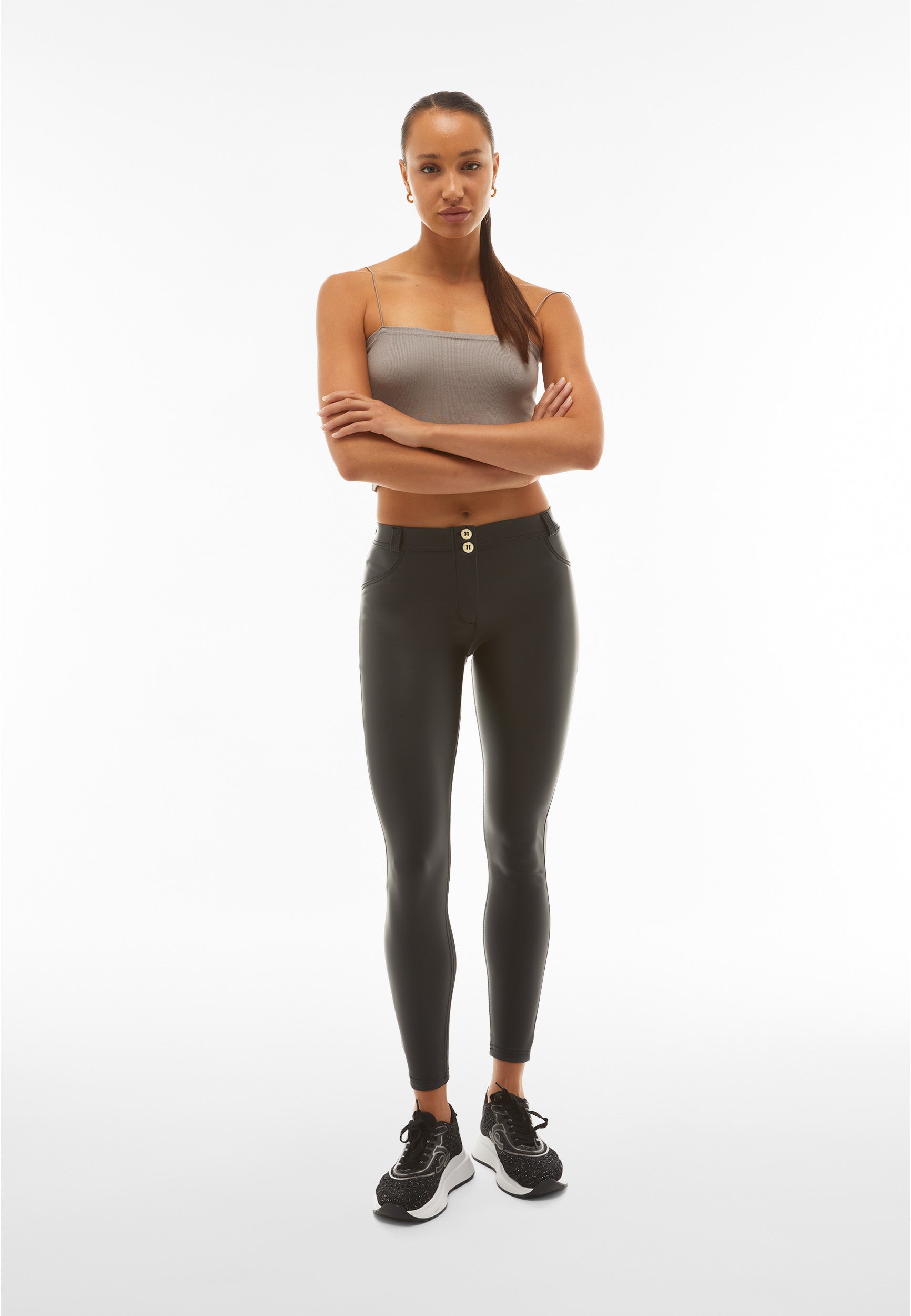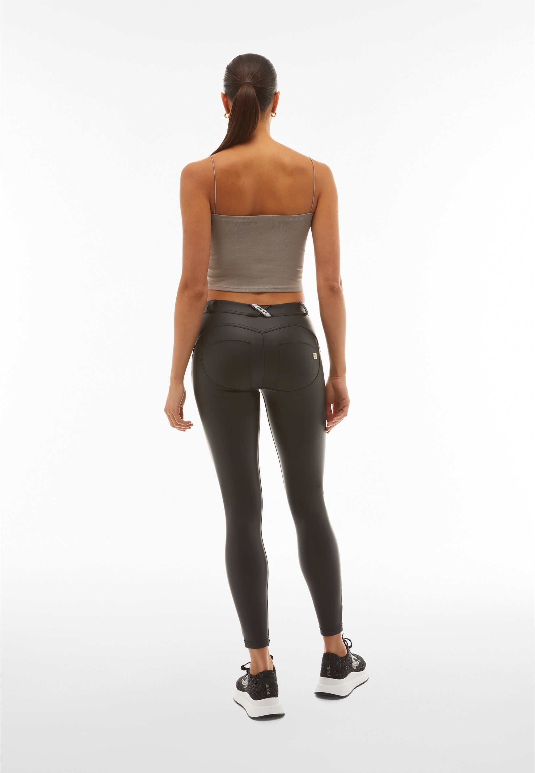 Pantalon push-up de la ligne WR.UP® à taille haute. Il est réalisé en simili cuir écologique et végan obtenu à partir de matériaux recyclés transformés en fibres neuves : un choix vert pour mettre vos formes valeur tout en respectant la nature.