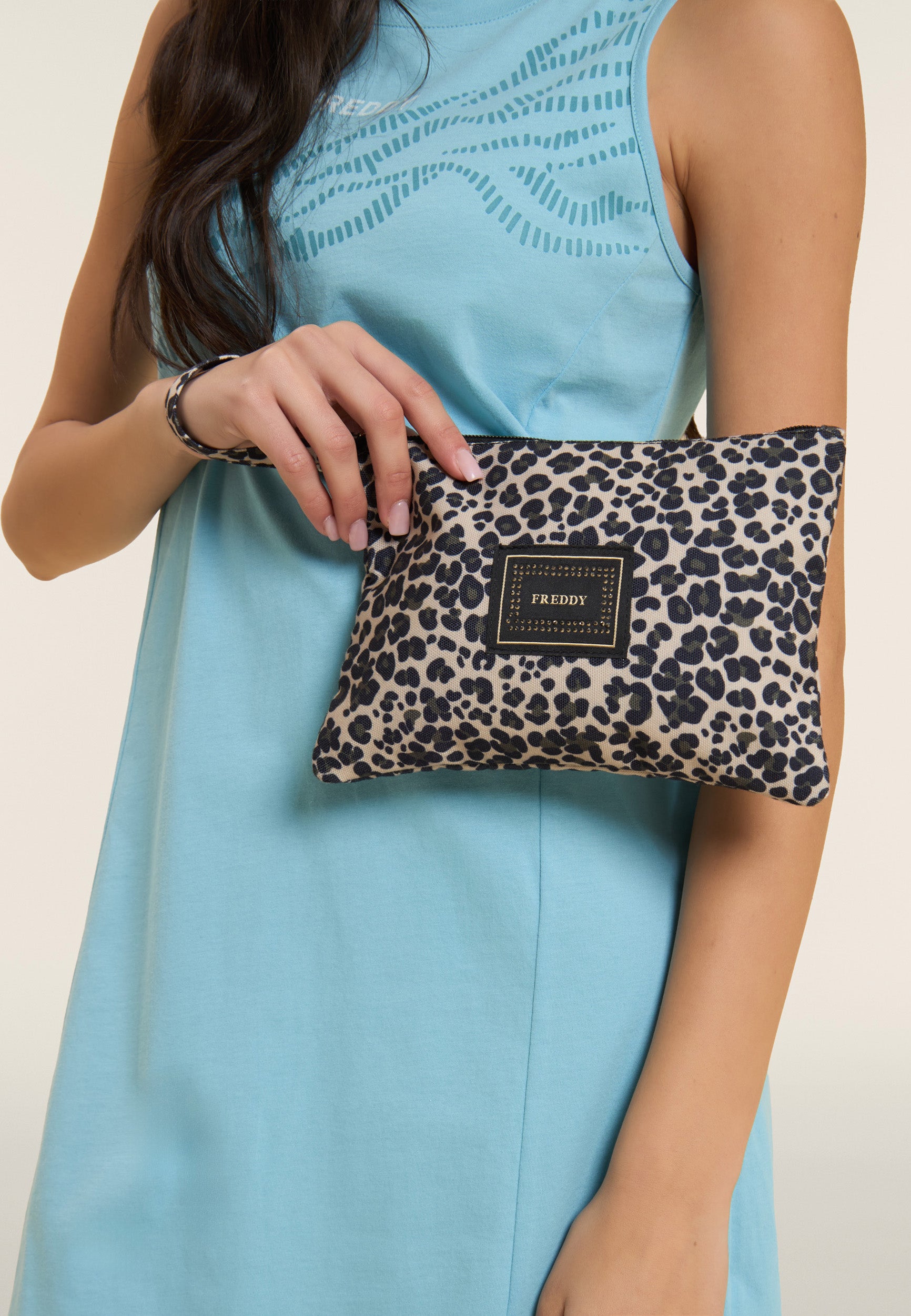 Avec son caractère fort et son design fonctionnel, cette pochette en toile à motif animal est l’accessoire idéal pour vous accompagner dans vos journées les plus dynamiques. La fermeture à glissière protège le contenu et l’insert sur la fermeture à glissière permet de le porter confortablement au poignet. Le logo FREDDY appliqué sur le côté extérieur est décoré de paillettes.