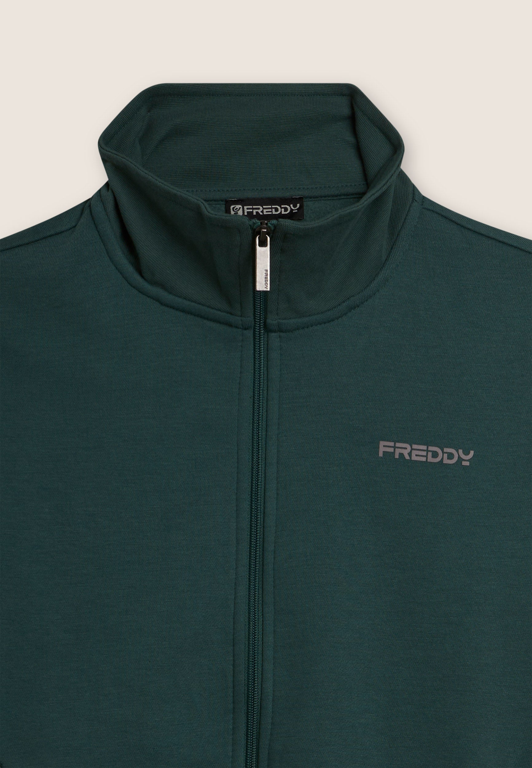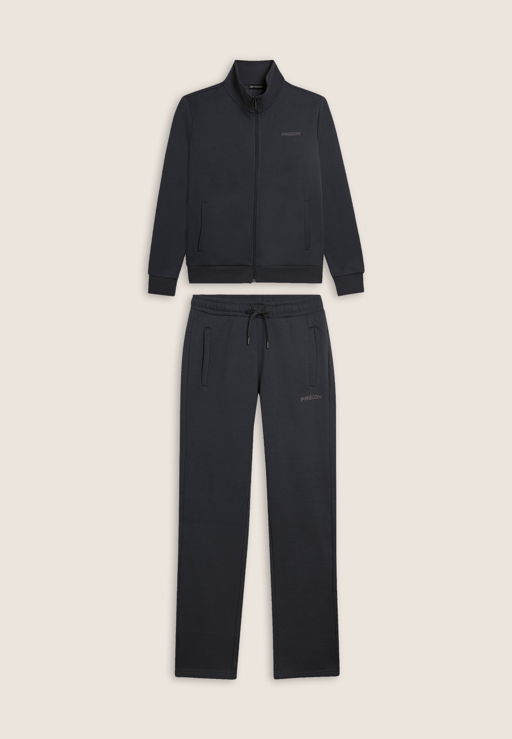 Survêtement de sport pour hommes en molleton brossé, coupe classique. Le sweat-shirt est entièrement zippé et se caractérise par un bord côtelé, un col montant et des manches longues avec bandes aux poignets. Le pantalon est à jambe droite, avec une taille élastique et un cordon ajustable. Les deux vêtements se caractérisent par des poches sur le devant. Logo FREDDY imprimé sur le cœur et le côté gauche du pantalon.