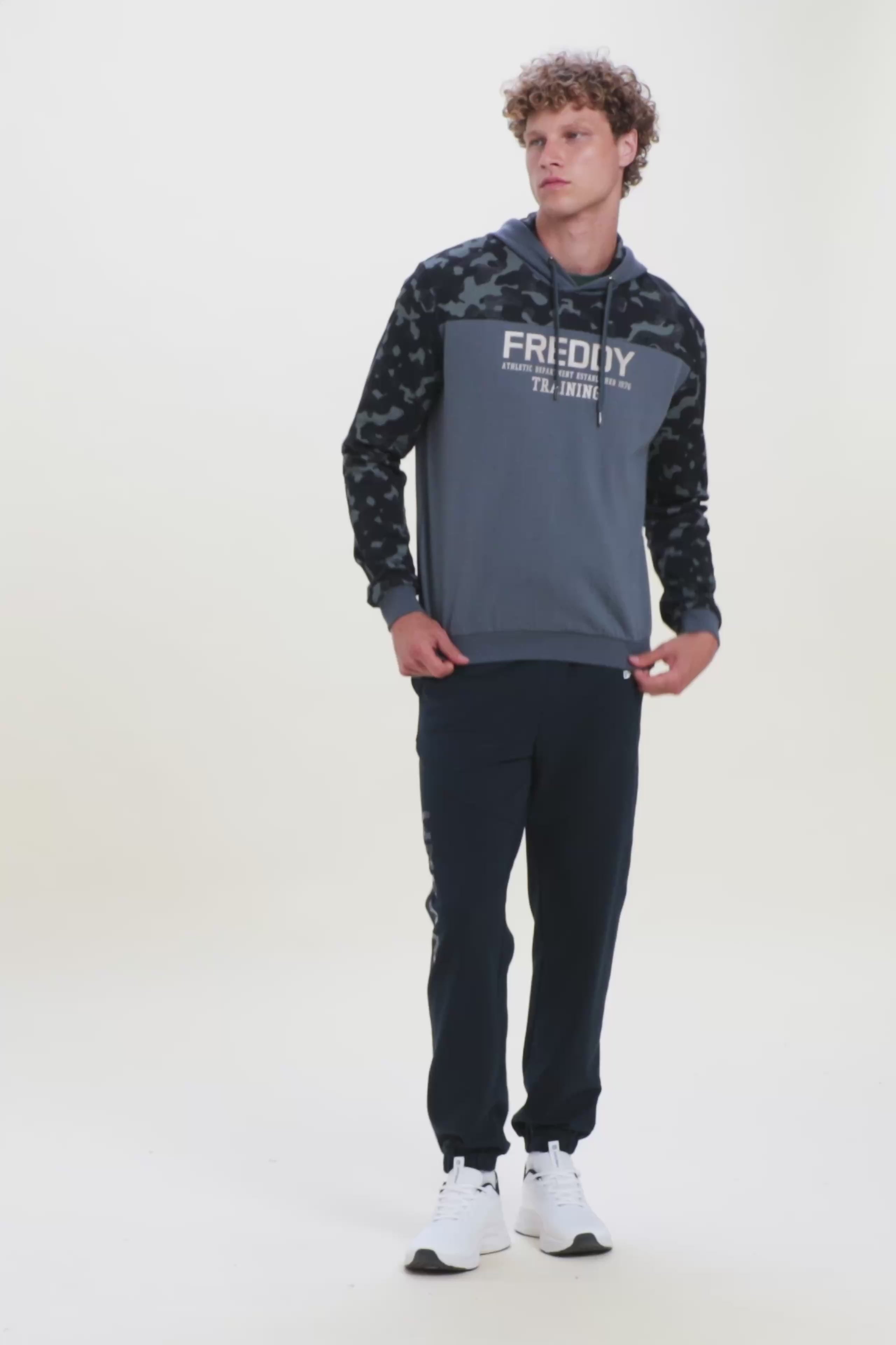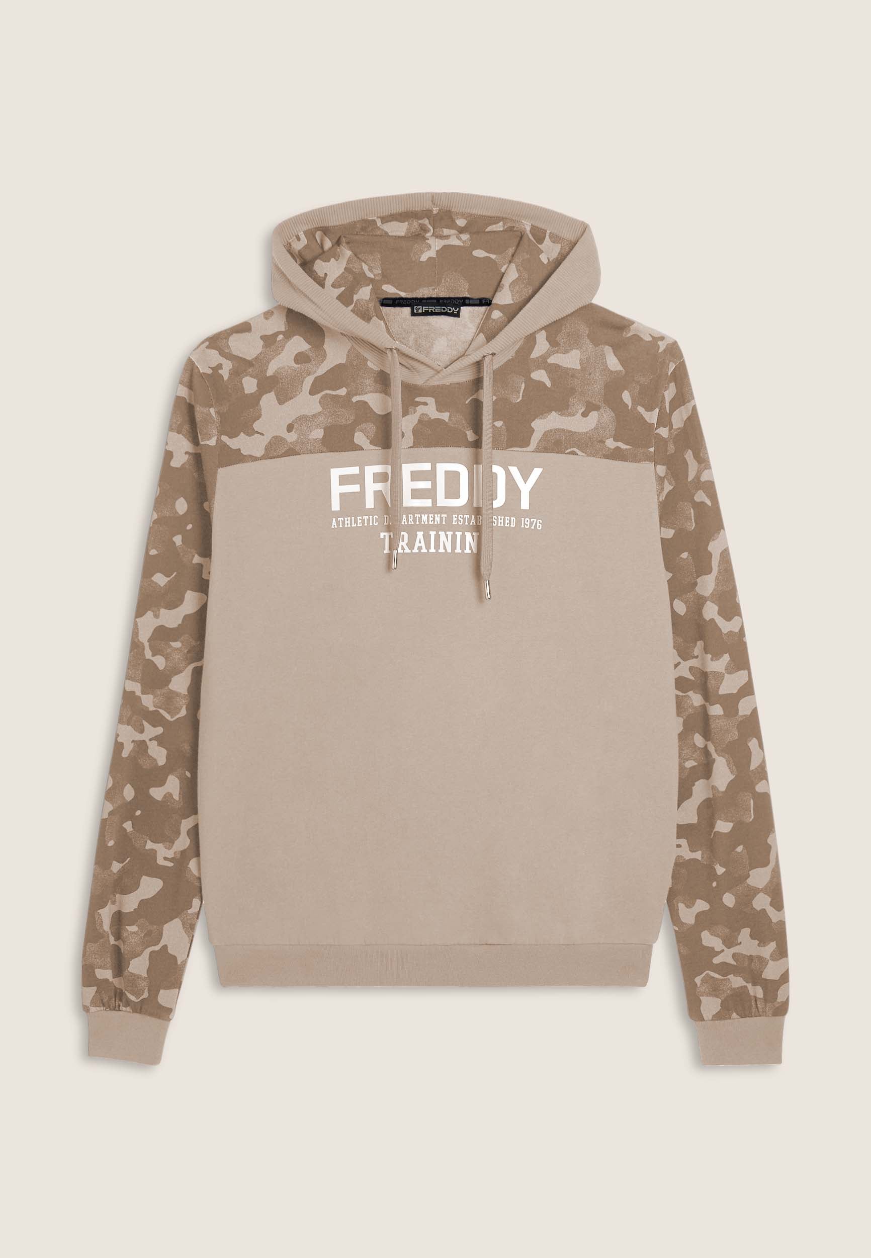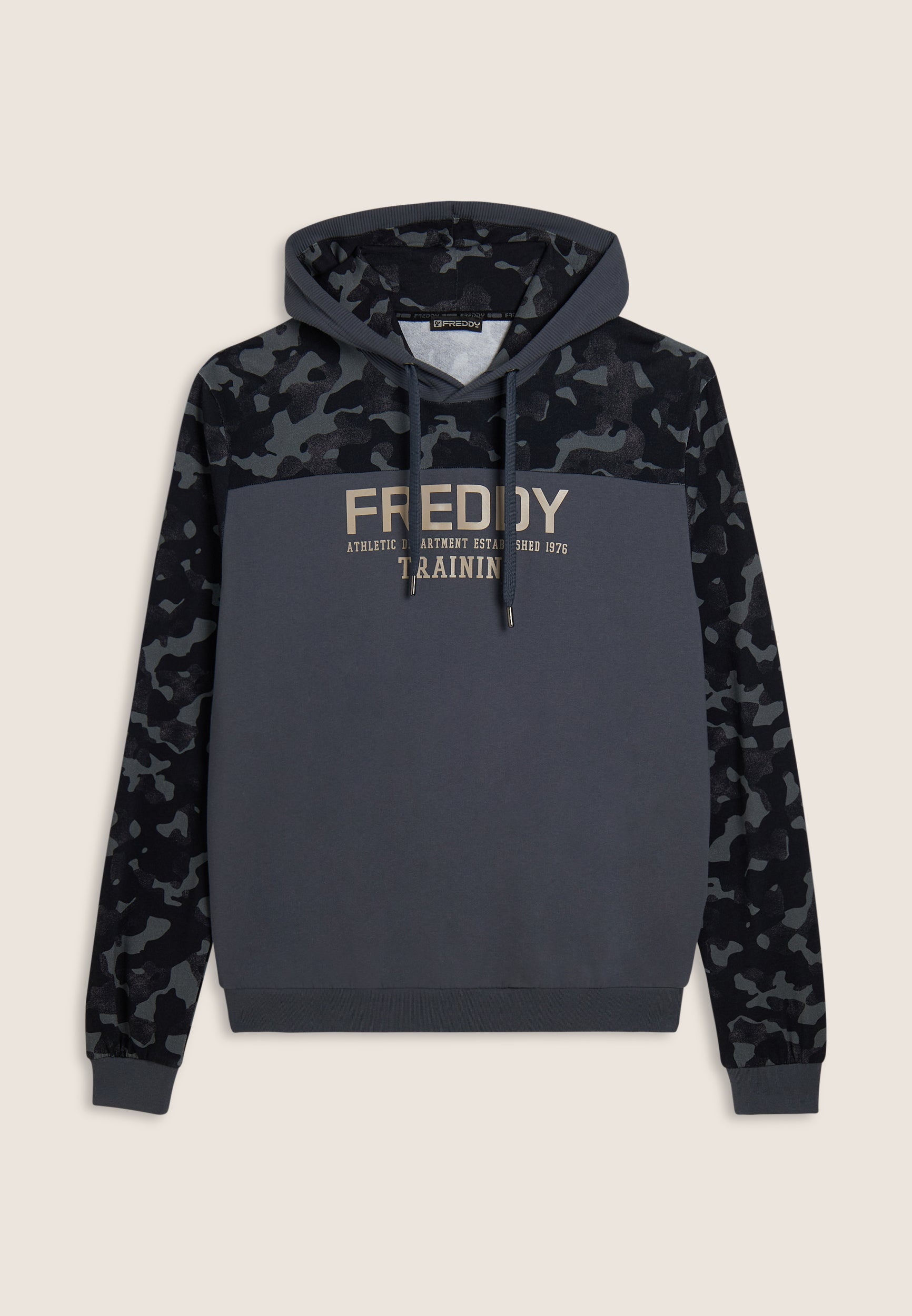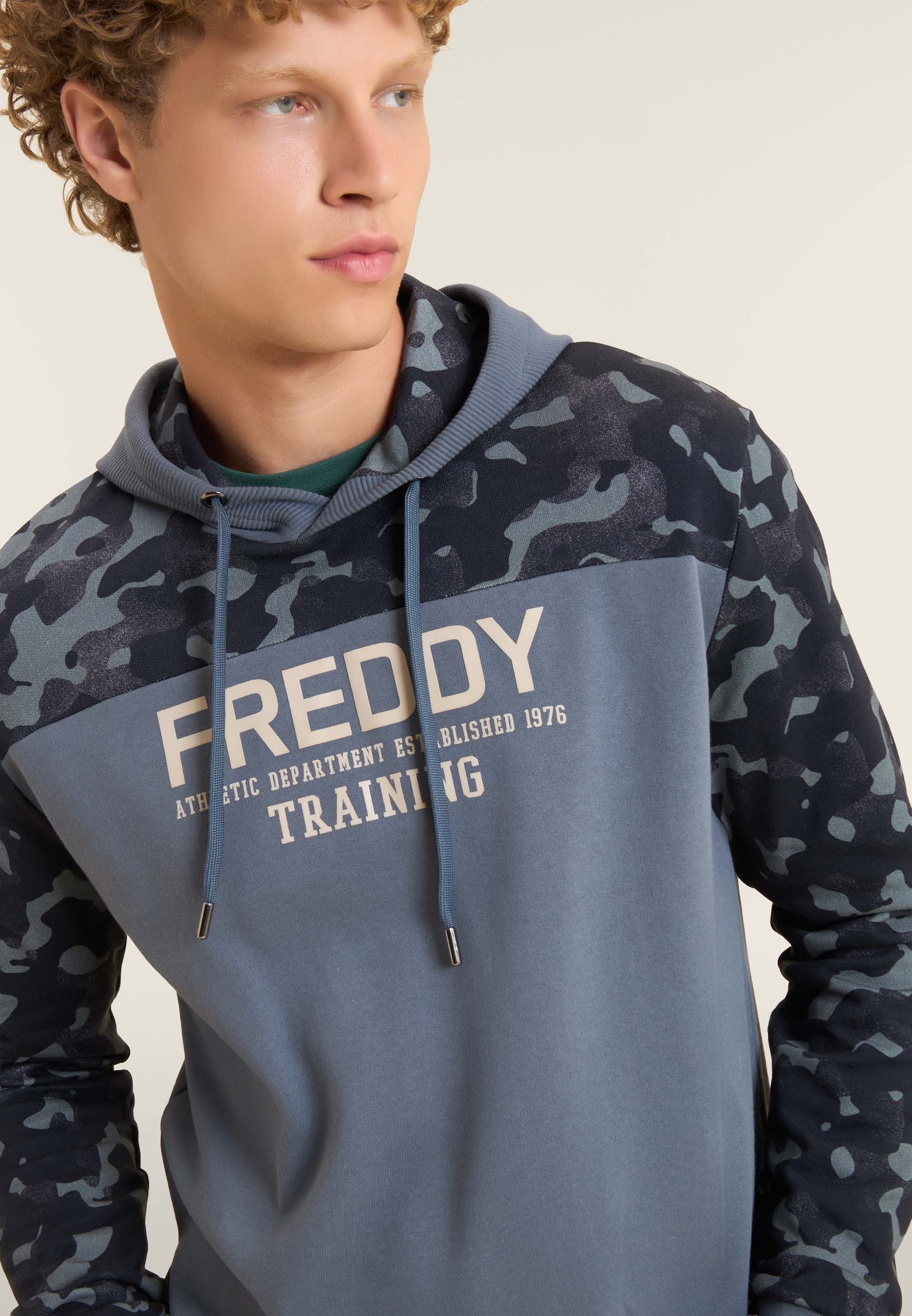 Sweat-shirt de sport pour hommes en molleton brossé 100 % coton, coupe classique. Capuche réglable avec cordon. Intérieur de la capuche, épaules et manches en imprimé camouflage ; extérieur de la capuche en tissu rayé. Il présente taille et poignets côtelés. Le logo FREDDY est imprimé au centre de la poitrine.