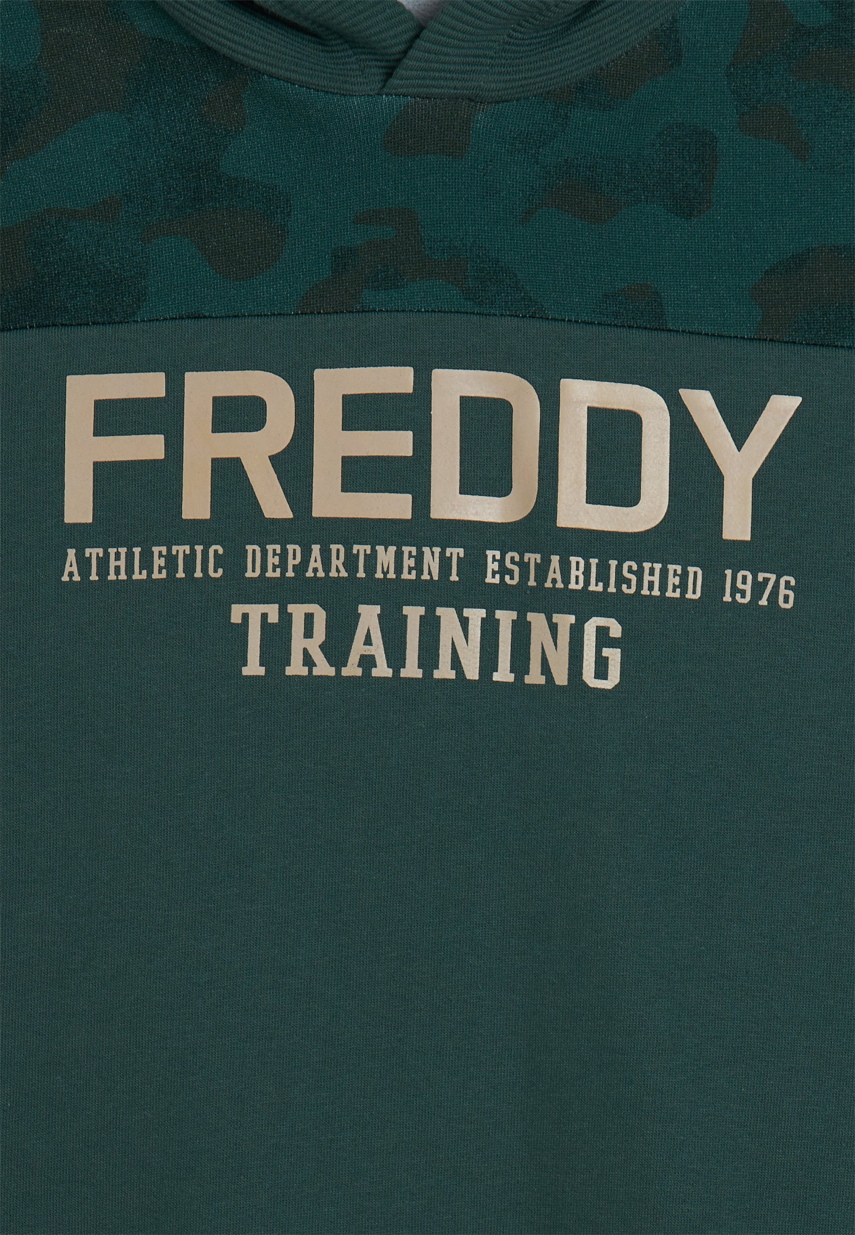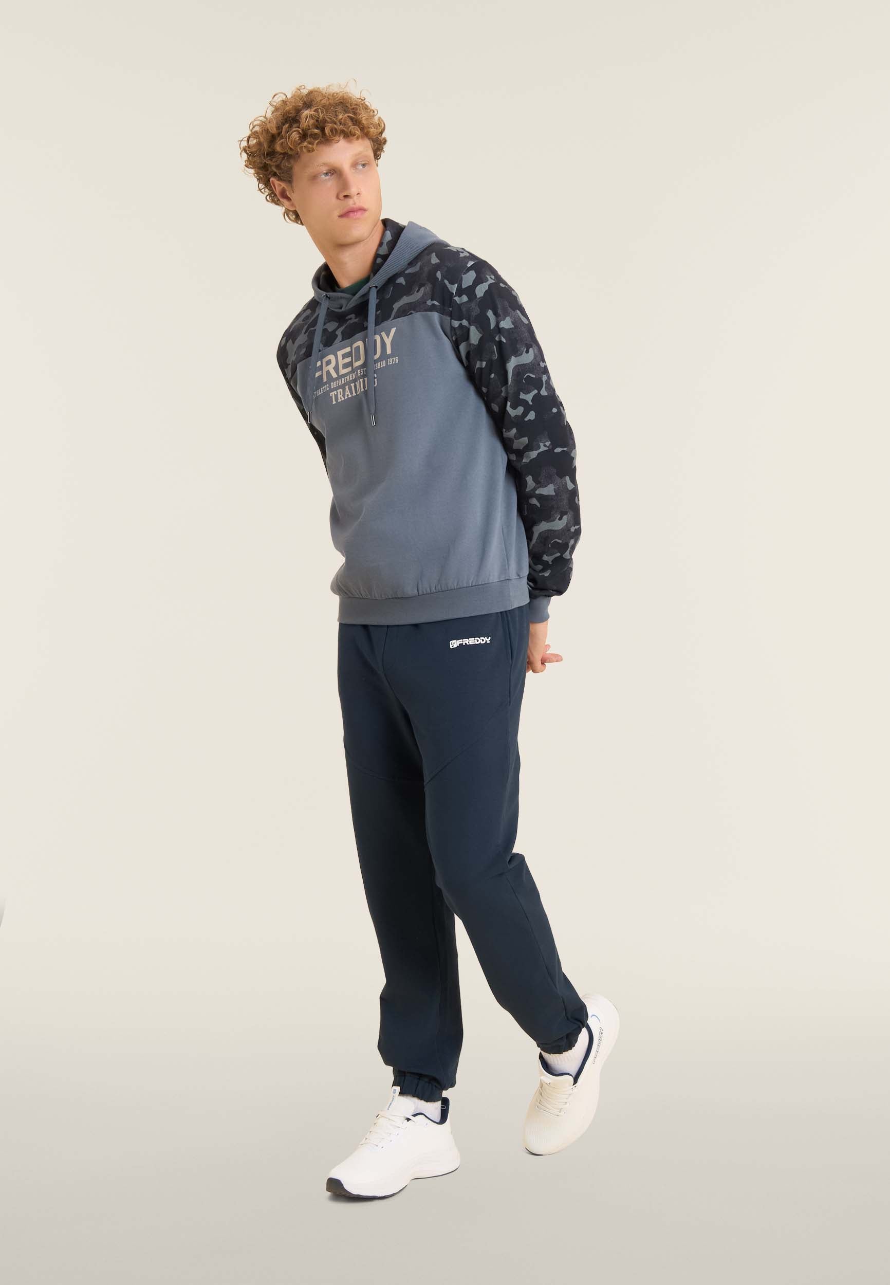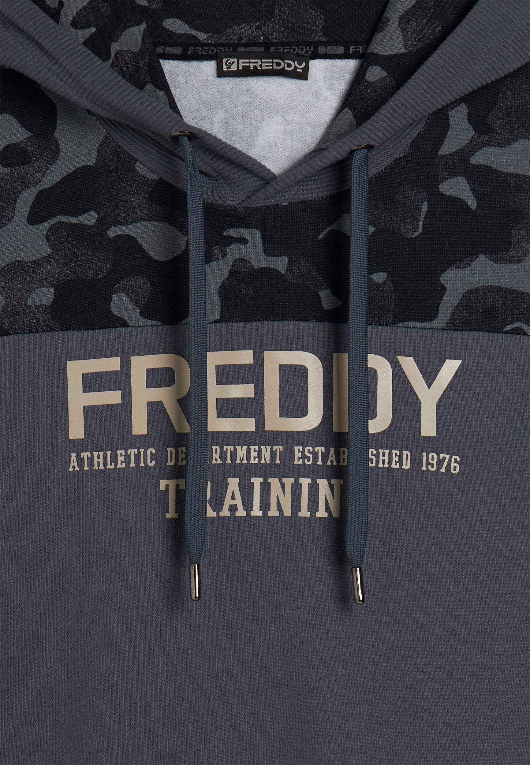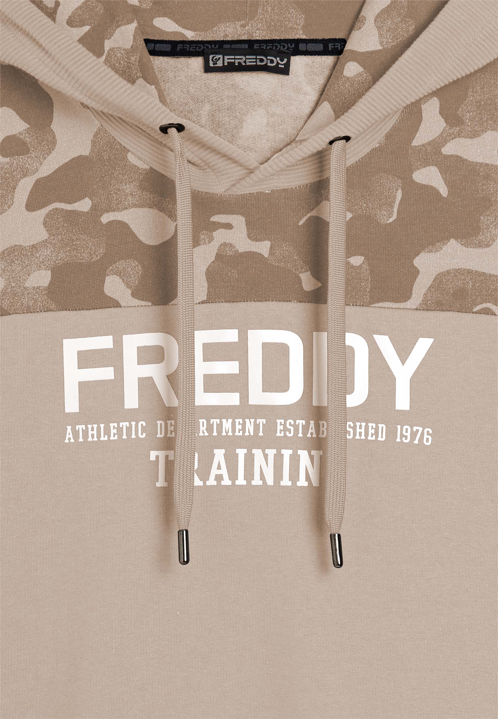 Sweat-shirt de sport pour hommes en molleton brossé 100 % coton, coupe classique. Capuche réglable avec cordon. Intérieur de la capuche, épaules et manches en imprimé camouflage ; extérieur de la capuche en tissu rayé. Il présente taille et poignets côtelés. Le logo FREDDY est imprimé au centre de la poitrine.