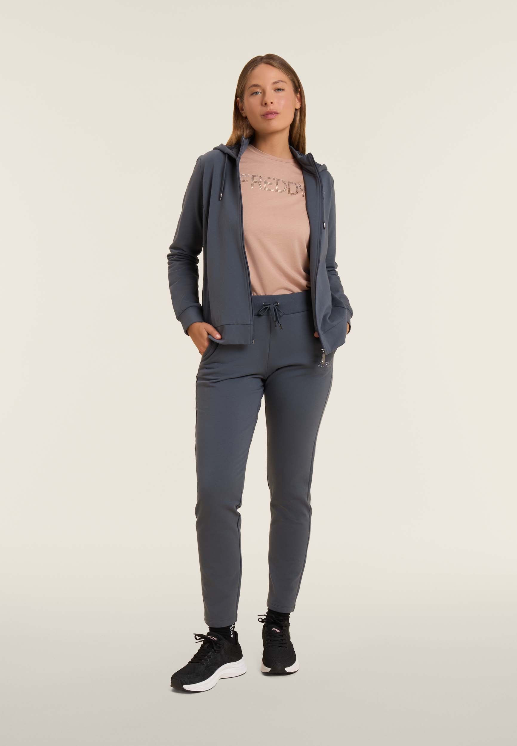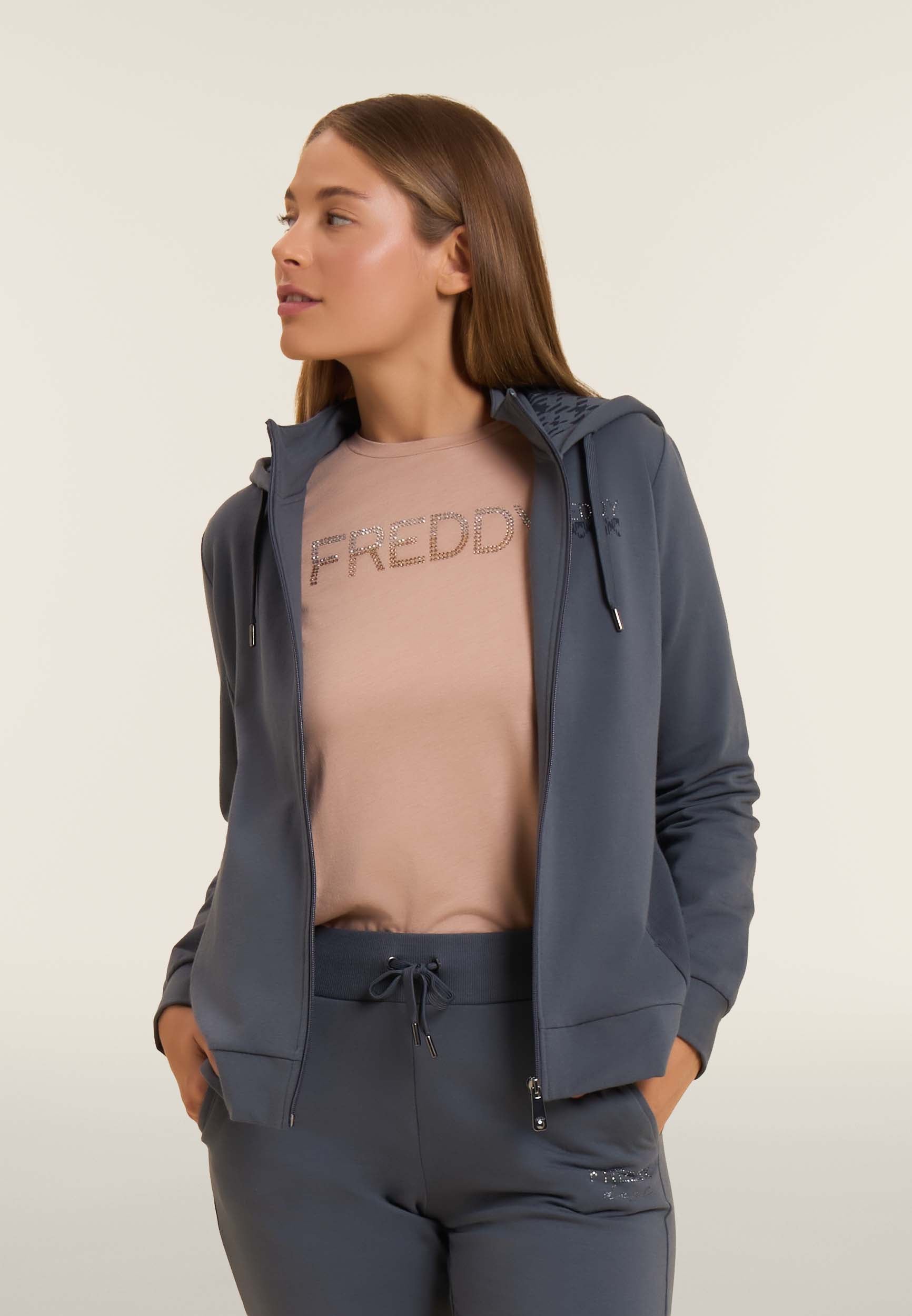 Sweat-shirt zippé caractérisé par un bord droit avec fentes latérales bordées de tissu à imprimés géométriques. La capuche est doublée et terminée par une bordure en jersey imprimé. Manches avec poignets, logo en forme de cœur en clous et poches intérieures passepoilées pratiques.
