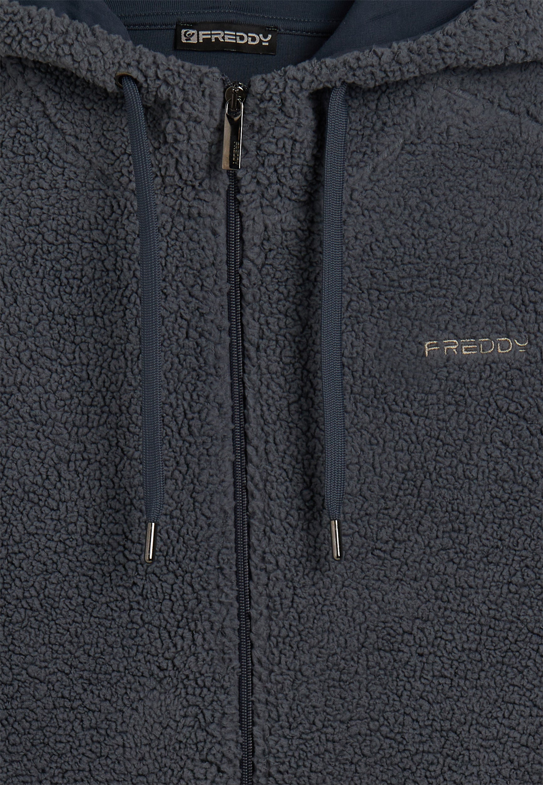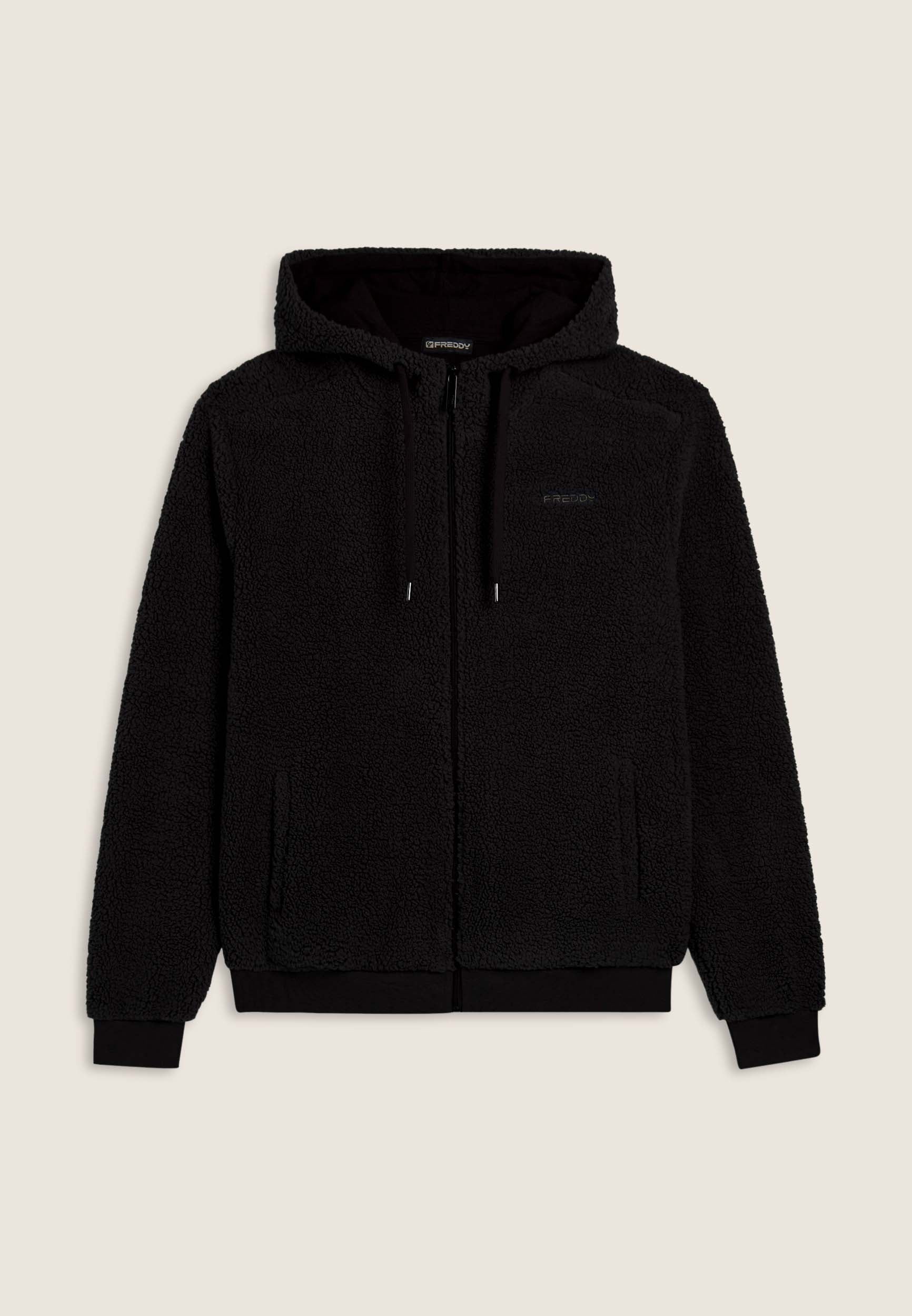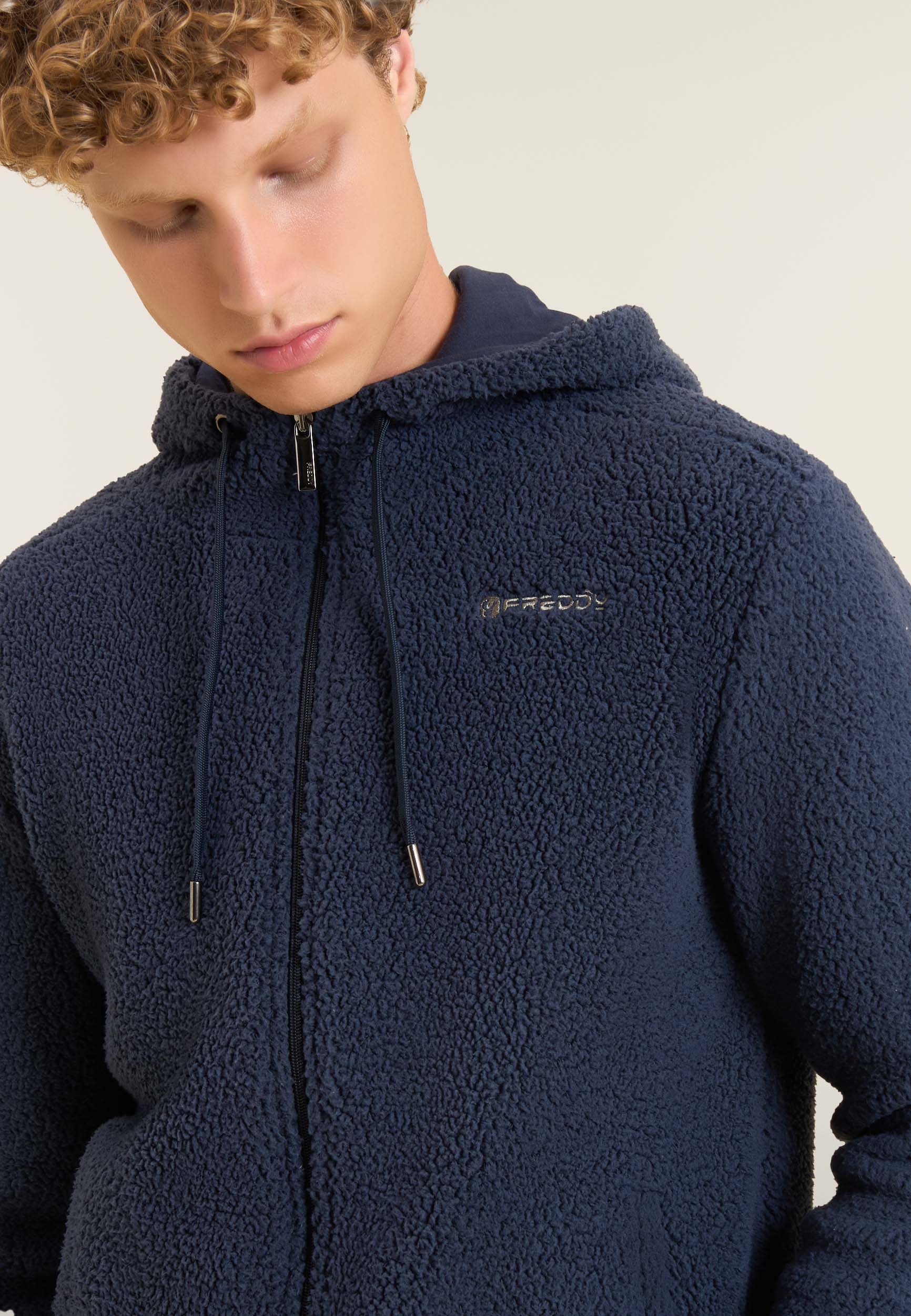 Sweat-shirt pour hommes en tissu Sherpa avec capuche doublée de jersey et cordon ajustable. Il se caractérise par des manches avec bandes côtelées aux poignets, un bord élastique et des poches passepoilées. Le logo FREDDY imprimé sur le cœur ajoute une touche graphique discrète.