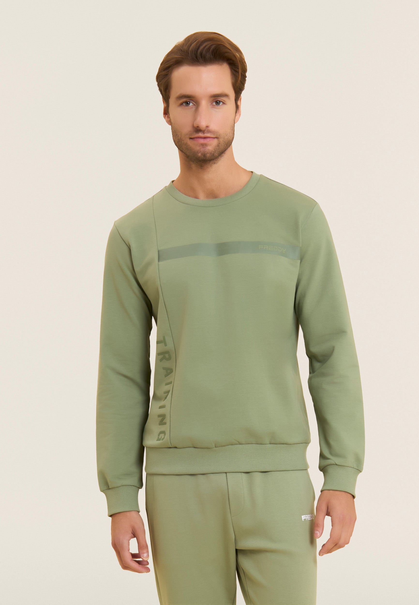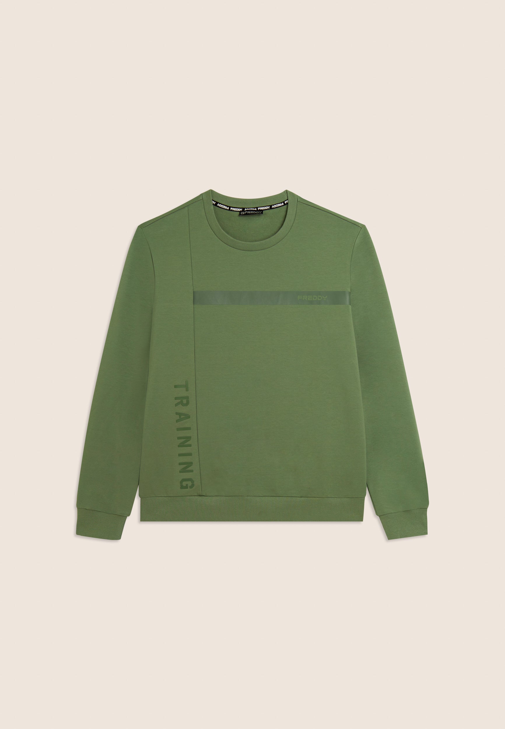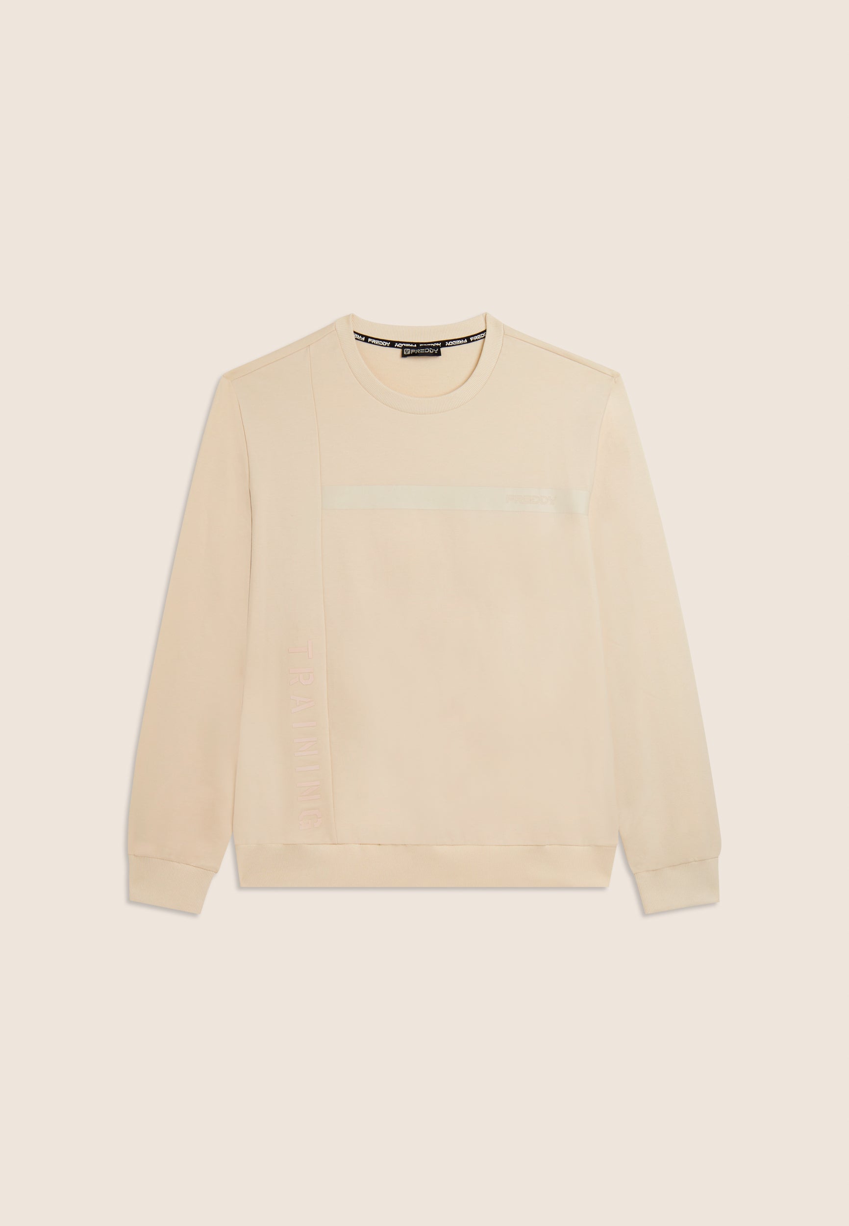 Sweat-shirt pour homme à coupe et longueur classiques, en molleton de coton Baby, un tissu doux et légèrement extensible parfait pour les activités de tous les jours. L’encolure col rond, les poignets et la bande au bas sont côtelés pour un ajustement stable et confortable. Le design sportif à surpiqûres en bloc est rehaussé par la bande du logo FREDDY sur la poitrine et le lettrage vertical « TRAINING » sur le côté droit, tous deux imprimés ton sur ton avec un effet caoutchouté pour un look technique et moderne.