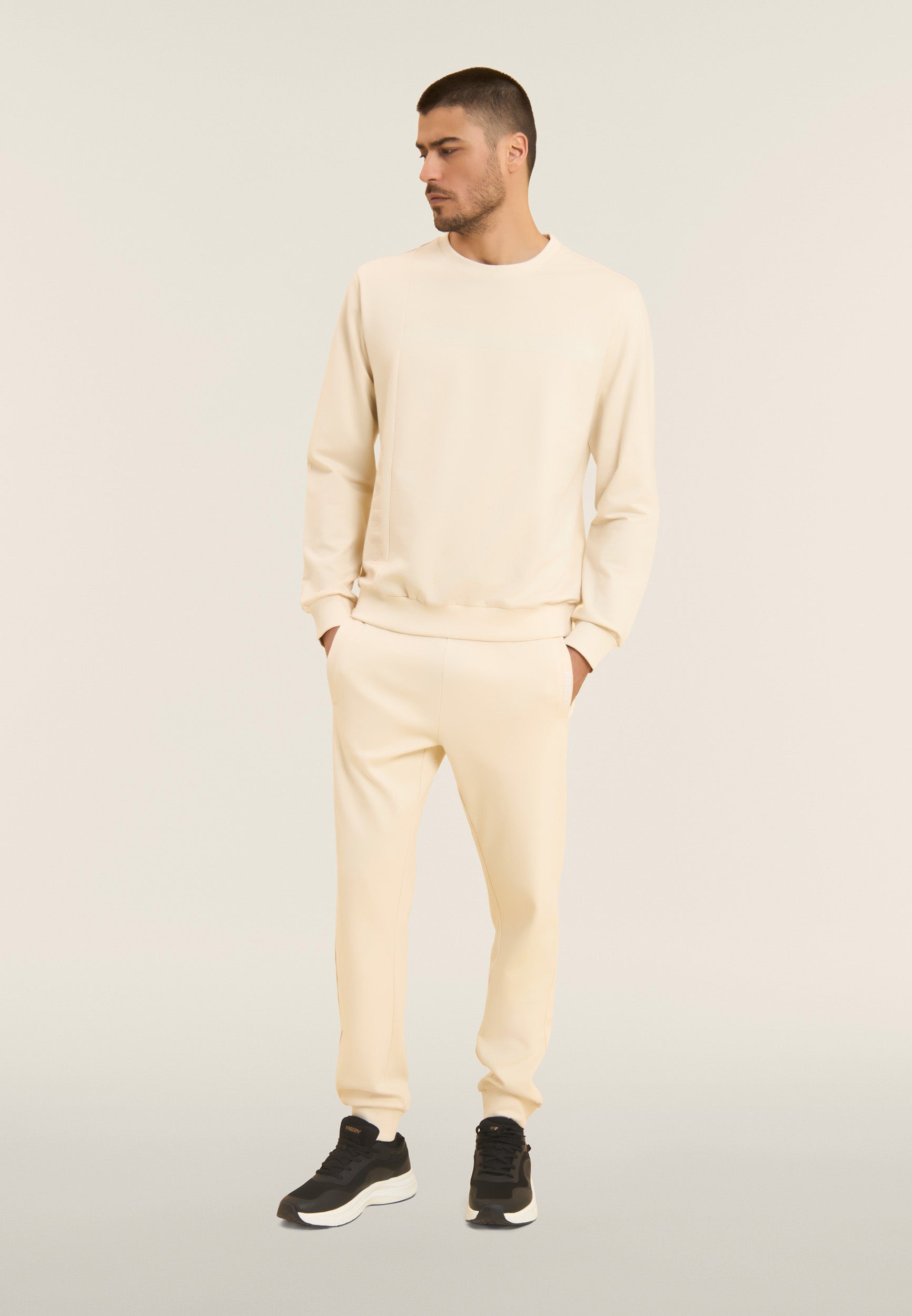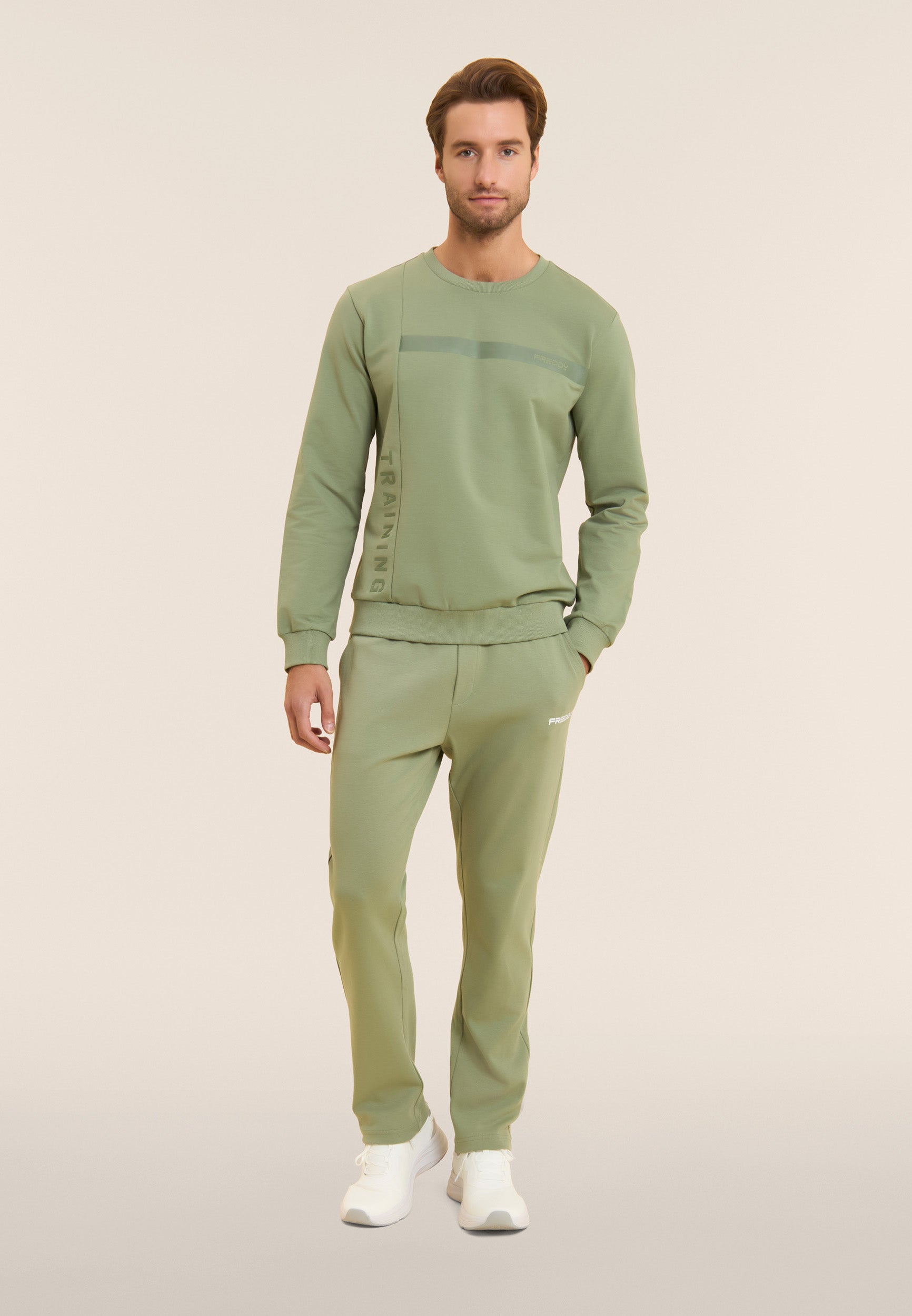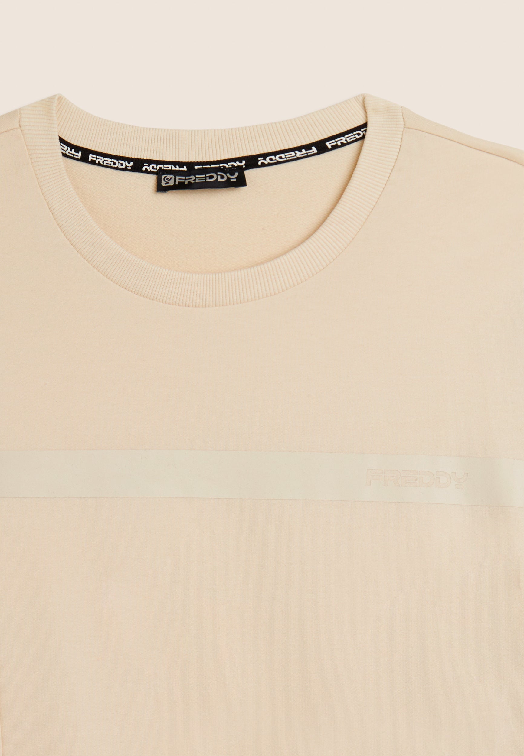 Sweat-shirt pour homme à coupe et longueur classiques, en molleton de coton Baby, un tissu doux et légèrement extensible parfait pour les activités de tous les jours. L’encolure col rond, les poignets et la bande au bas sont côtelés pour un ajustement stable et confortable. Le design sportif à surpiqûres en bloc est rehaussé par la bande du logo FREDDY sur la poitrine et le lettrage vertical « TRAINING » sur le côté droit, tous deux imprimés ton sur ton avec un effet caoutchouté pour un look technique et moderne.