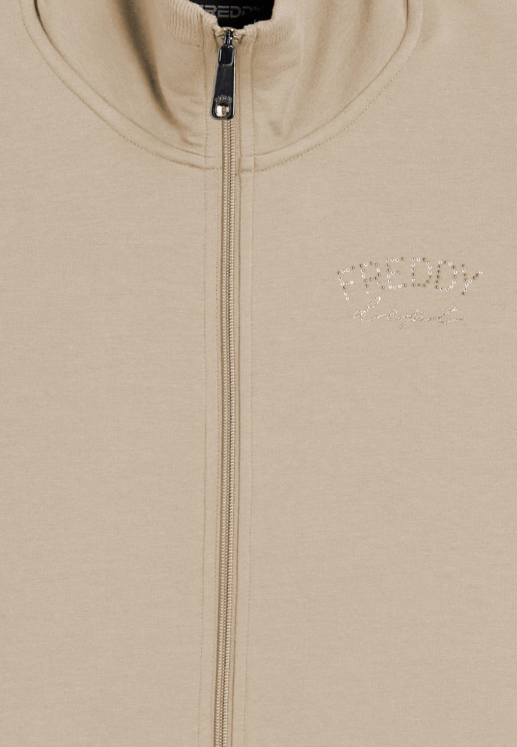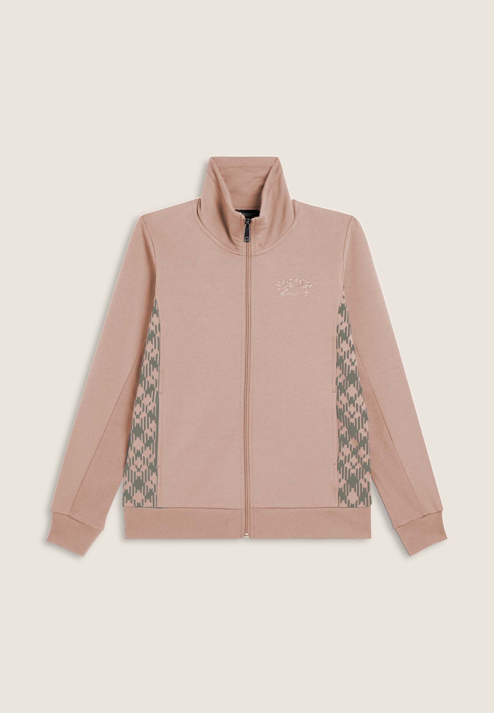 Sweat-shirt de sport pour femmes zippé en molleton brossé élastique, coupe classique. Le col montant, les manches avec poignets et l’intérieur côtelé assurent le confort. Les pièces décoratives latérales en tissu à imprimés ton sur ton ajoutent une touche distinctive. Un logo en clous sur le cœur et des poches passepoilées complètent le vêtement.