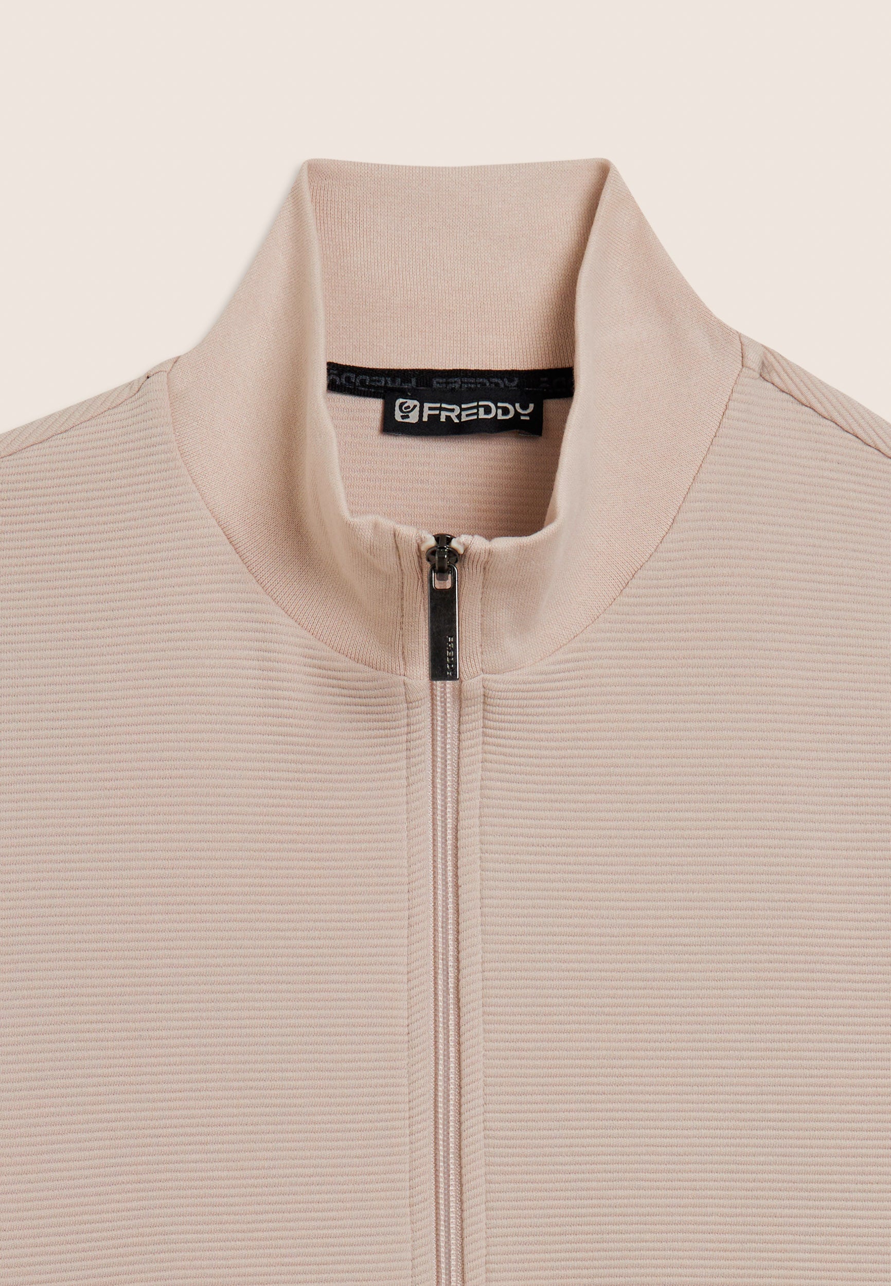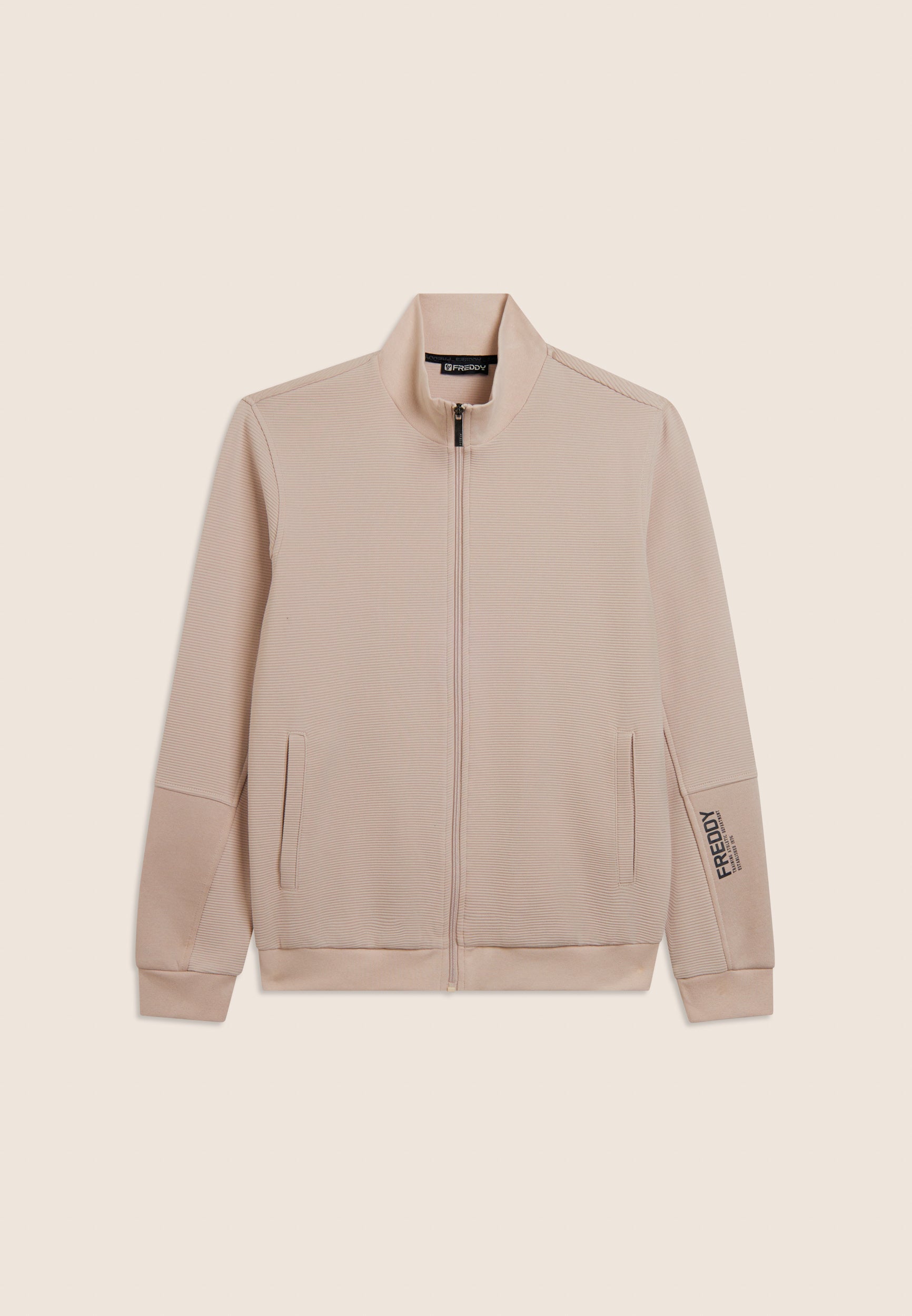 Sweat-shirt pour hommes entièrement zippé, coupe classique. Il est fabriqué en tissu molletonné élastique doux et texturé. Il se caractérise par un col montant côtelé, des manches avec bandes aux poignets et une bande au bord. Le logo FREDDY orne le bord de la manche gauche. Il se caractérise par des poches passepoilées pratiques.