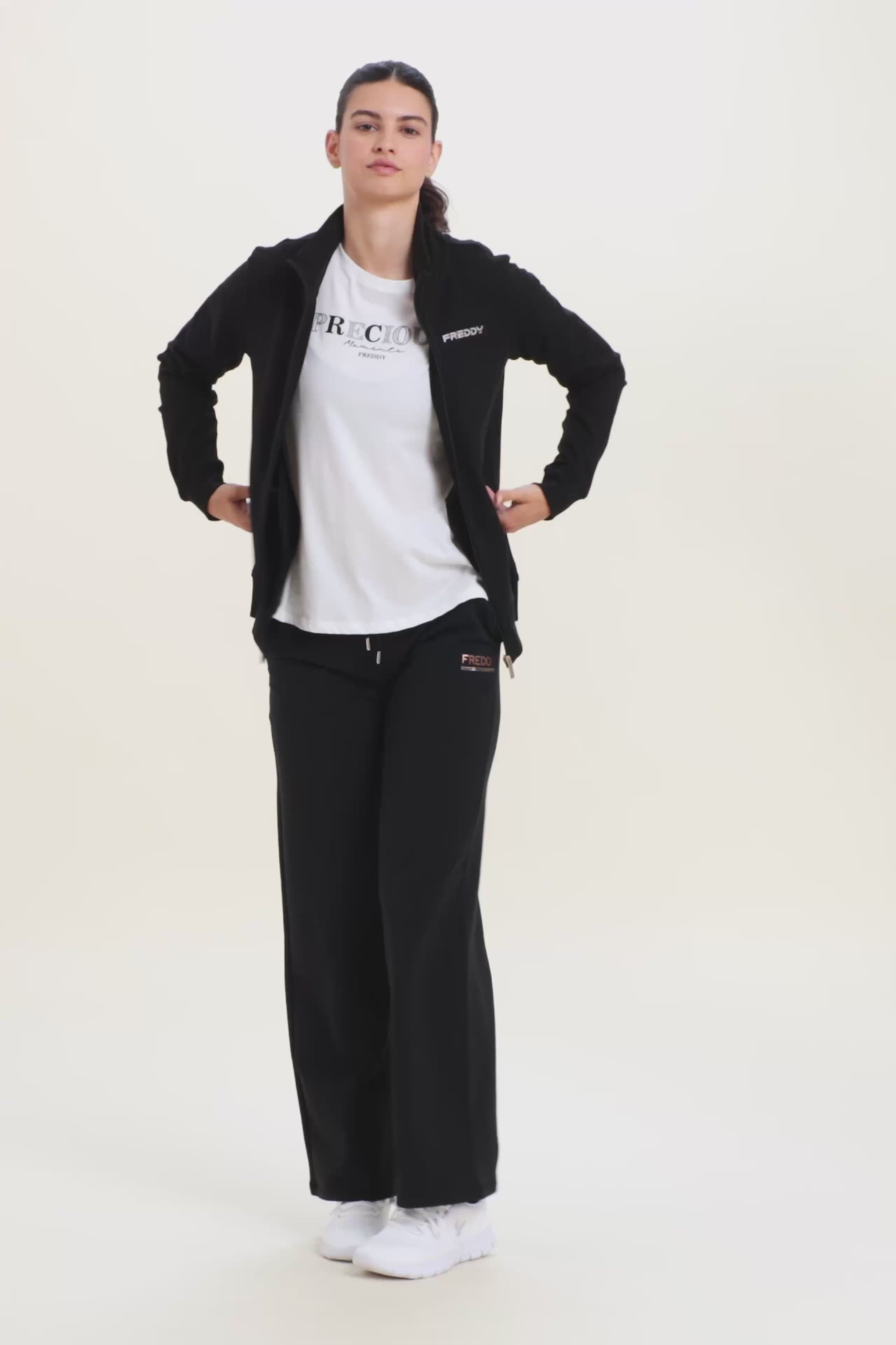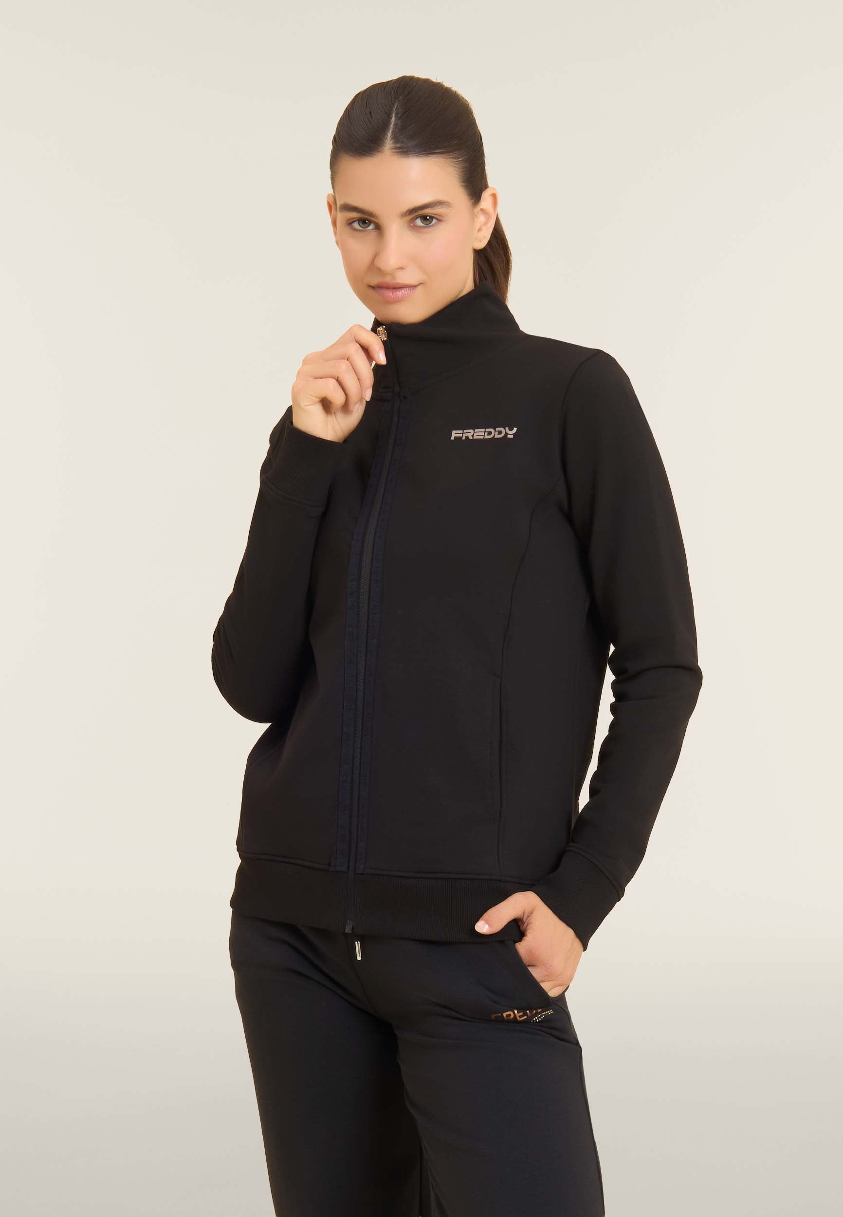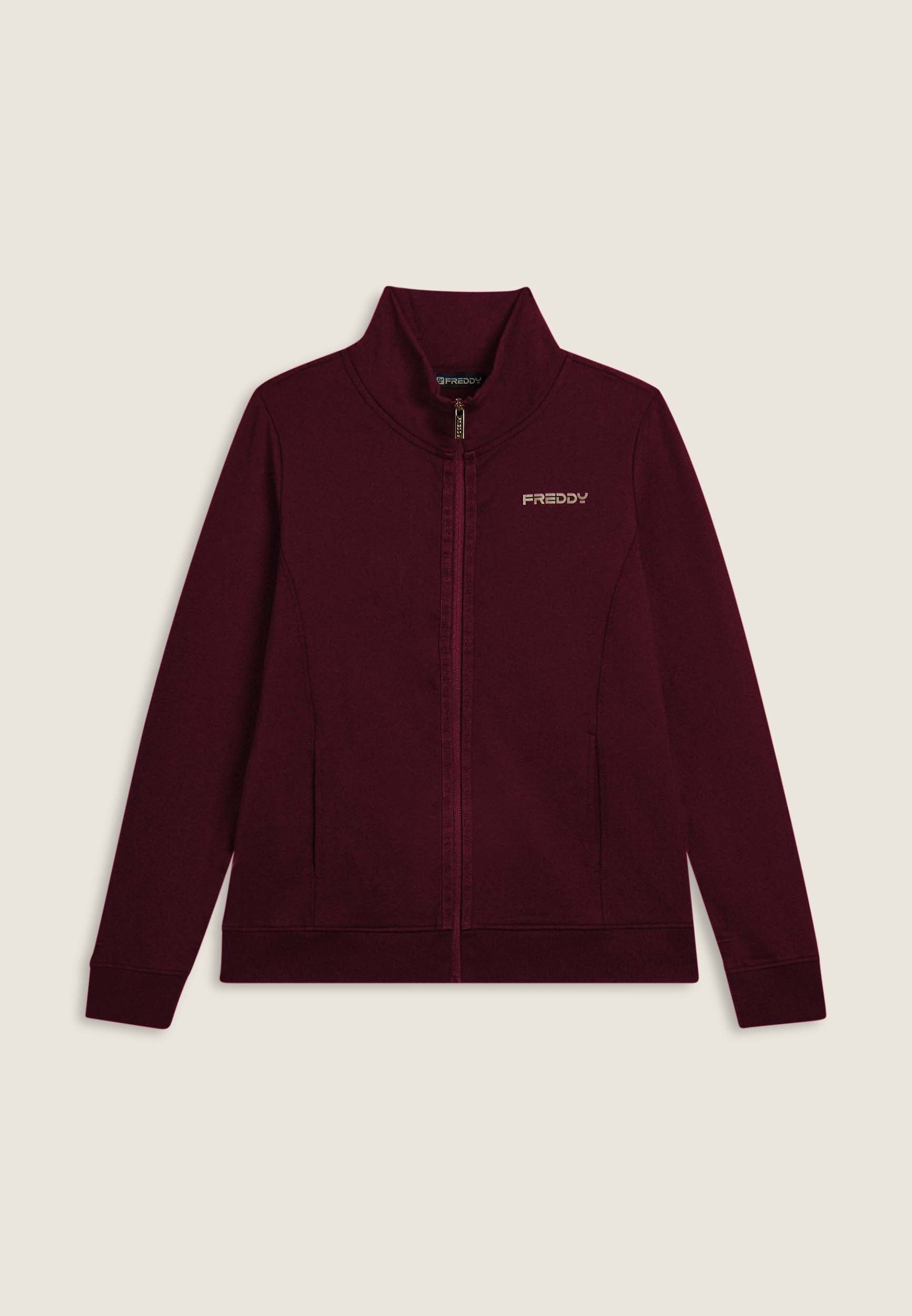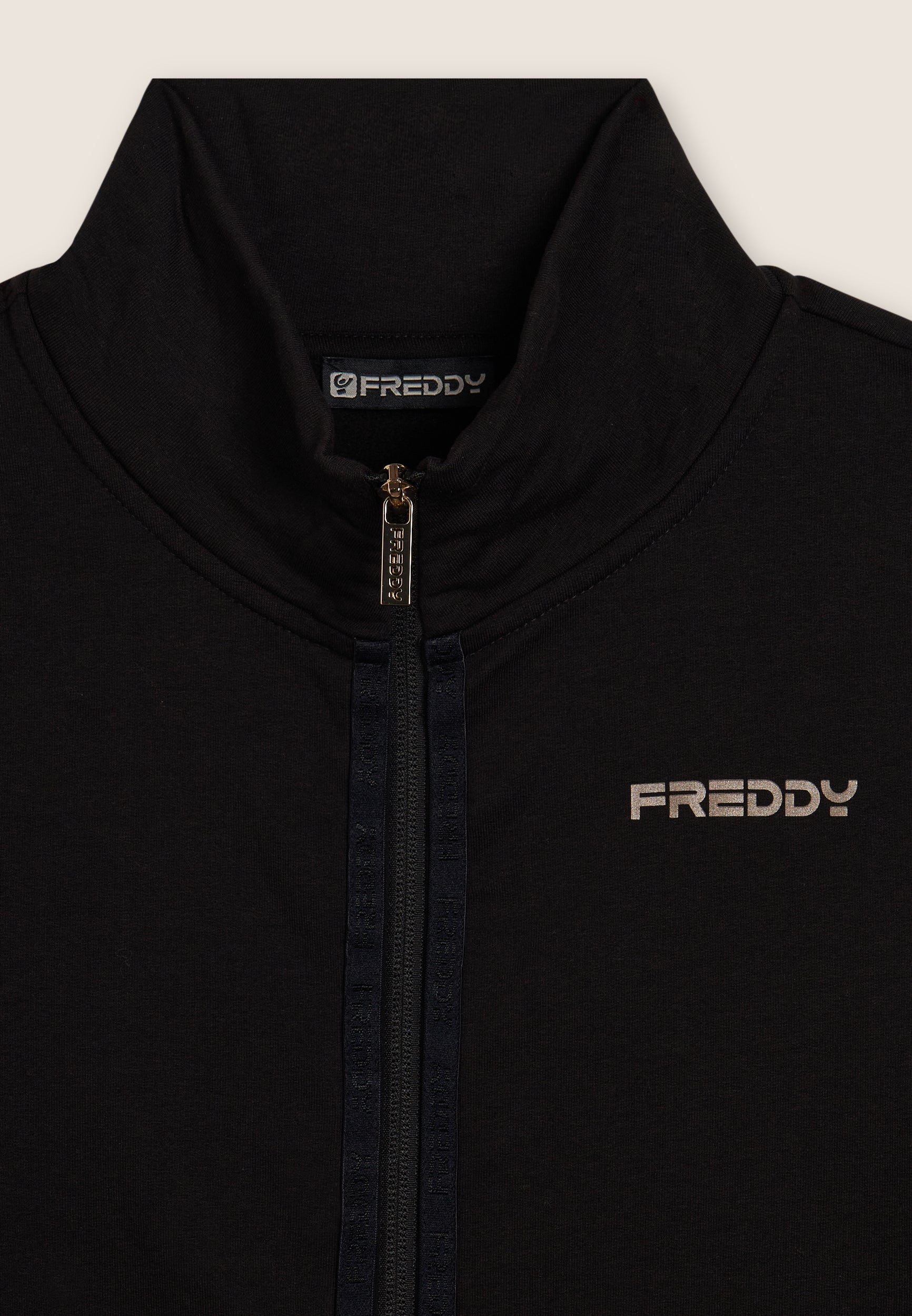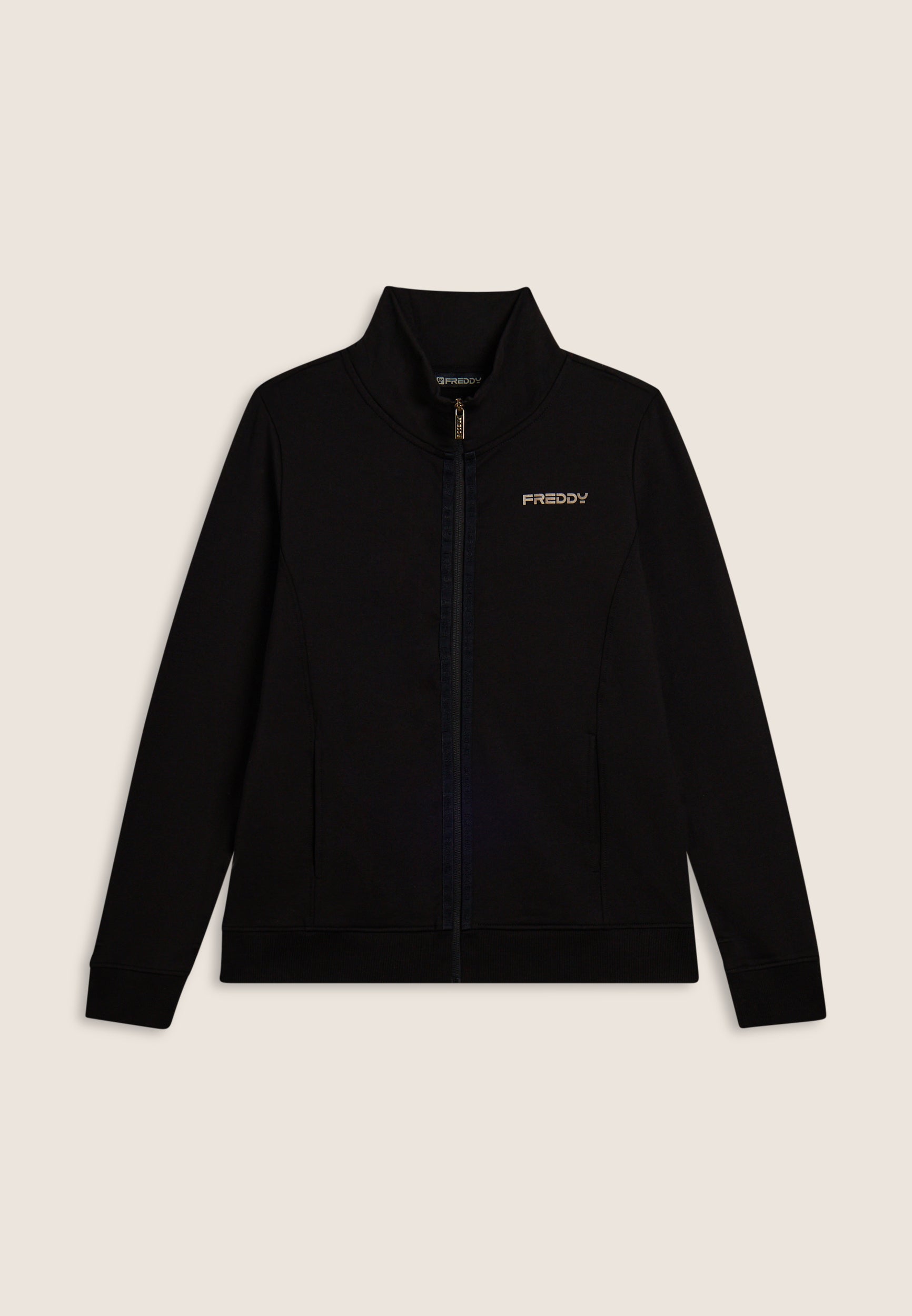 Sweat-shirt pour femmes entièrement zippé en molleton brossé élastique, à coupe classique et col montant. Les manches sont terminées par des poignets, tandis qu’un petit logo FREDDY sur le cœur assure un look propre et essentiel. Le vêtement est complété par des poches latérales passepoilées et un bord côtelé.