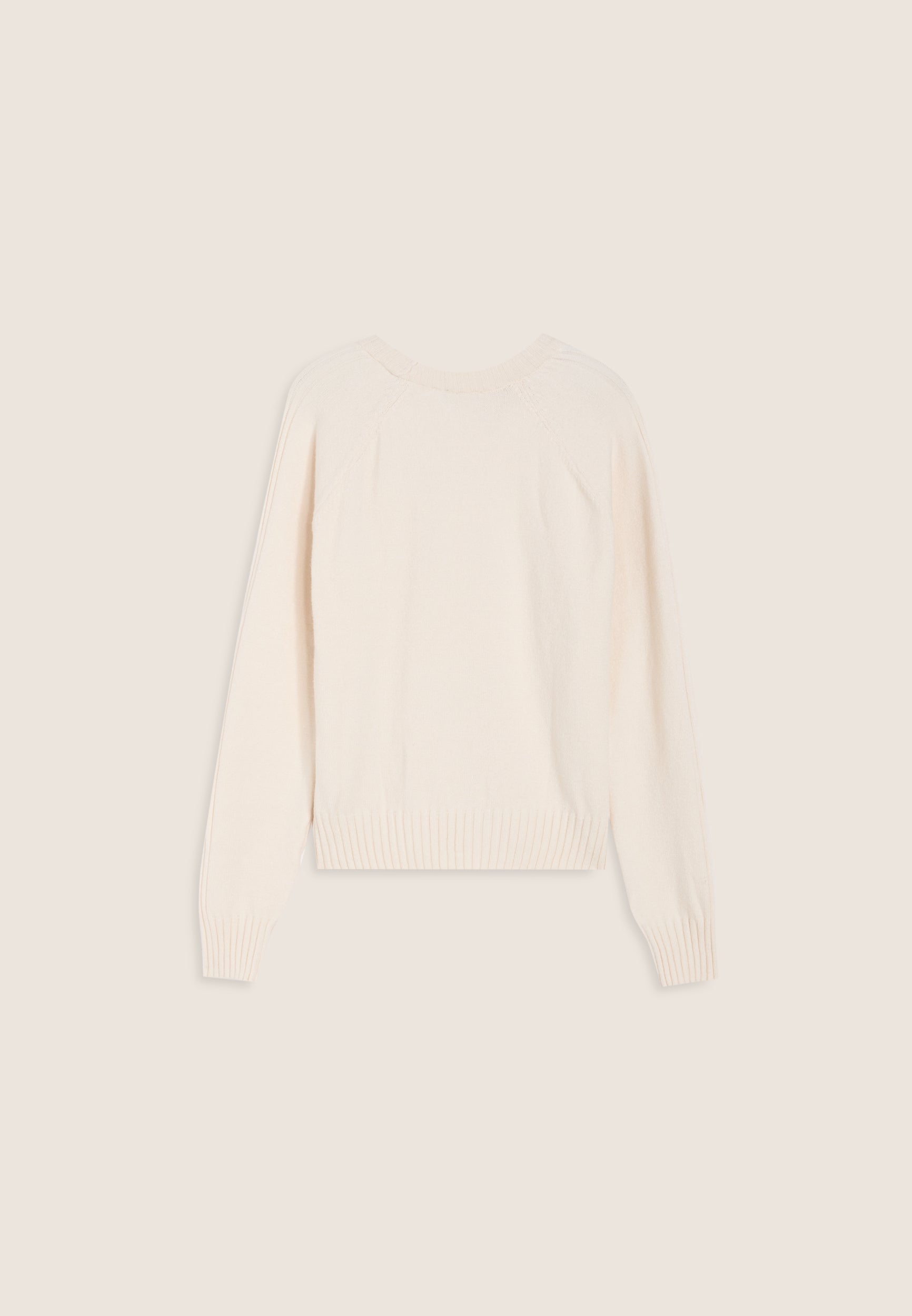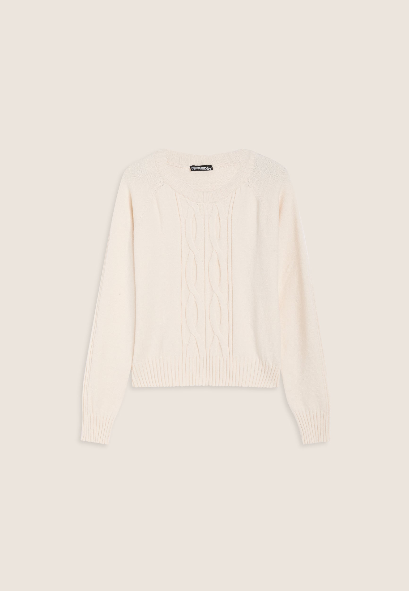 T-shirt à col rond pour femmes en tricot à coupe classique, caractérisé par deux grandes tresses verticales sur le devant. Le col et les manches raglan avec poignets côtelés garantissent une coupe confortable et soignée. Dernier détail : plaque du logo FREDDY sur le côté gauche.