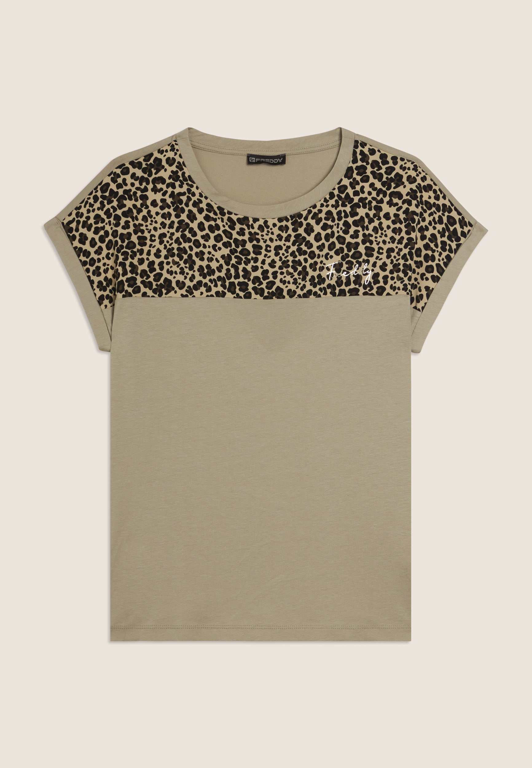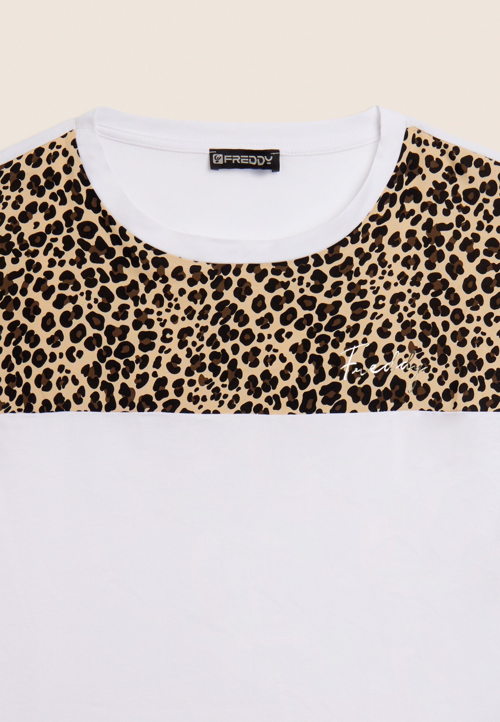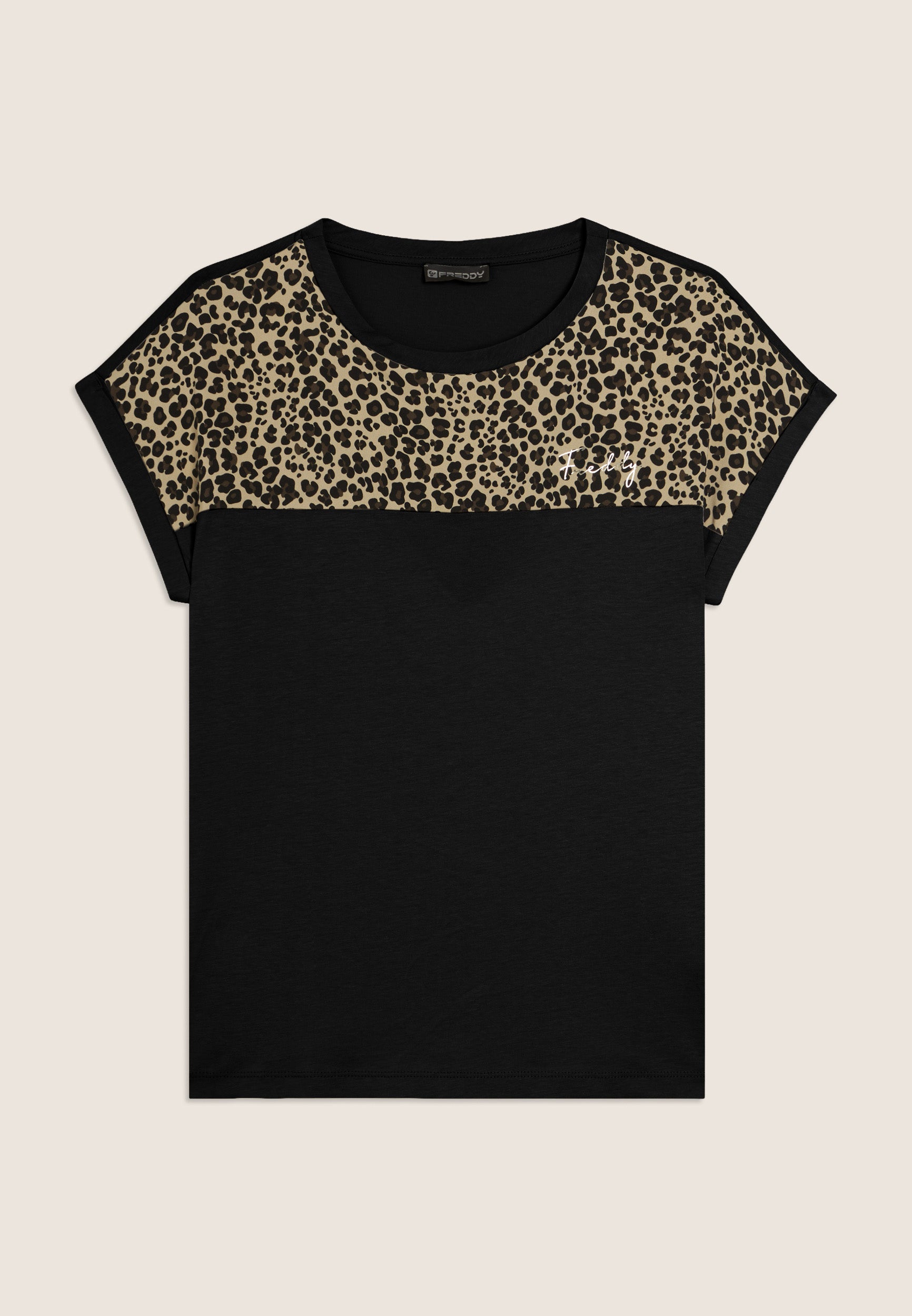 T-shirt à la coupe et à la longueur classiques, un bas droit et des fentes latérales qui ajoutent une touche dynamique au vêtement. L’encolure bateau et les manches à ailettes avec revers créent une ligne douce et féminine. L’insert en viscose à motif animal sur les épaules apporte un détail exclusif et le petit logo Freddy clouté sur le cœur ajoute une touche de luminosité. Fabriqué en jersey de coton et de modal, une combinaison parfaite de douceur, de respirabilité et de confort. La texture est lisse et légère, idéale pour un look décontracté et raffiné.