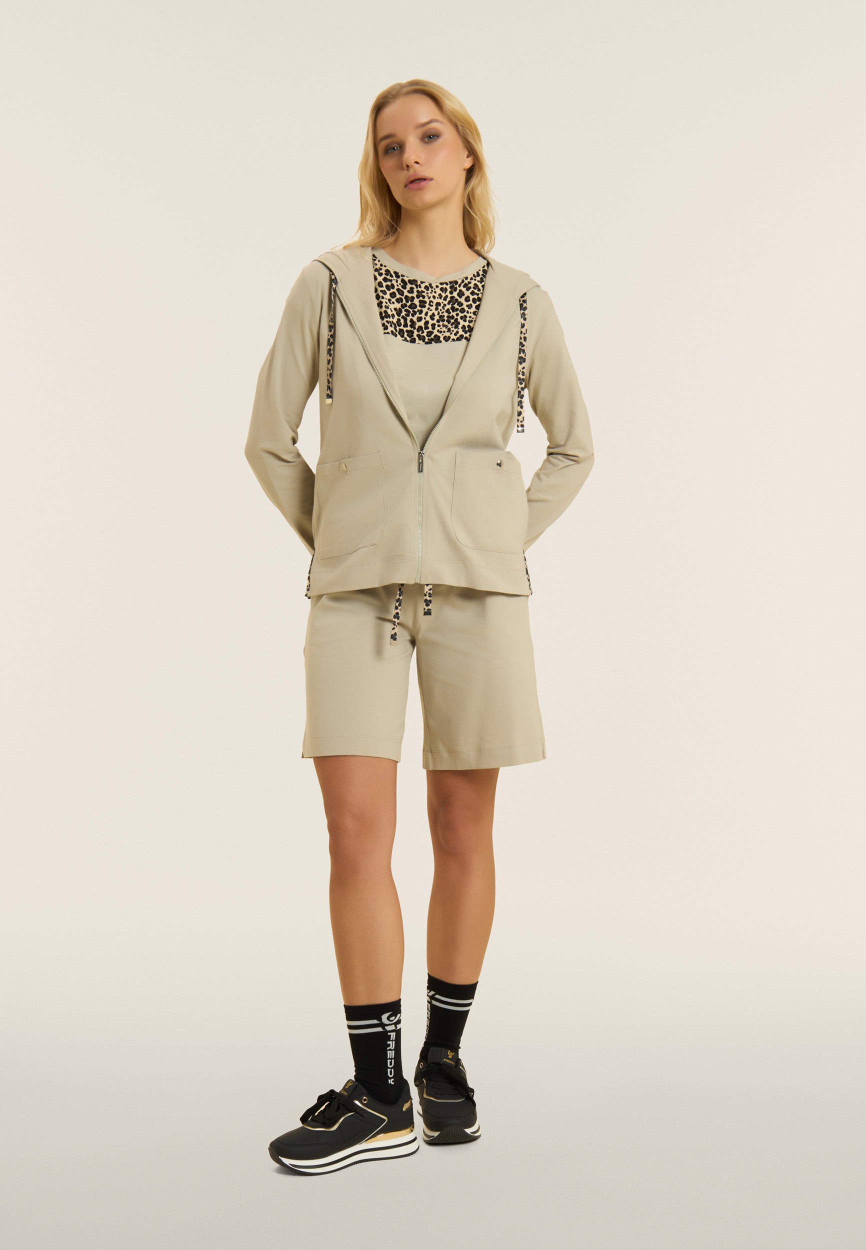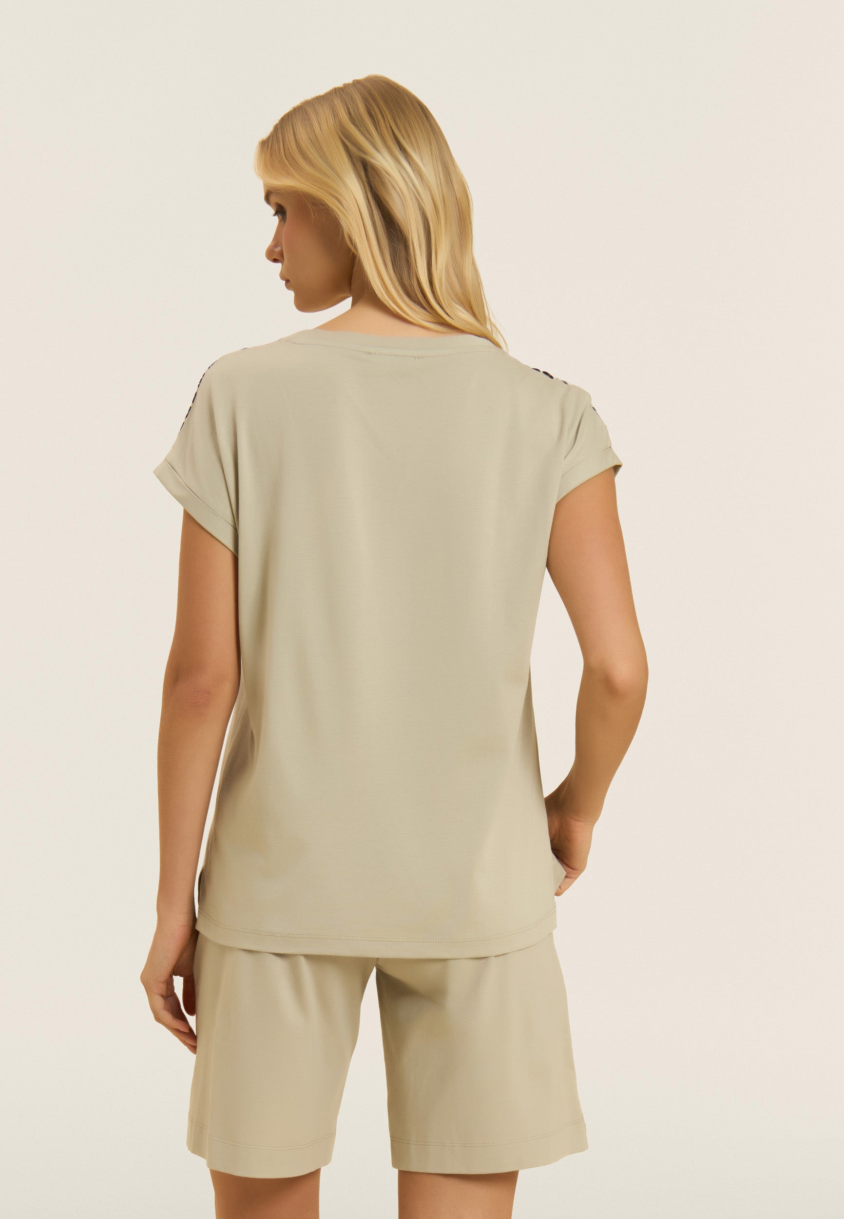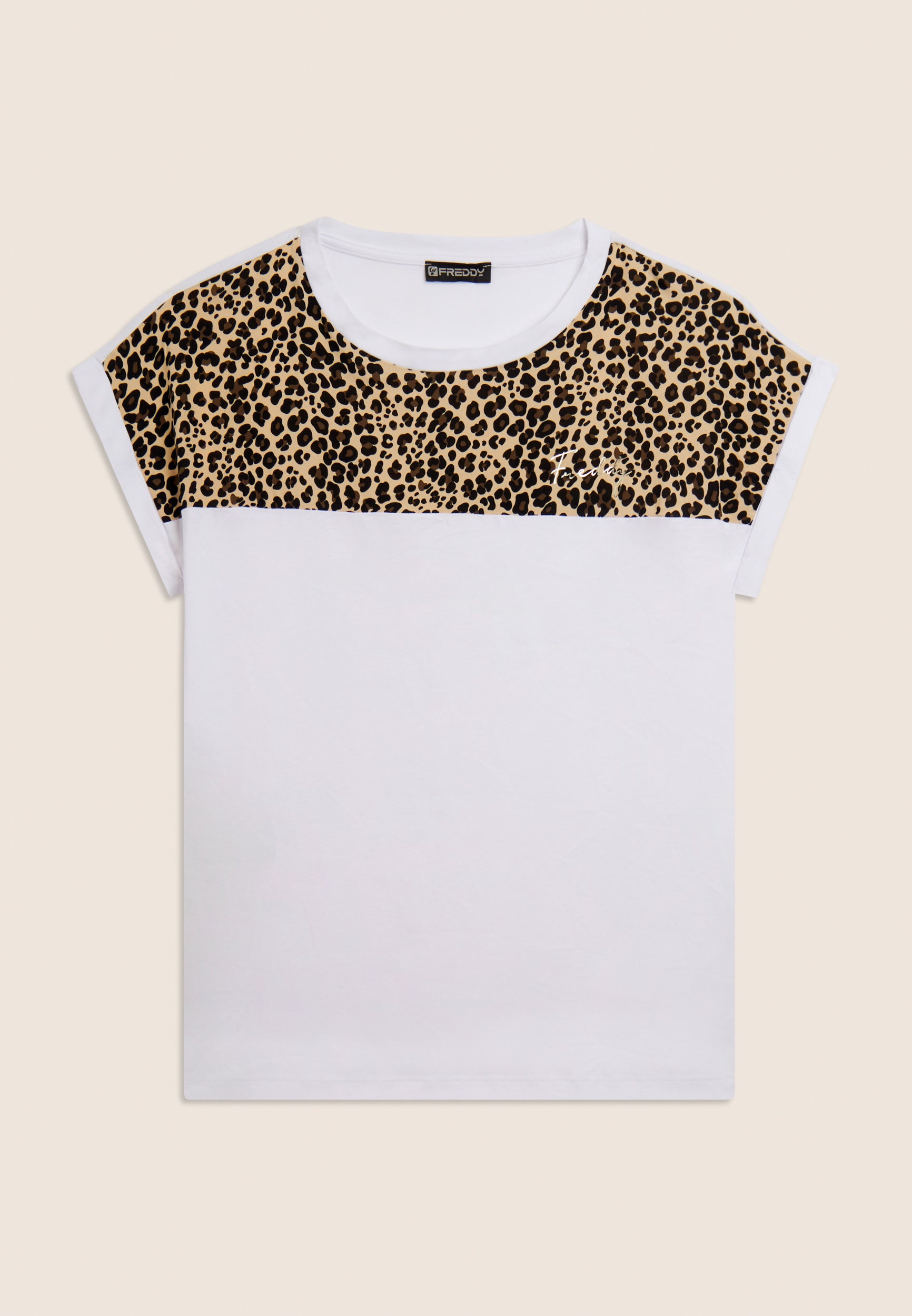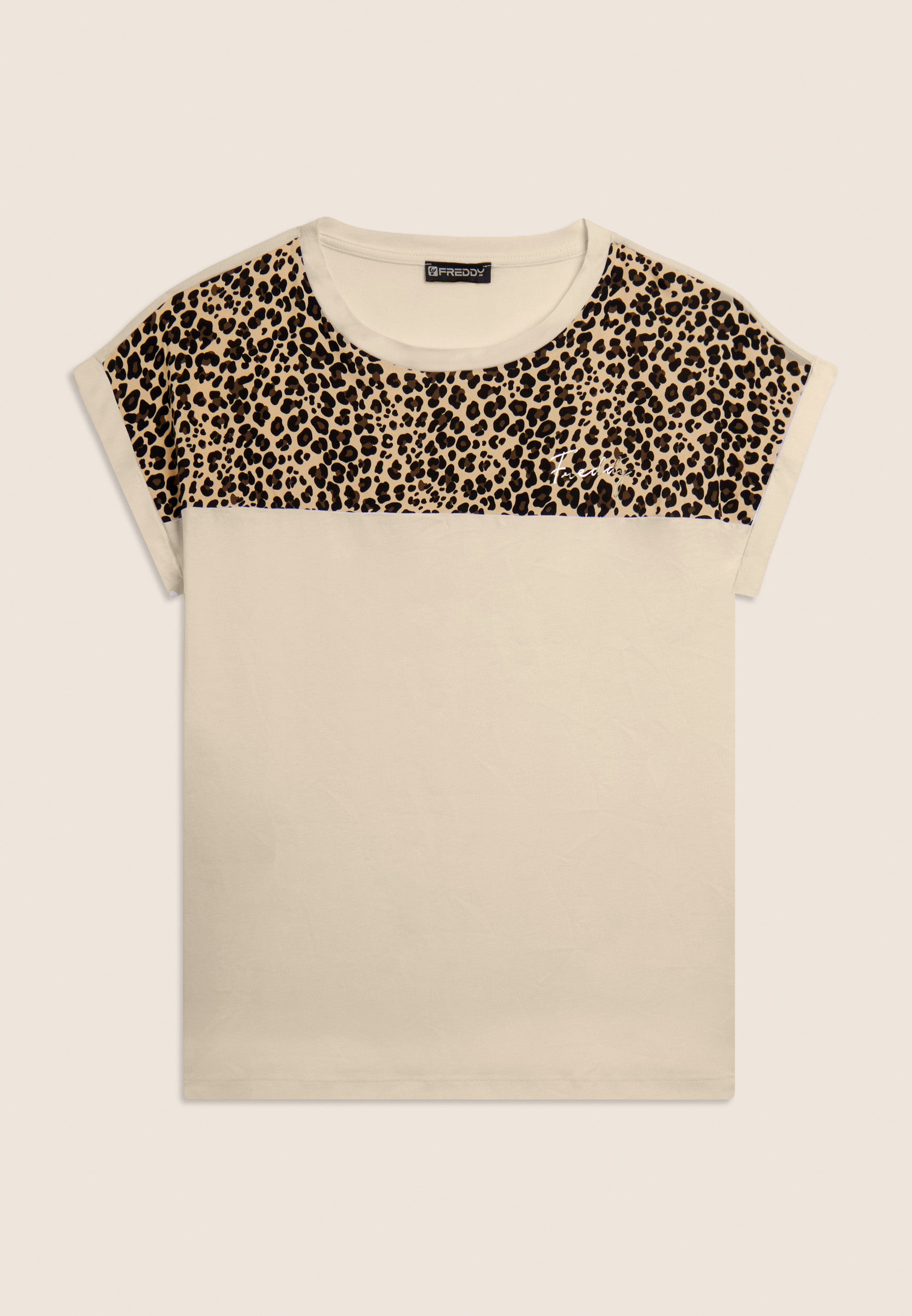 T-shirt à la coupe et à la longueur classiques, un bas droit et des fentes latérales qui ajoutent une touche dynamique au vêtement. L’encolure bateau et les manches à ailettes avec revers créent une ligne douce et féminine. L’insert en viscose à motif animal sur les épaules apporte un détail exclusif et le petit logo Freddy clouté sur le cœur ajoute une touche de luminosité. Fabriqué en jersey de coton et de modal, une combinaison parfaite de douceur, de respirabilité et de confort. La texture est lisse et légère, idéale pour un look décontracté et raffiné.