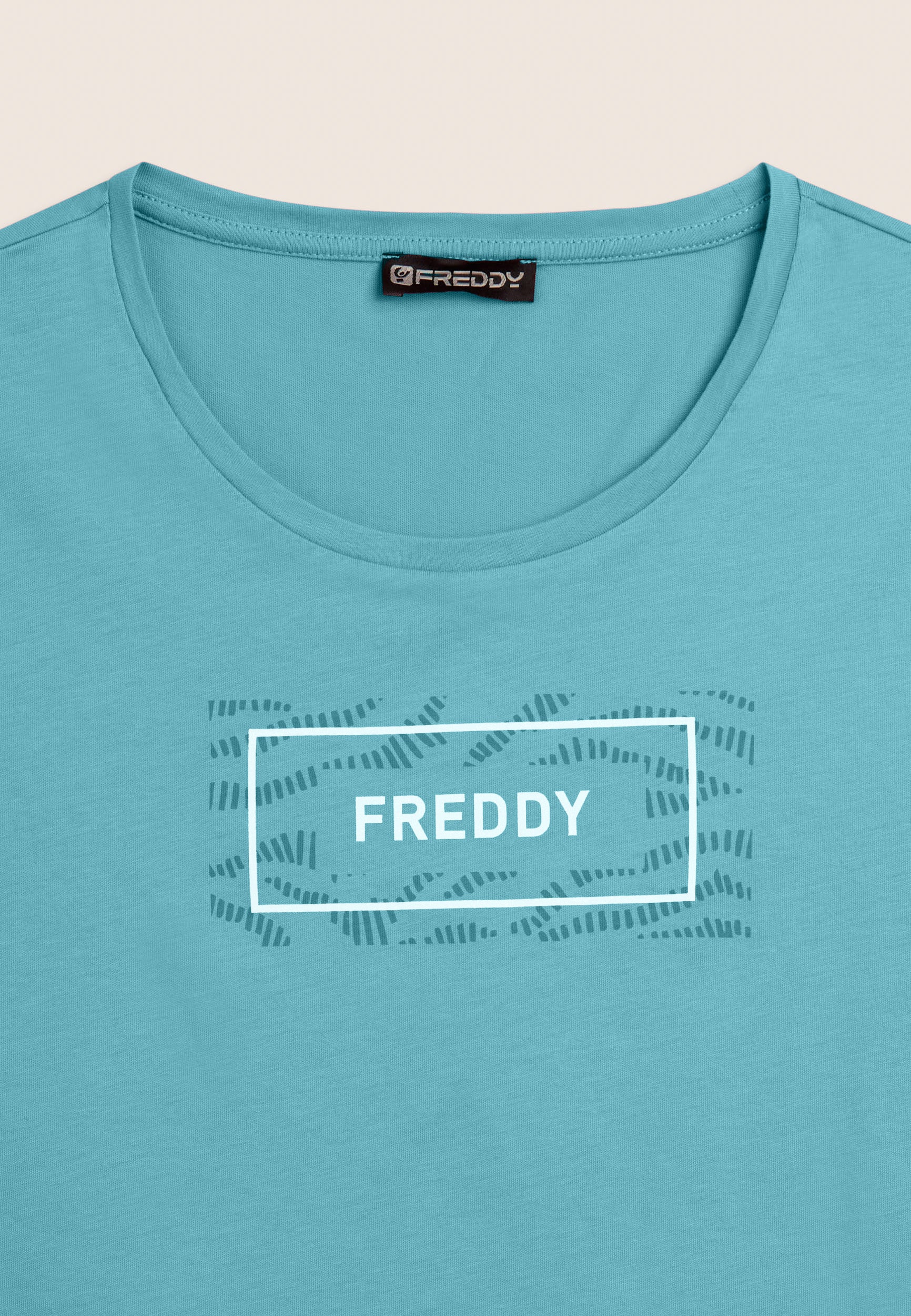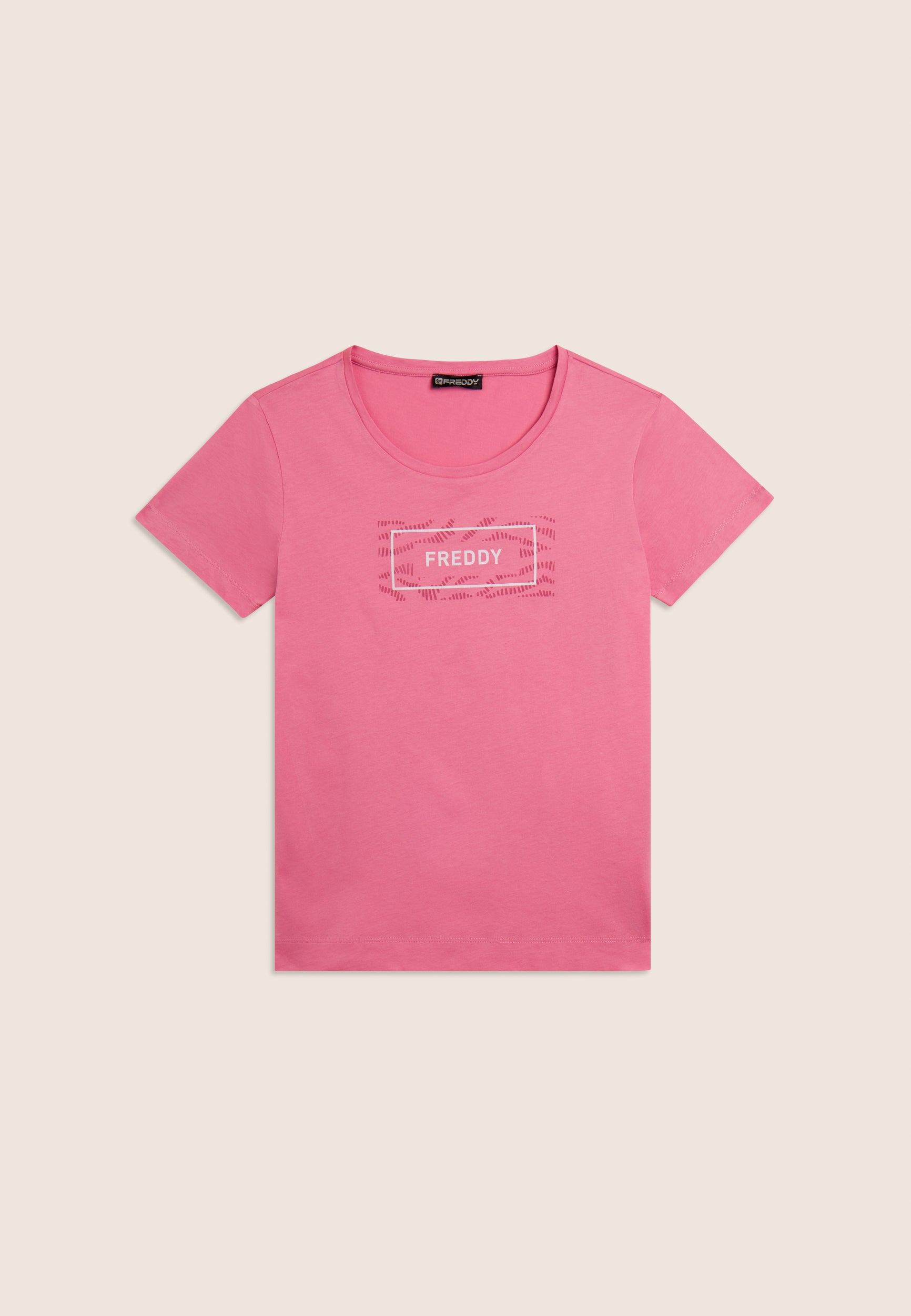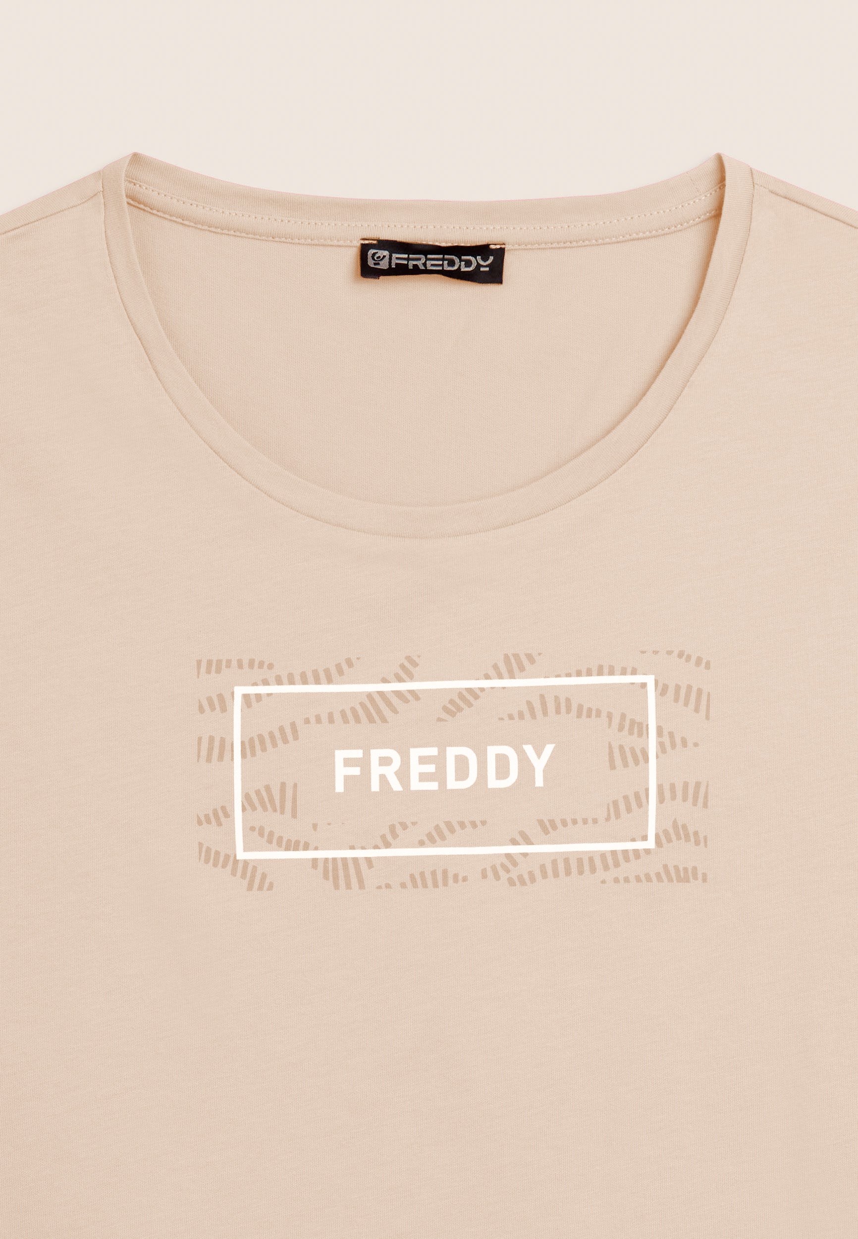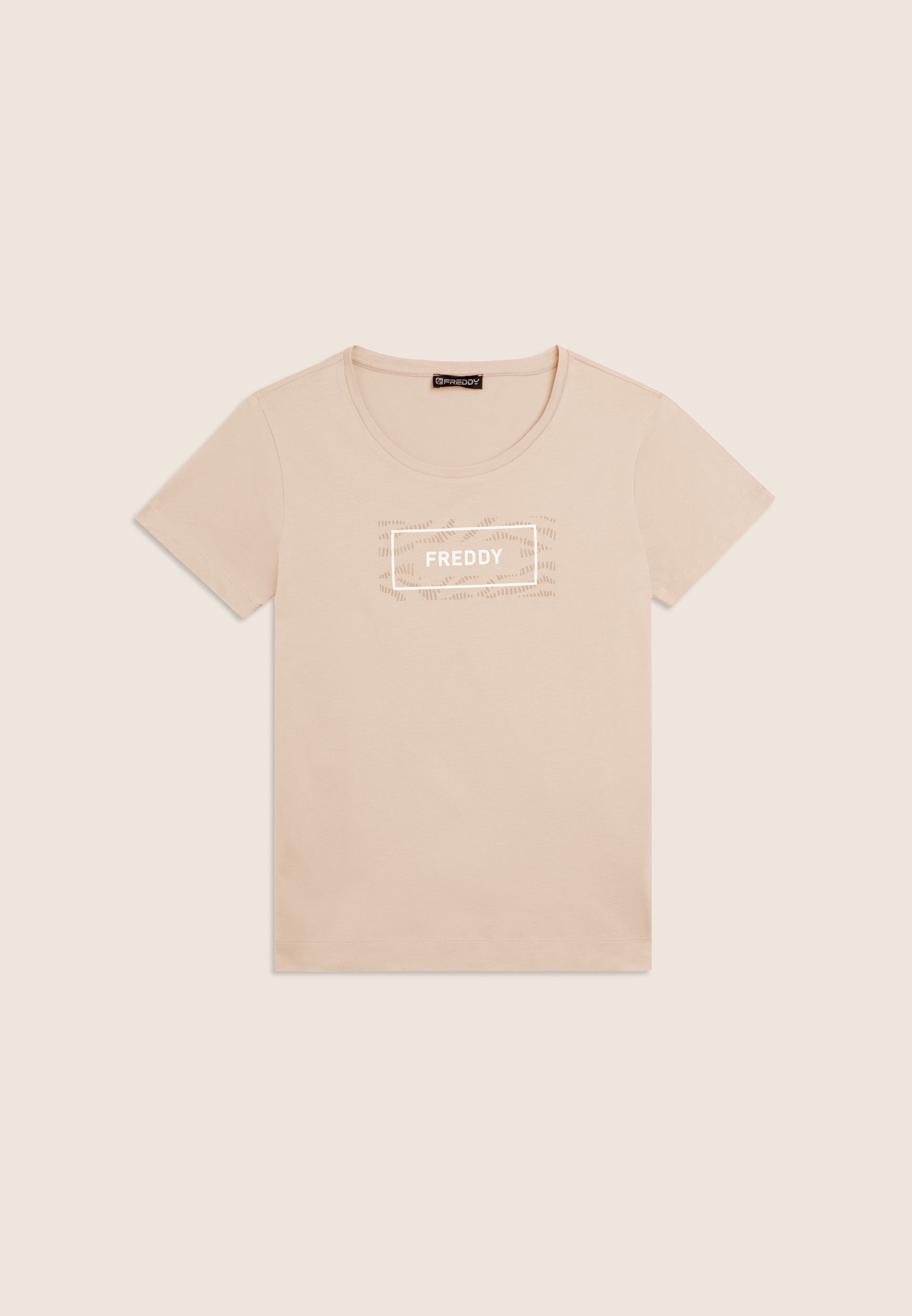 T-shirt a manica corta con fondo dritto e piccoli spacchi laterali, per un tocco moderno e comfort extra. Realizzata in jersey leggero 100% cotone, è arricchita dal logo FREDDY stampato sul fronte all’interno di un motivo grafico ondulato tono su tono. Un capo essenziale ma curato nei dettagli.