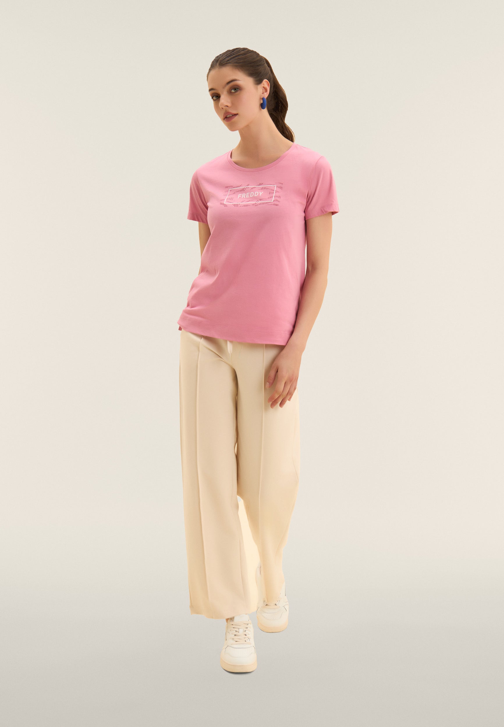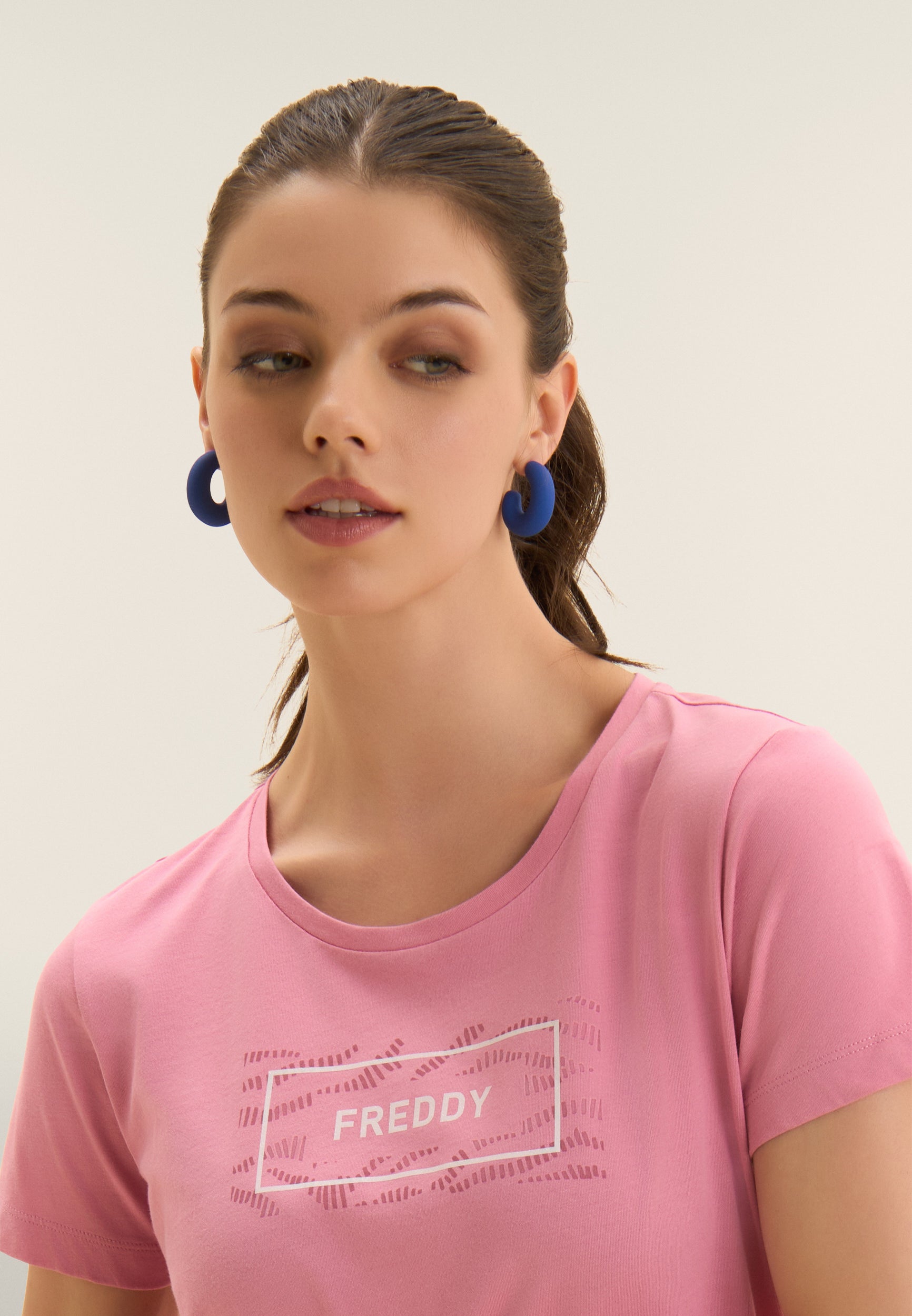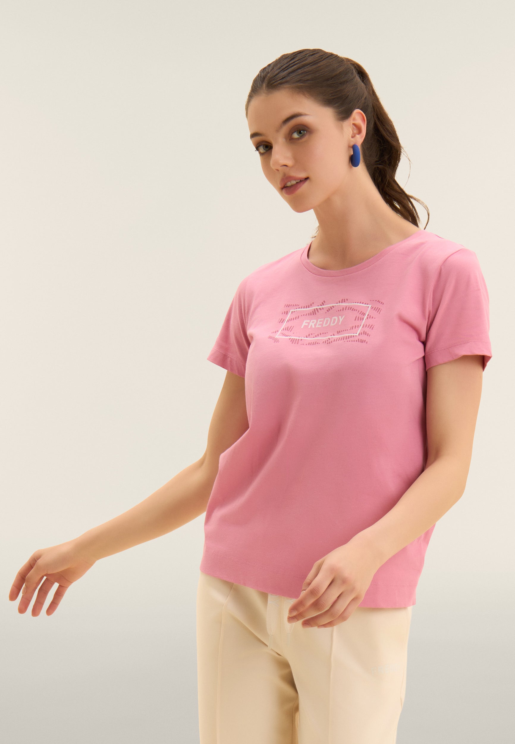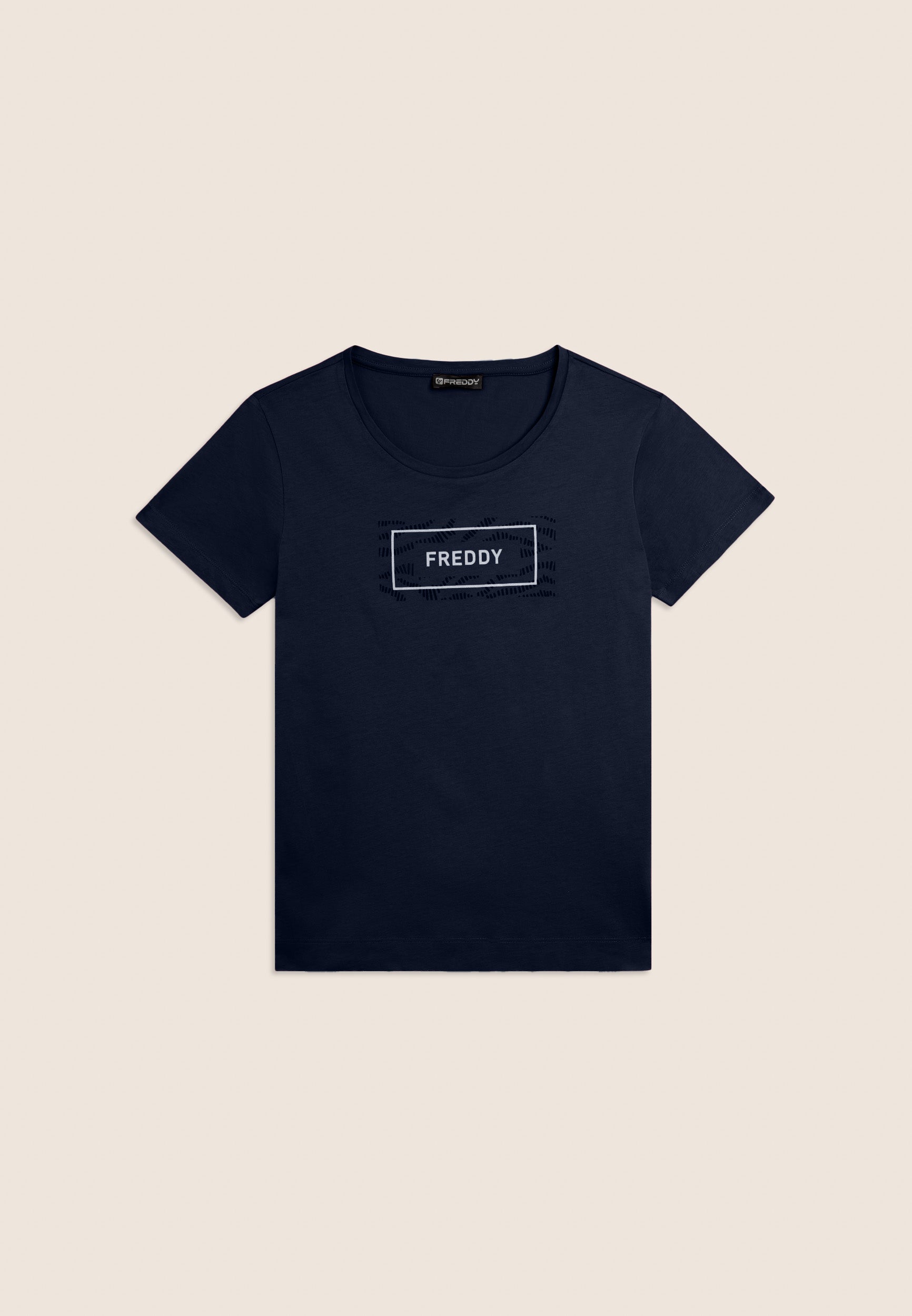 T-shirt a manica corta con fondo dritto e piccoli spacchi laterali, per un tocco moderno e comfort extra. Realizzata in jersey leggero 100% cotone, è arricchita dal logo FREDDY stampato sul fronte all’interno di un motivo grafico ondulato tono su tono. Un capo essenziale ma curato nei dettagli.