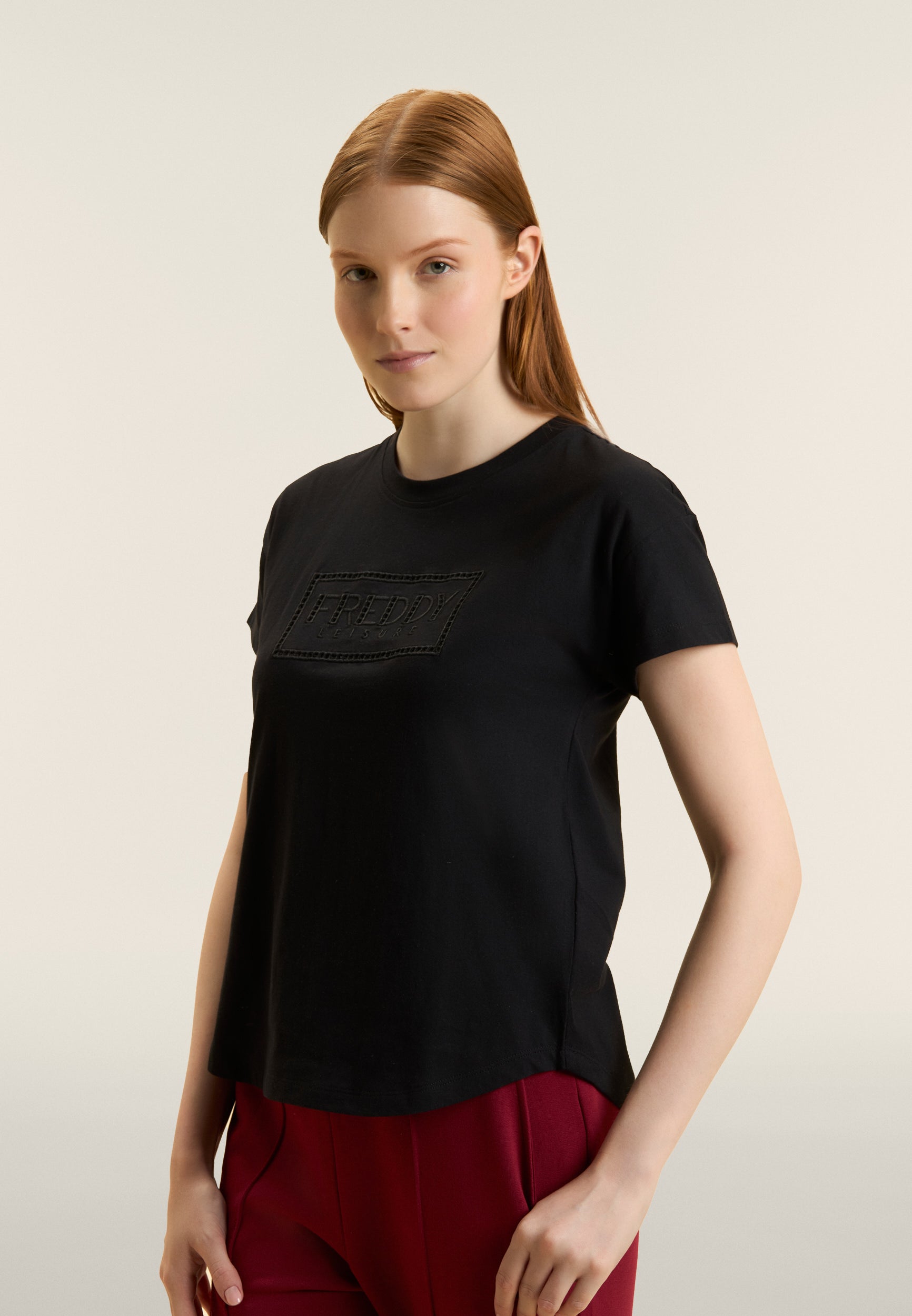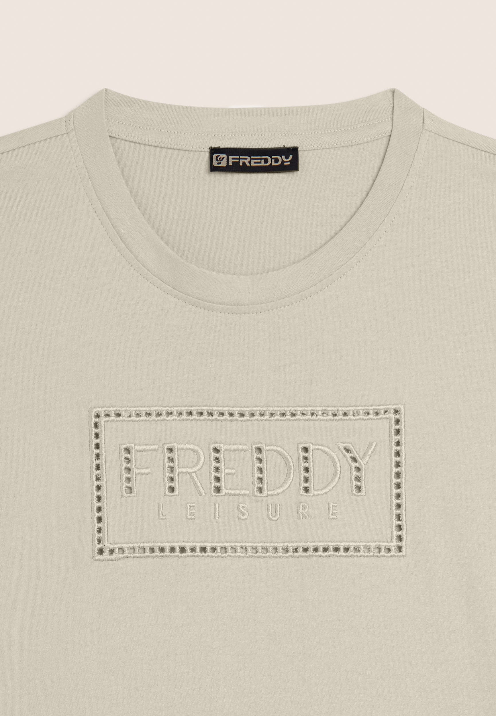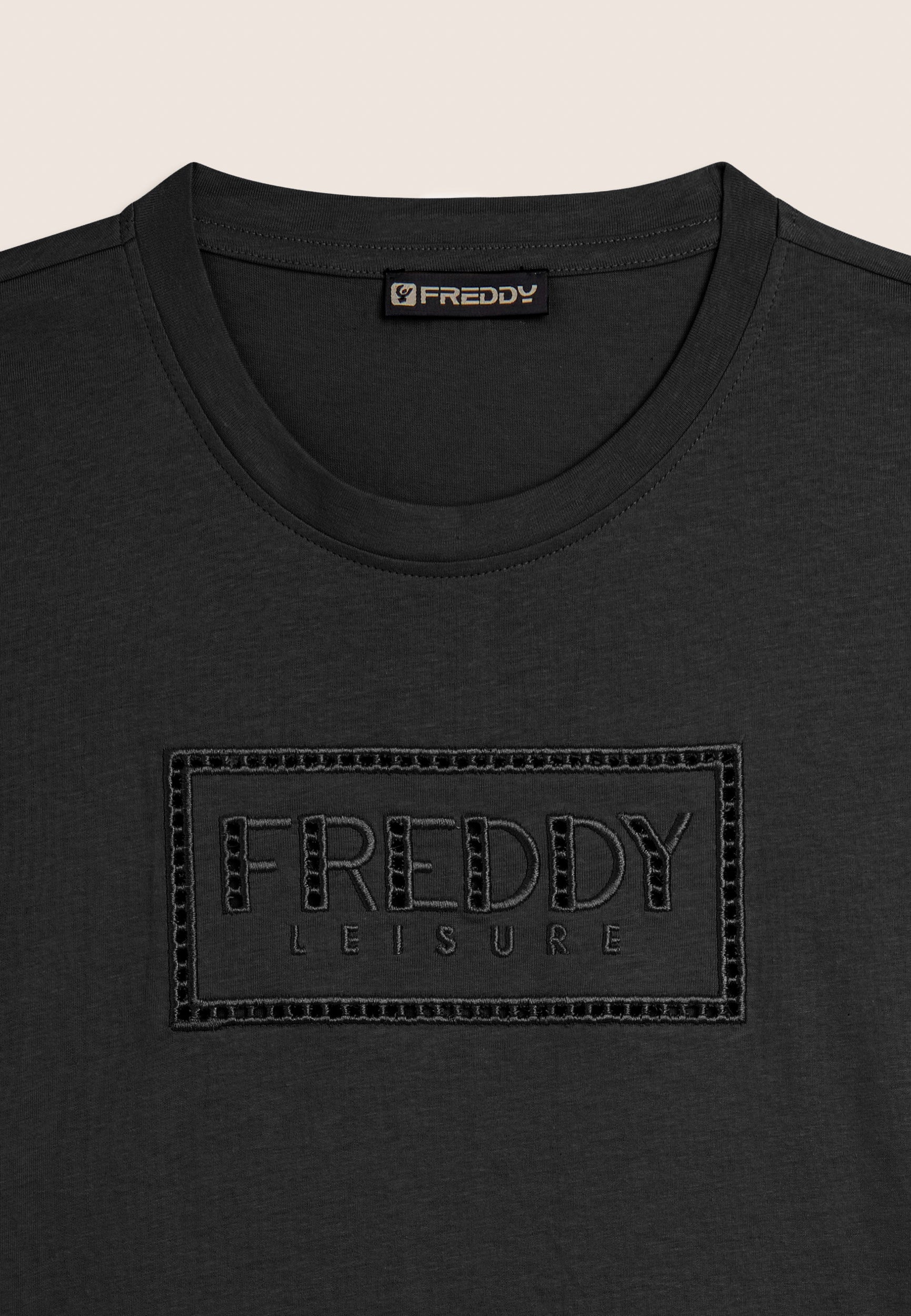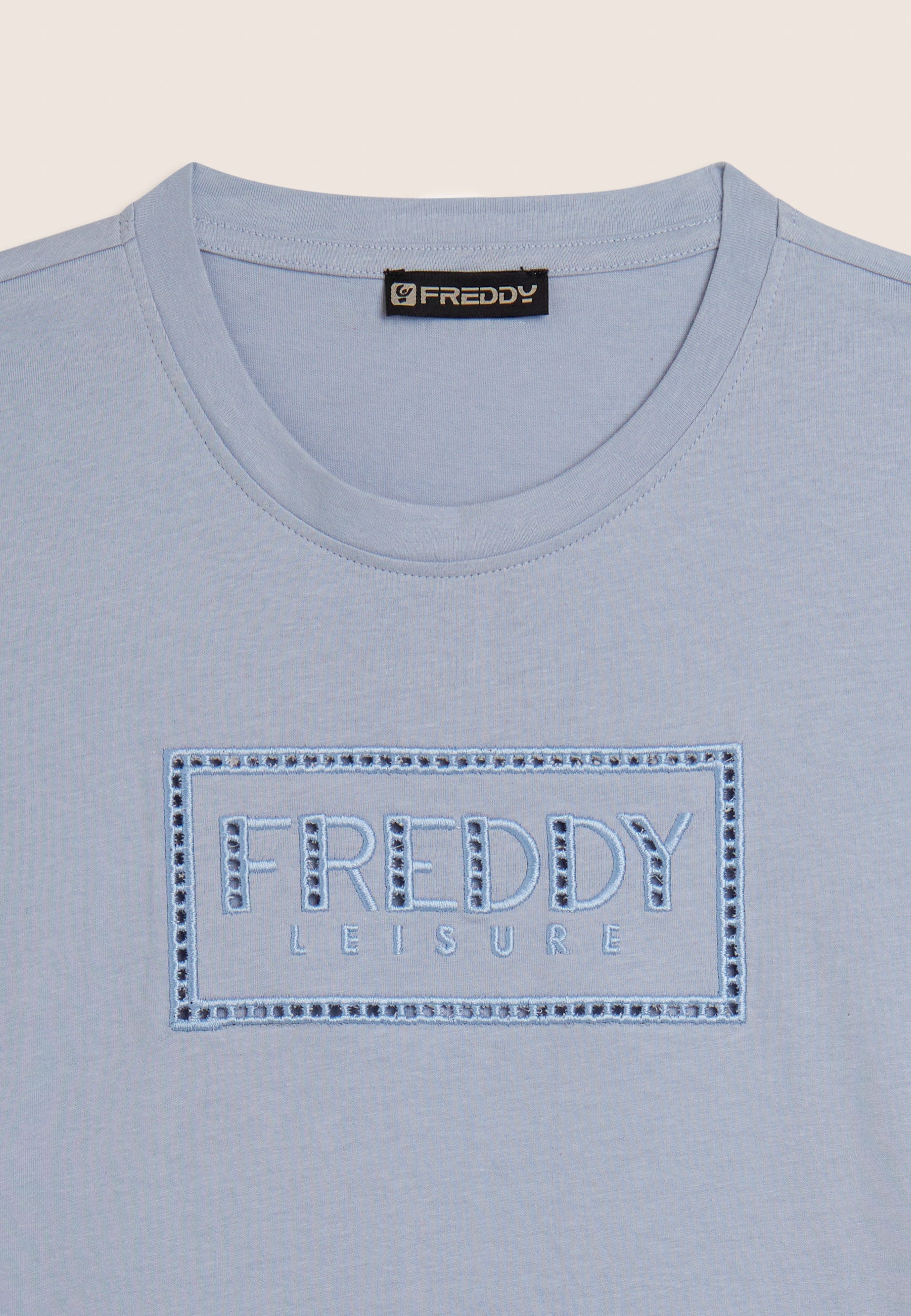 T-shirt dalla vestibilità comfort con lunghezza regular, fondo stondato più lungo sul retro. Presenta uno scollo girocollo e maniche ad aletta. Il logo FREDDY è ricamato sul fronte, dando un tocco distintivo al design. Realizzata in jersey di 100% cotone, questa t-shirt è comoda e traspirante, perfetta per uno stile casual e rilassato.
