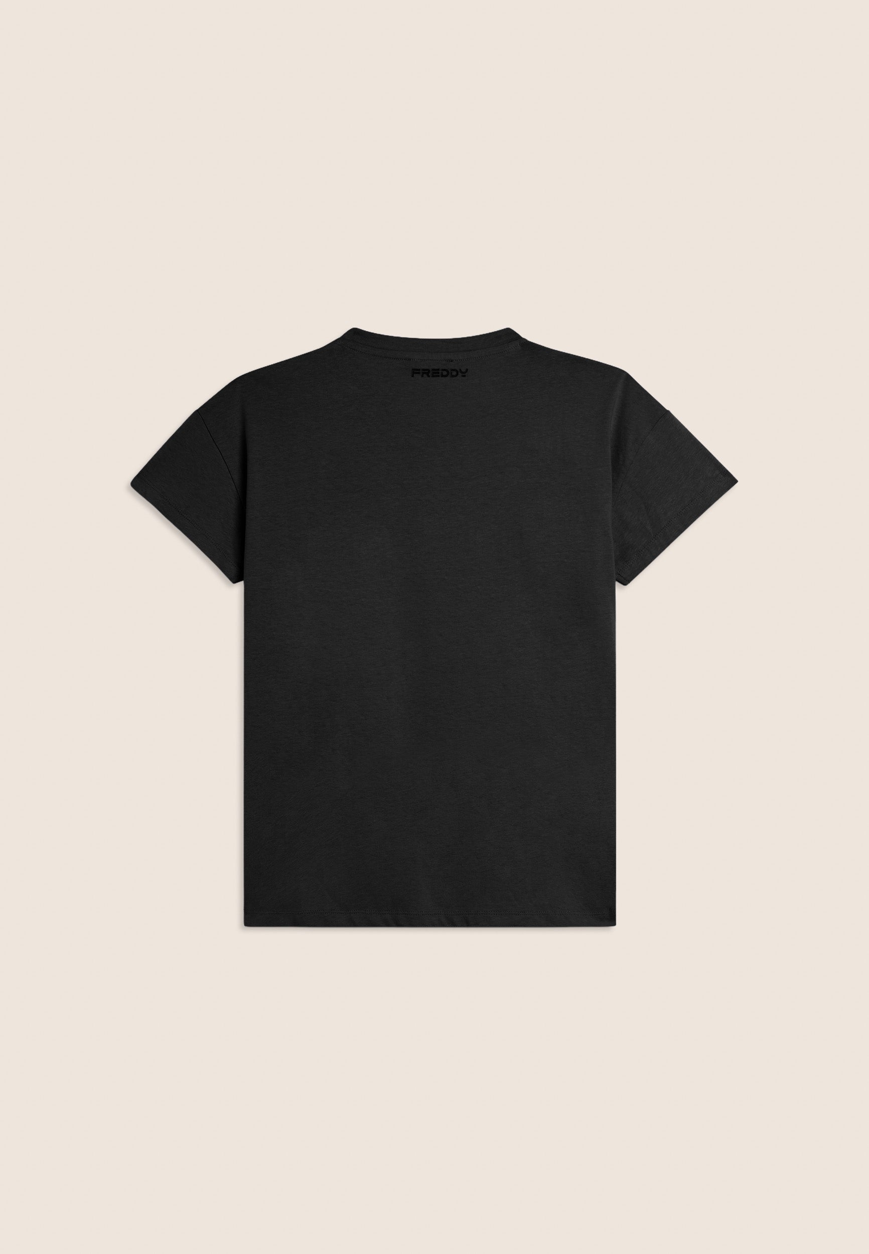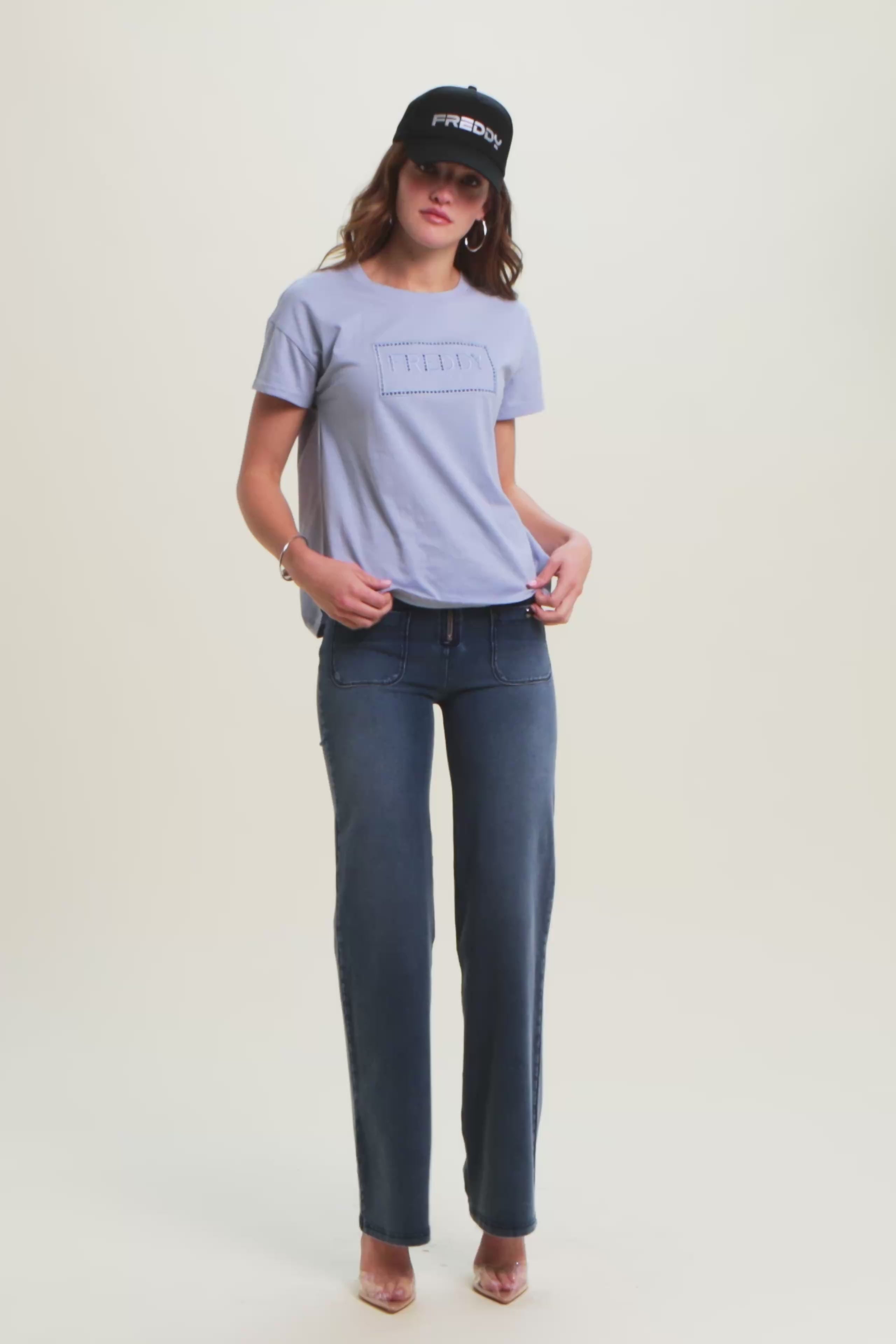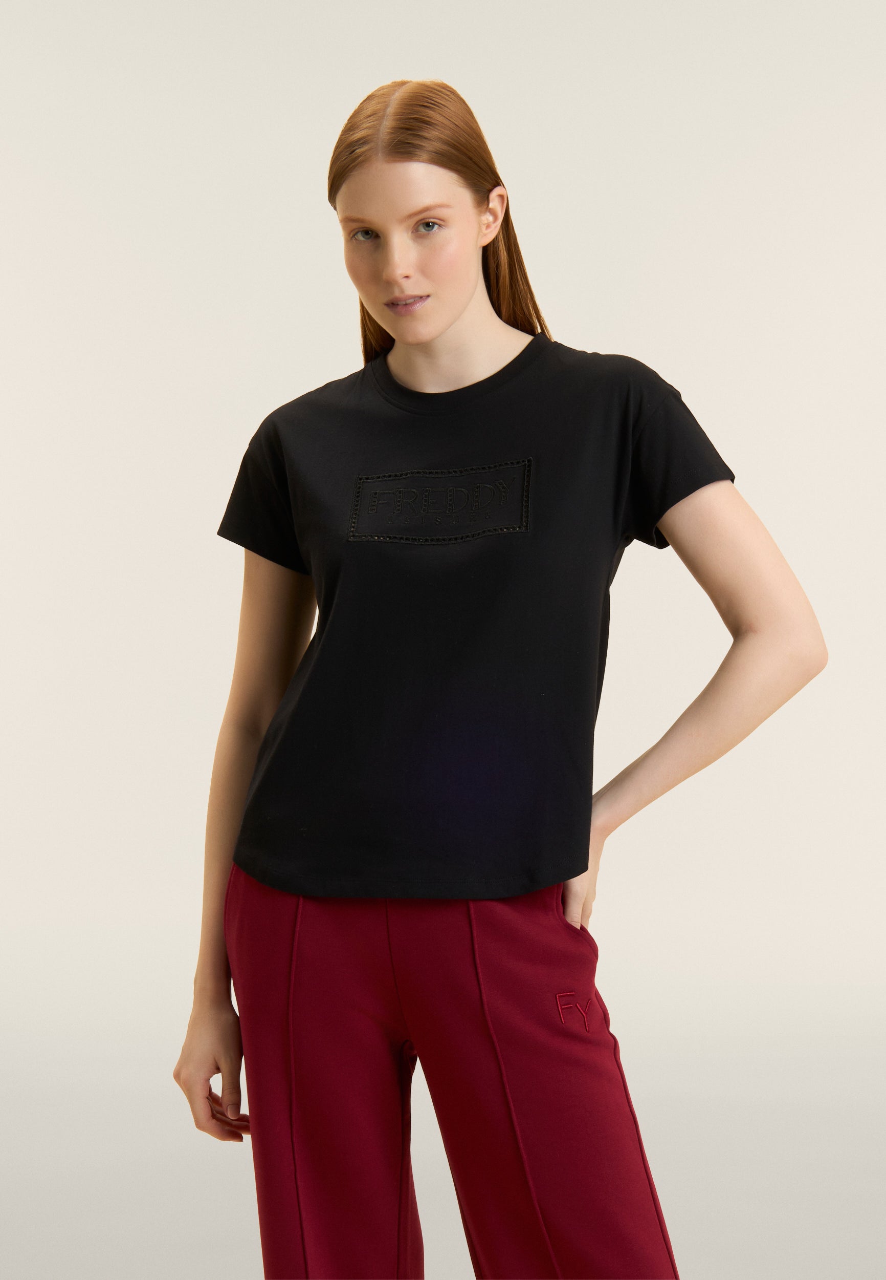 T-shirt dalla vestibilità comfort con lunghezza regular, fondo stondato più lungo sul retro. Presenta uno scollo girocollo e maniche ad aletta. Il logo FREDDY è ricamato sul fronte, dando un tocco distintivo al design. Realizzata in jersey di 100% cotone, questa t-shirt è comoda e traspirante, perfetta per uno stile casual e rilassato.