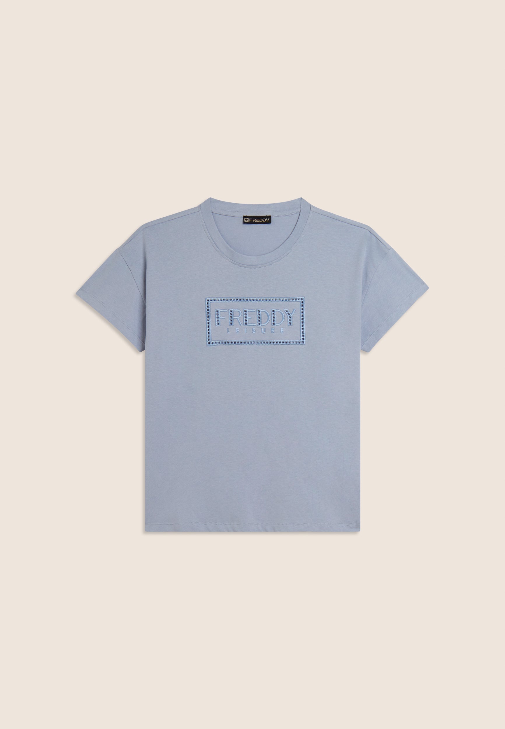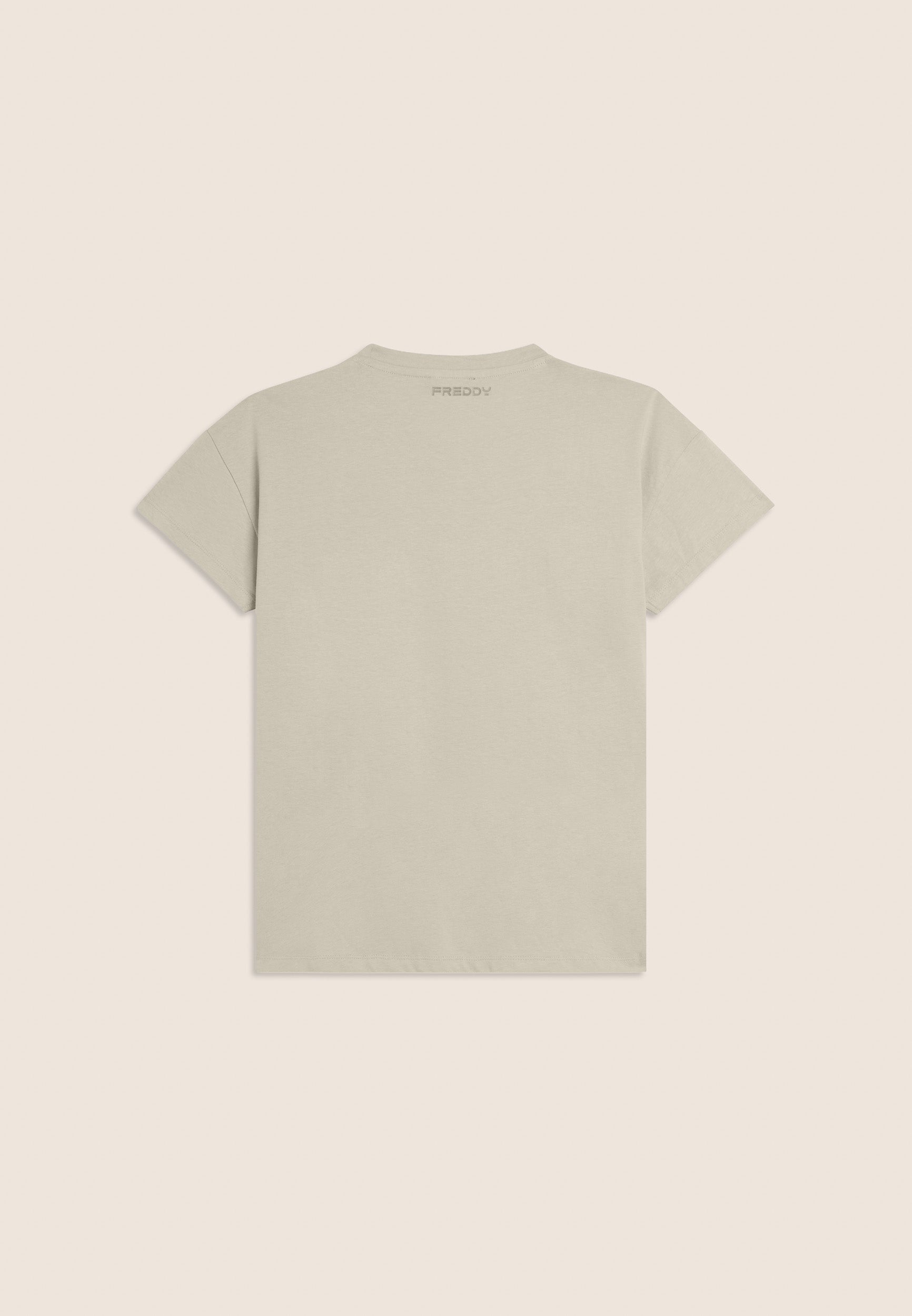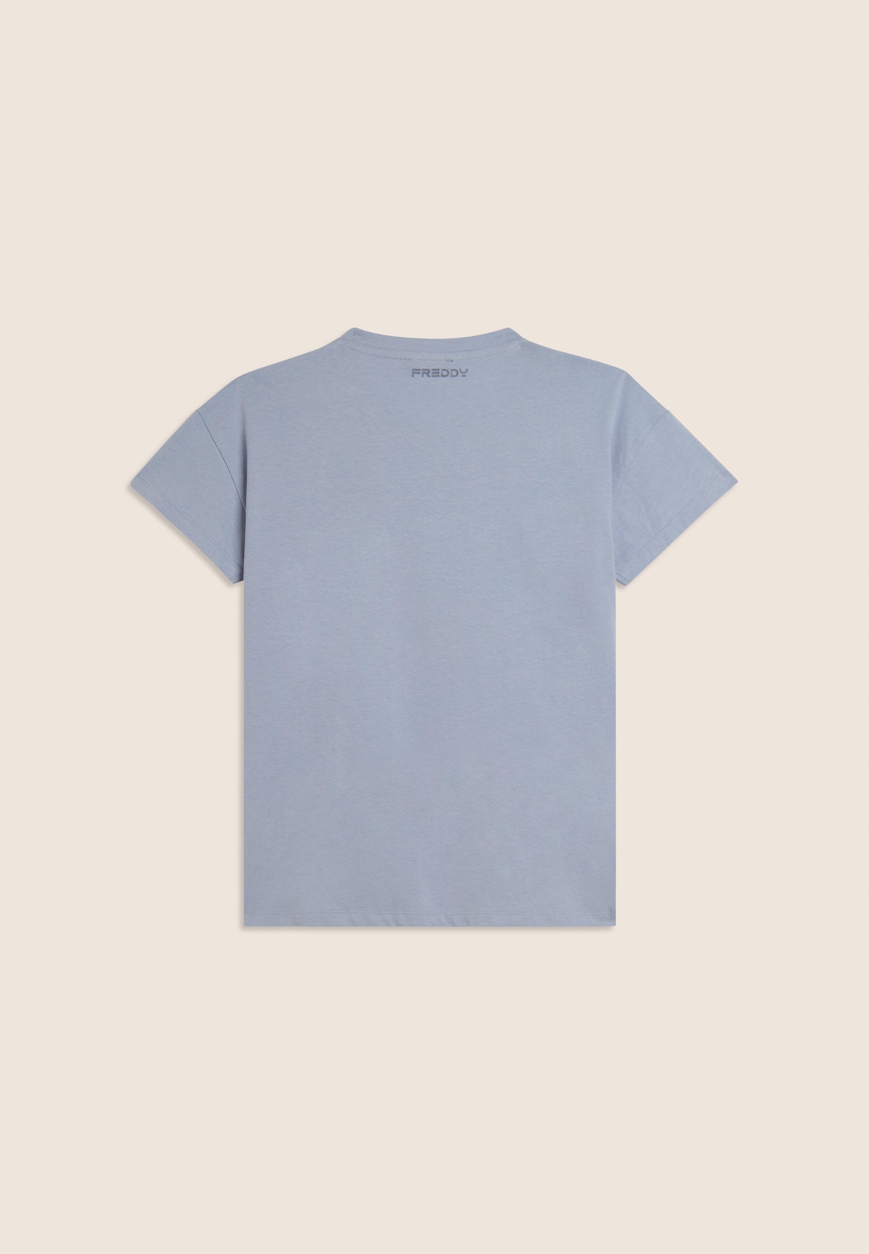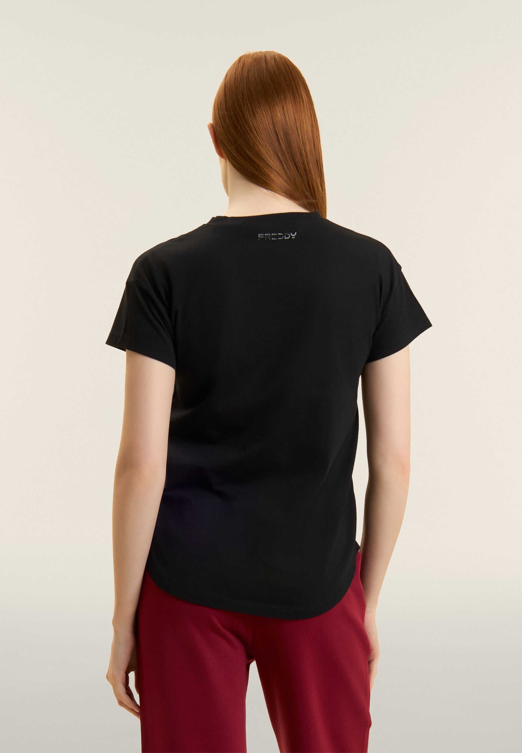 T-shirt dalla vestibilità comfort con lunghezza regular, fondo stondato più lungo sul retro. Presenta uno scollo girocollo e maniche ad aletta. Il logo FREDDY è ricamato sul fronte, dando un tocco distintivo al design. Realizzata in jersey di 100% cotone, questa t-shirt è comoda e traspirante, perfetta per uno stile casual e rilassato.