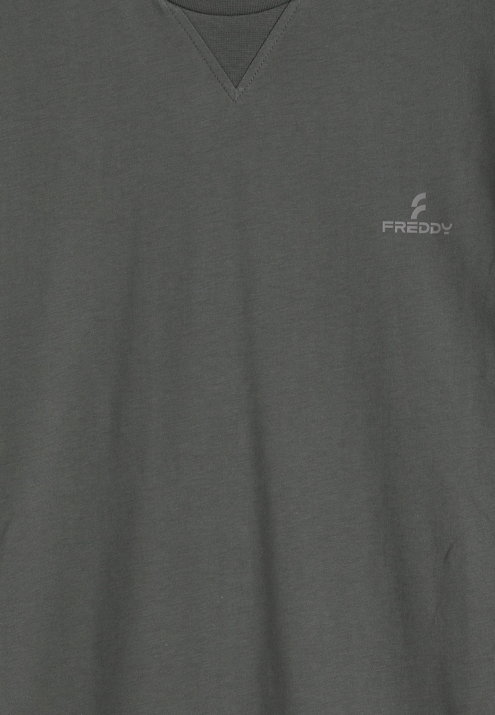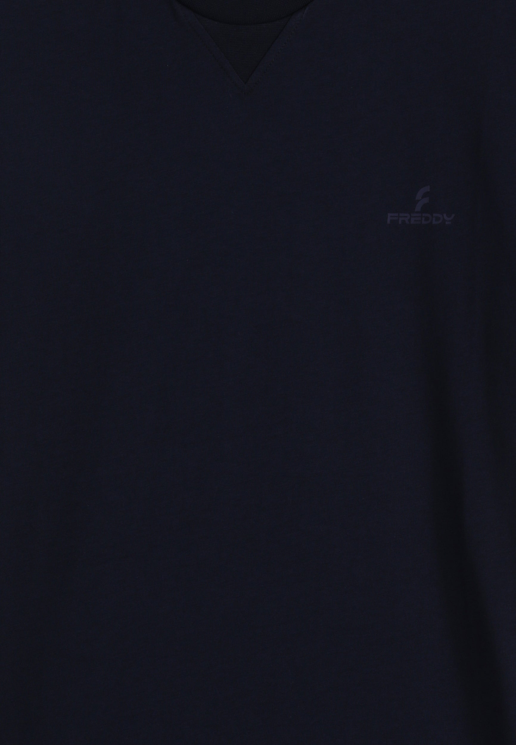 T-shirt à manches courtes en jersey 100 % coton, coupe classique et col rond rehaussé d’une pièce décorative en V. Manches courtes confortables et petit logo FREDDY imprimé sur le cœur, pour un look minimal et éclectique.