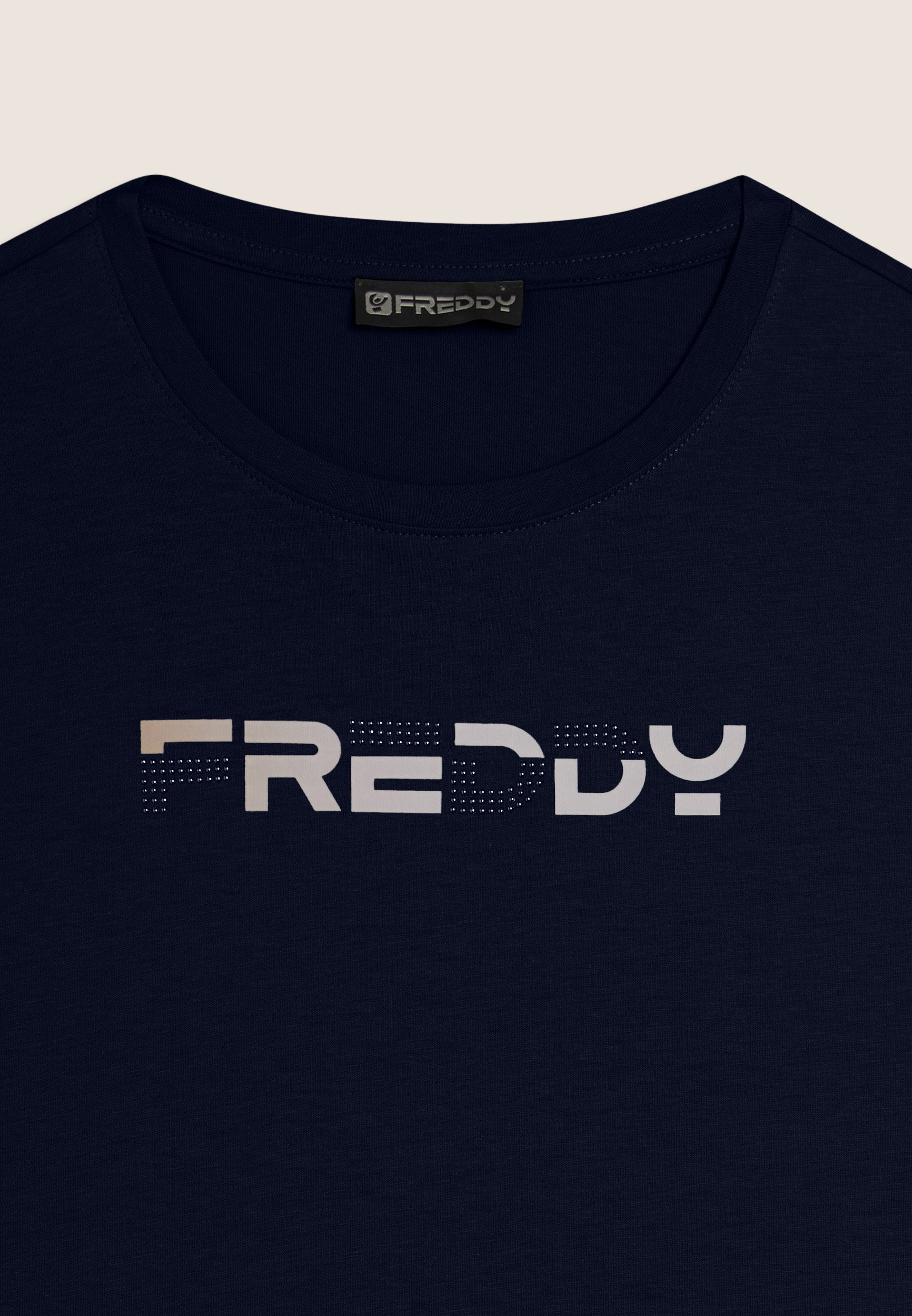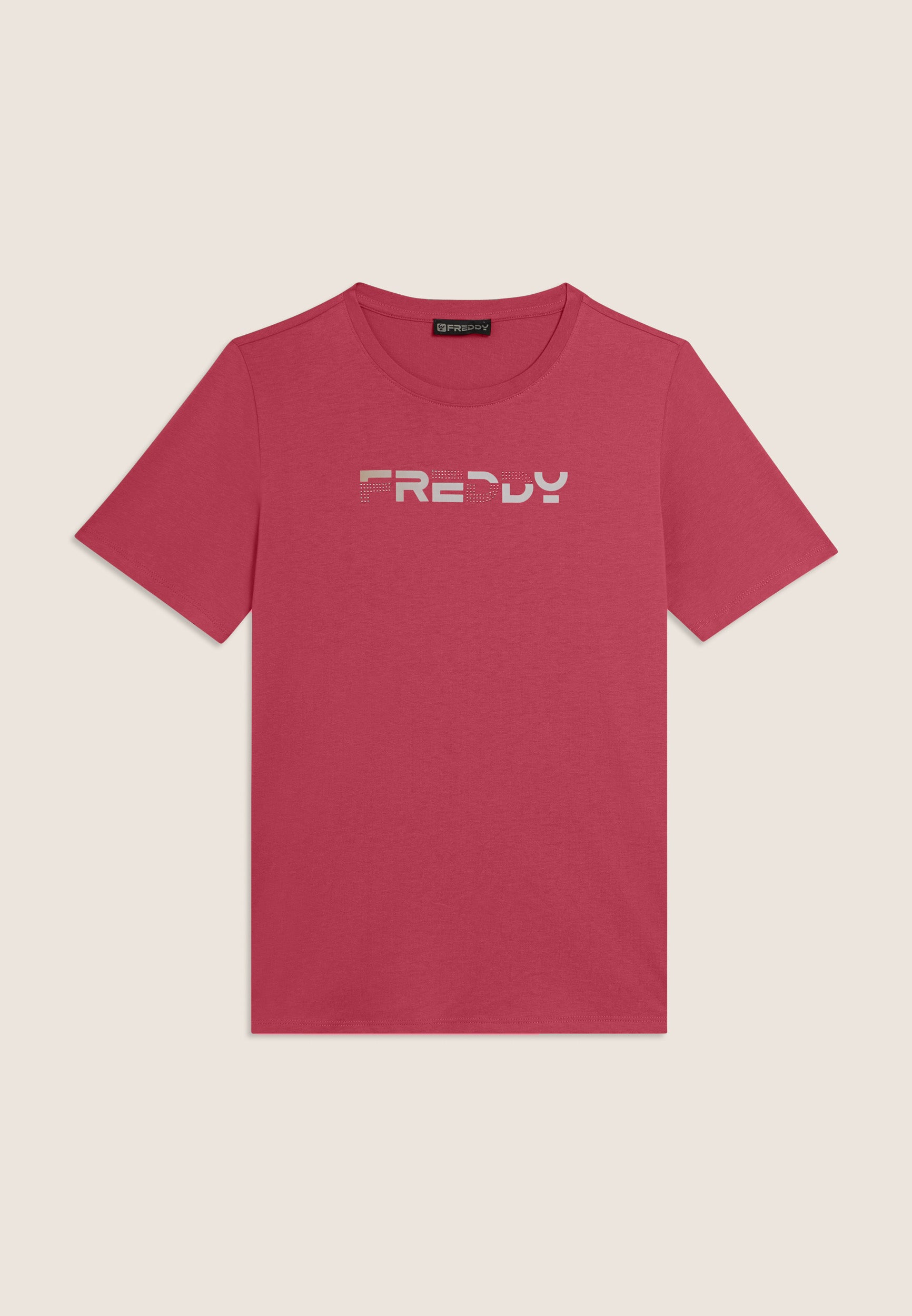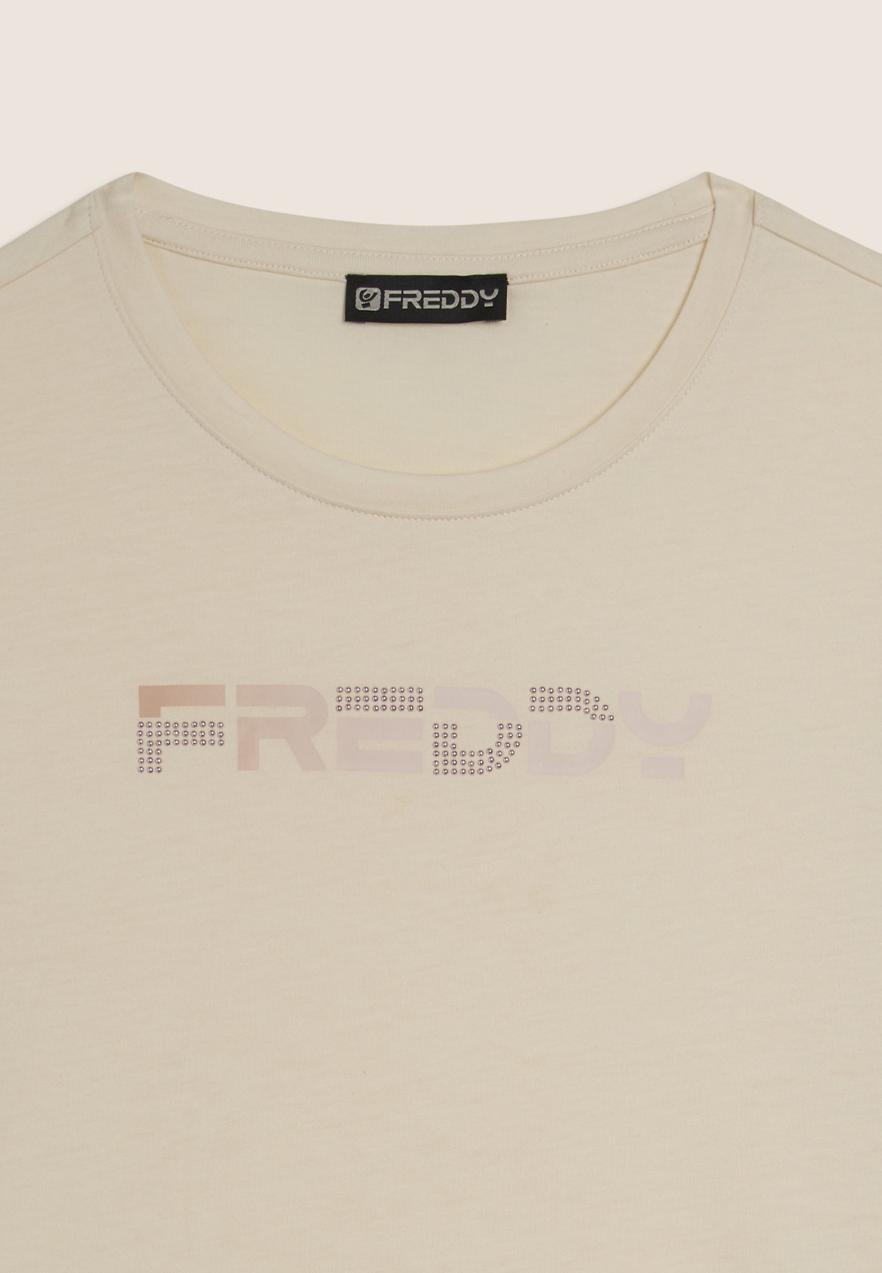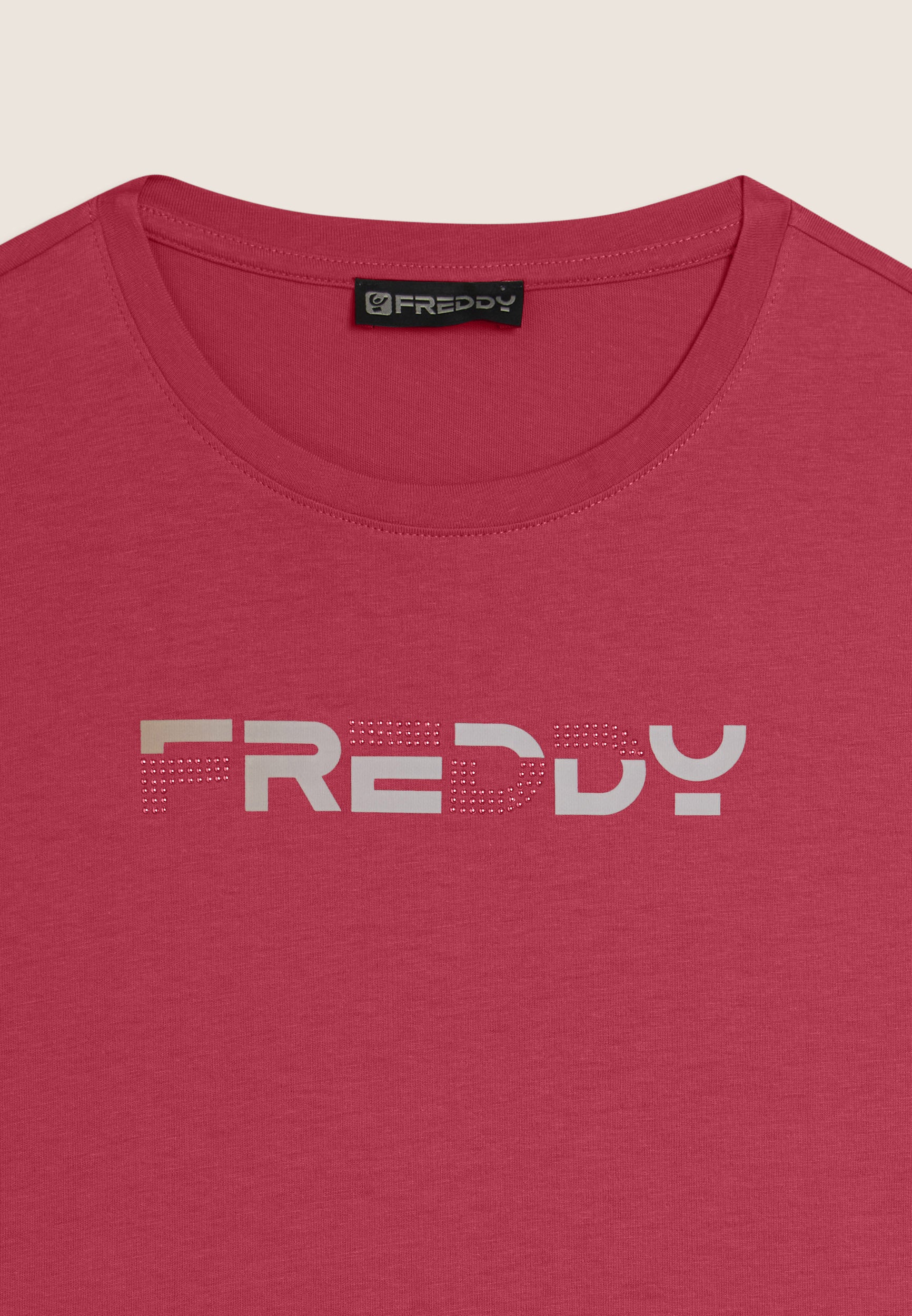 T-shirt a manica corta dal comfort eccezionale, con scollo girocollo e fondo dritto. Il logo FREDDY stampato in effetti olografici rosa chiaro sul fronte e decorato con perline dello stesso tono colore è un dettaglio che la rende unica. Il tessuto in jersey leggero di cotone e poliestere è morbido, traspirante e resistente, ideale per sport leggeri e attività quotidiane.