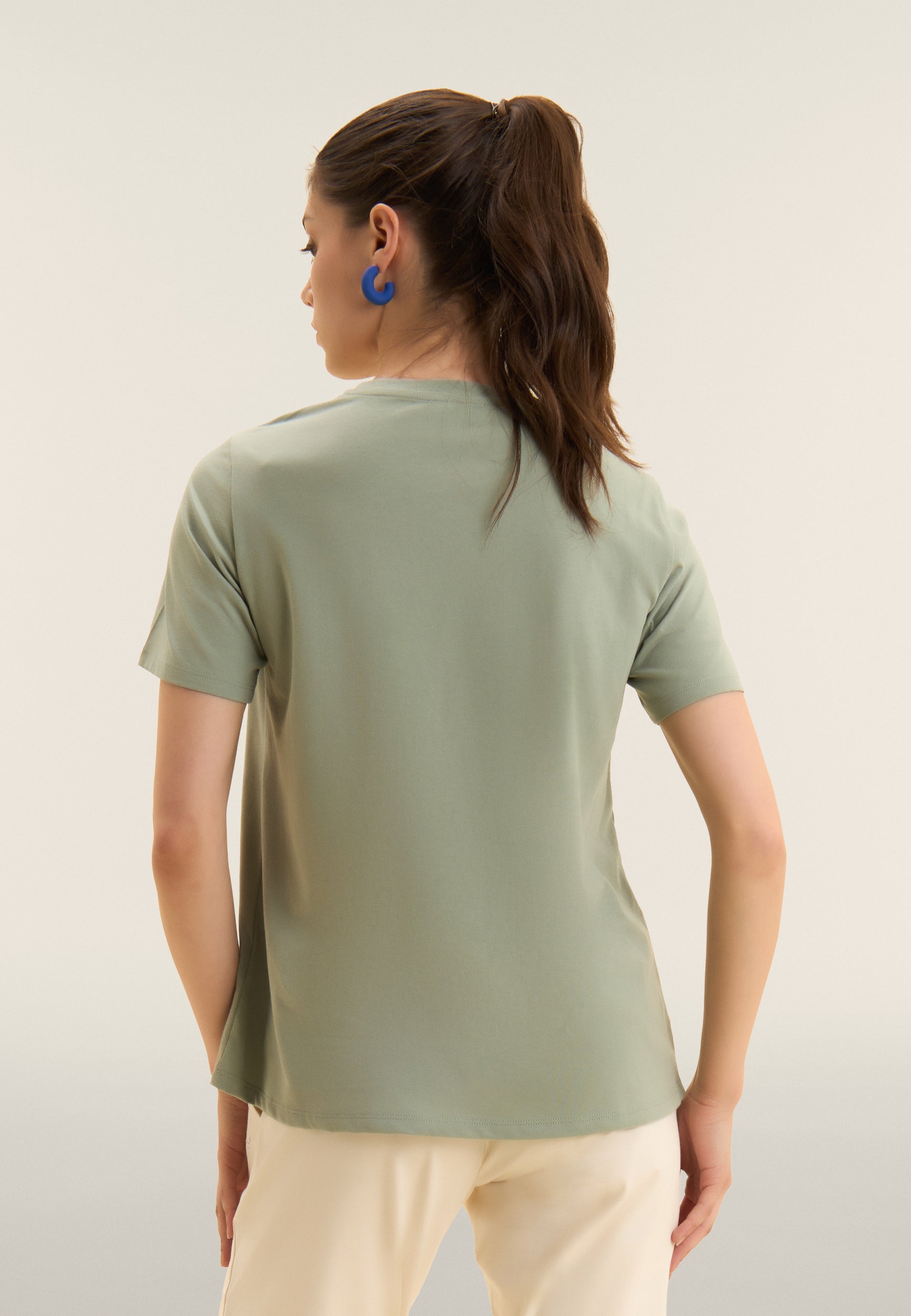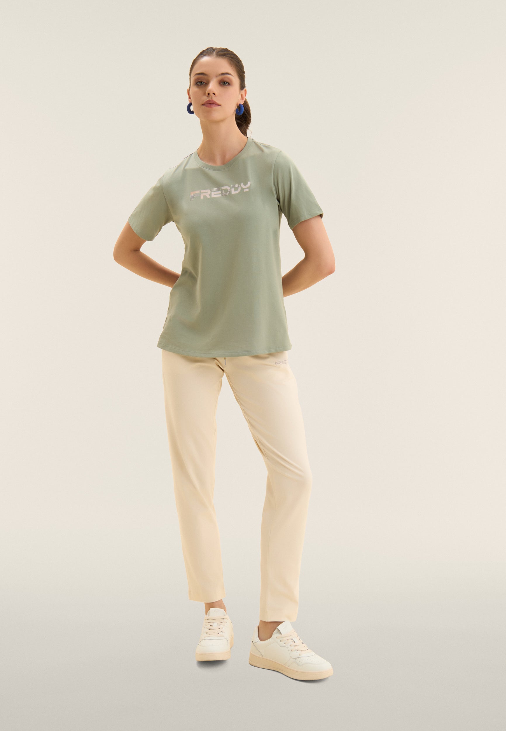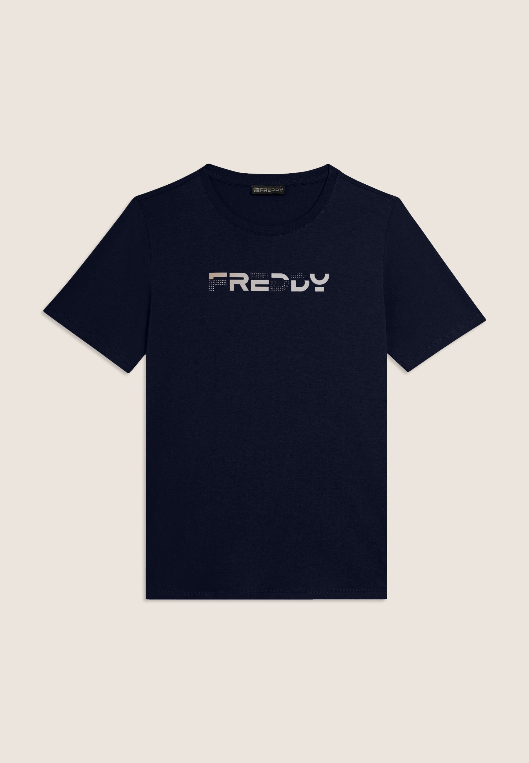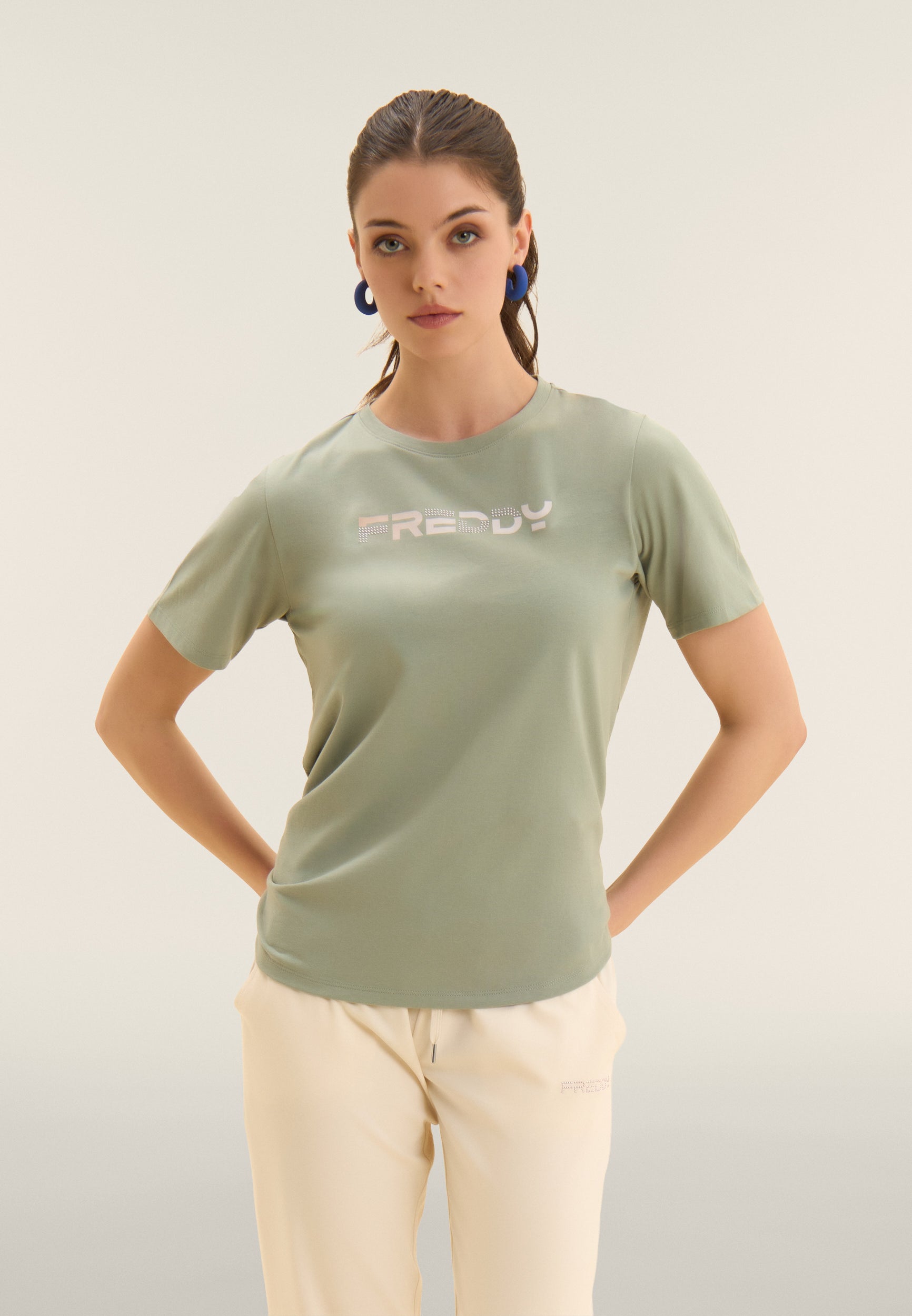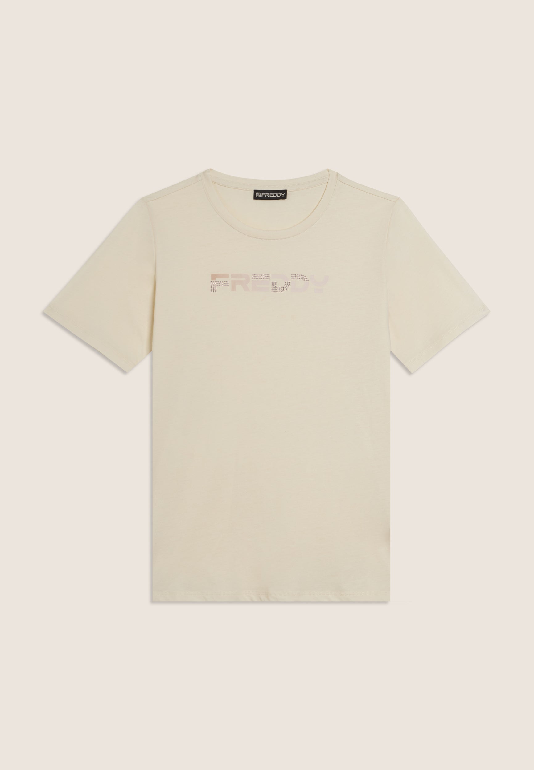 T-shirt a manica corta dal comfort eccezionale, con scollo girocollo e fondo dritto. Il logo FREDDY stampato in effetti olografici rosa chiaro sul fronte e decorato con perline dello stesso tono colore è un dettaglio che la rende unica. Il tessuto in jersey leggero di cotone e poliestere è morbido, traspirante e resistente, ideale per sport leggeri e attività quotidiane.
