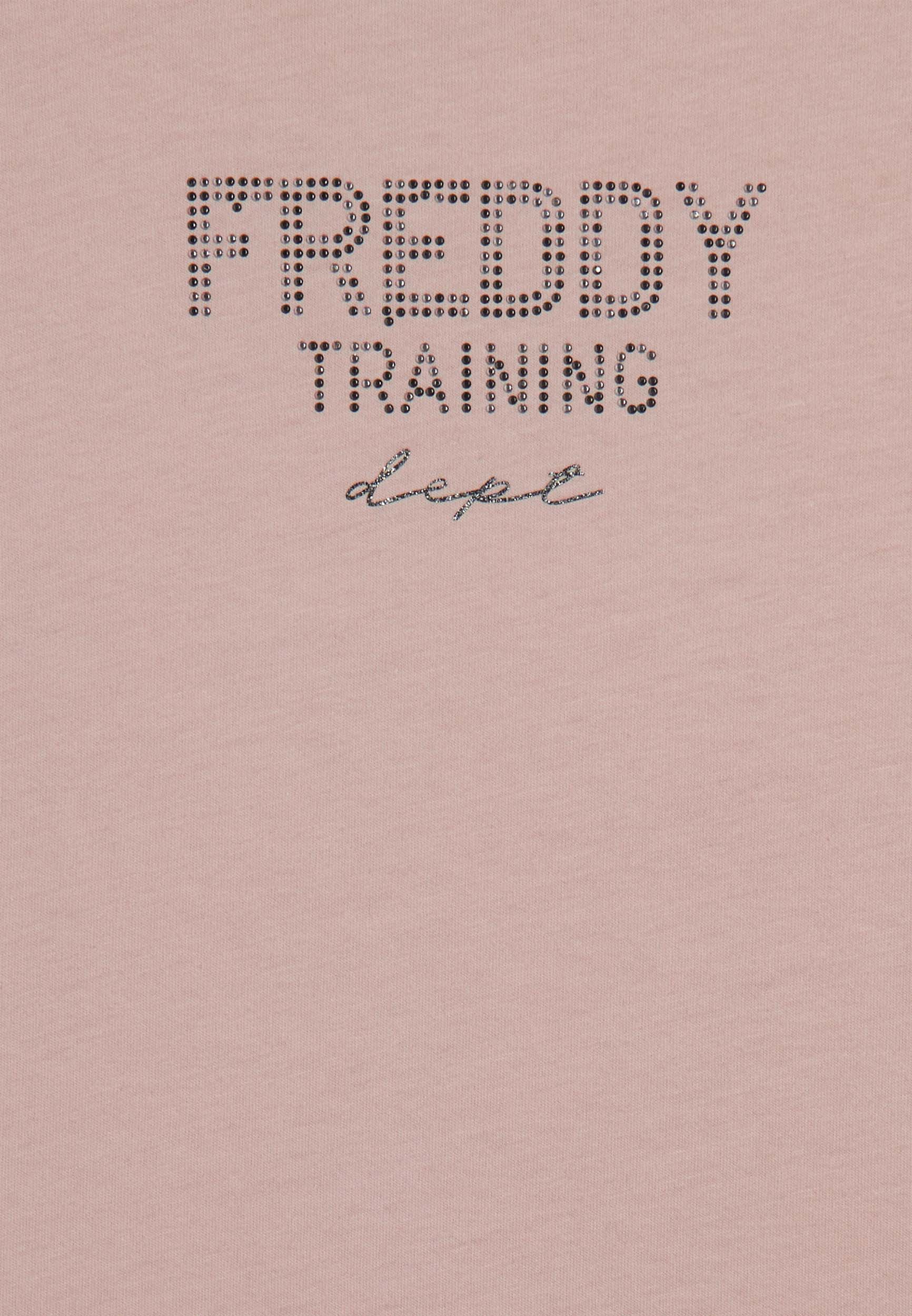 T-shirt en jersey léger avec des manches longues raglan, à coupe classique. Le bas est droit, avec des fentes latérales. Sur les épaules et une partie des manches, une pièce décorative en tissu à imprimés géométriques. Sur le devant, le petit logo « FREDDY Dept » complète le design.